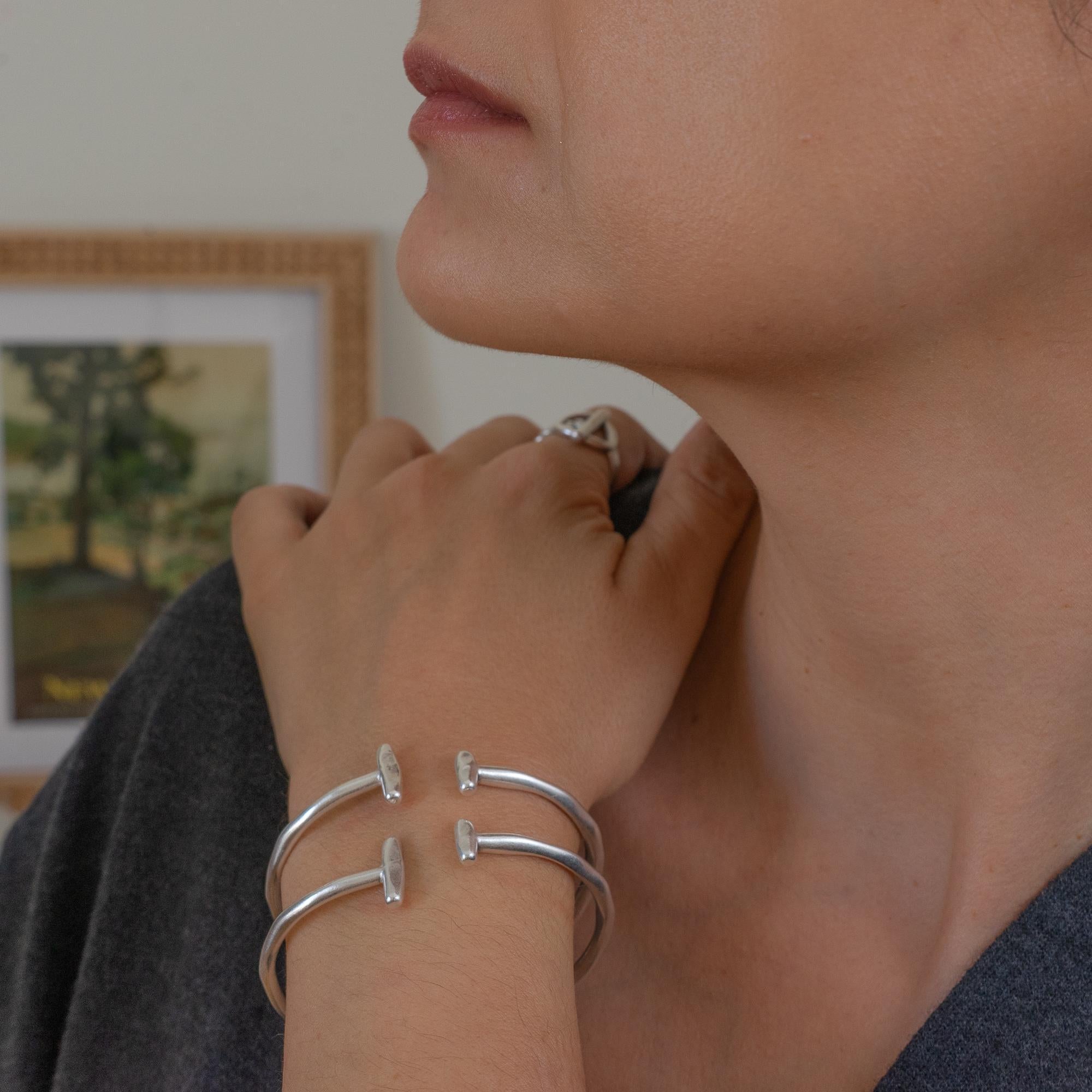 This unique silver-plated cuff bracelet features a sleek bar design that adds a modern touch to any jewelry collection. Its minimalist elegance makes it a versatile accessory, perfect for pairing with other cuffs and bangles to create a chic, layered look.
