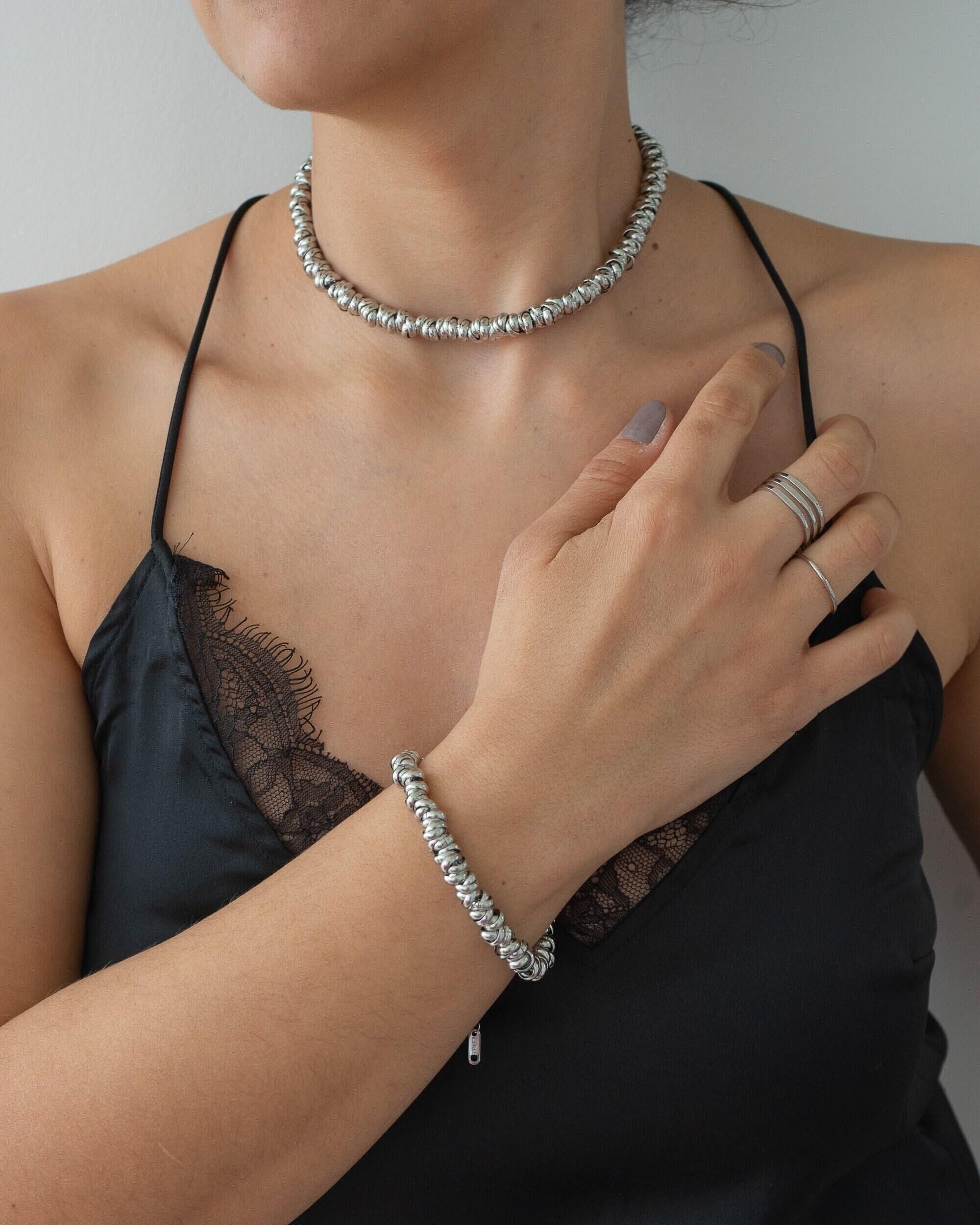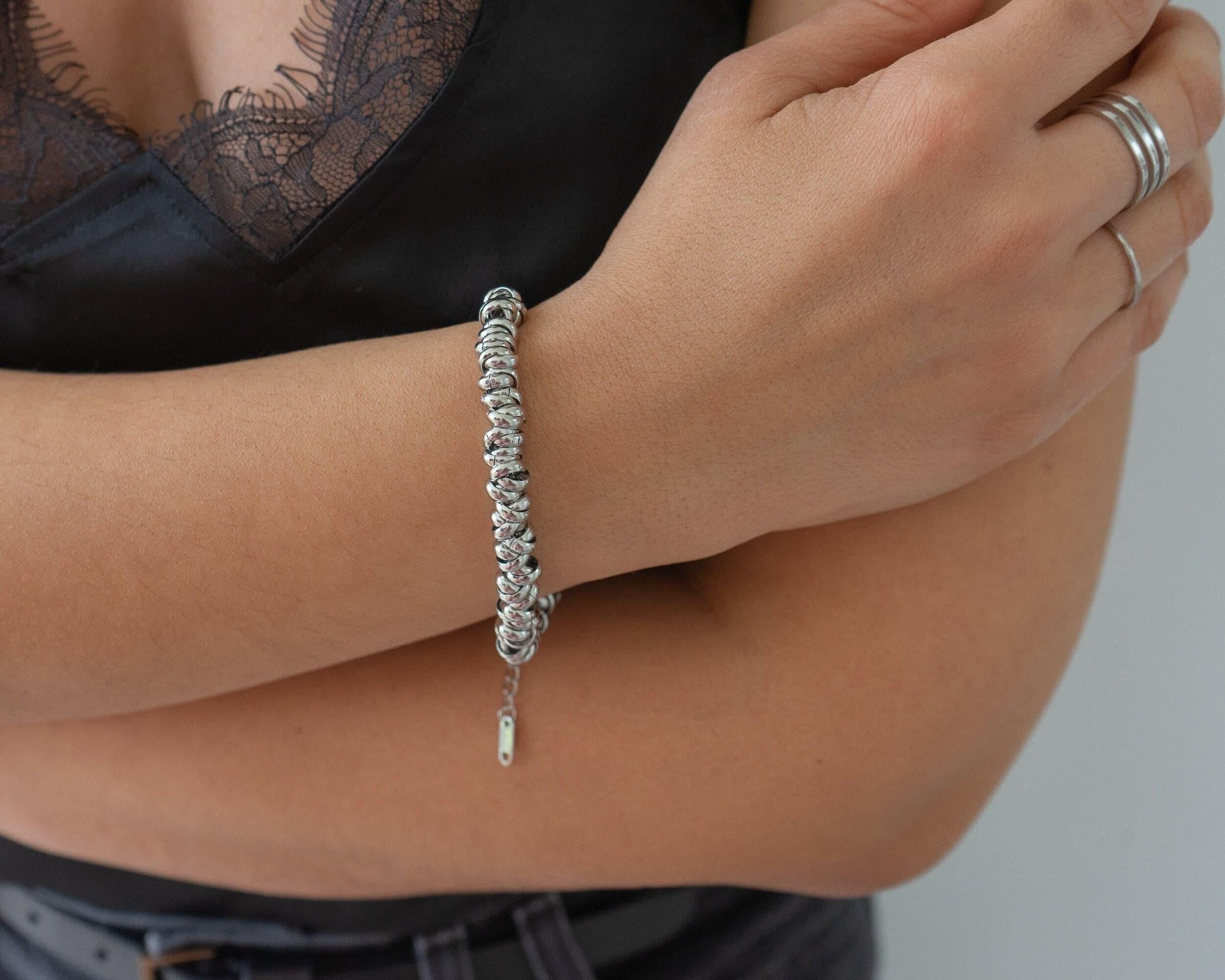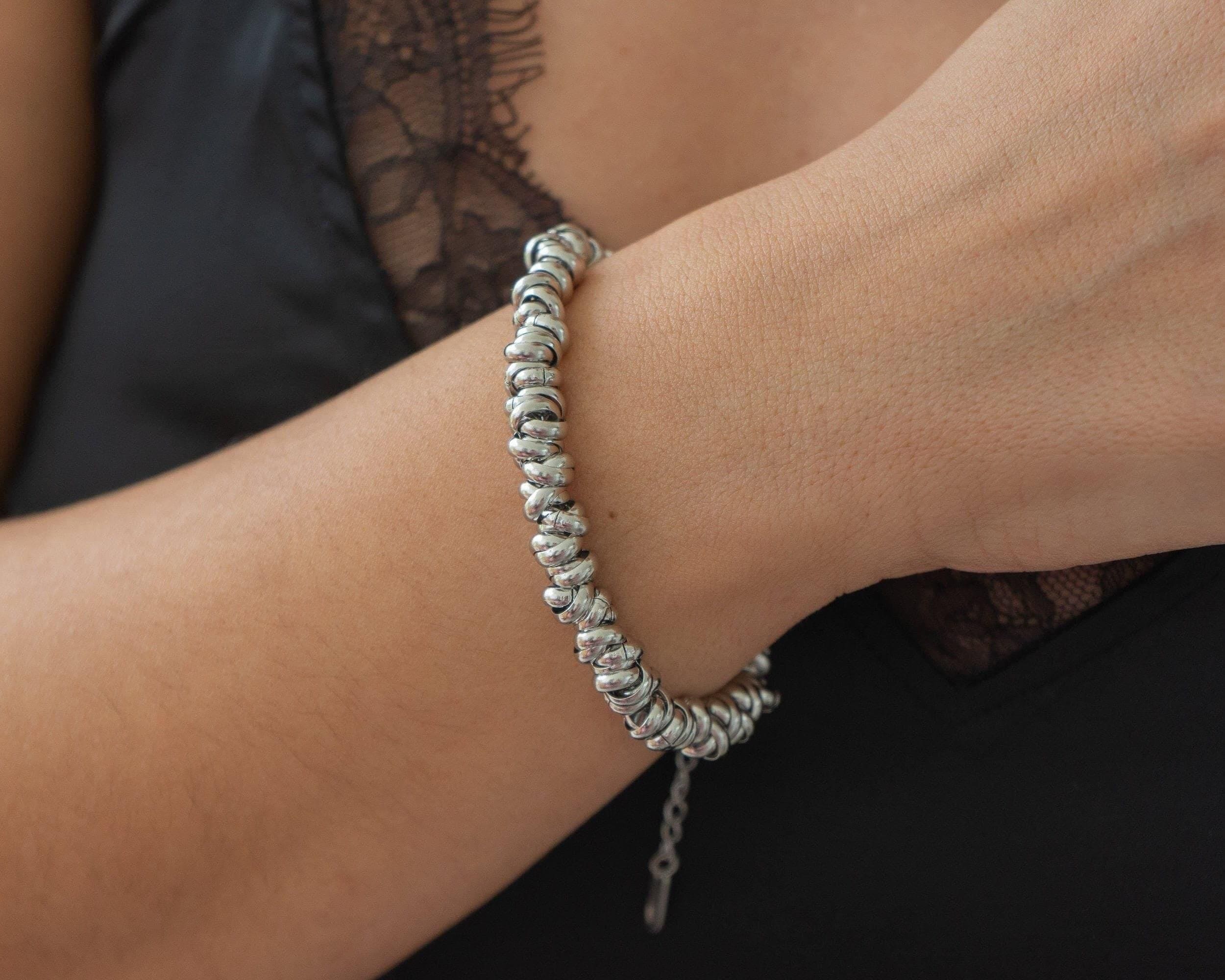 This elegant silver chain bracelet, crafted from interlocking rings, is the epitome of understated sophistication. Perfect for both day and night wear, it effortlessly enhances any outfit, from casual ensembles to formal attire.