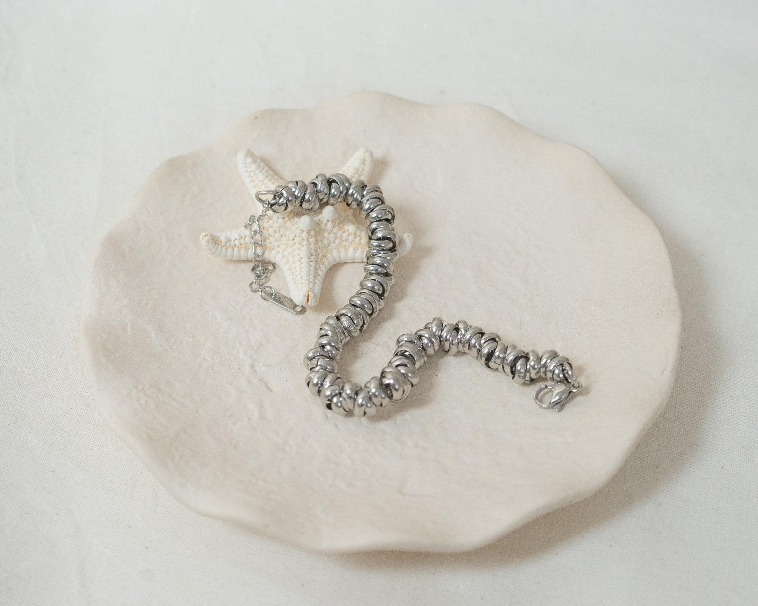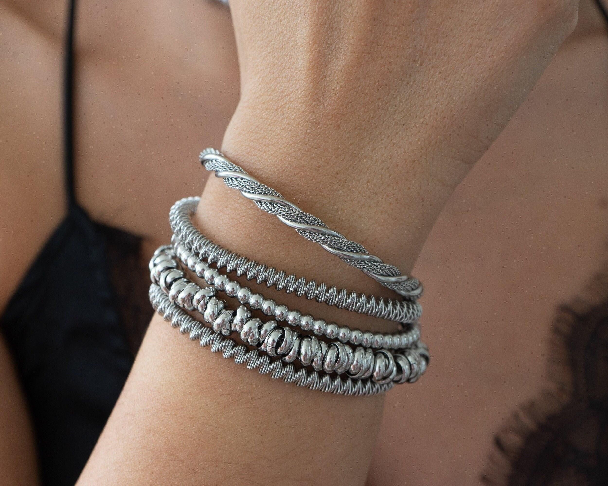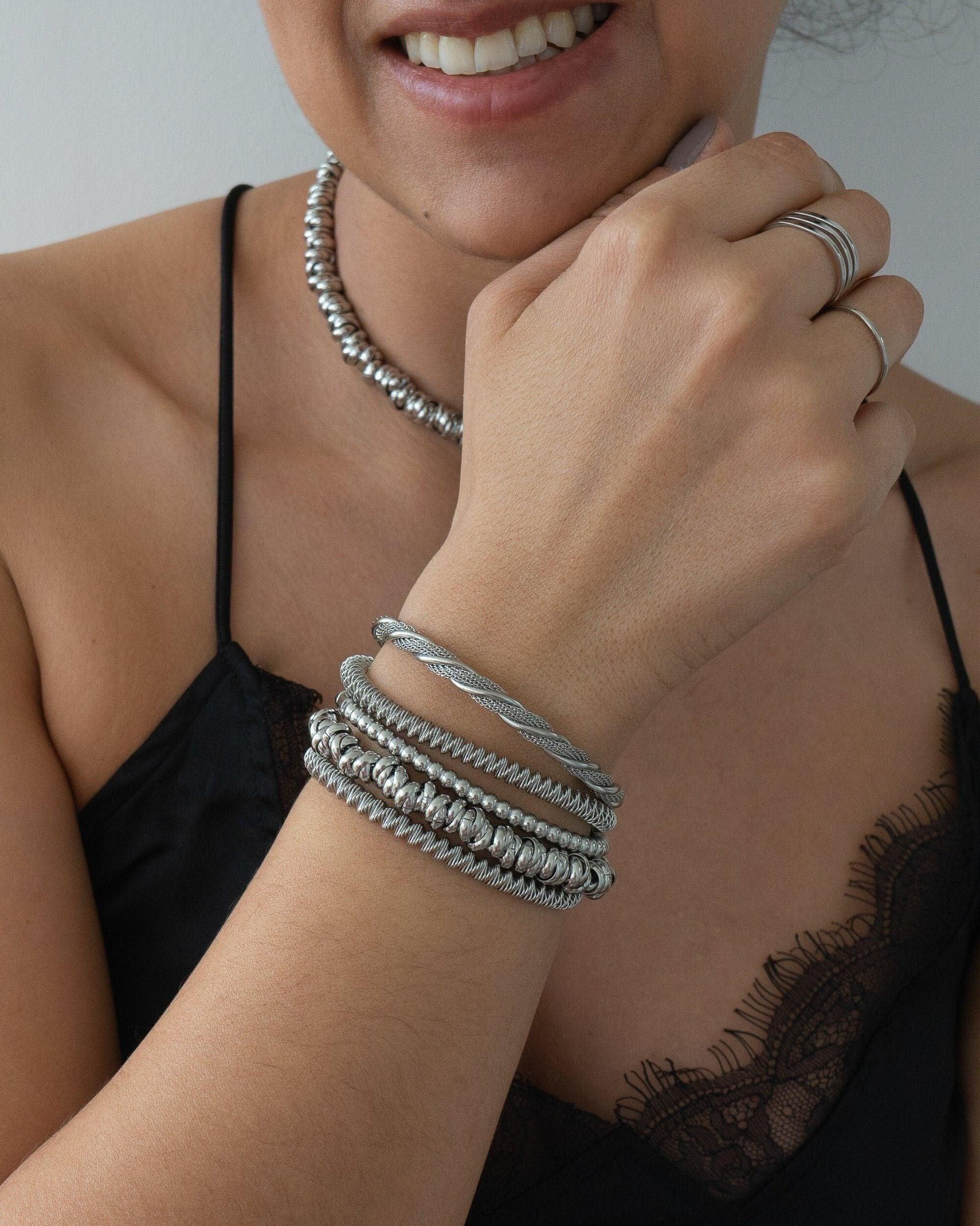This elegant silver chain bracelet, crafted from interlocking rings, is the epitome of understated sophistication. Perfect for both day and night wear, it effortlessly enhances any outfit, from casual ensembles to formal attire.