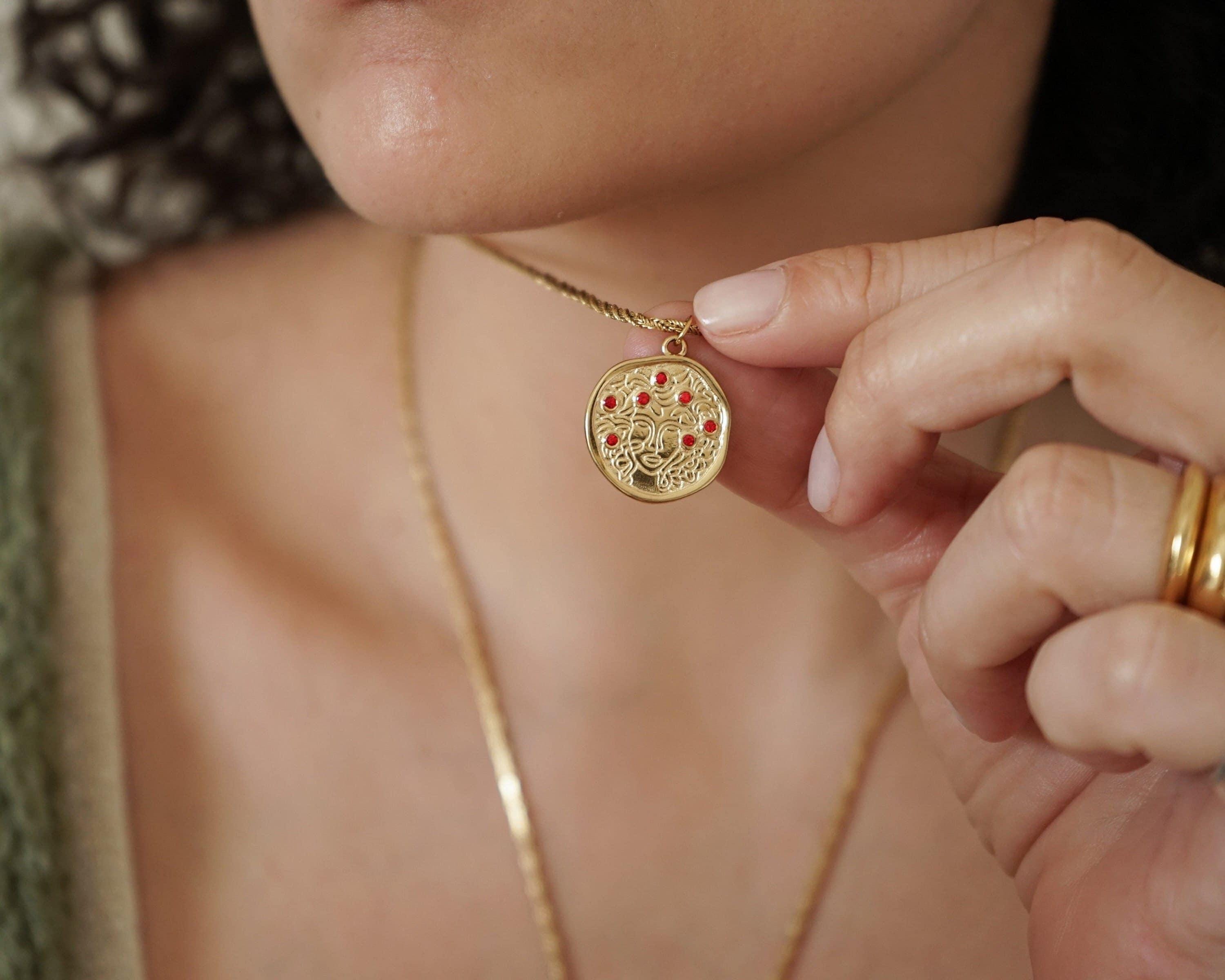 Discover a unique stainless steel necklace featuring a meticulously crafted Medusa pendant adorned with your choice of striking green or red stones. This captivating piece draws inspiration from the powerful narratives of ancient Greek mythology, making it an exceptional statement necklace. The necklace is elegantly finished with a delicate Foxtail chain, adding a touch of sophistication to your accessory collection.