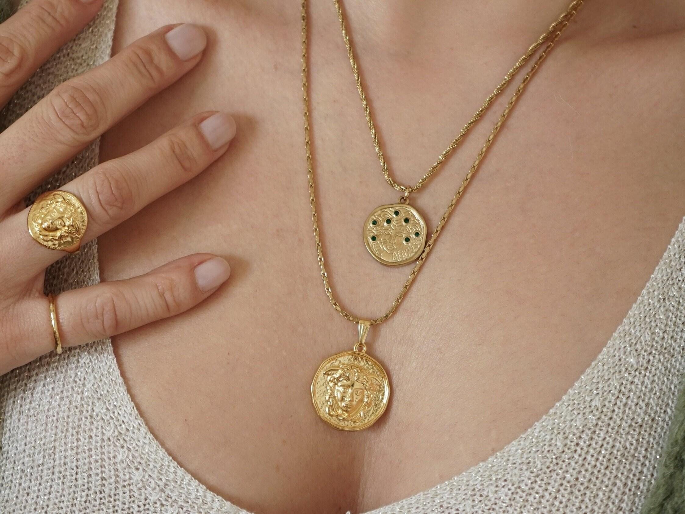 Designed for durability, this necklace is waterproof, rust-resistant, and offers an affordable option without compromising quality.Medusa, a well-known figure from ancient Greece, is characterized by her snake-like hair and her fateful gaze that could turn onlookers to stone. Once a beautiful priestess of Athena, she faced a tragic curse for breaking her vow of celibacy, stemming from various accounts of her encounters with Poseidon. In some tales, she was a victim of his aggression, while others narrate a consensual affair. Regardless, Athena's punishment transformed Medusa into a fearsome hag, with her hair becoming a mass of writhing snakes—a reflection of the injustice she faced.