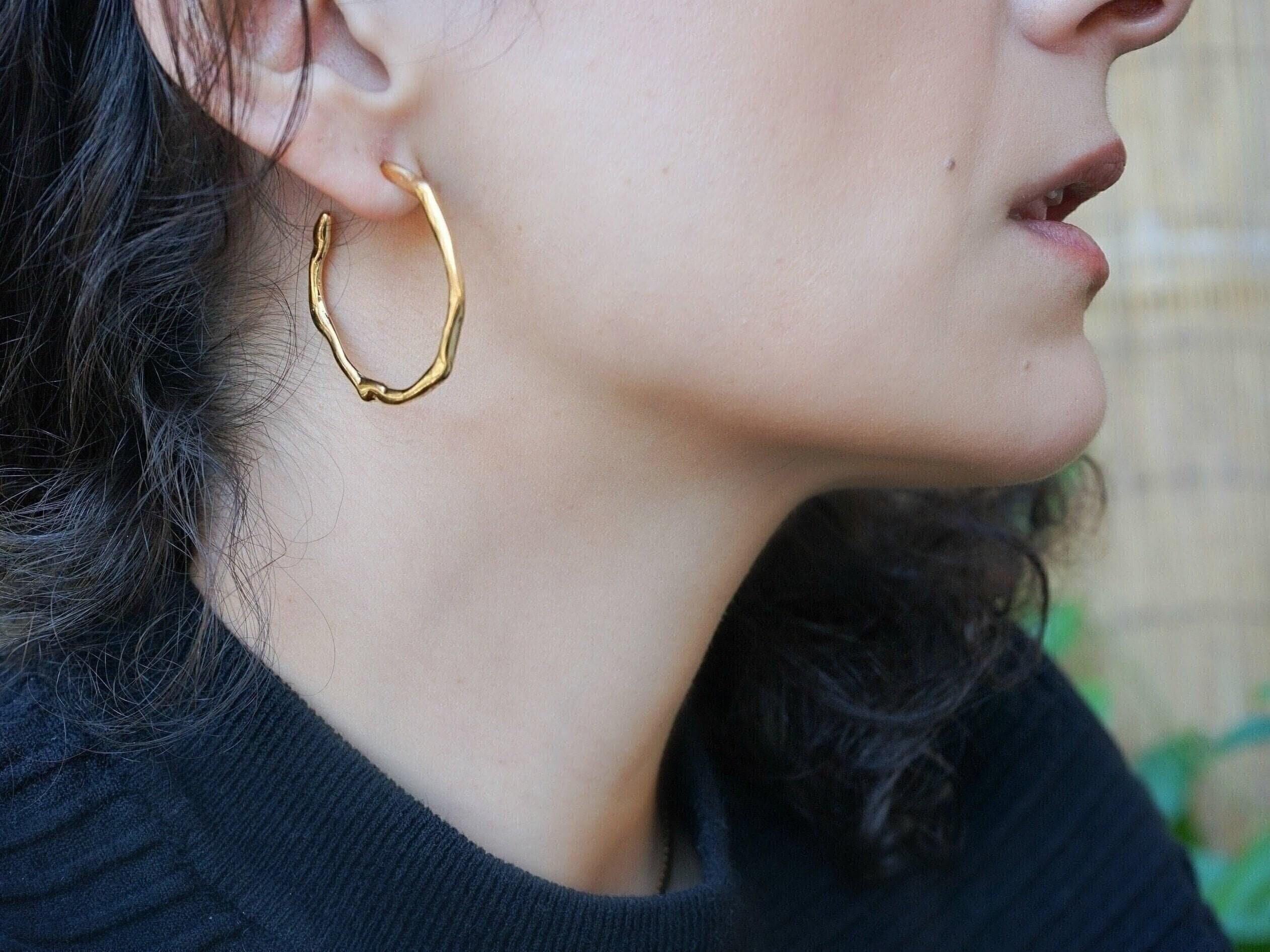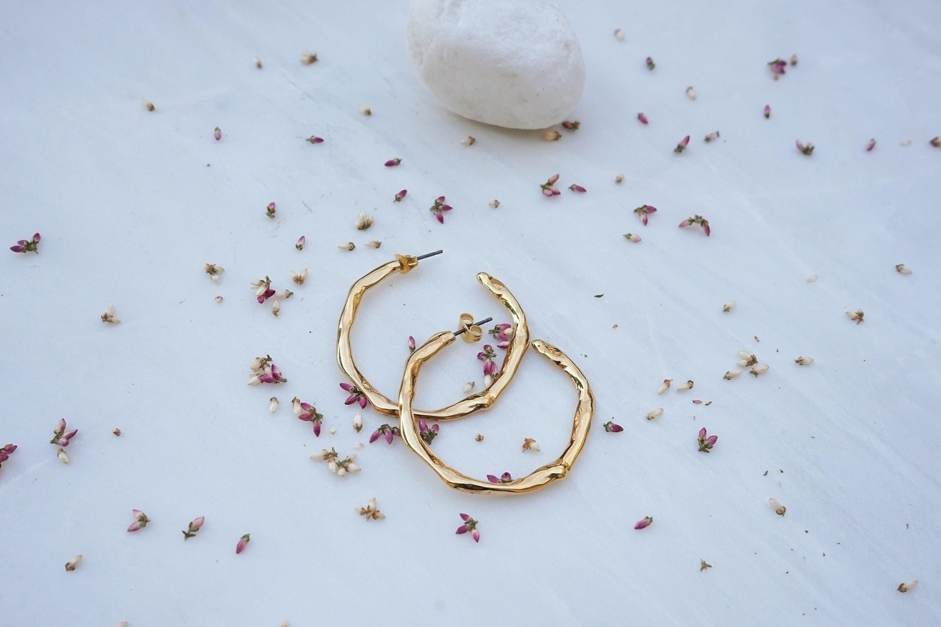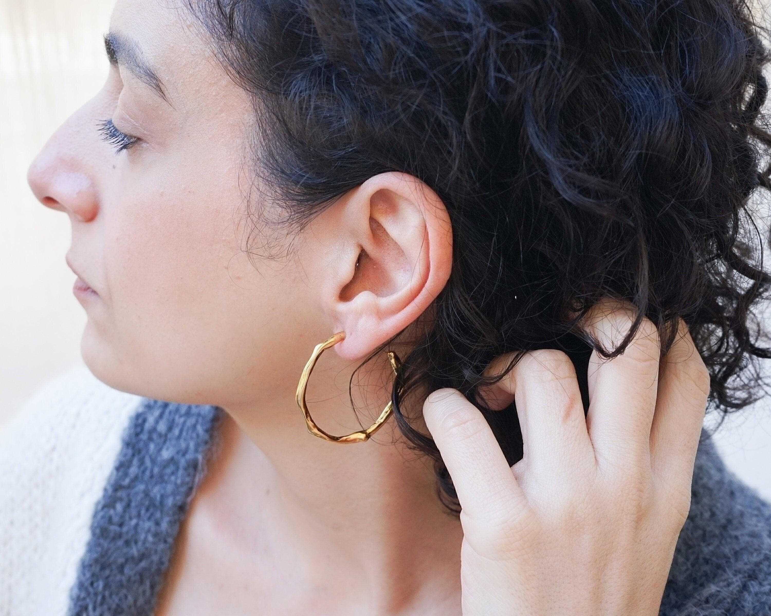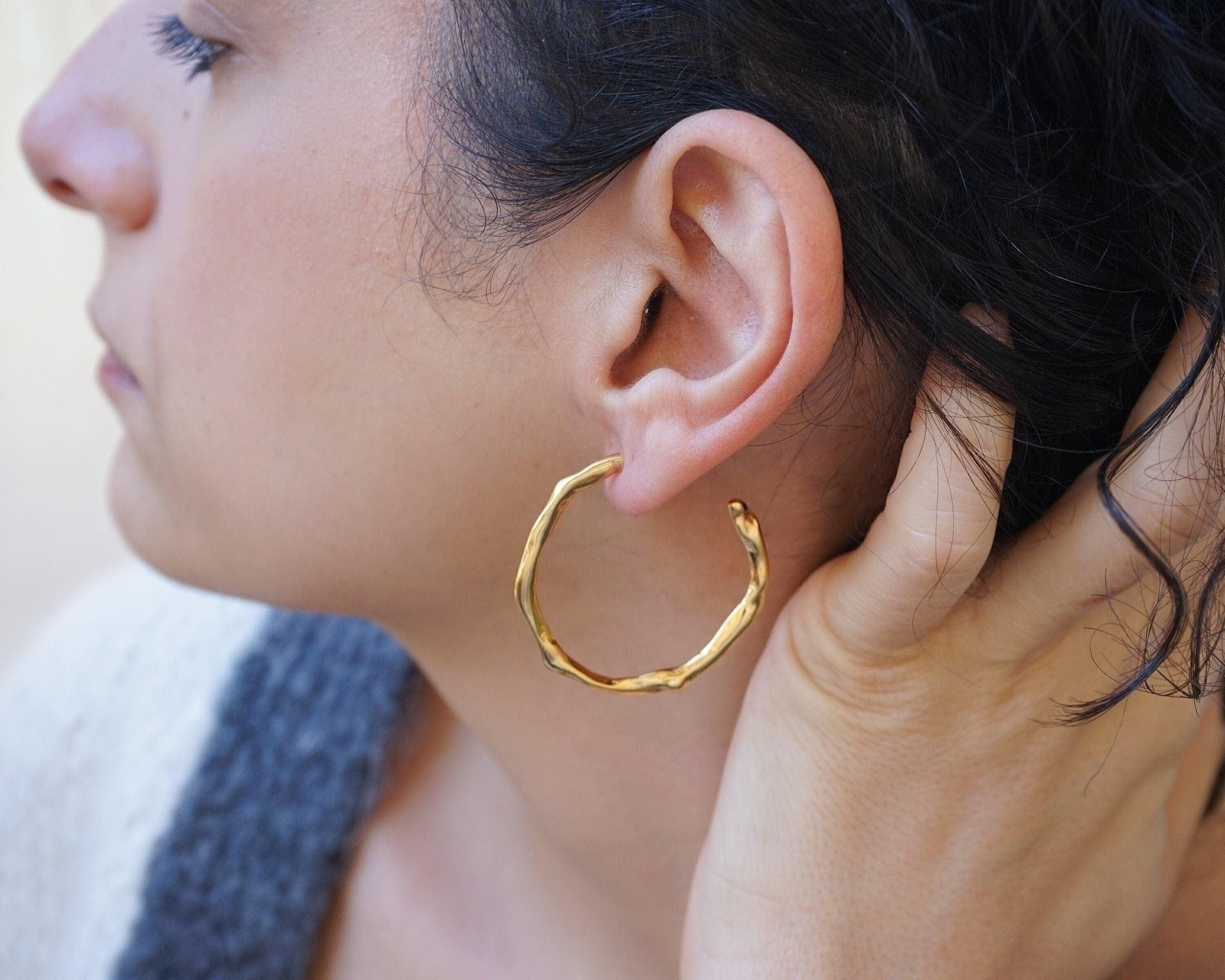 Discover these beautifully crafted gold plated earrings featuring a thick, hammered hoop design. Lightweight and effortless to wear, these earrings are designed to provide comfort without pulling on the earlobe, making them a perfect choice for any occasion. Their unique style adds a touch of elegance while remaining versatile enough to complement a variety of outfits.