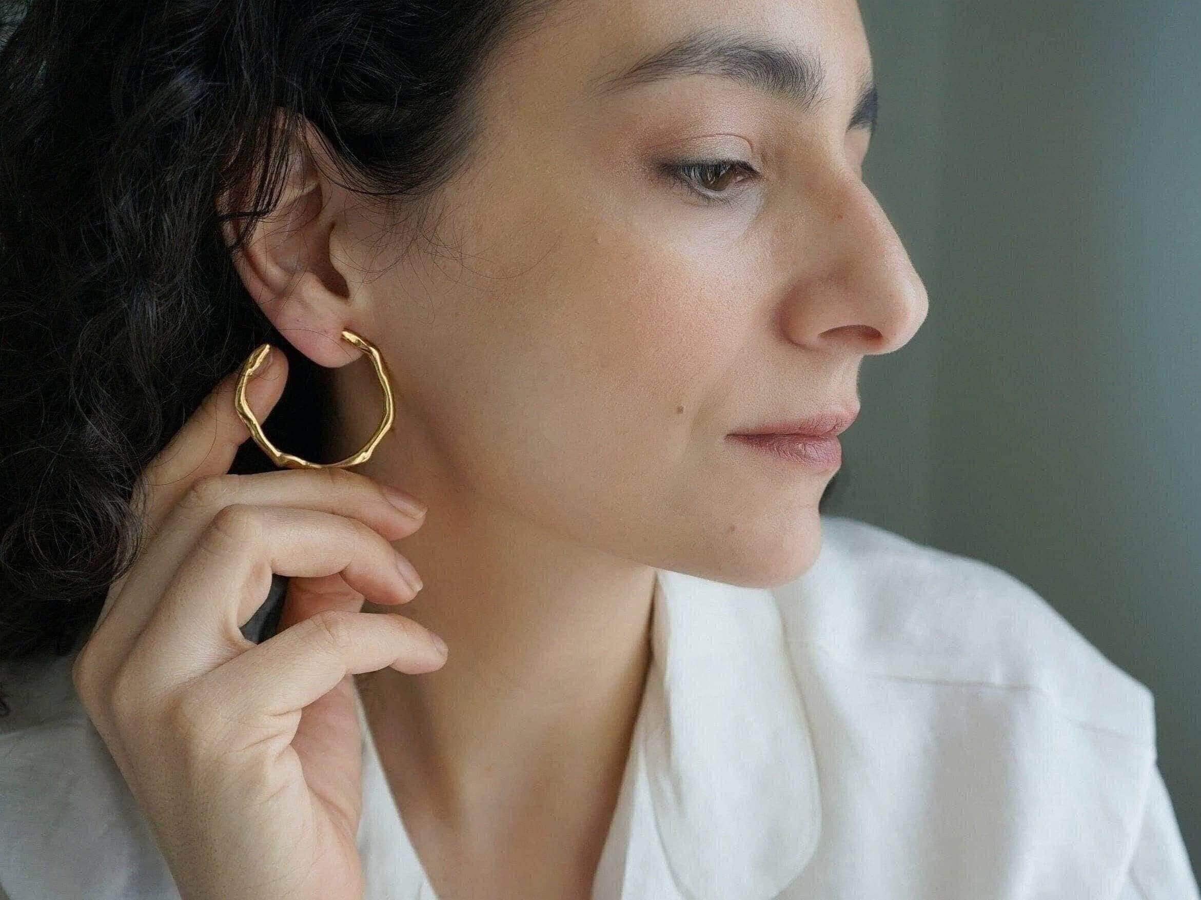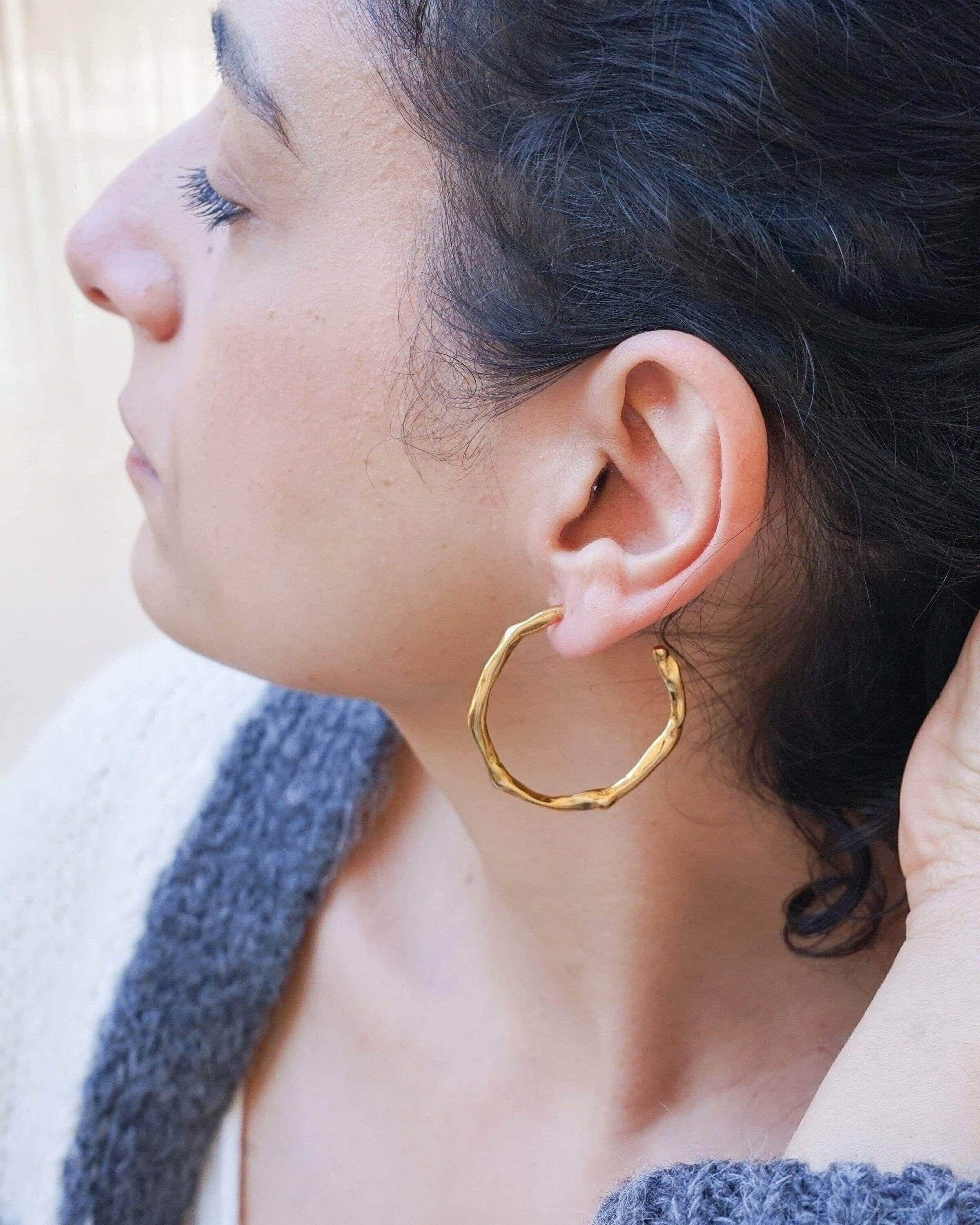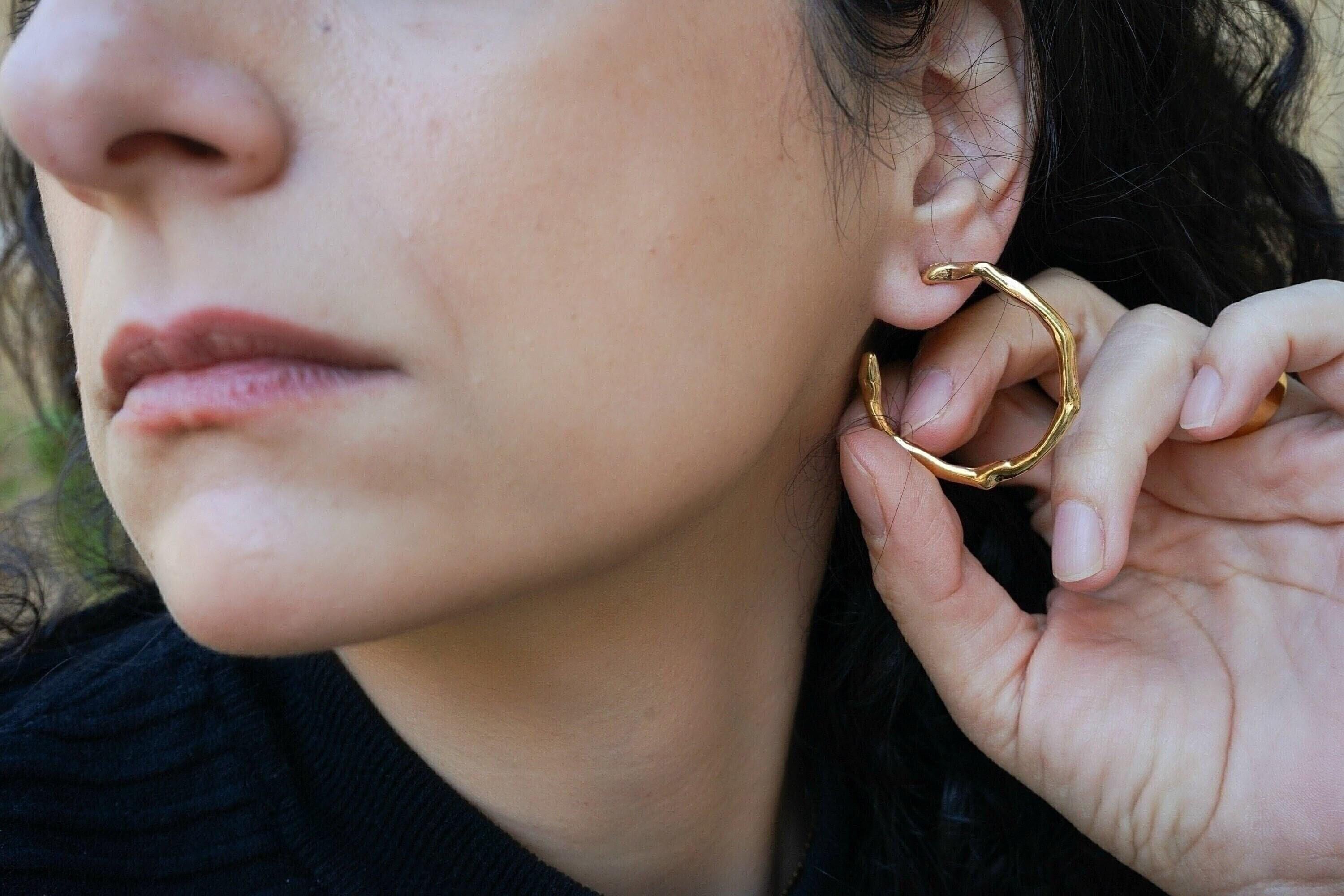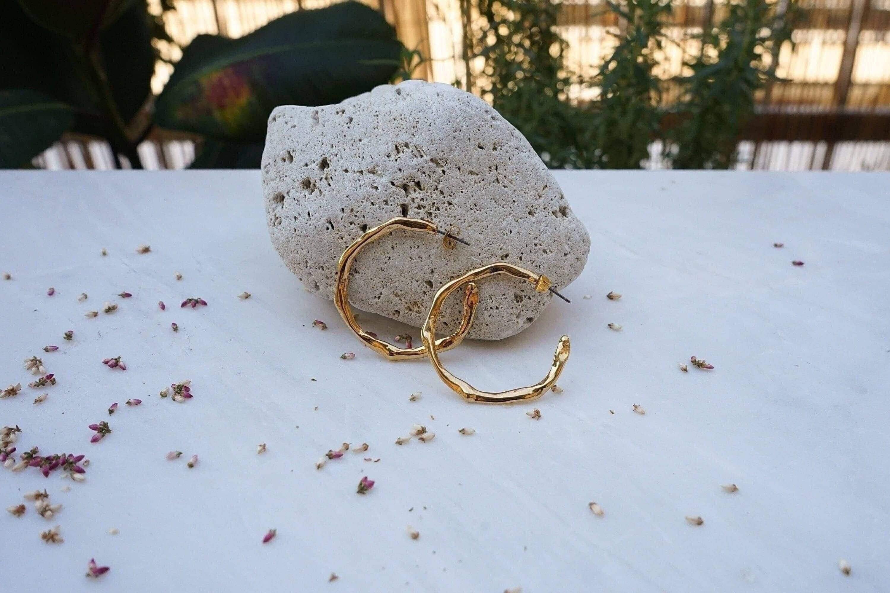 Discover these beautifully crafted gold plated earrings featuring a thick, hammered hoop design. Lightweight and effortless to wear, these earrings are designed to provide comfort without pulling on the earlobe, making them a perfect choice for any occasion. Their unique style adds a touch of elegance while remaining versatile enough to complement a variety of outfits.