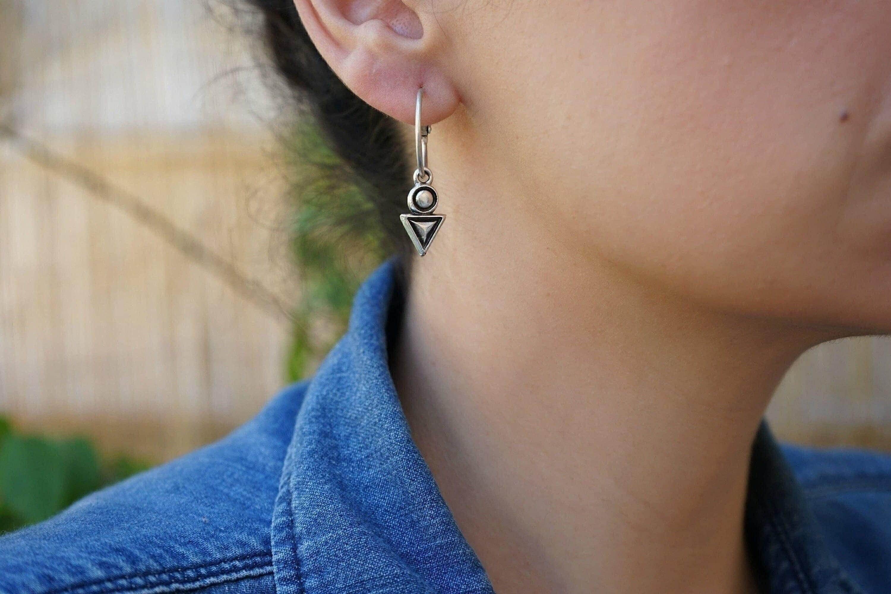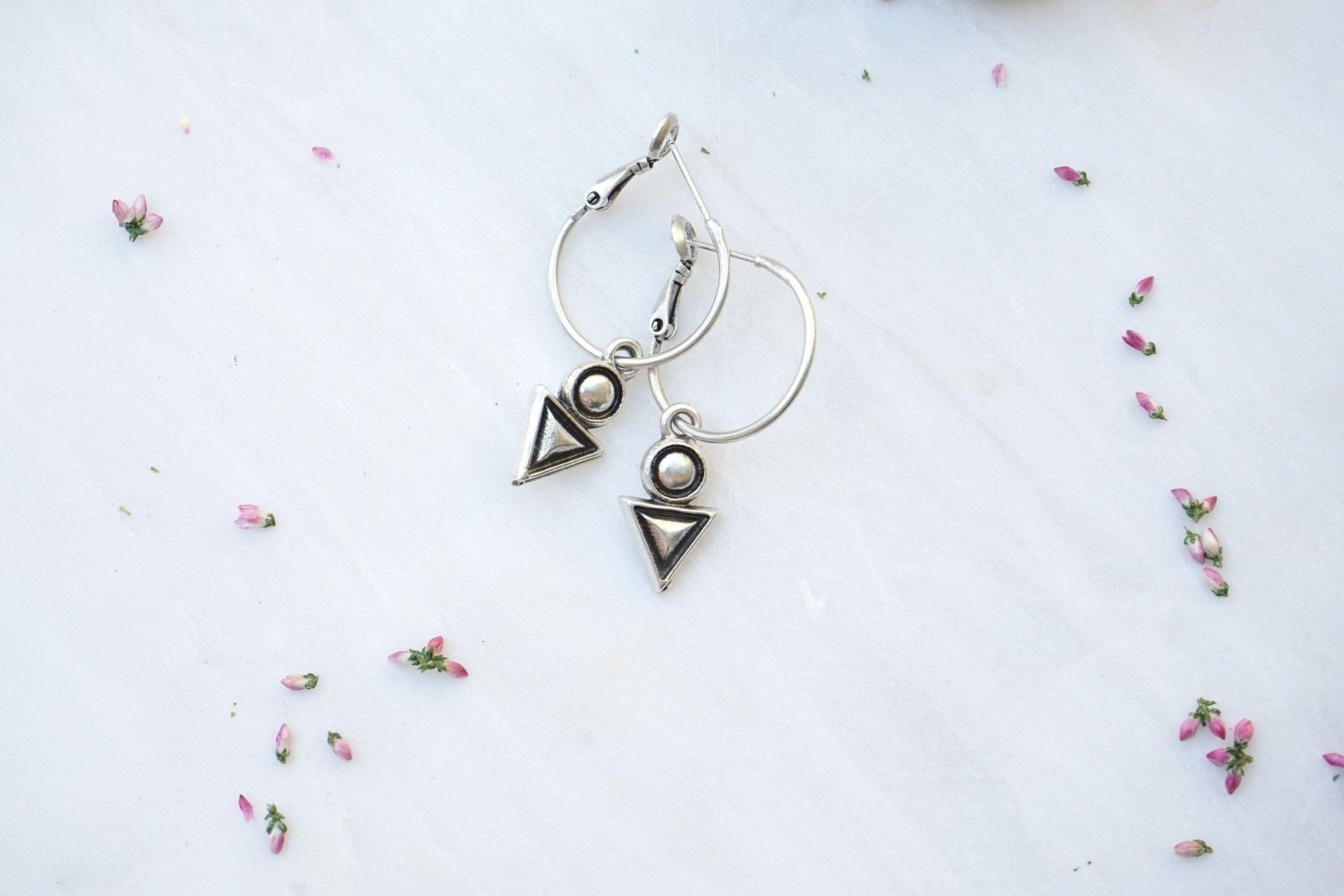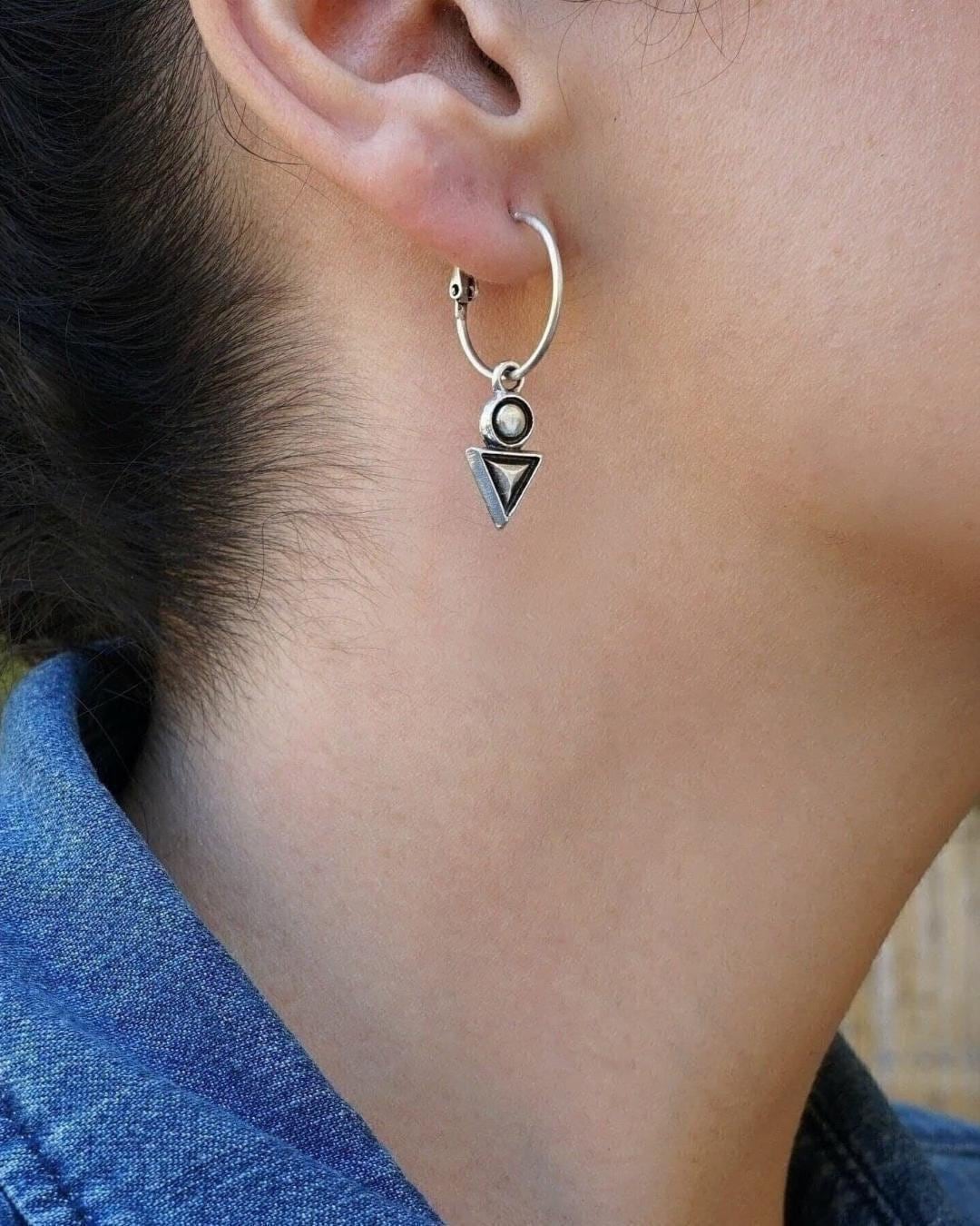 Discover the elegance of these antique silver latch-back hoop earrings adorned with an engraved geometric charm featuring a unique triangle-circle design. Lightweight and easy to wear, these earrings won’t drag your earlobes down, offering a unique yet versatile addition to your jewelry collection. Their mini hoop size makes them perfect for transitioning seamlessly from day to night, adding a sophisticated touch to any outfit. An alternative pair of earrings like these will beautifully express your free spirit.