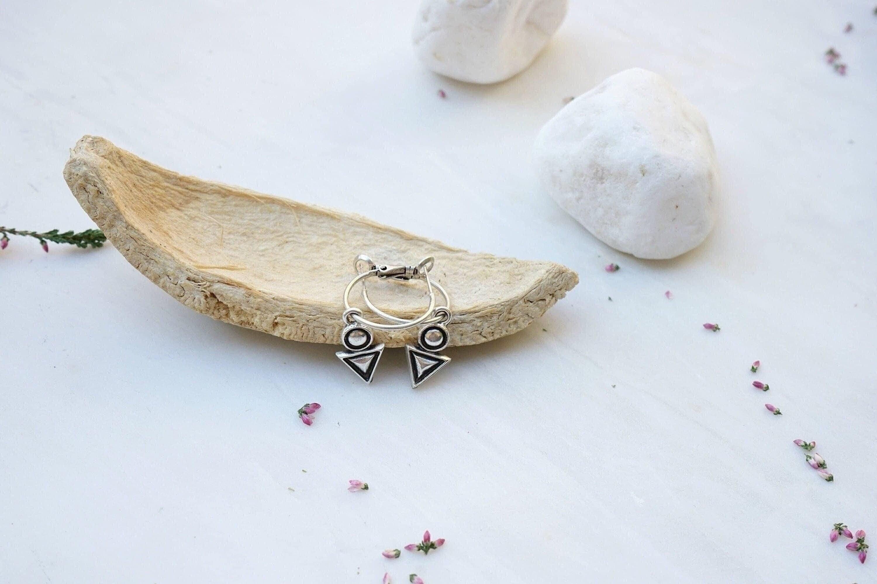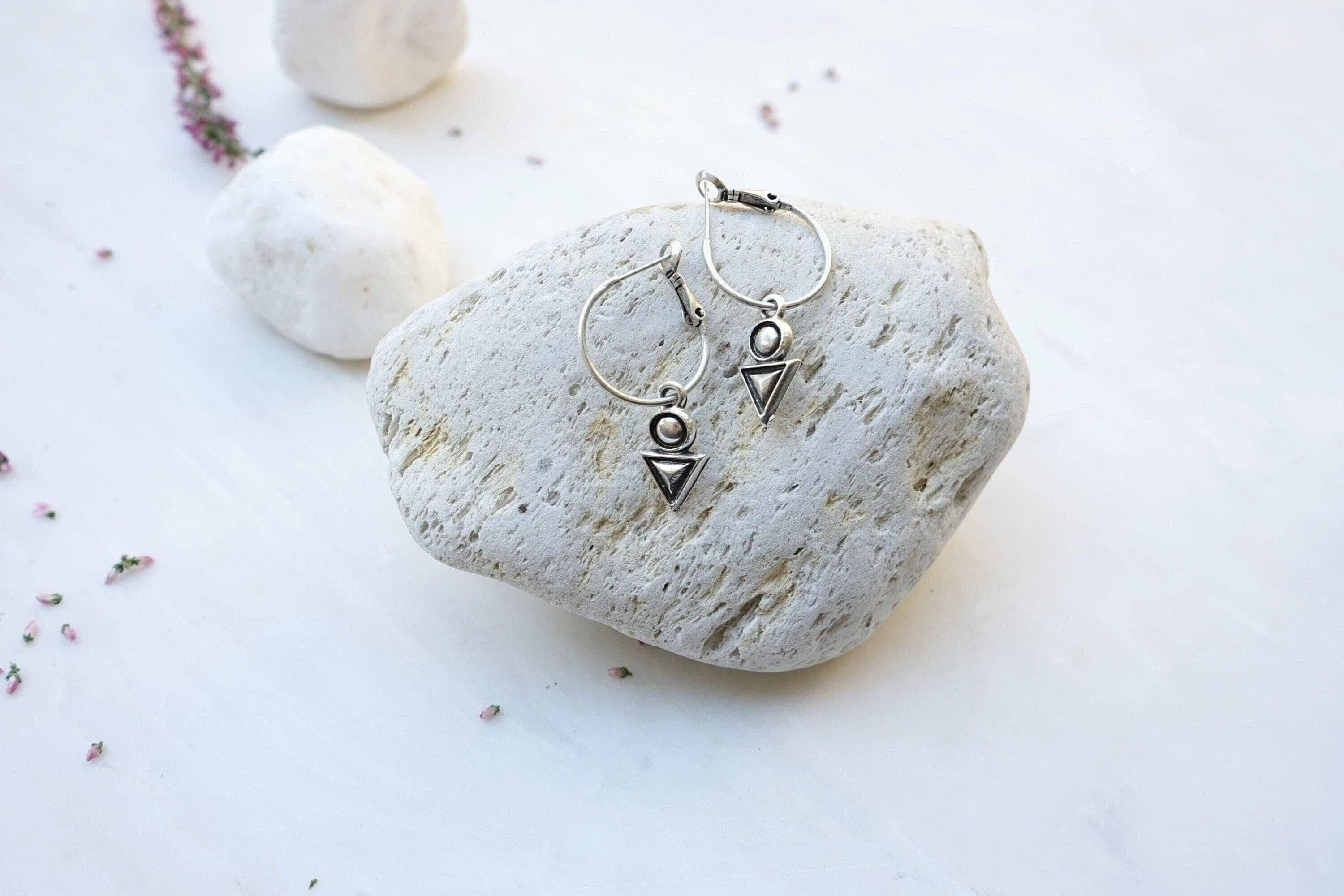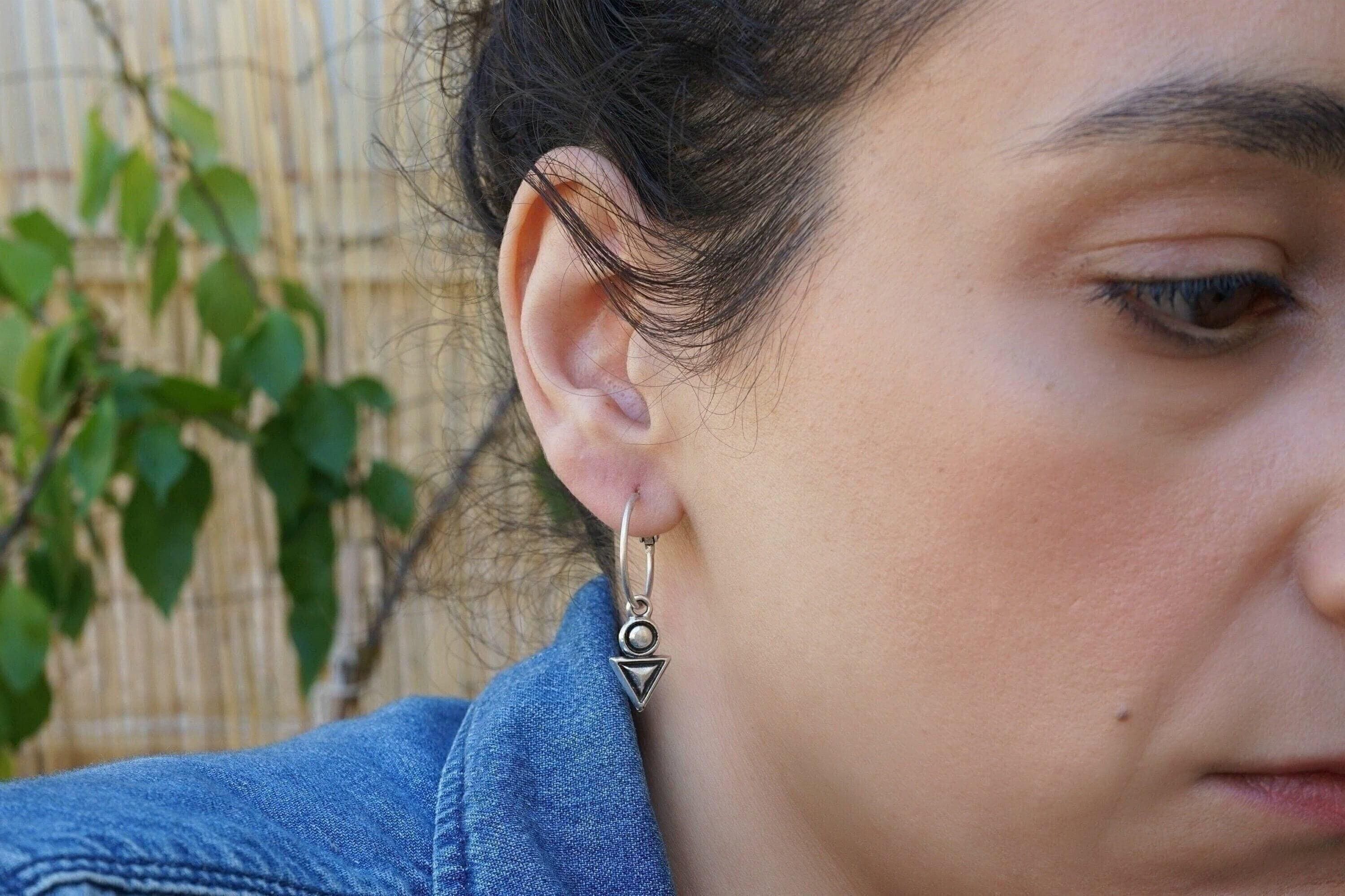 Discover the elegance of these antique silver latch-back hoop earrings adorned with an engraved geometric charm featuring a unique triangle-circle design. Lightweight and easy to wear, these earrings won’t drag your earlobes down, offering a unique yet versatile addition to your jewelry collection. Their mini hoop size makes them perfect for transitioning seamlessly from day to night, adding a sophisticated touch to any outfit. An alternative pair of earrings like these will beautifully express your free spirit.