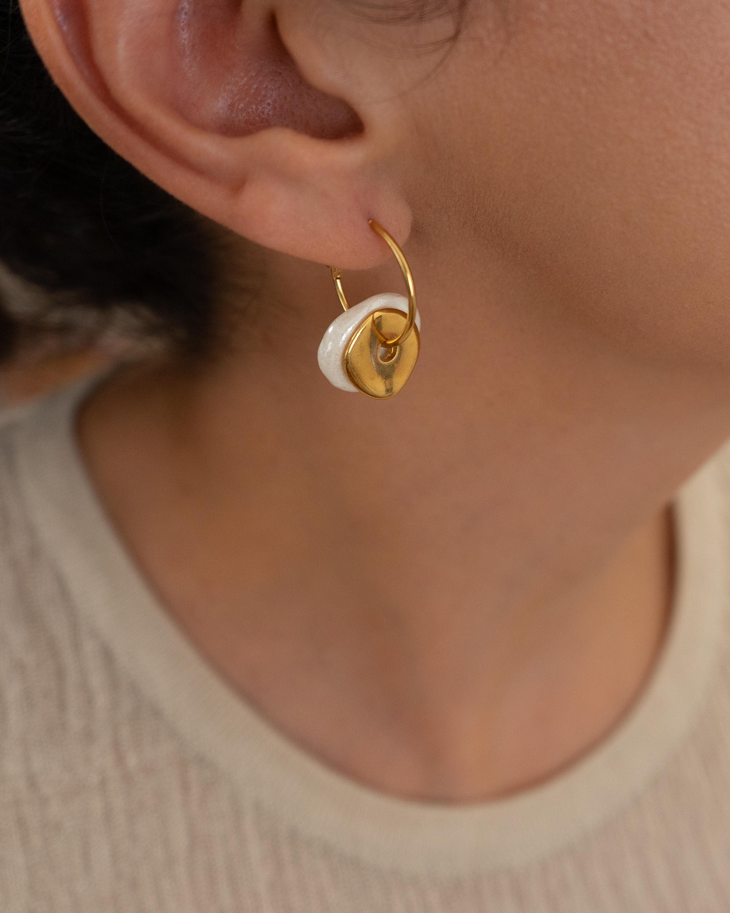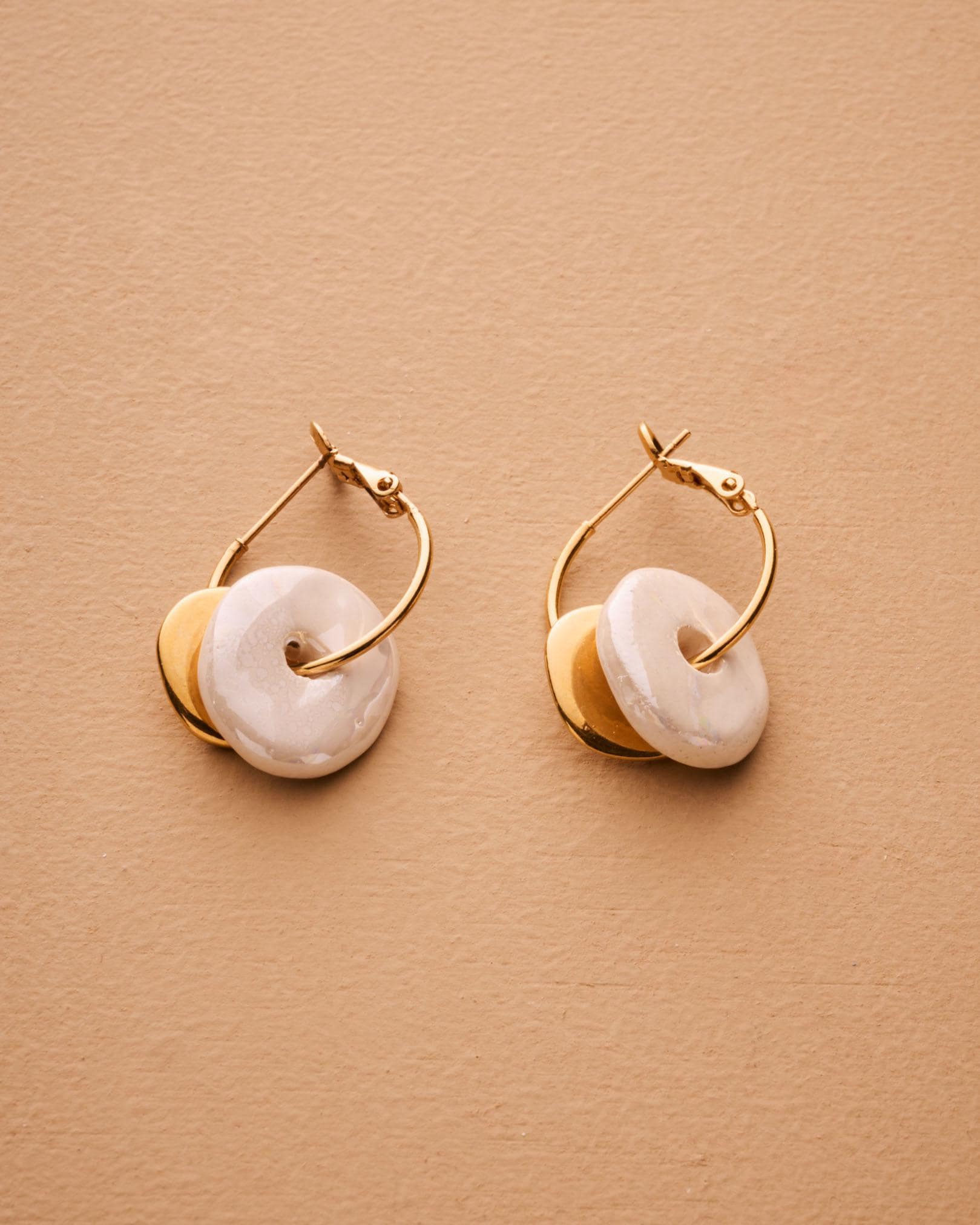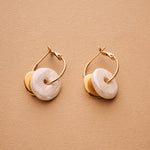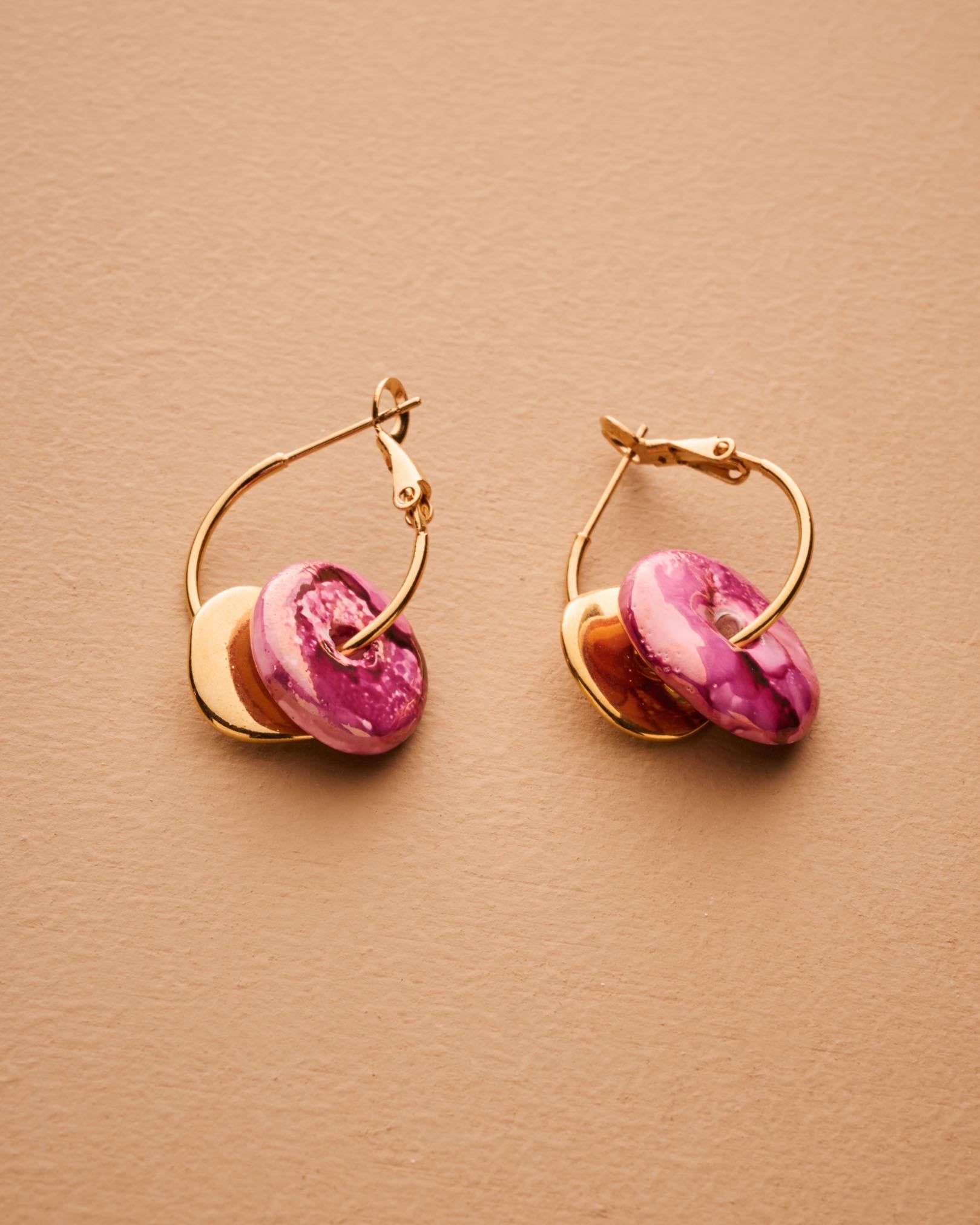Colorful ceramic hoop earrings featuring flat donut-shaped ceramic beads and hammered gold-plated coin charms. Choose from white, pink, or green. These statement dangle earrings are crafted with gold-plated zamak hoops and ceramic accents—perfect for summer outfits or standout everyday looks. Lightweight, easy to wear, and one-of-a-kind.