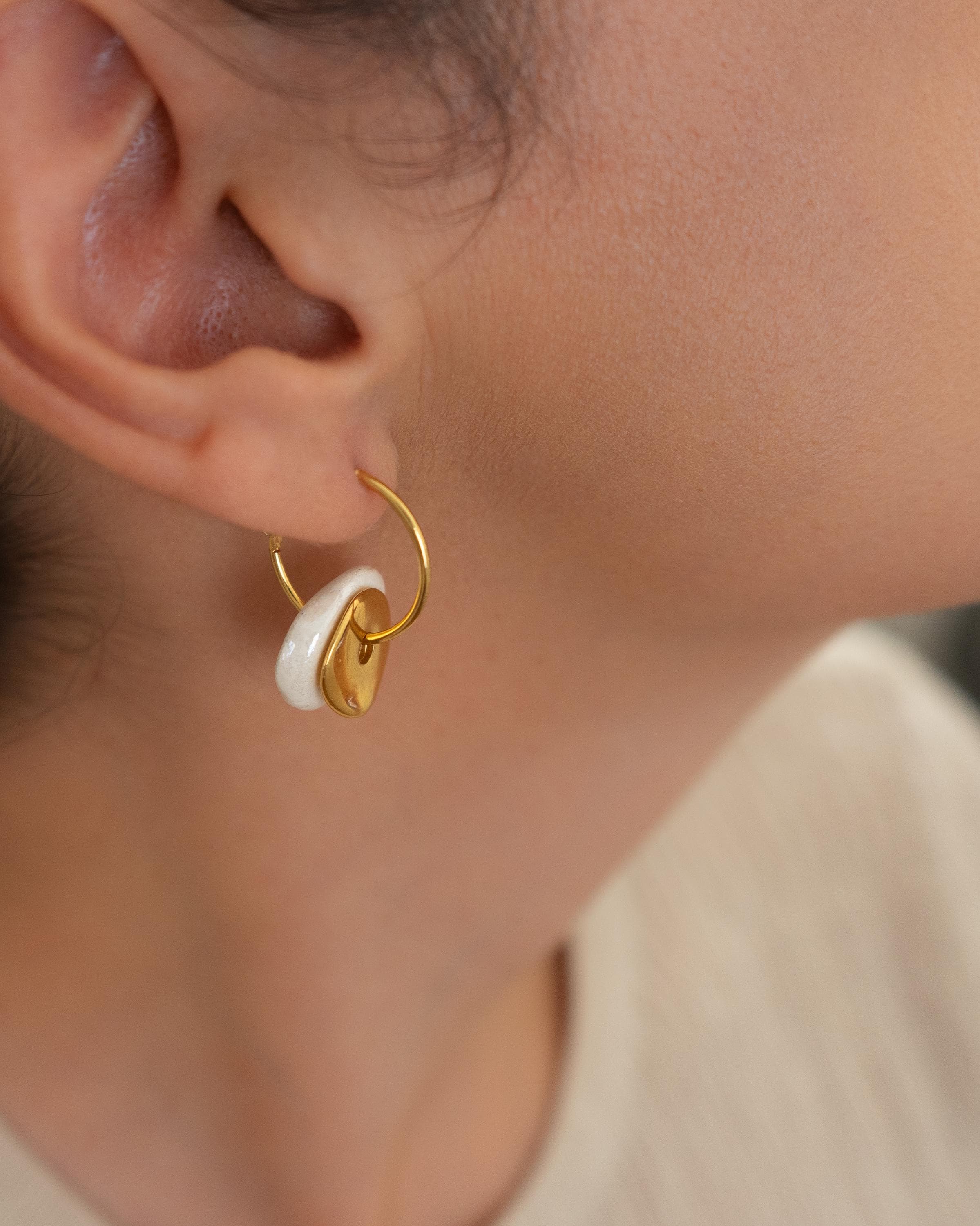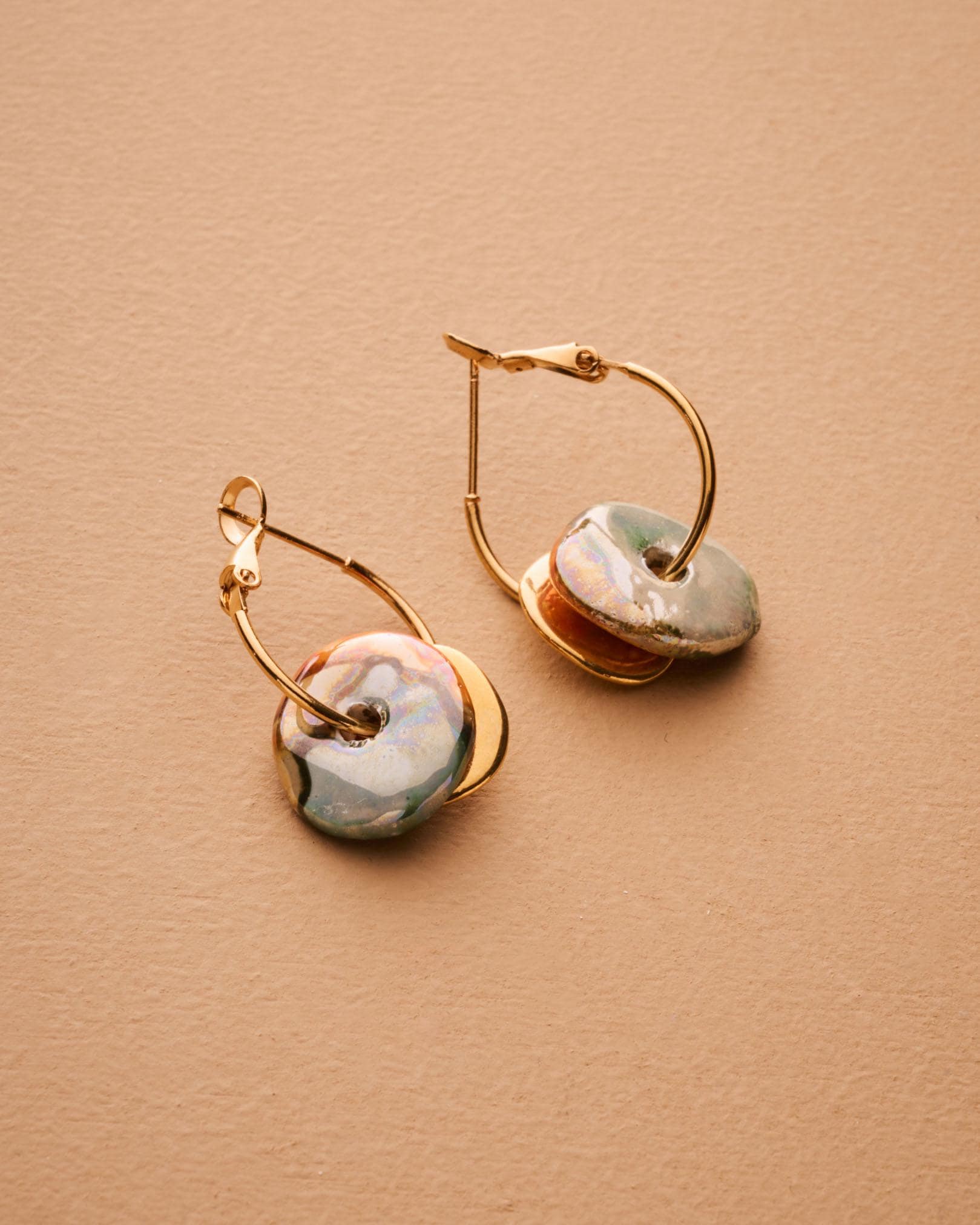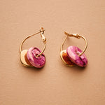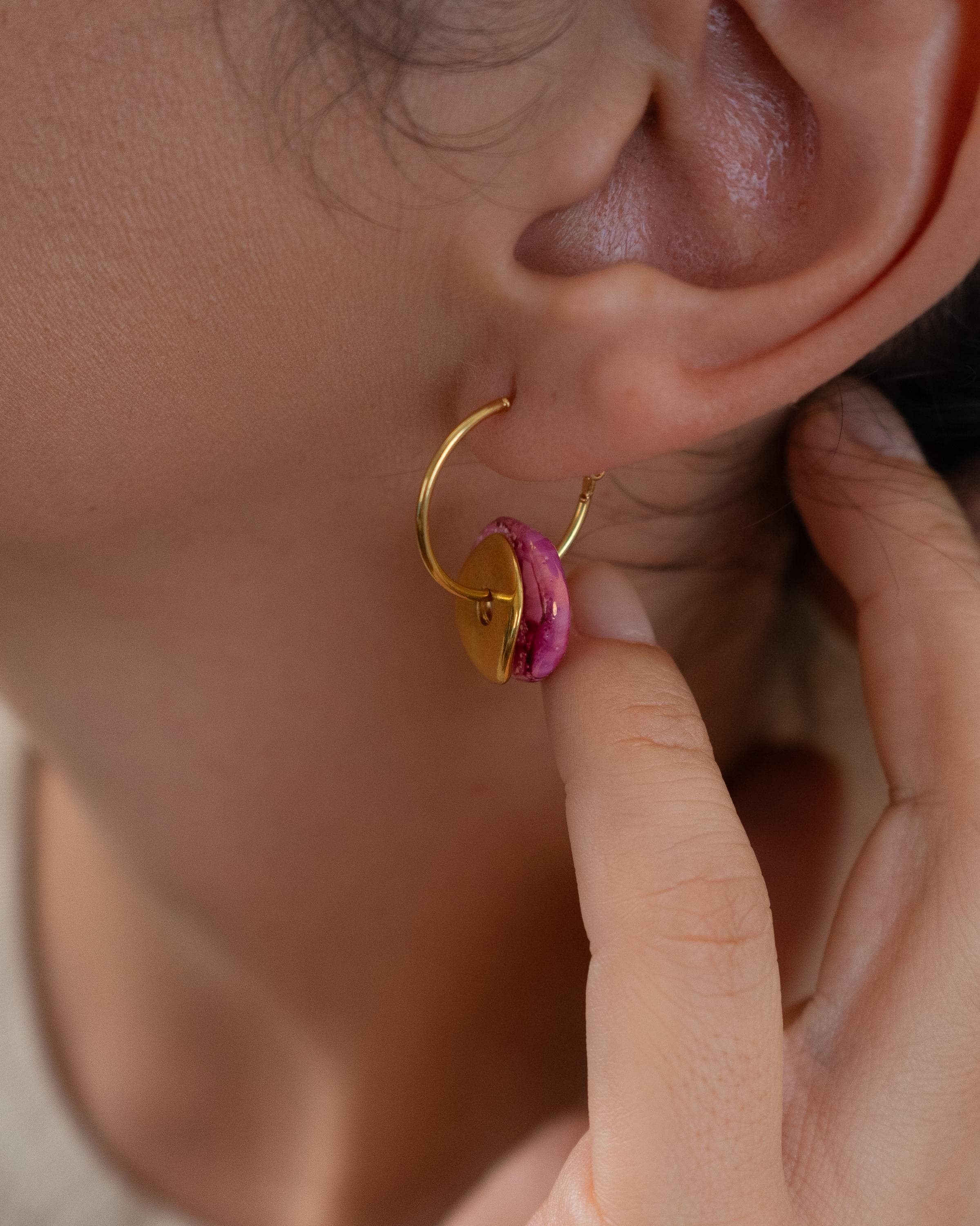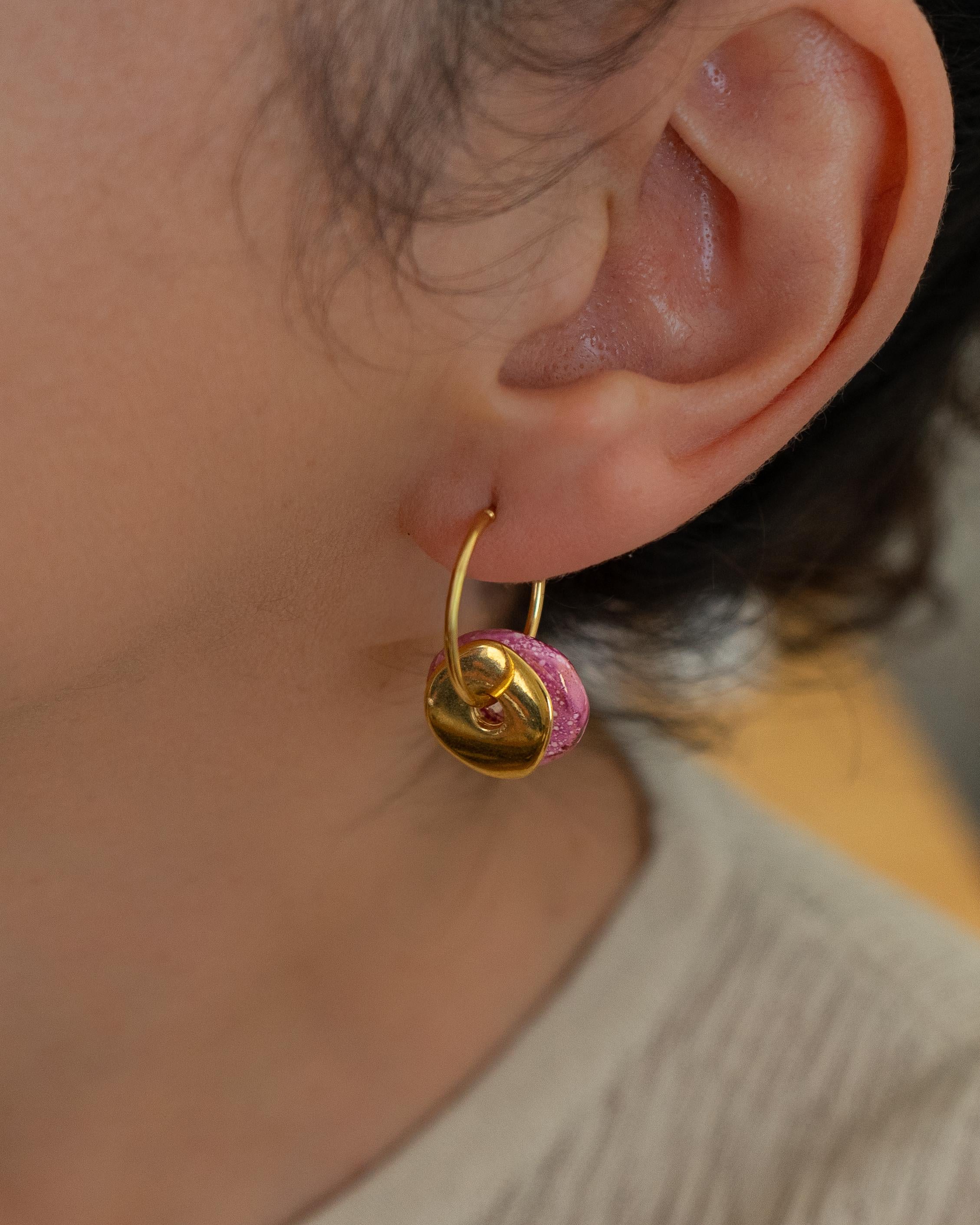 Colorful ceramic hoop earrings featuring flat donut-shaped ceramic beads and hammered gold-plated coin charms. Choose from white, pink, or green. These statement dangle earrings are crafted with gold-plated zamak hoops and ceramic accents—perfect for summer outfits or standout everyday looks. Lightweight, easy to wear, and one-of-a-kind.