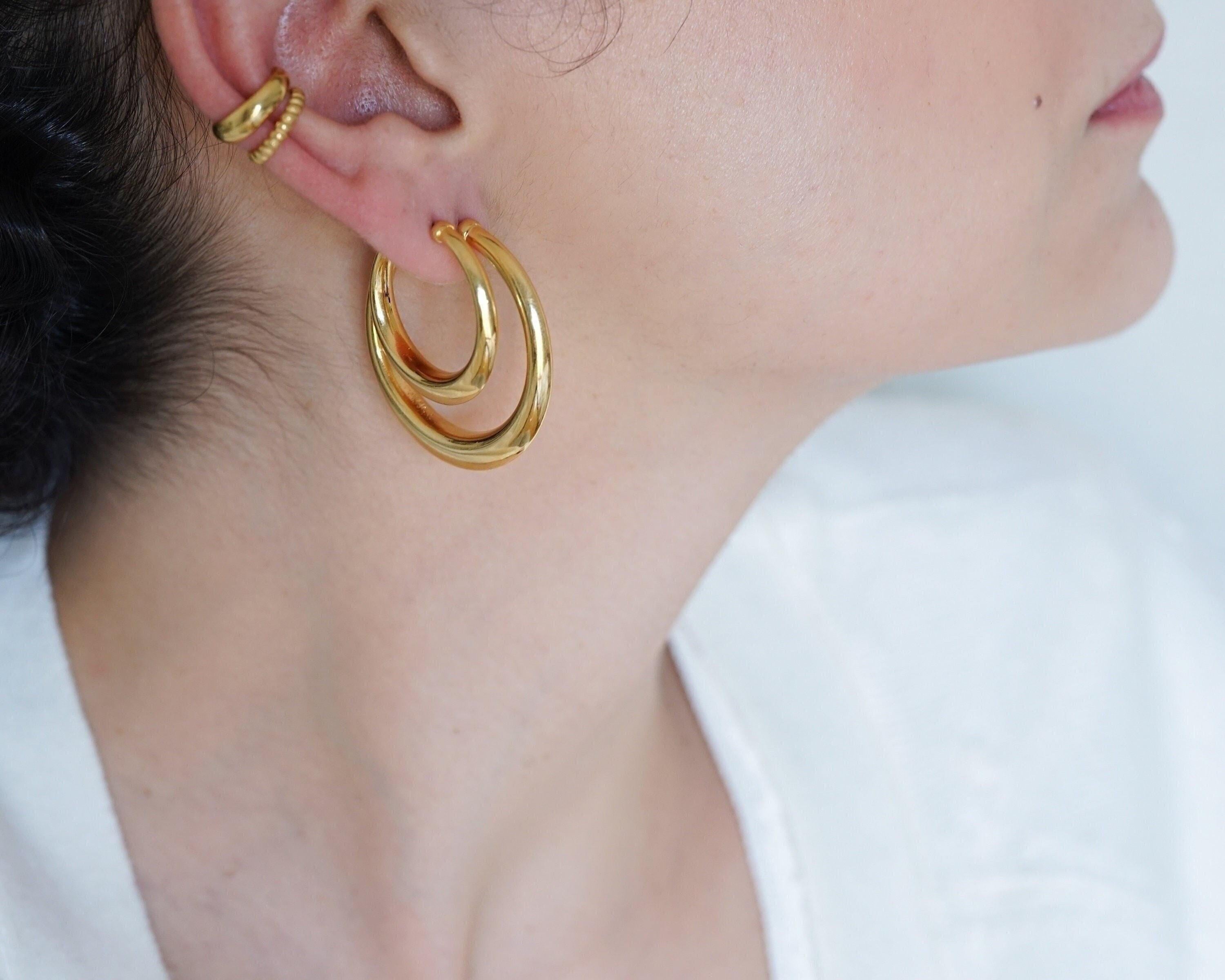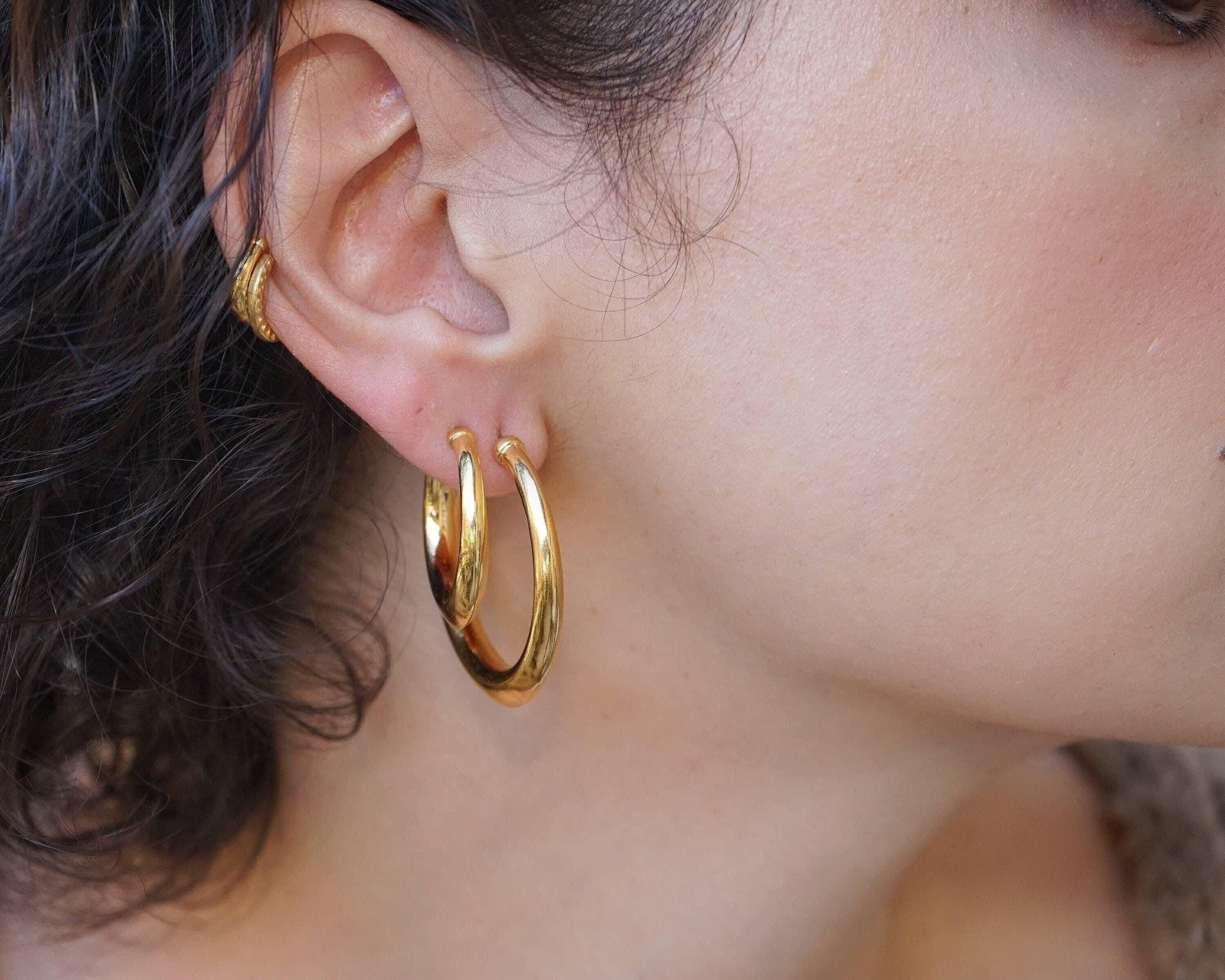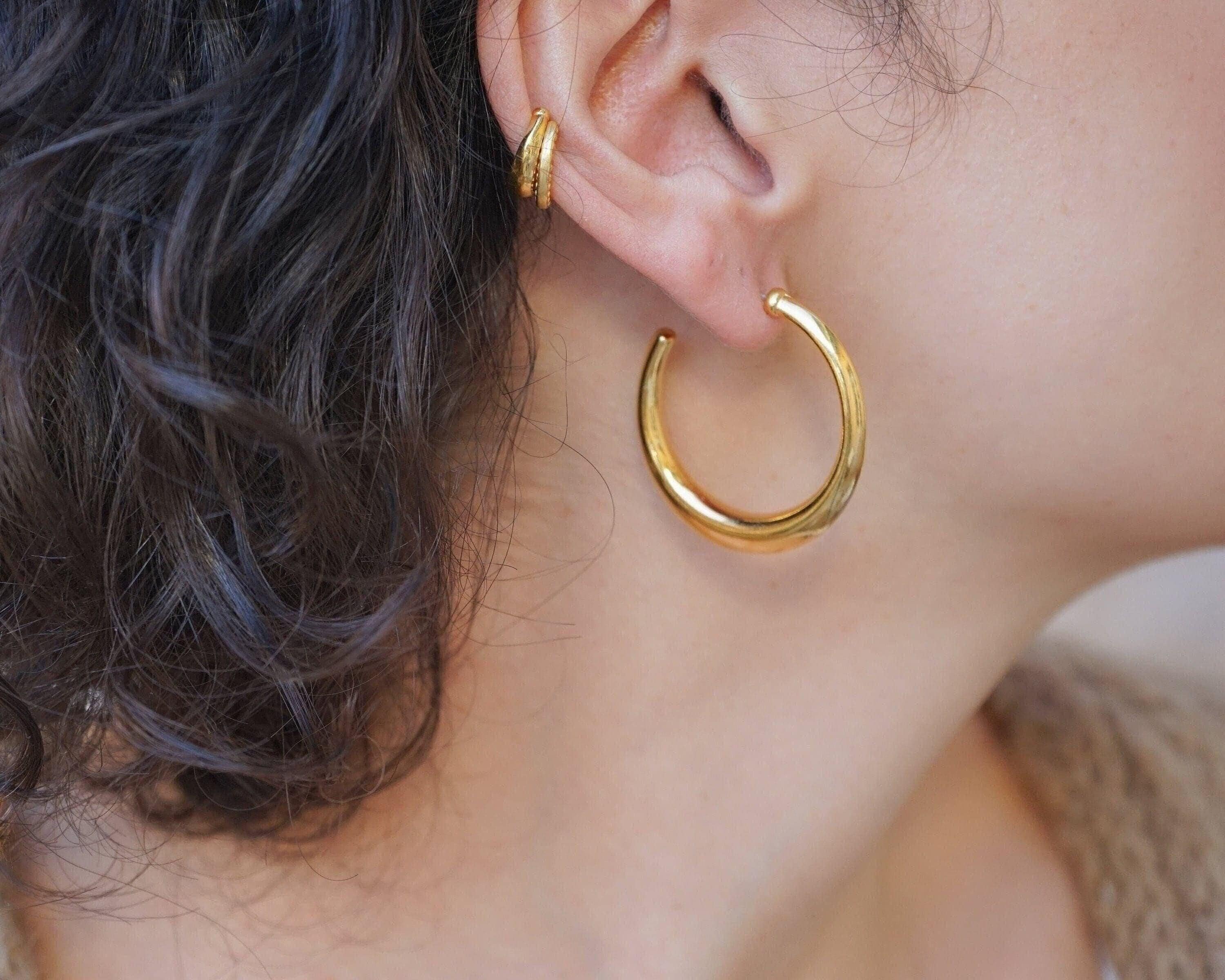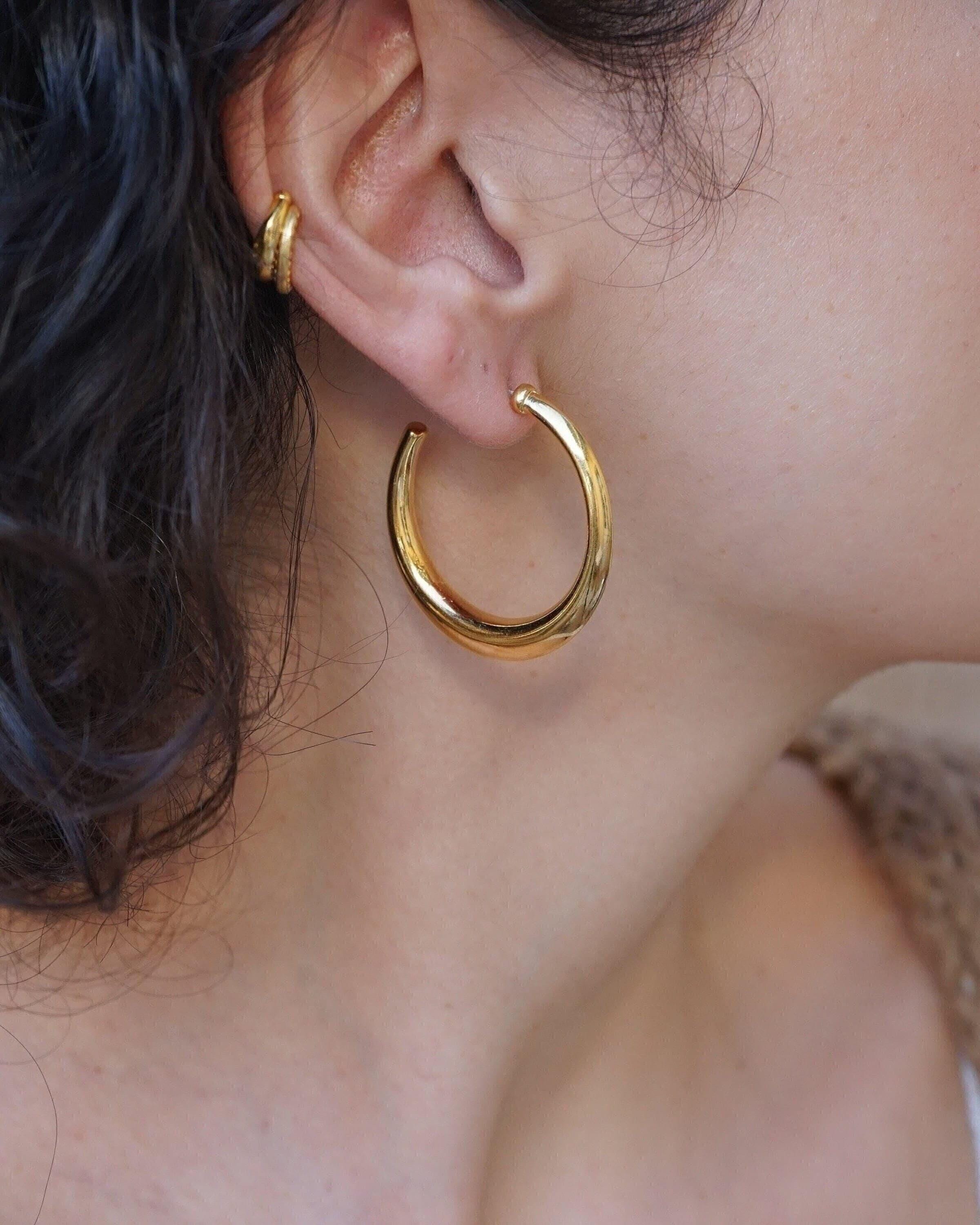 Discover these beautifully crafted chunky gold plated hoop earrings, featuring an organic and flowing shape that adds a touch of elegance to any outfit. Lightweight and comfortable, they are designed for effortless wear, ensuring they won’t tug on your earlobes. With their unique yet versatile design, these earrings can elevate casual looks or complement more formal attire.