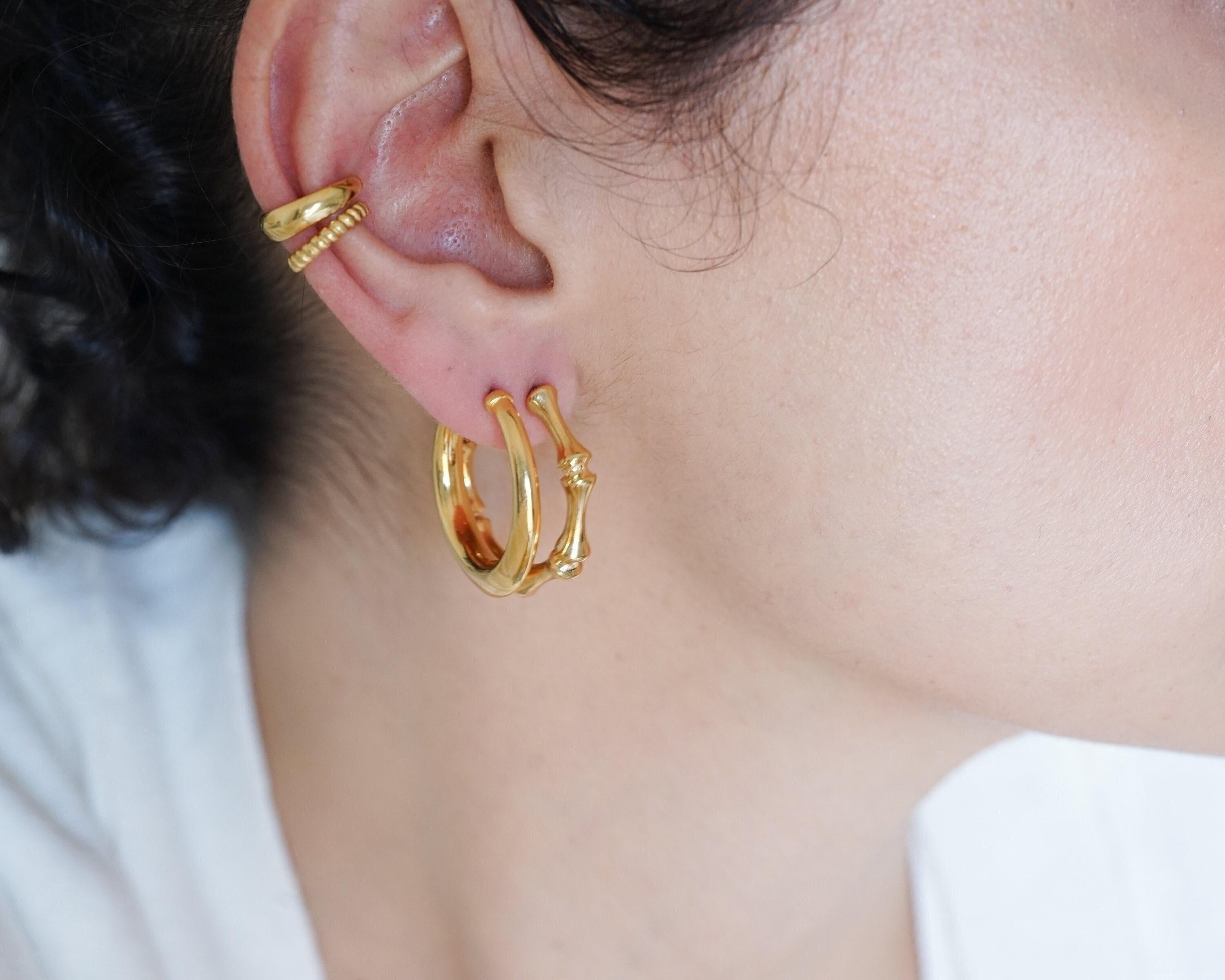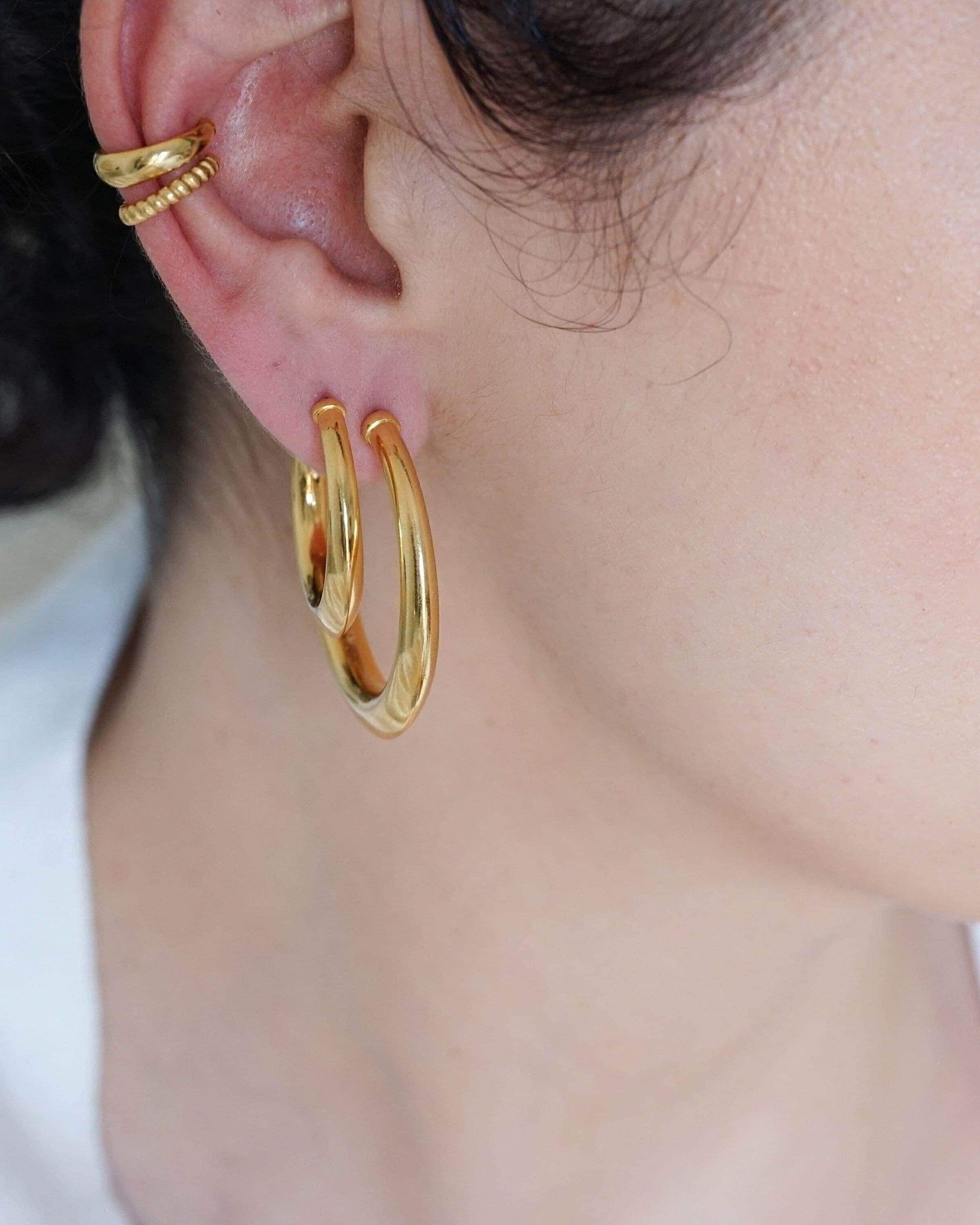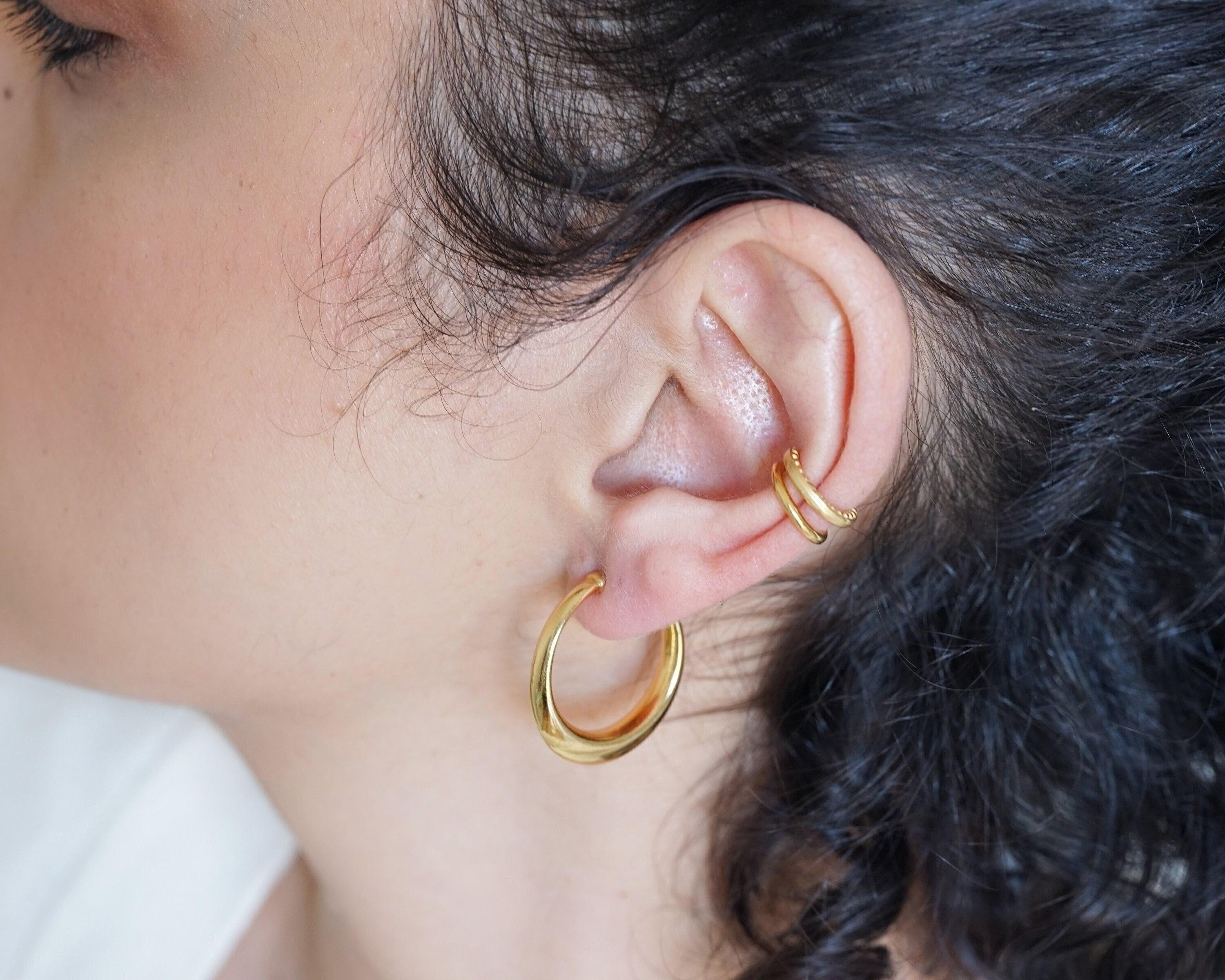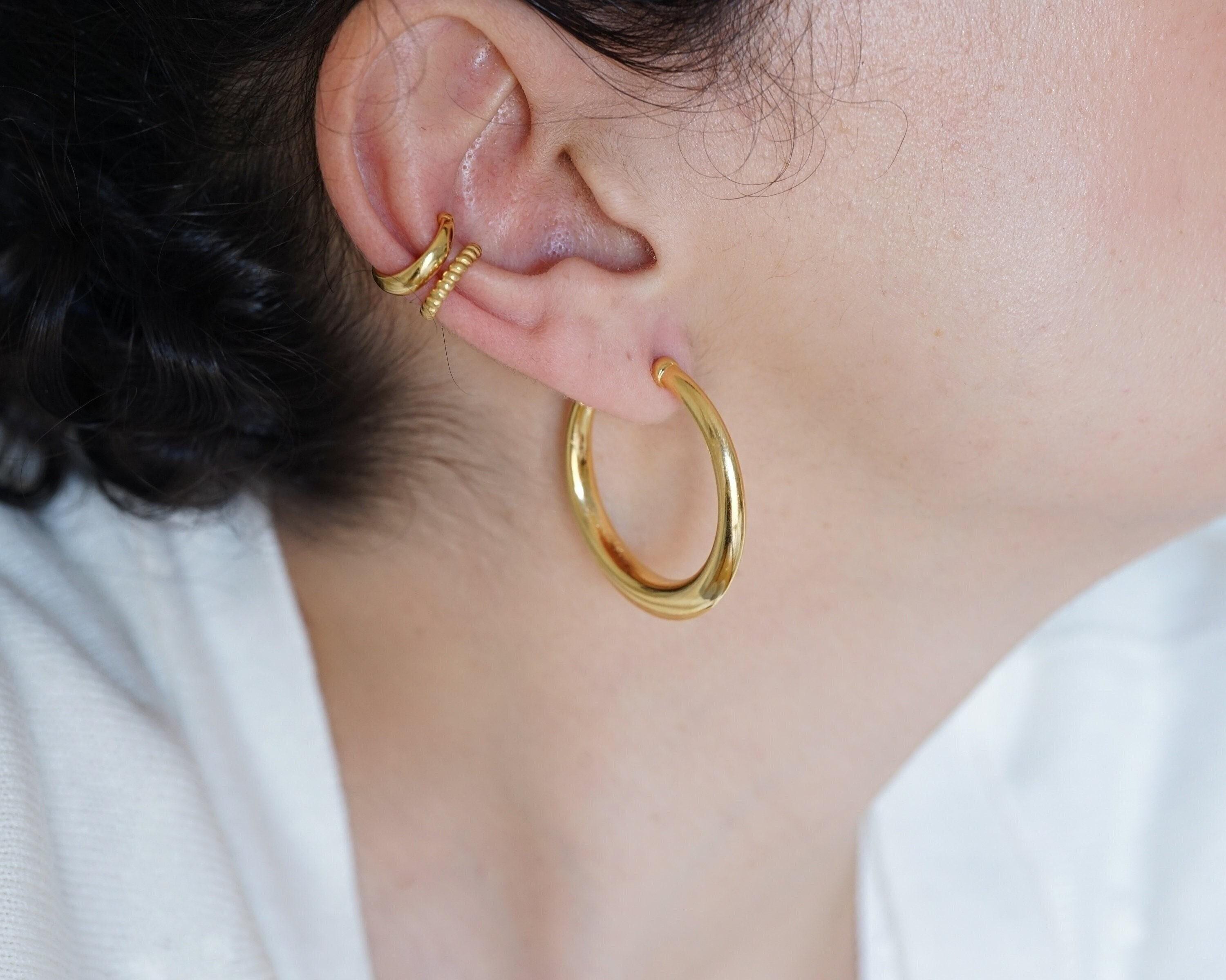 Discover these beautifully crafted chunky gold plated hoop earrings, featuring an organic and flowing shape that adds a touch of elegance to any outfit. Lightweight and comfortable, they are designed for effortless wear, ensuring they won’t tug on your earlobes. With their unique yet versatile design, these earrings can elevate casual looks or complement more formal attire.