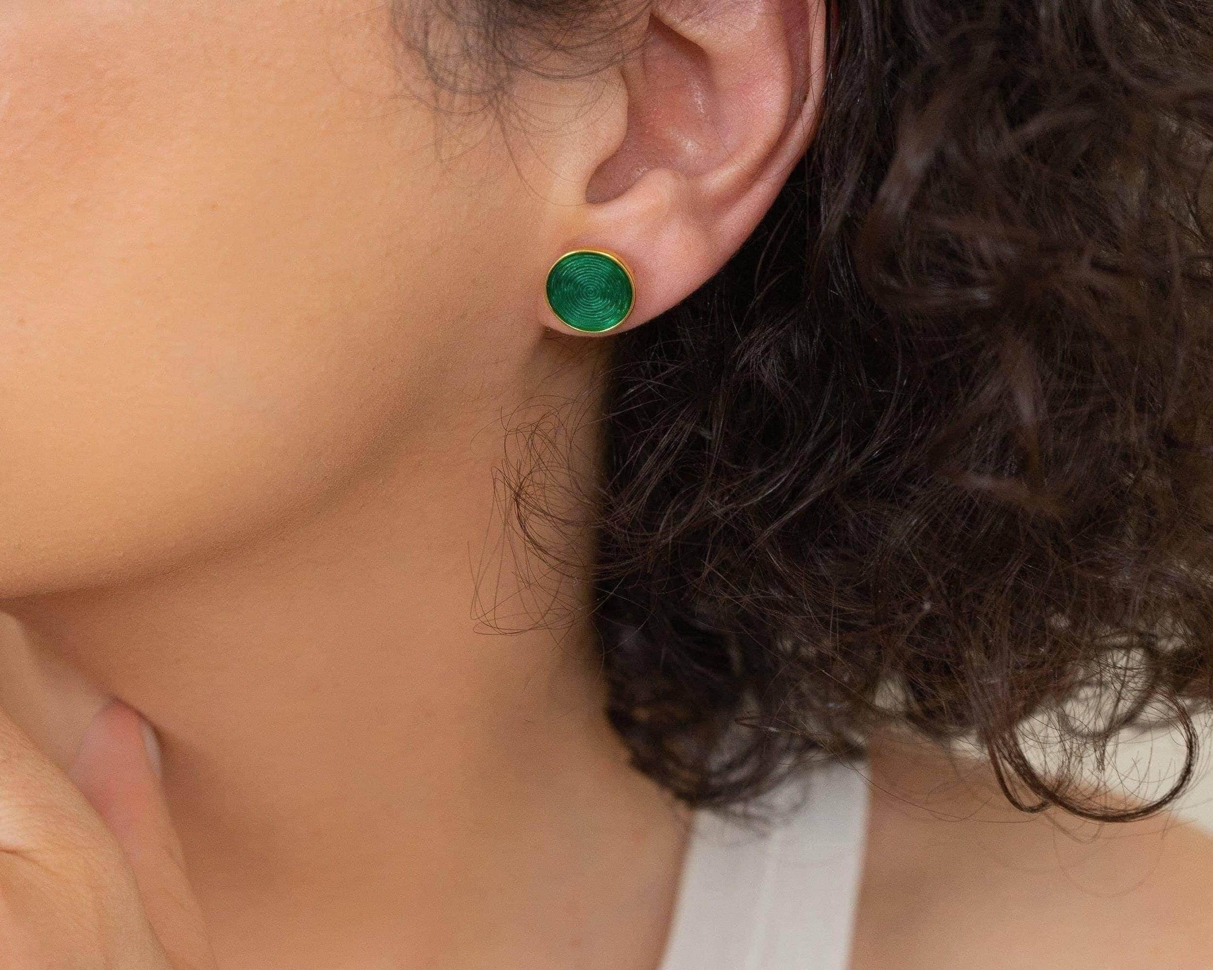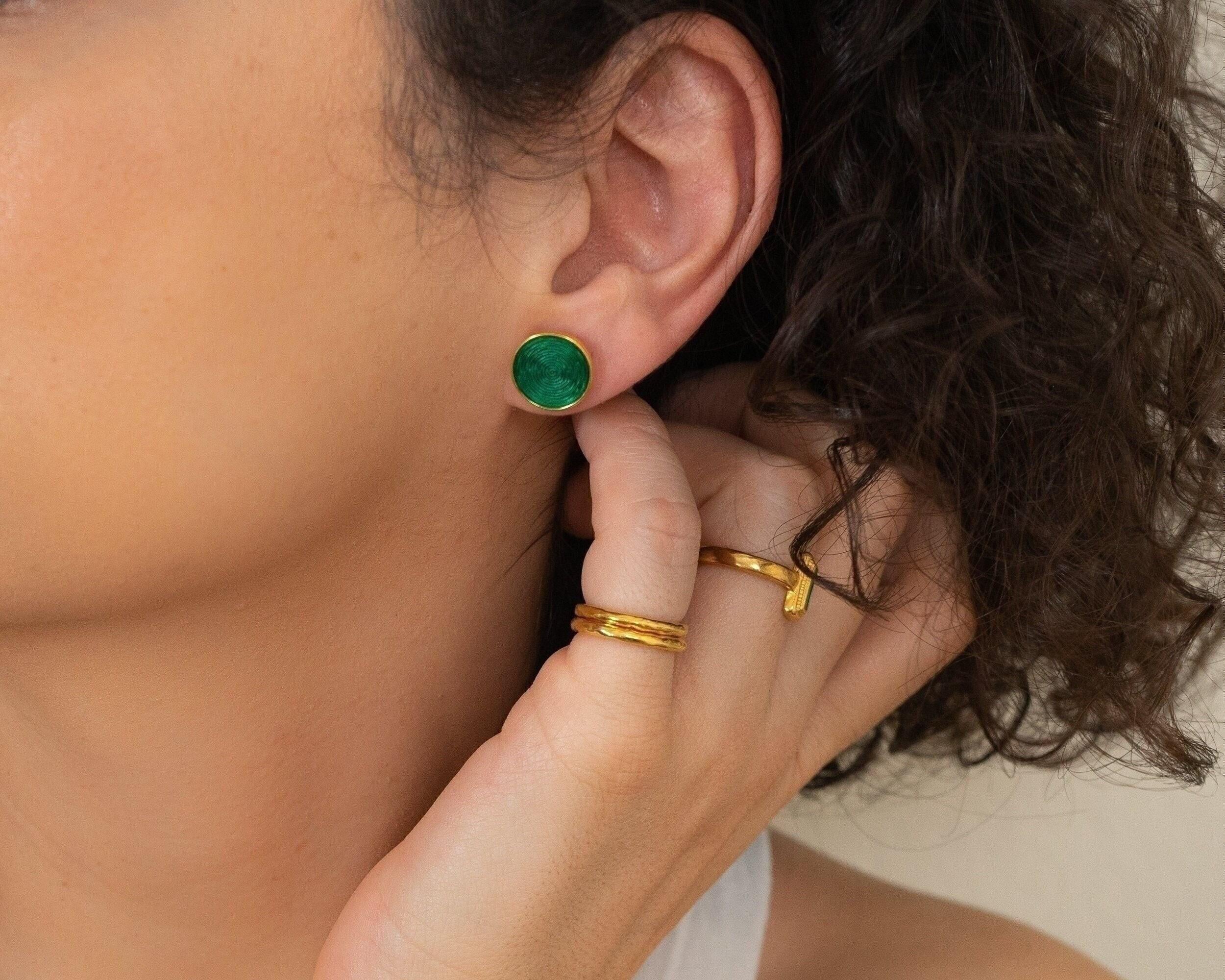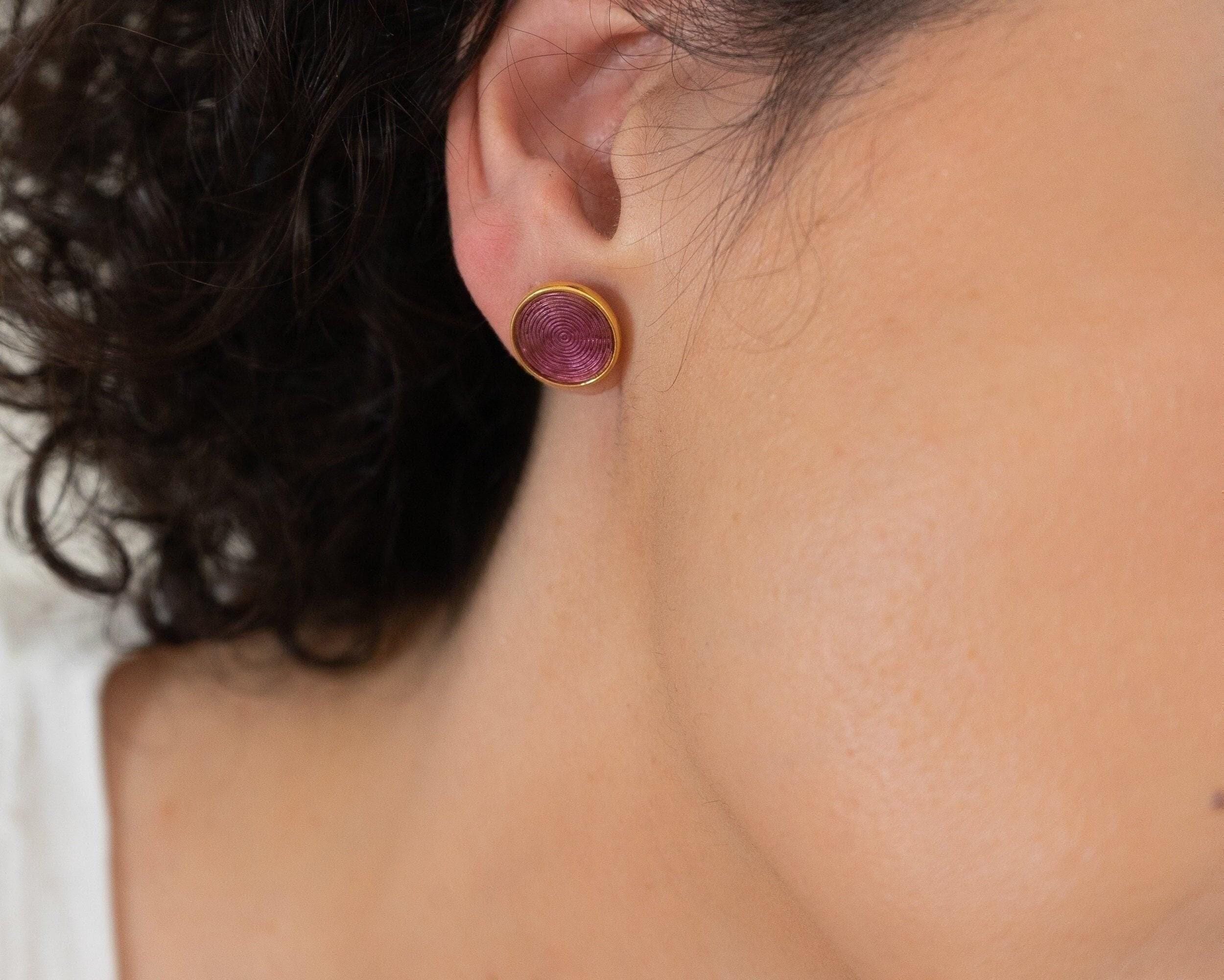Discover these elegantly designed stud earrings, featuring a stunning pattern in either turquoise or purple enamel. Crafted with 24k gold plating, these earrings add a touch of sophistication to any outfit, making them a unique and fashionable accessory.