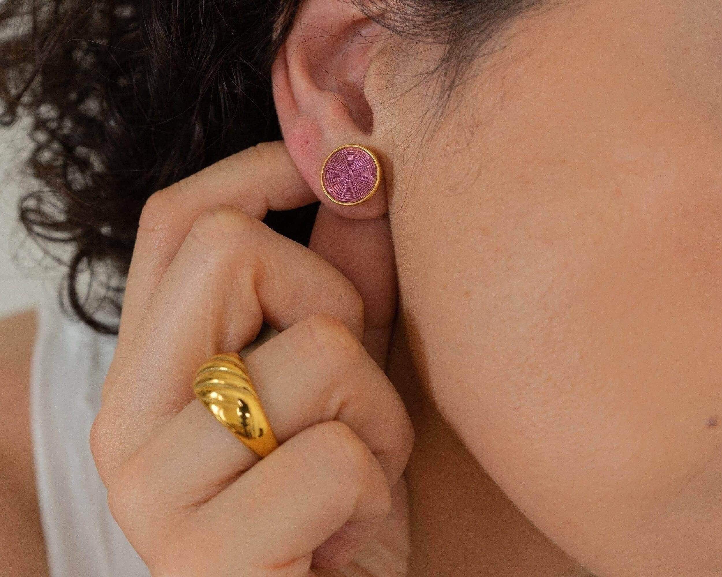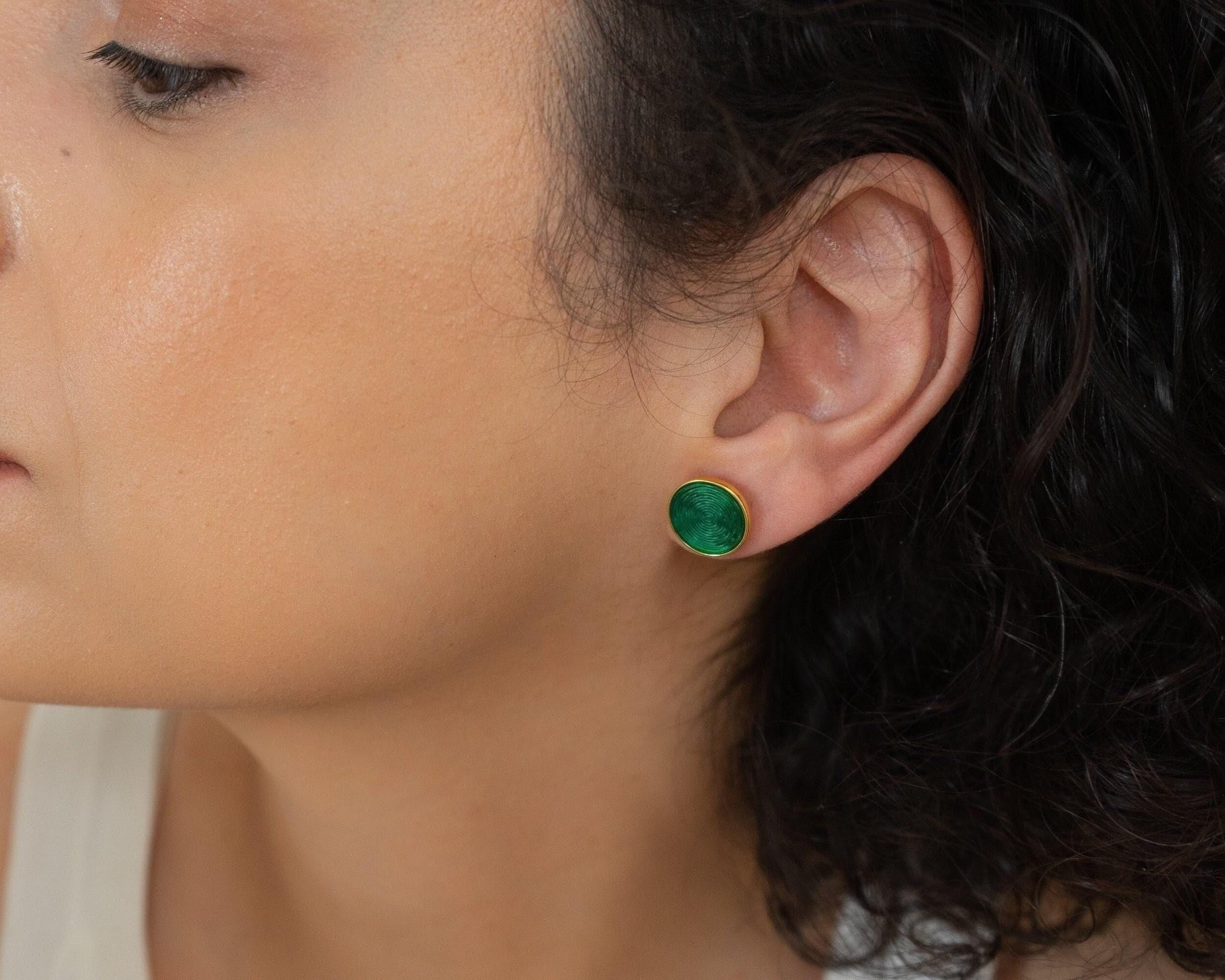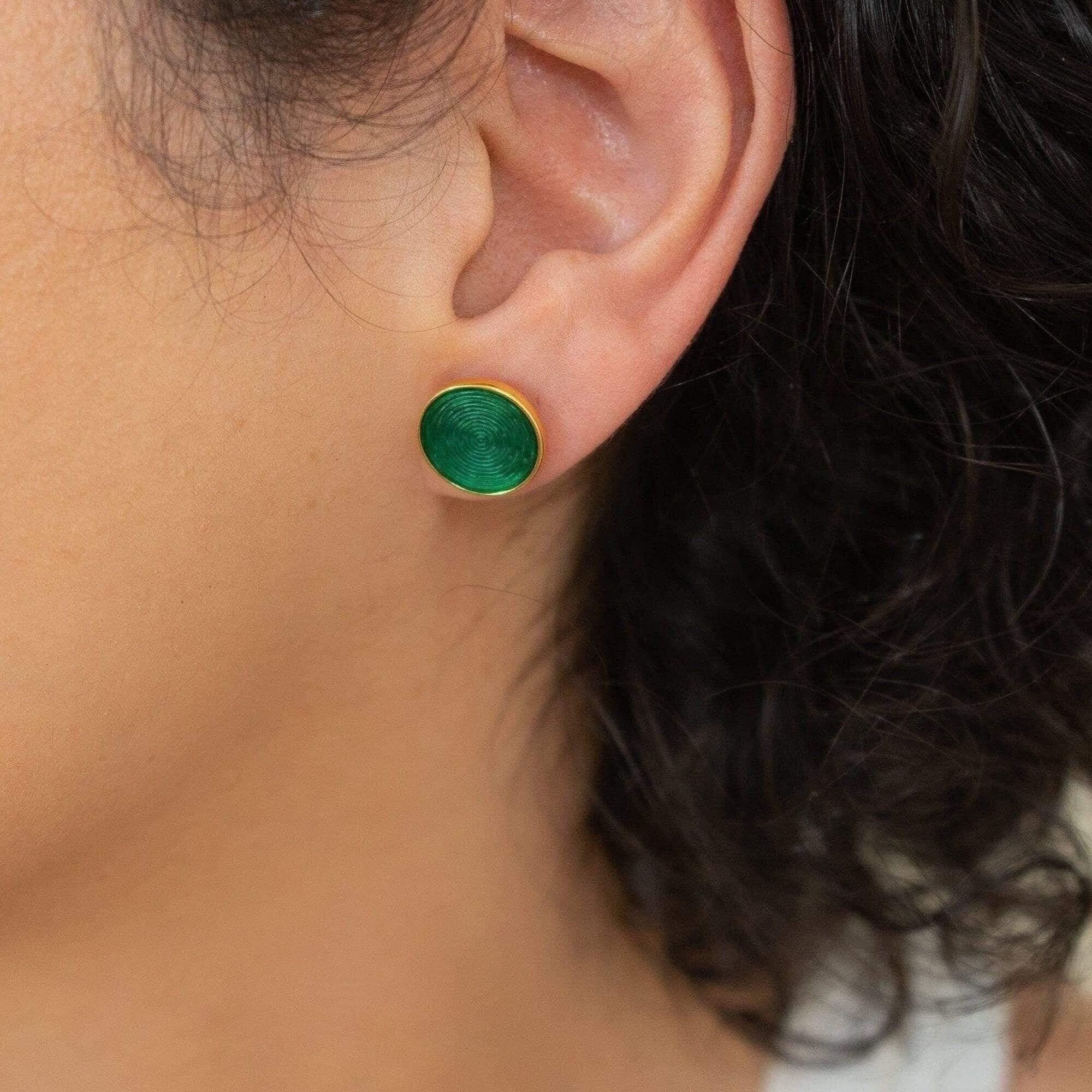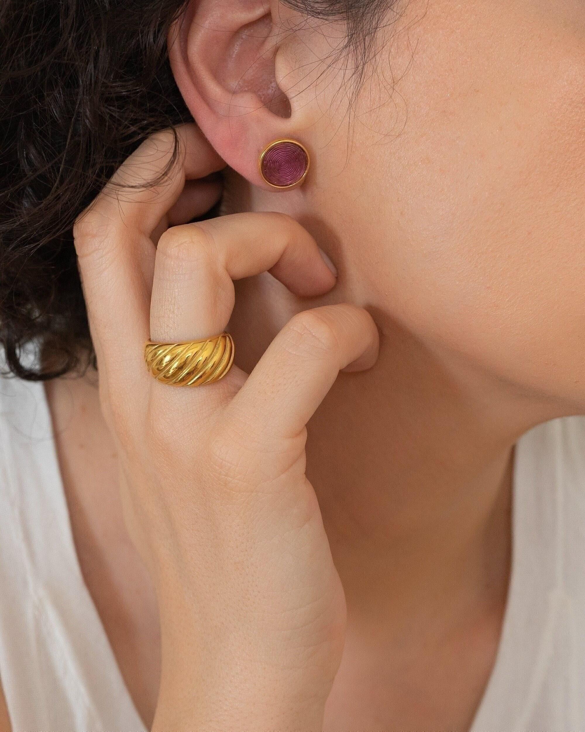 Discover these elegantly designed stud earrings, featuring a stunning pattern in either turquoise or purple enamel. Crafted with 24k gold plating, these earrings add a touch of sophistication to any outfit, making them a unique and fashionable accessory.