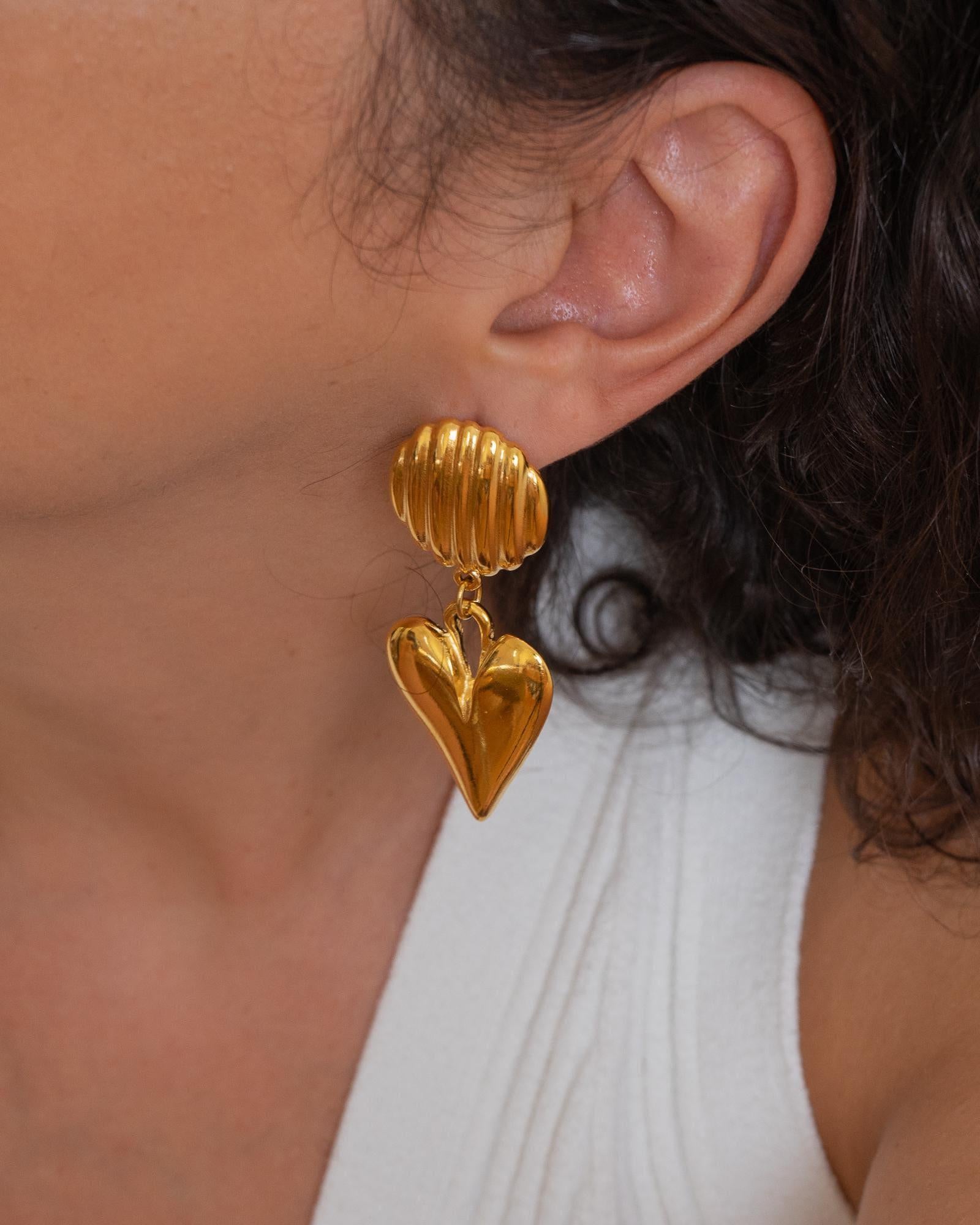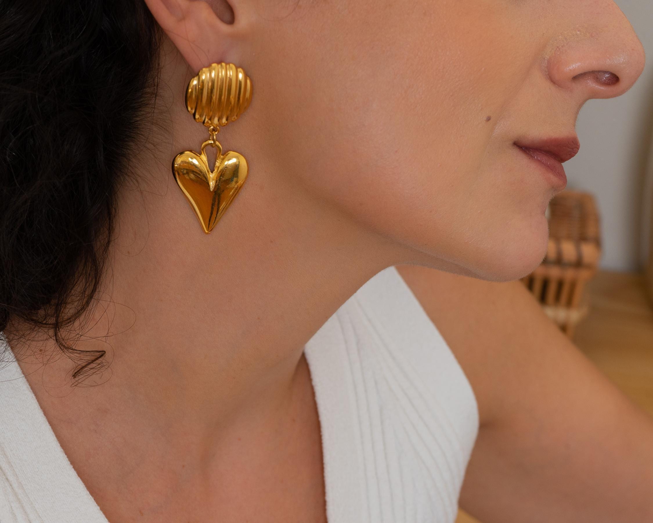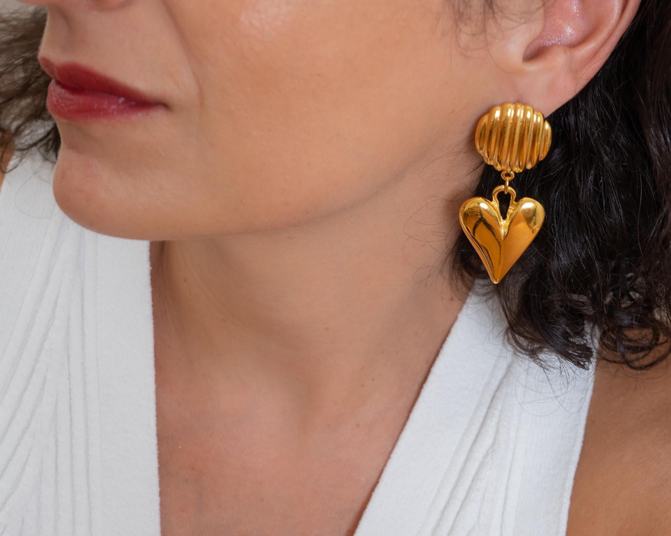 These large gold dangling heart stud earrings make a striking addition to any jewelry collection. Their contemporary design exudes sophistication, perfect for elevating both casual and formal outfits.