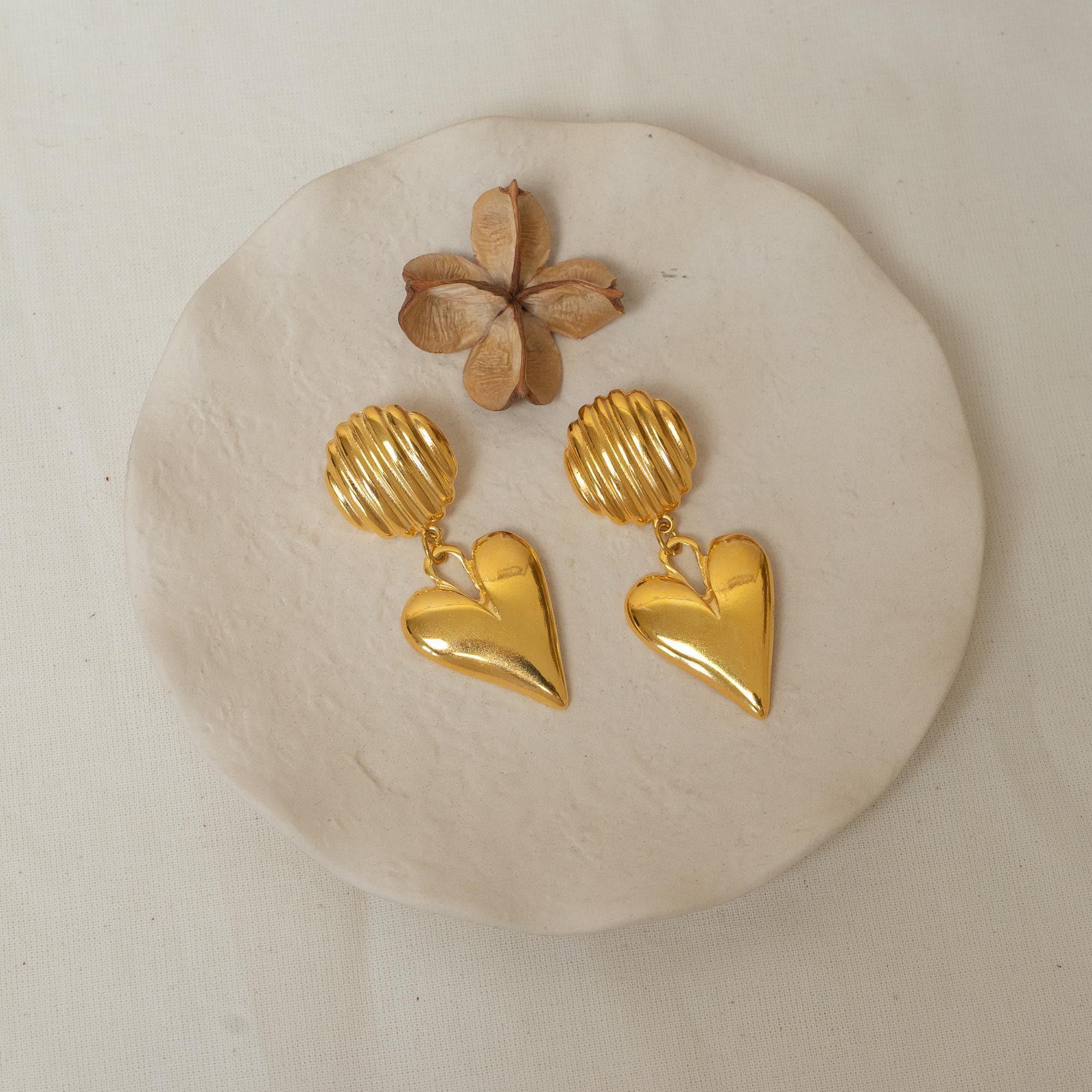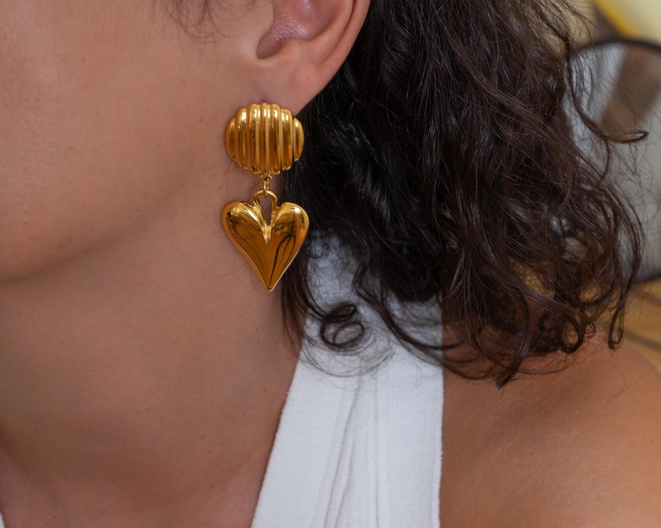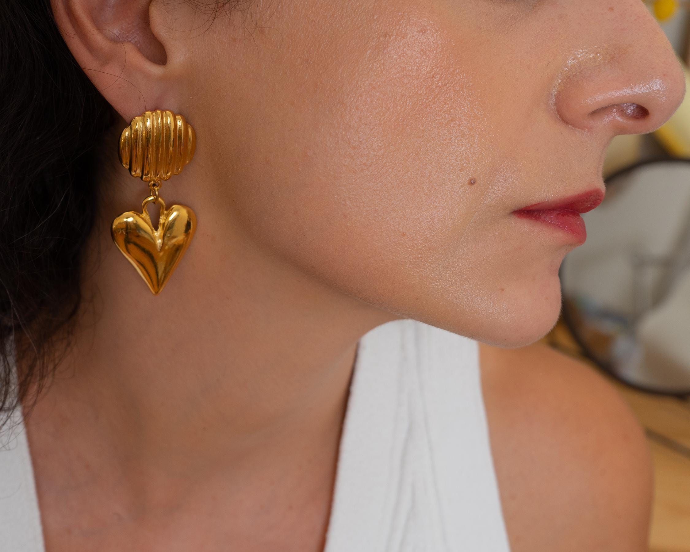 These large gold dangling heart stud earrings make a striking addition to any jewelry collection. Their contemporary design exudes sophistication, perfect for elevating both casual and formal outfits.