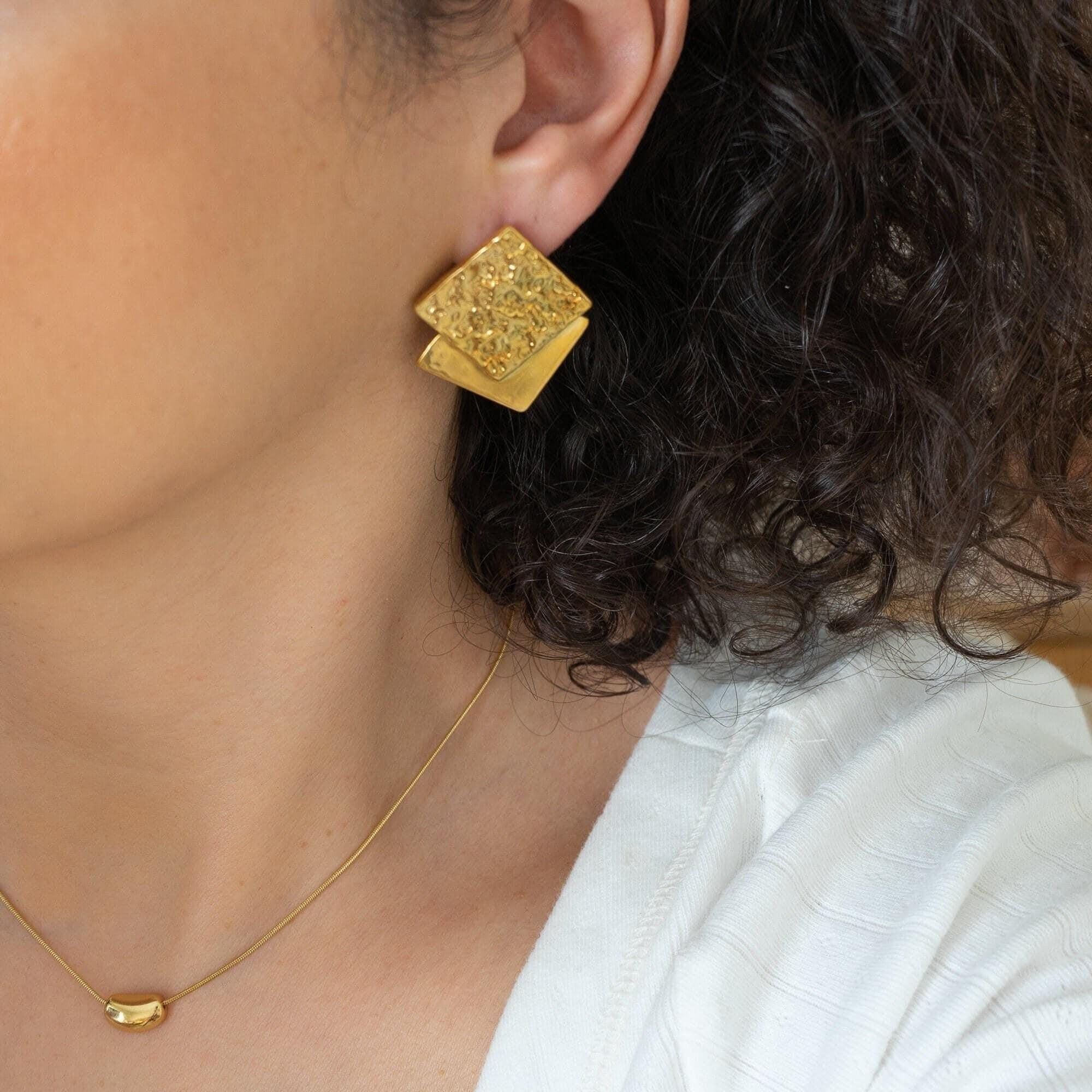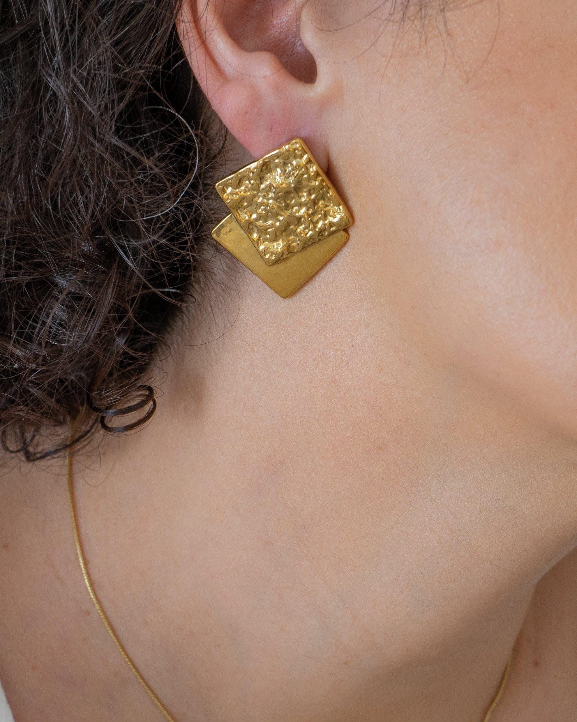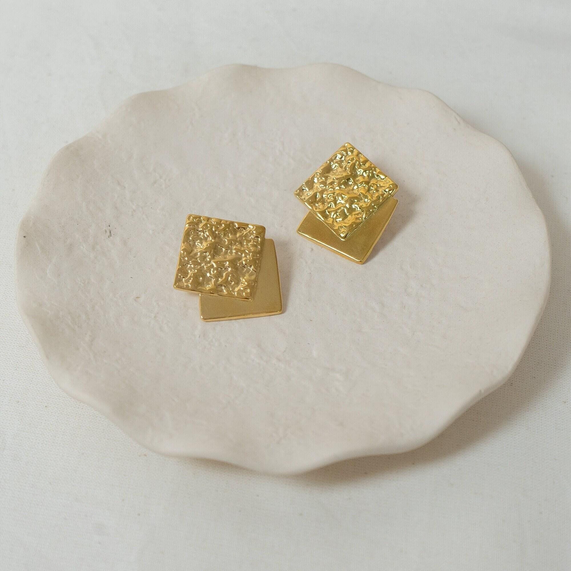 Introducing our DOUBLE SQUARES Stud Earrings, a stylish addition to your jewelry collection. These large, hammered square earrings are designed to enhance both your everyday looks and special occasions, bringing a modern touch to any outfit. Crafted for durability, they are also waterproof, making them perfect for all-day wear.