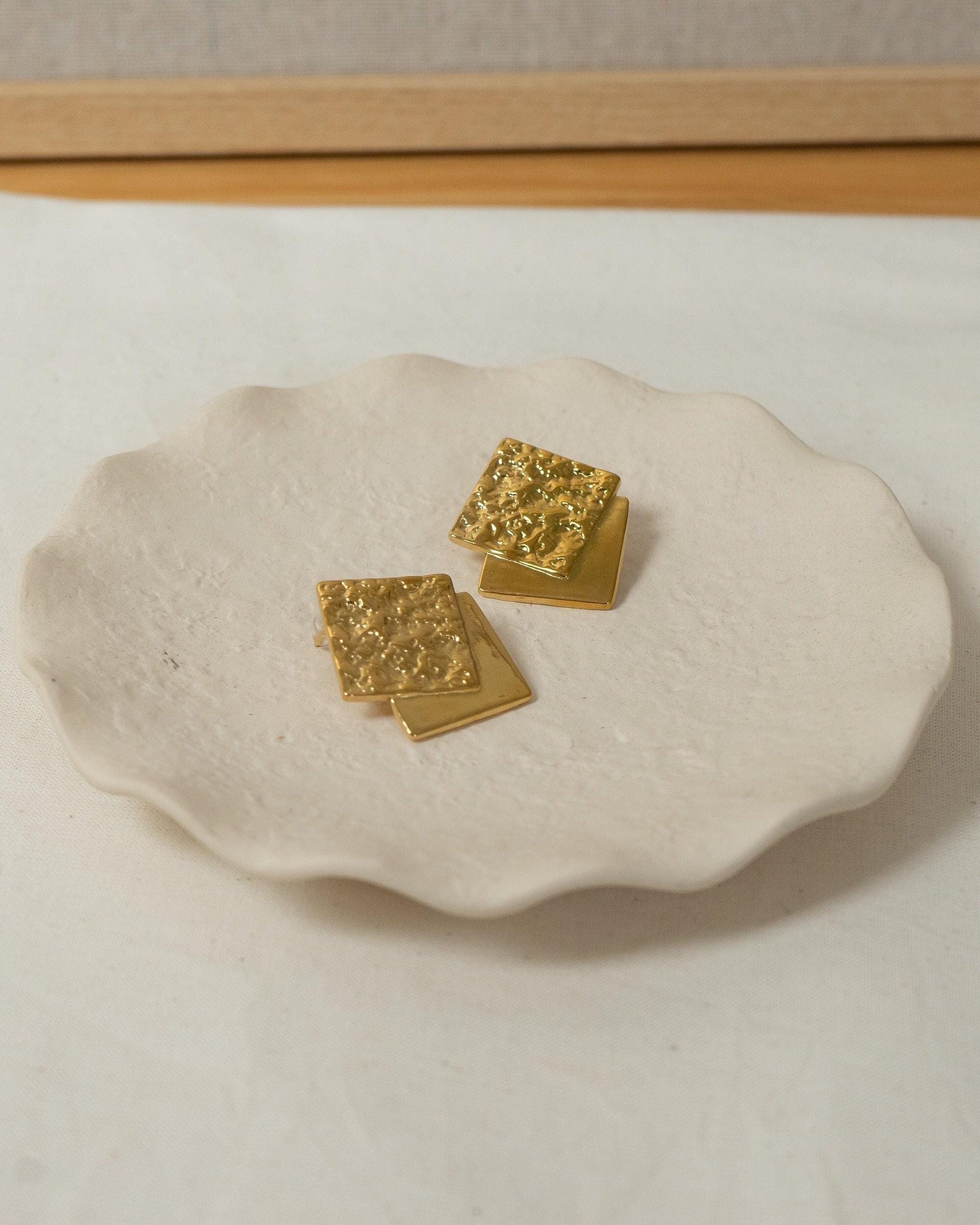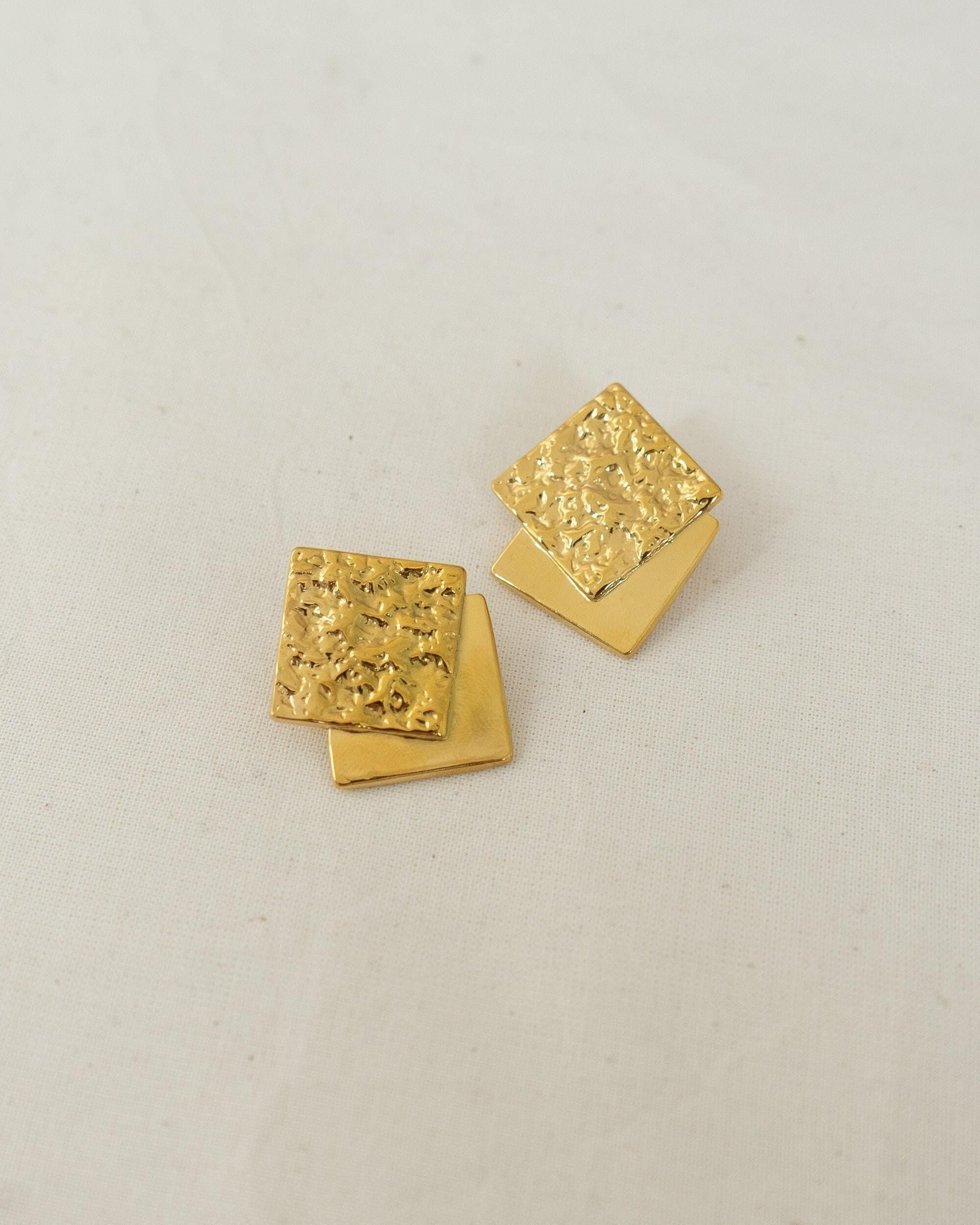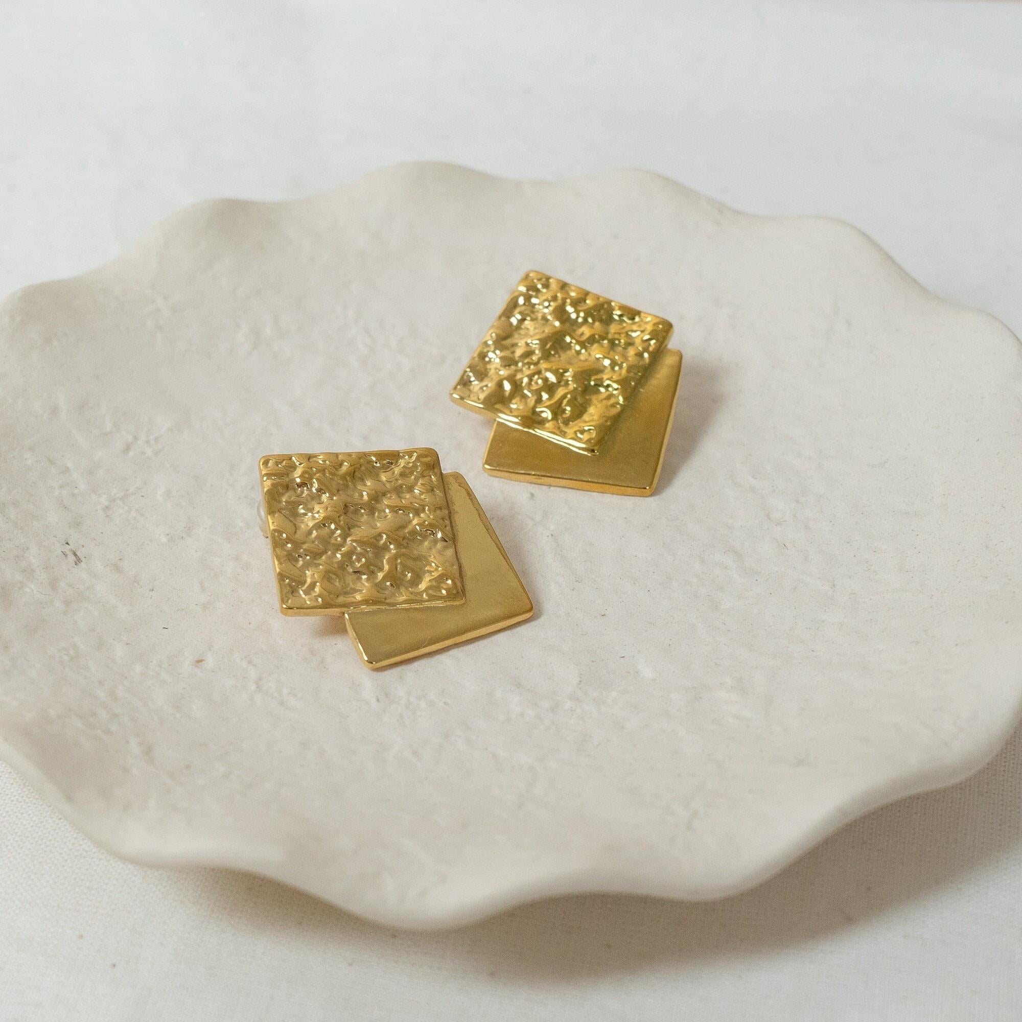 Introducing our DOUBLE SQUARES Stud Earrings, a stylish addition to your jewelry collection. These large, hammered square earrings are designed to enhance both your everyday looks and special occasions, bringing a modern touch to any outfit. Crafted for durability, they are also waterproof, making them perfect for all-day wear.