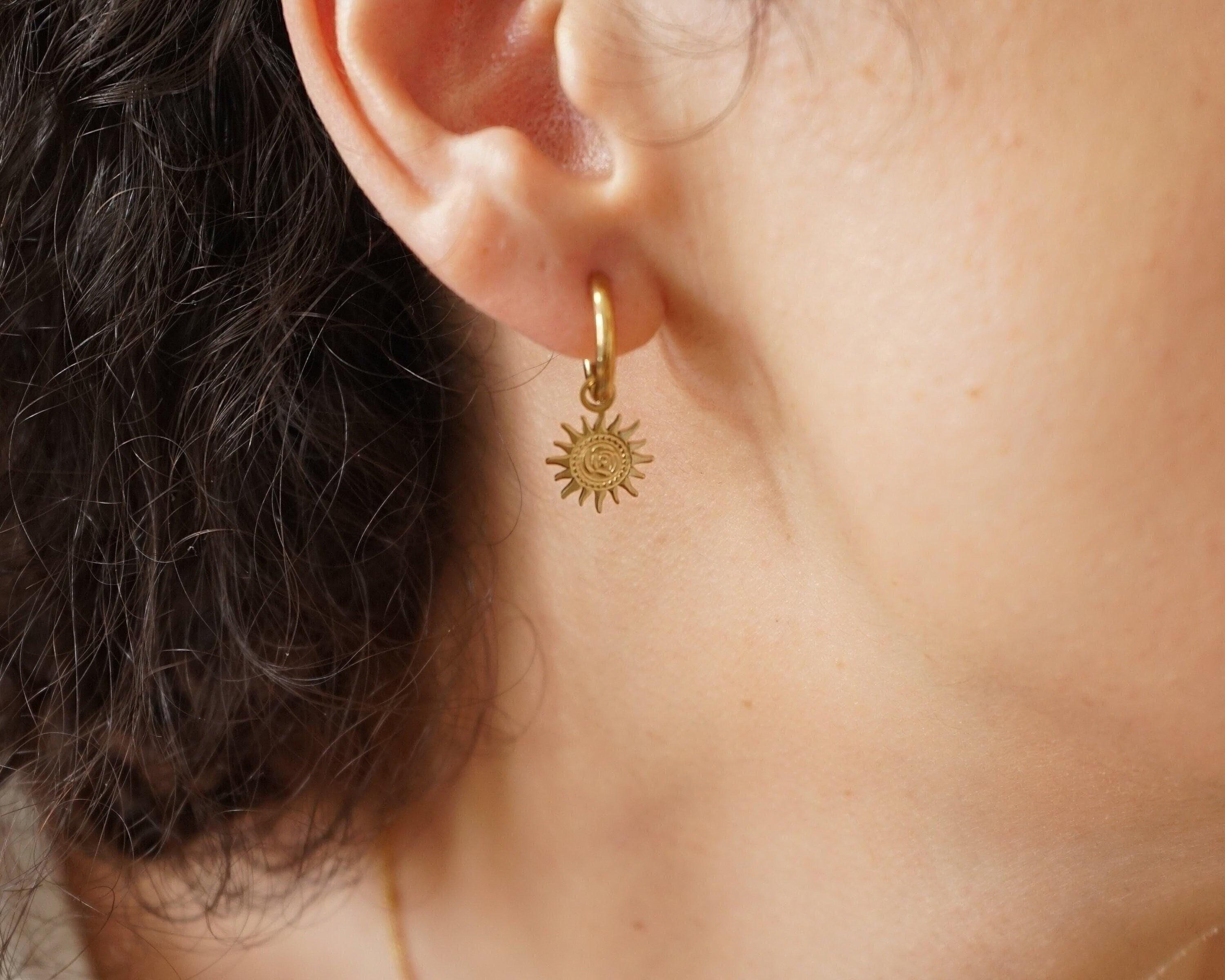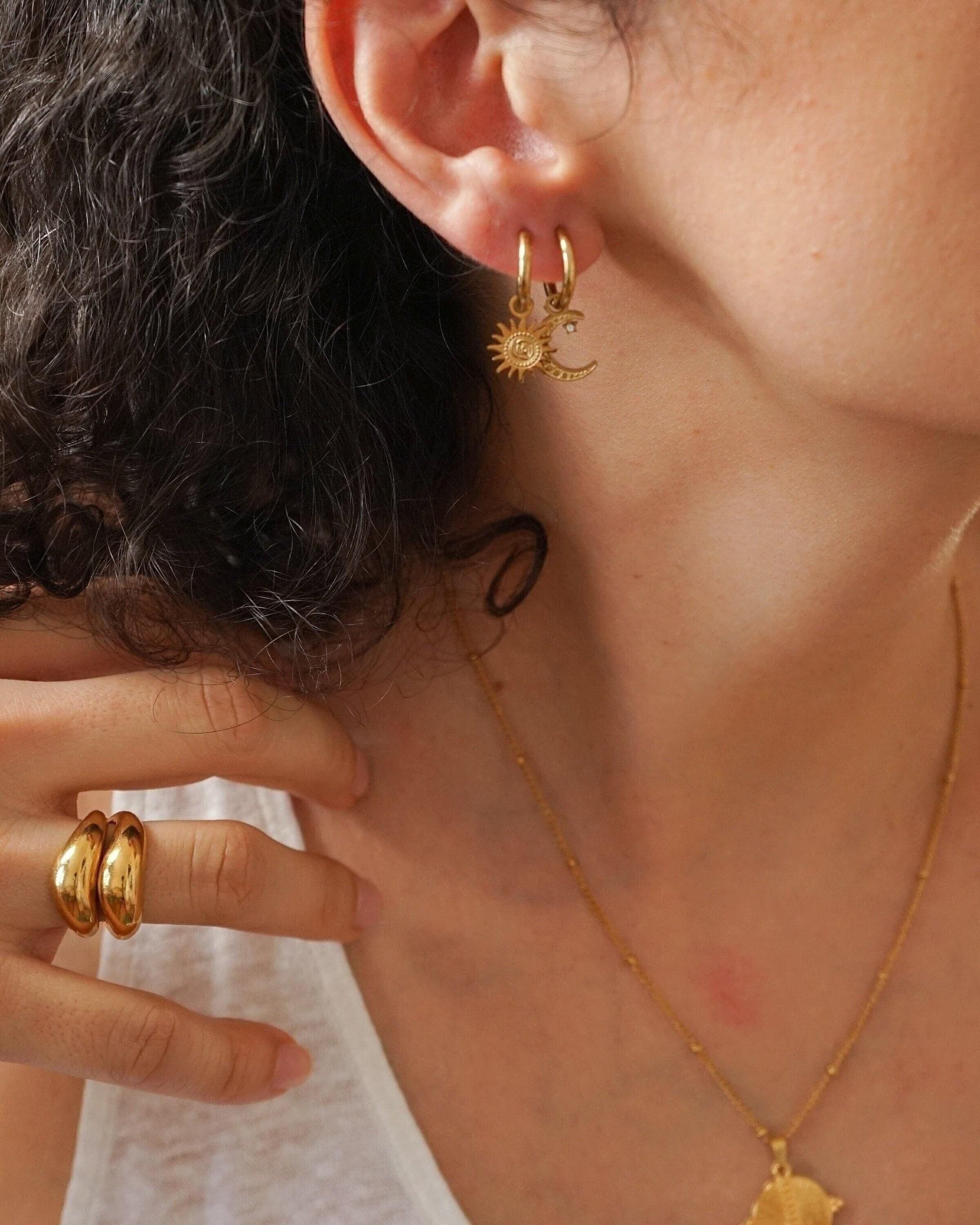 Crafted from tarnish-free stainless steel, these mini celestial hoops are perfect for seamlessly transitioning from day to night. Their warm gold finish adds a timeless quality to your ensemble, making them a beautiful blend of classic and modern. Designed with comfort in mind, you can wear these earrings all day without a worry.