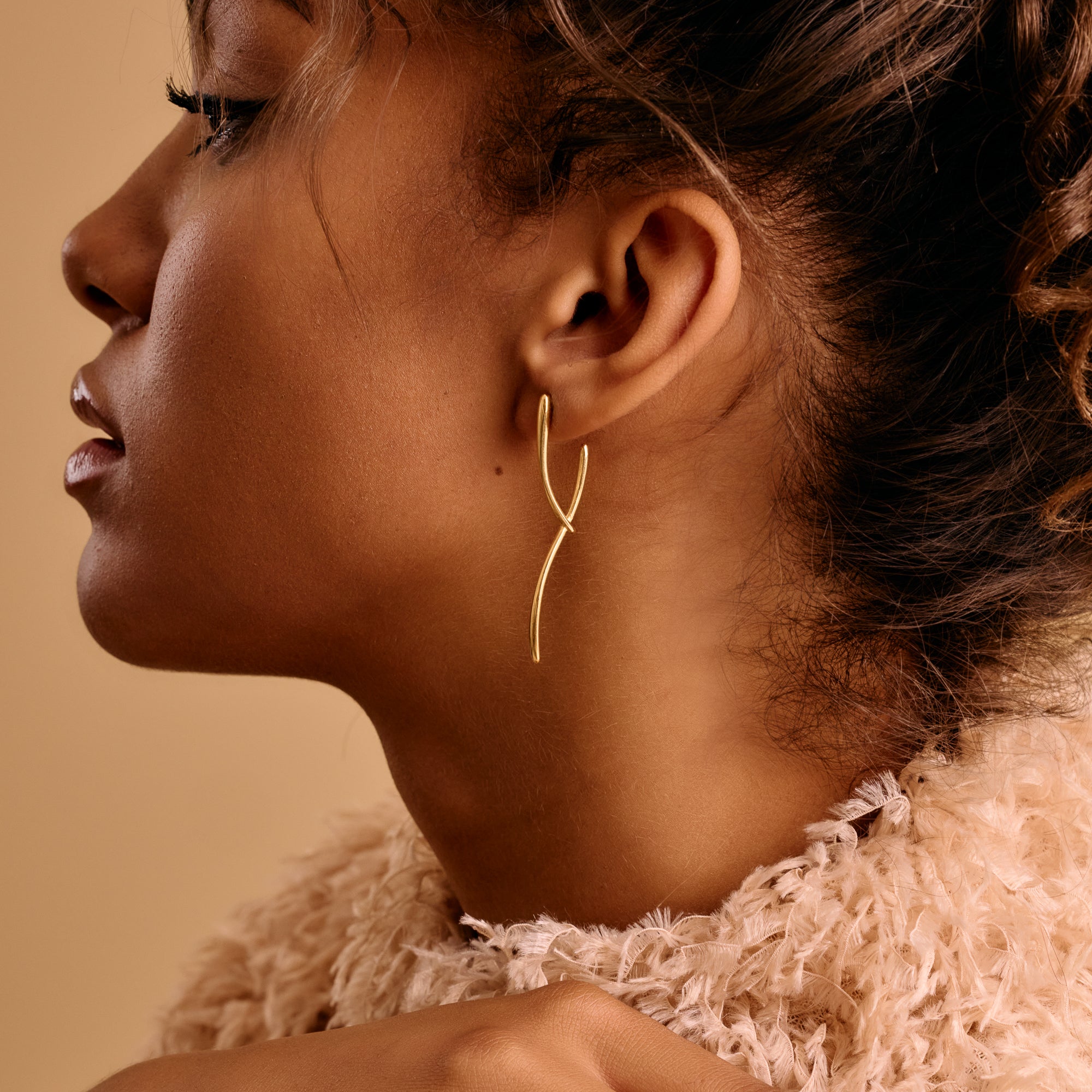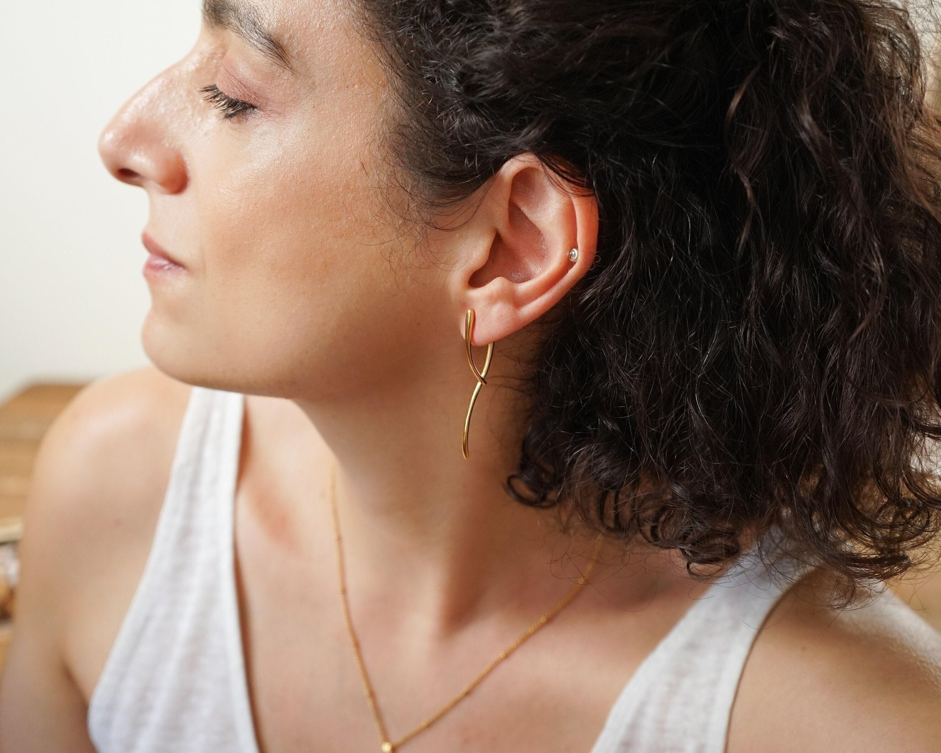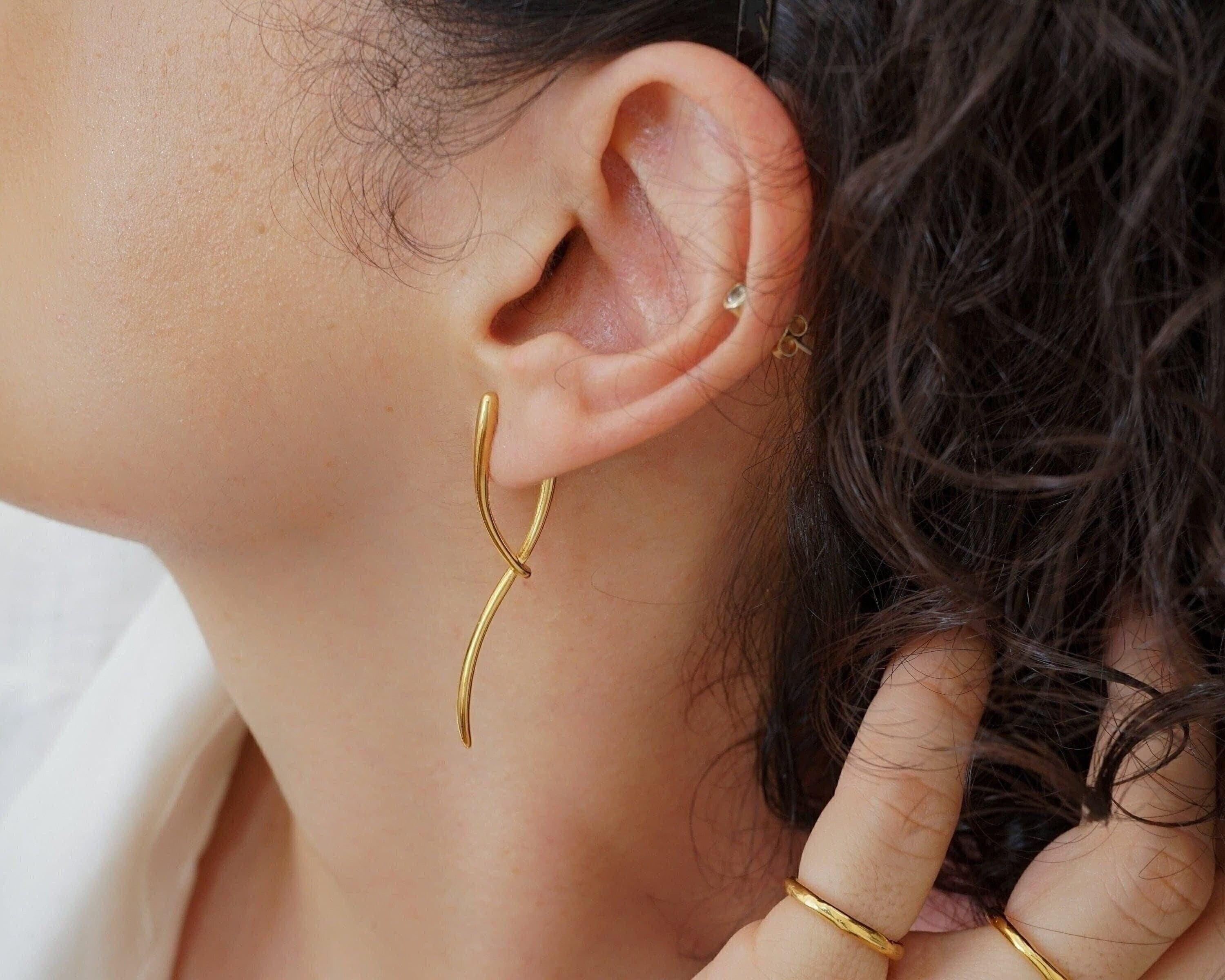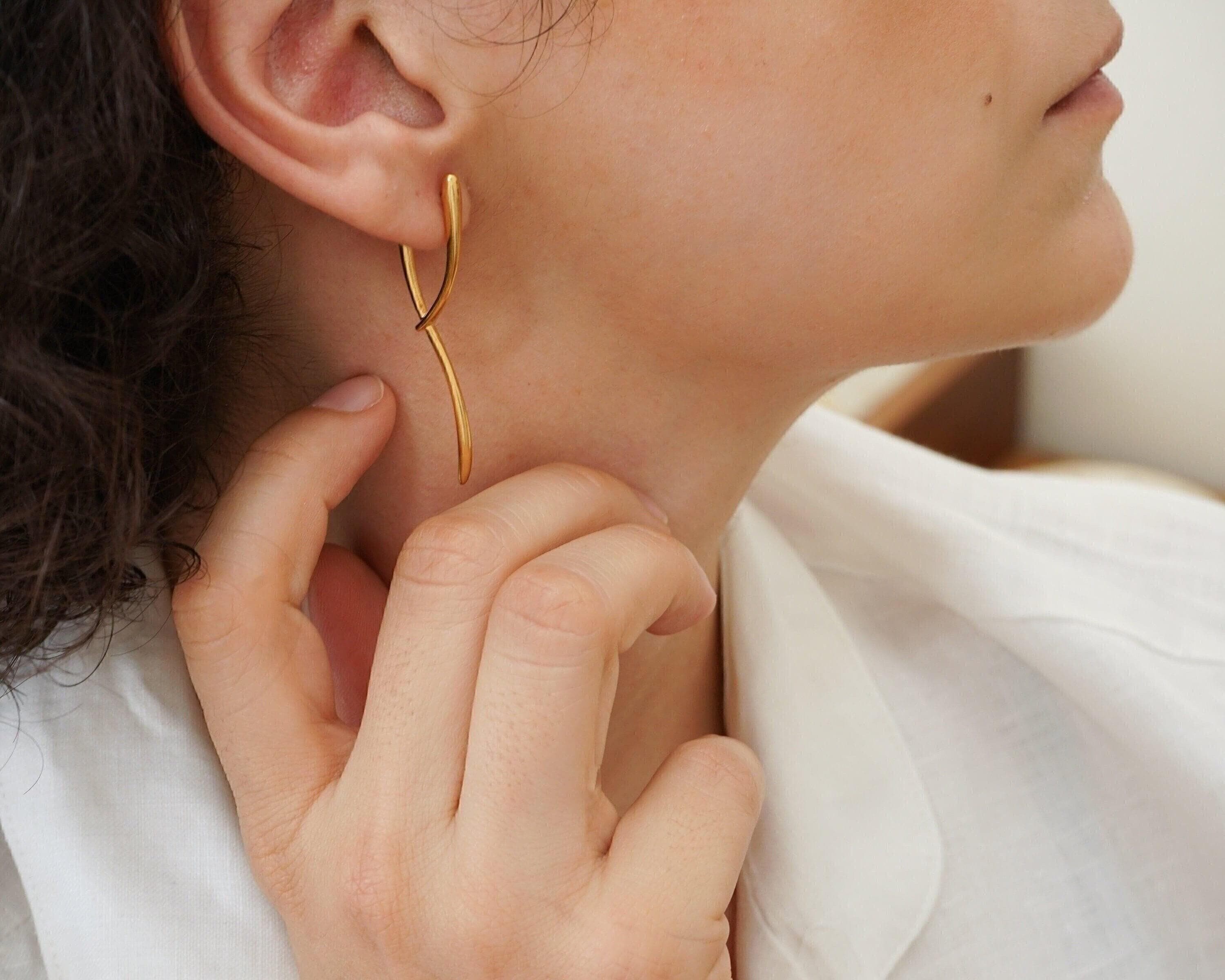 Discover the charm of these gold-plated 3/4 earrings, designed with a unique, free-flowing shape that adds a touch of elegance to any outfit. Wear them solo for a classic look, or stack them together for a contemporary flair if you have multiple piercings.