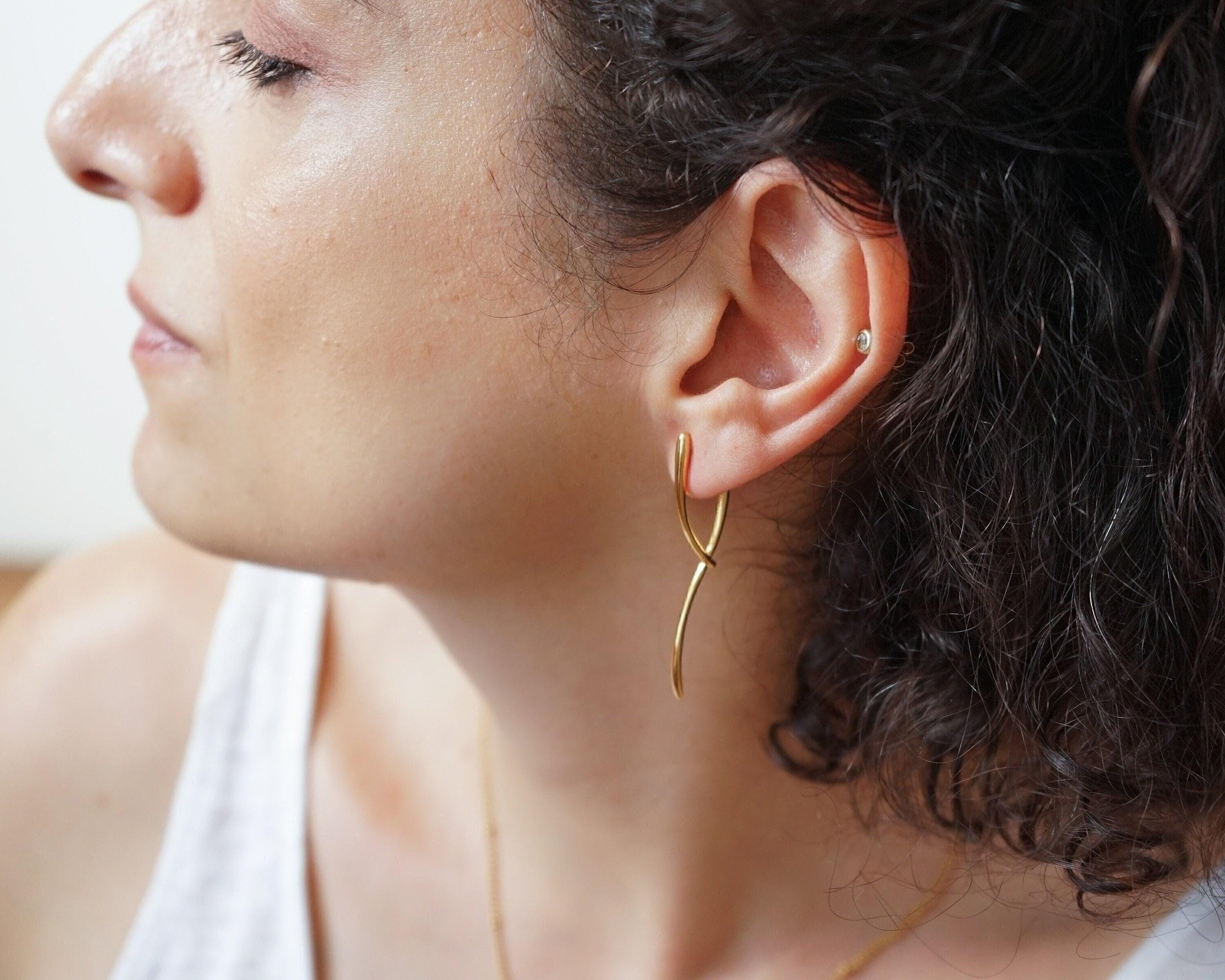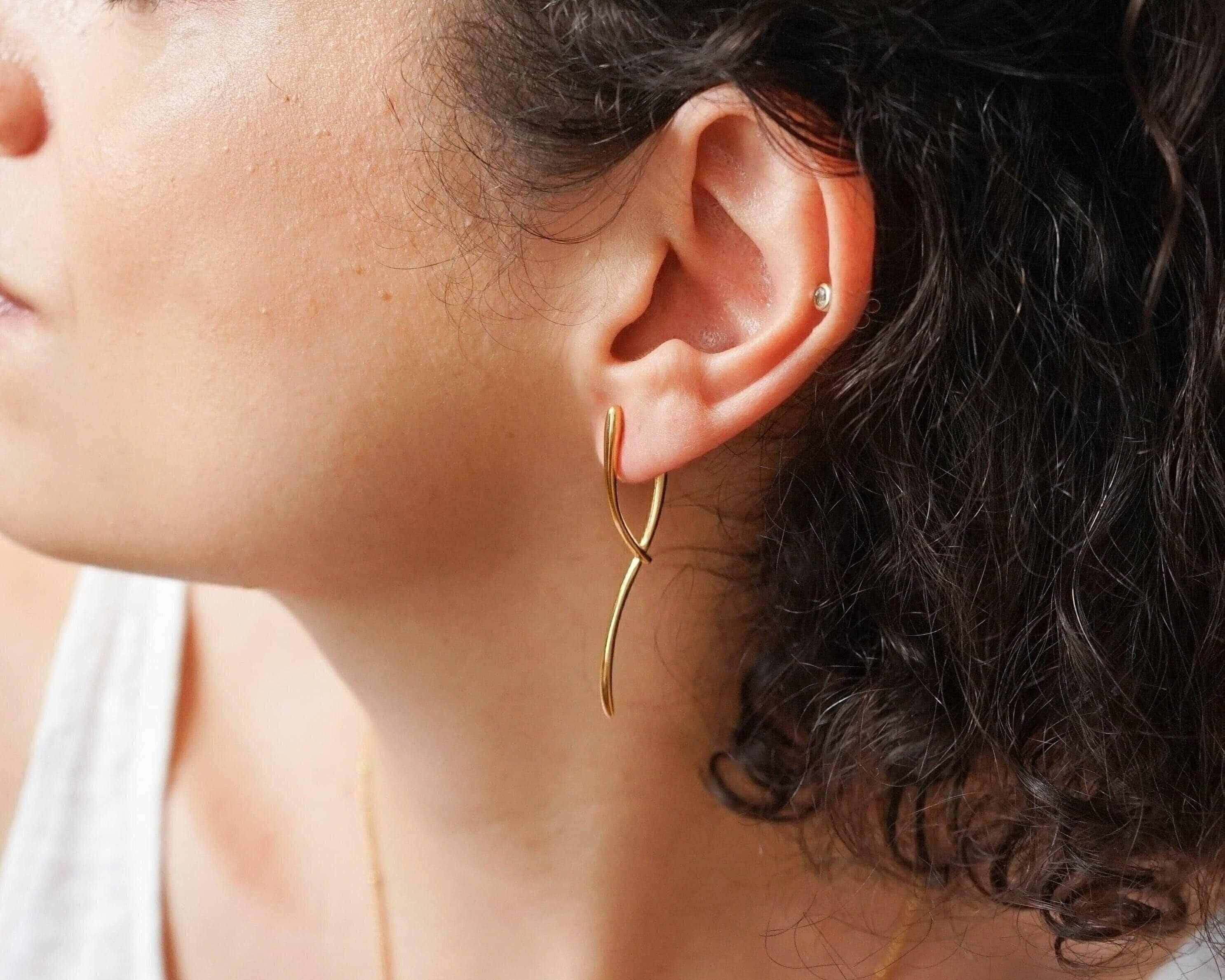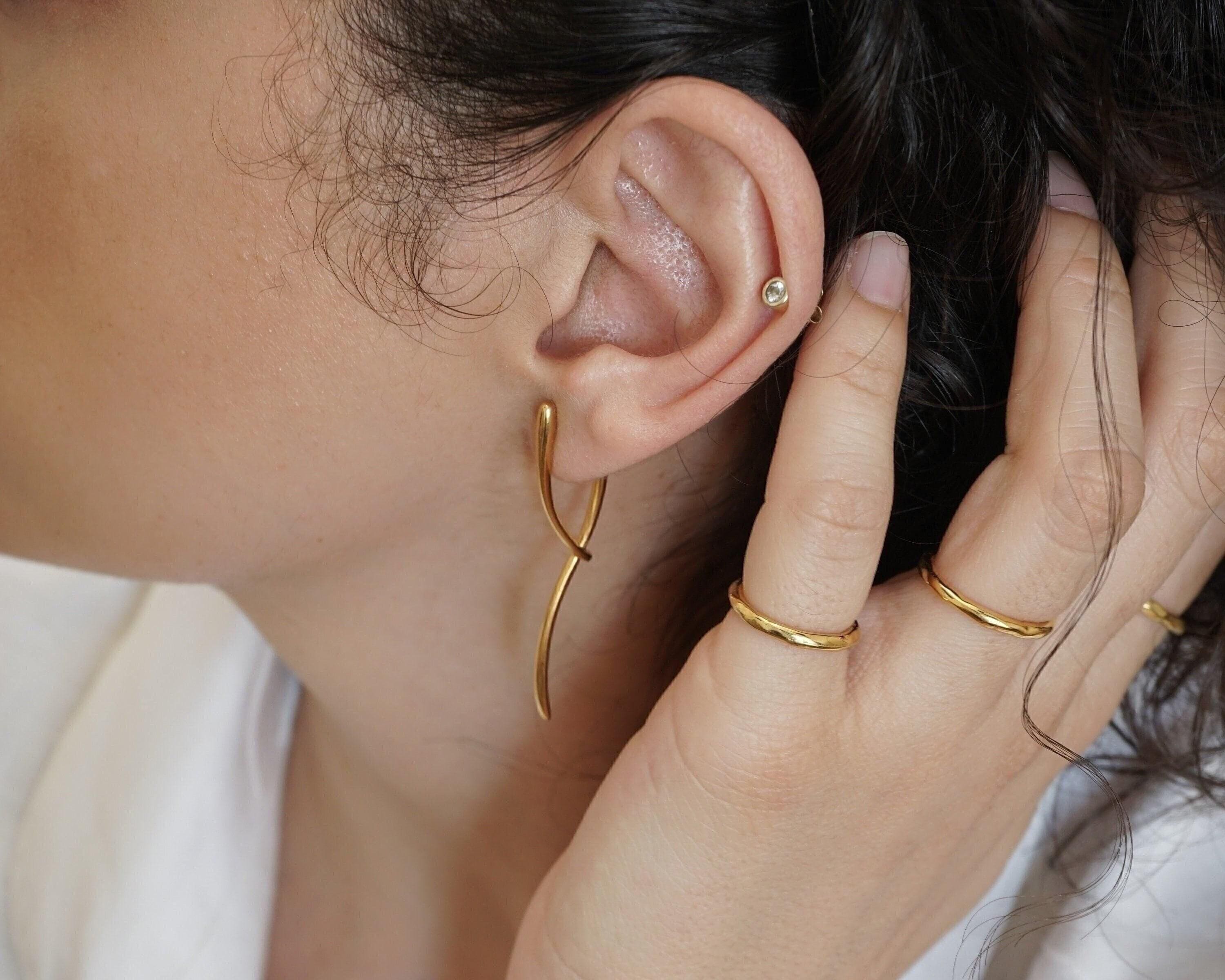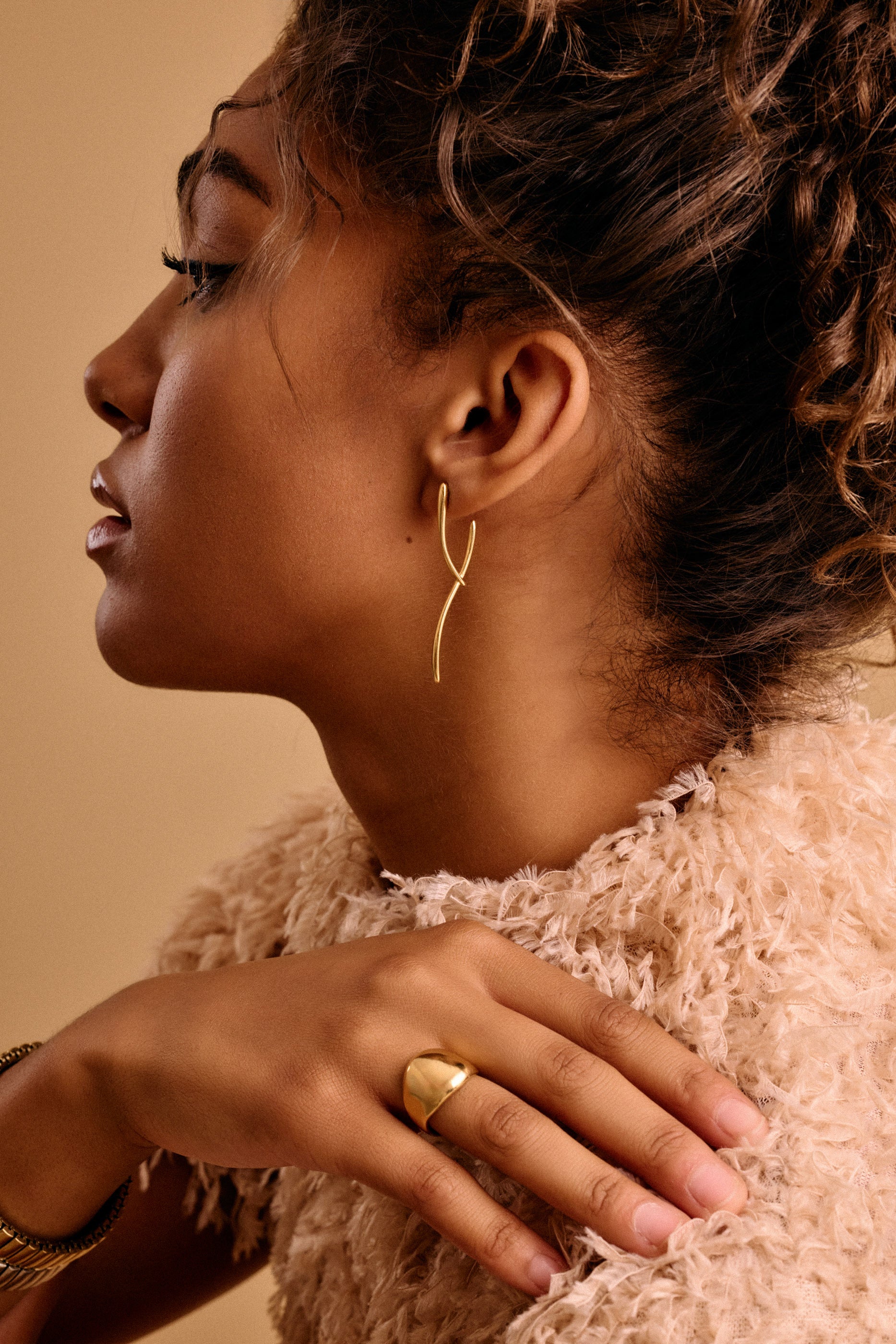 Discover the charm of these gold-plated 3/4 earrings, designed with a unique, free-flowing shape that adds a touch of elegance to any outfit. Wear them solo for a classic look, or stack them together for a contemporary flair if you have multiple piercings.