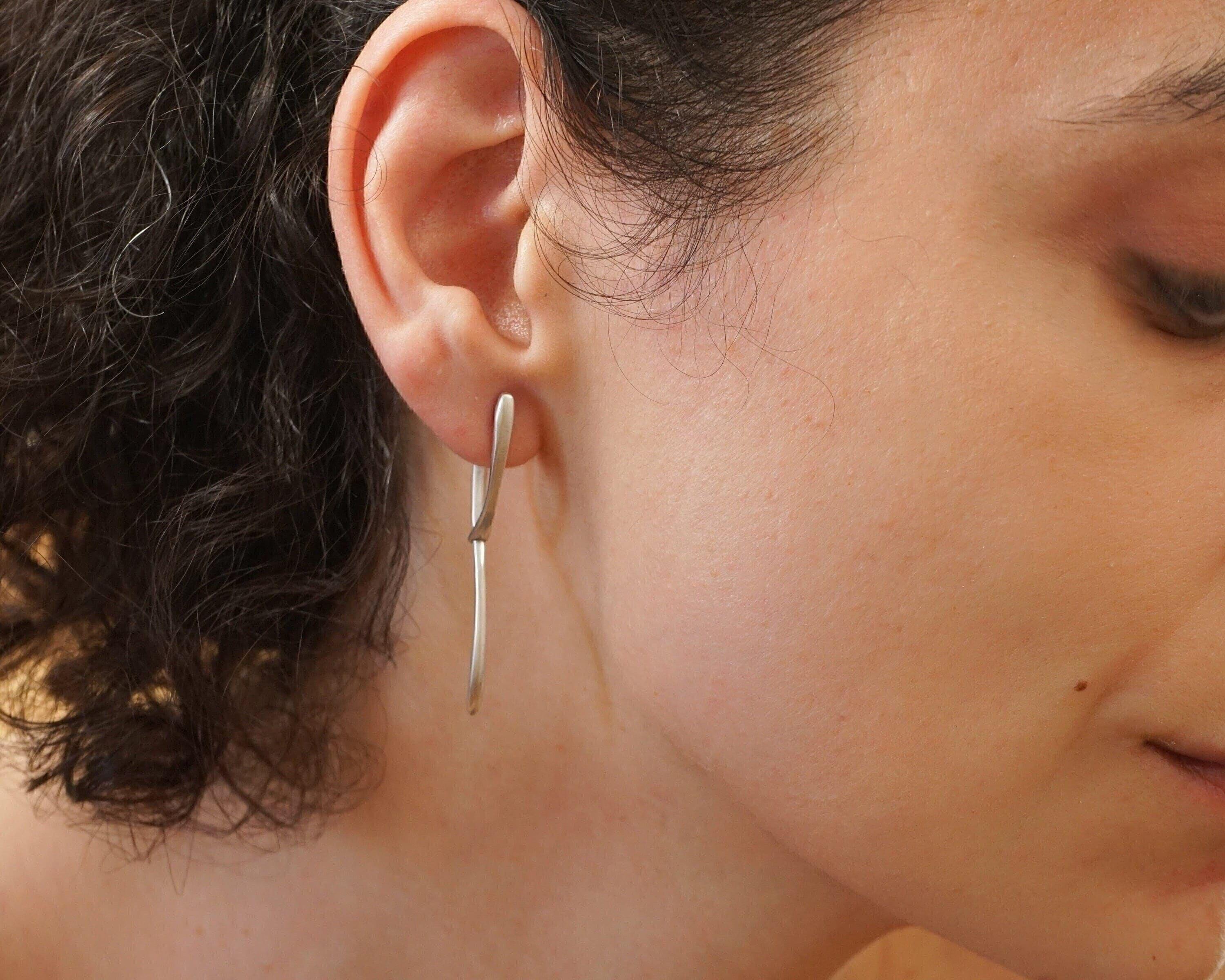 Discover a pair of distinctive silver-plated 3/4 earrings featuring a graceful, free-flowing shape. These earrings can be worn alone for a sophisticated touch or stacked together for those with multiple piercings, perfect for a more modern aesthetic.