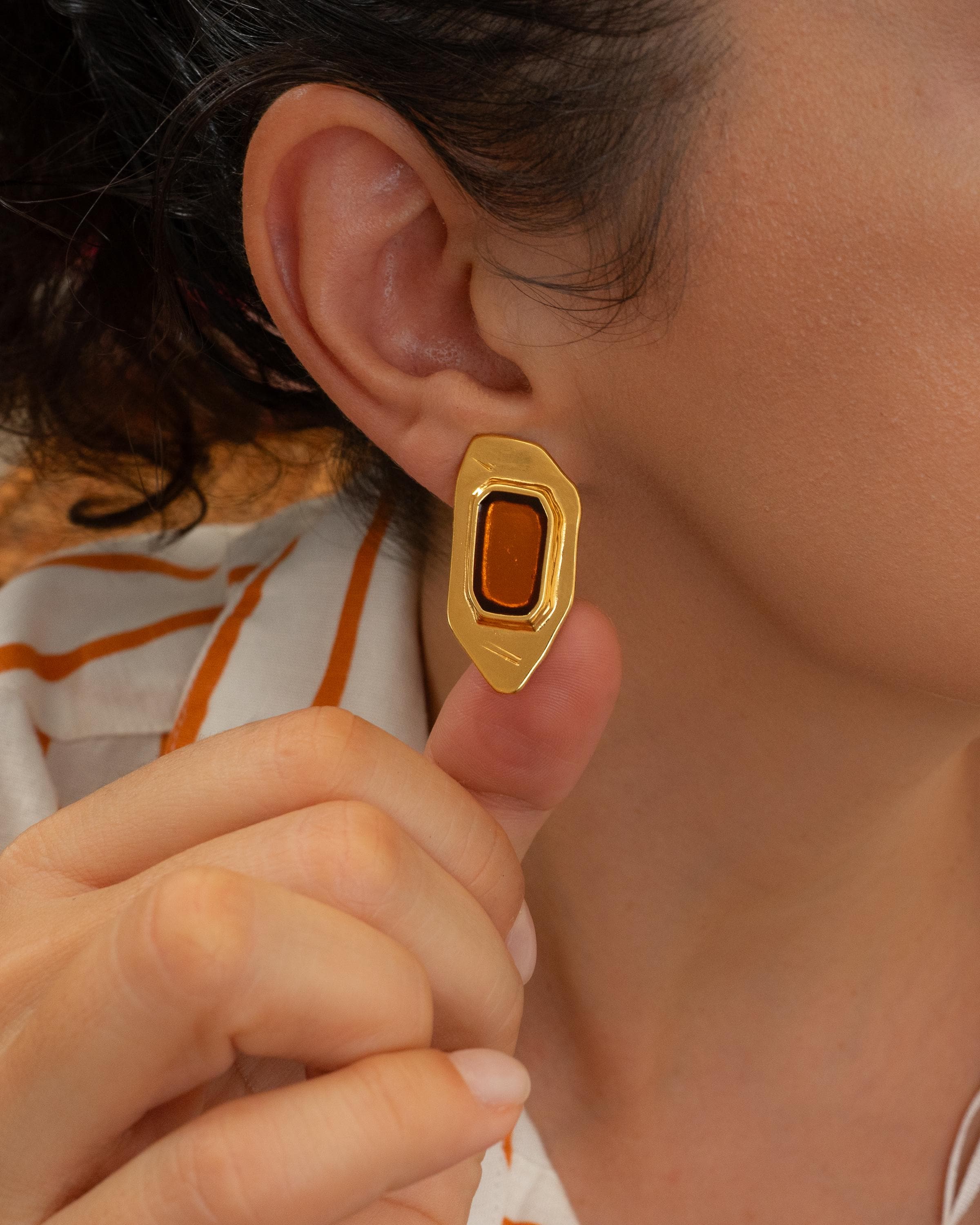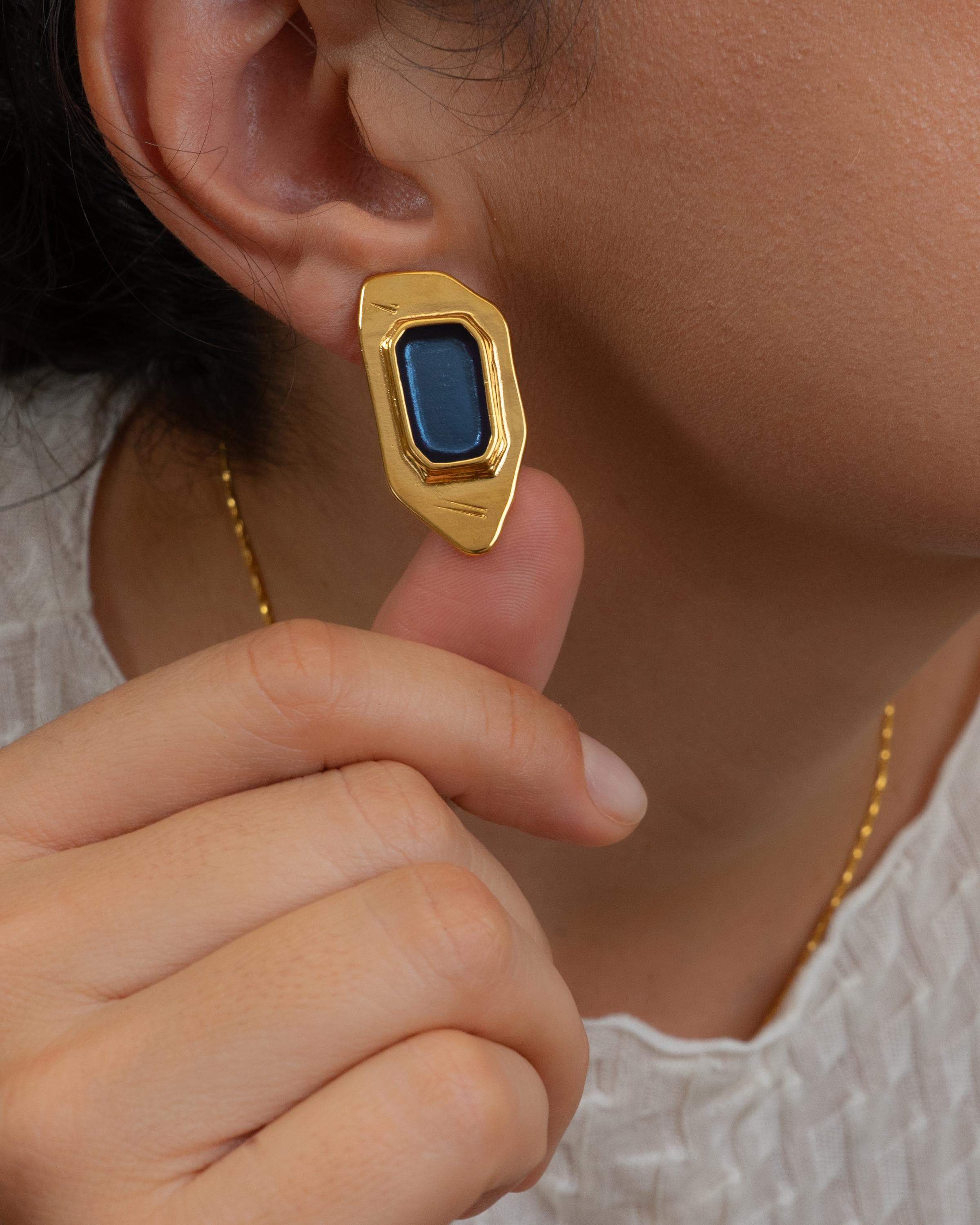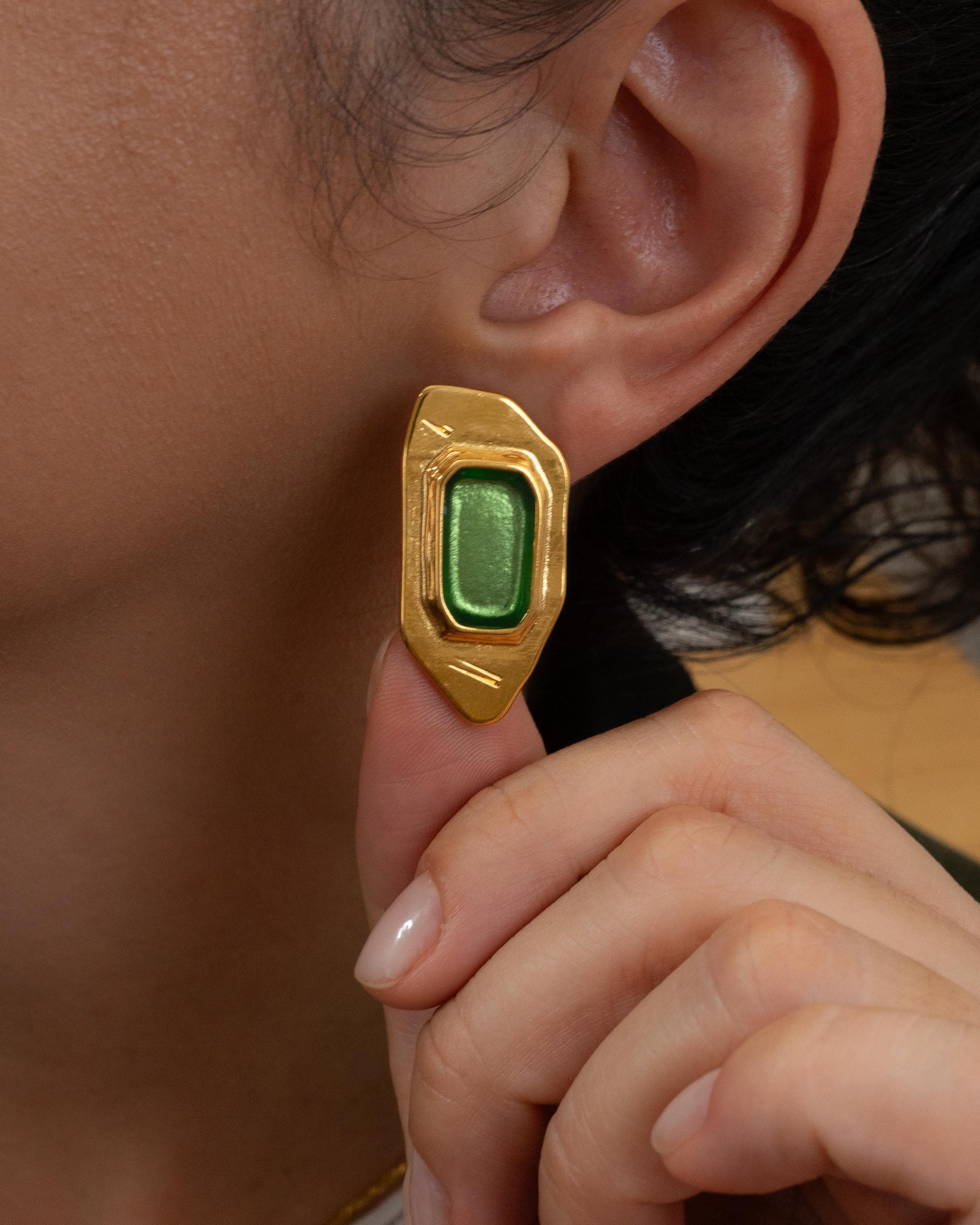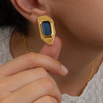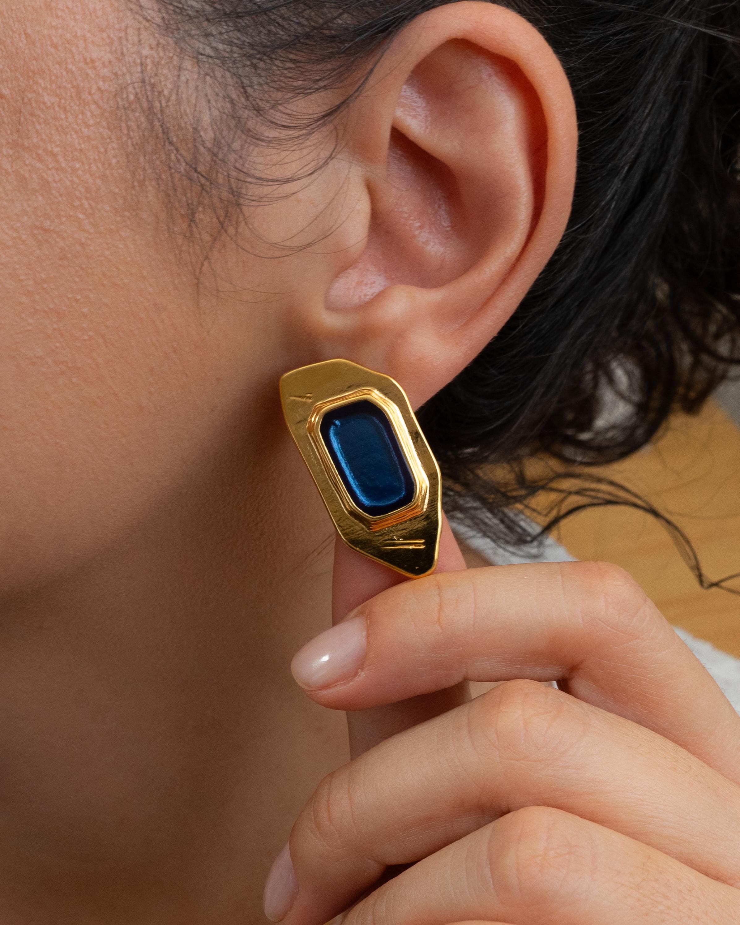 Add a modern twist to your collection with these gold-plated polygon enamel earrings. Designed with a sculptural silhouette and available in forest green, burnt orange, or midnight blue, these statement studs are crafted from gold-plated zamak and feature hypoallergenic titanium posts for everyday comfort. Lightweight yet eye-catching, they’re perfect for both casual and elevated looks.