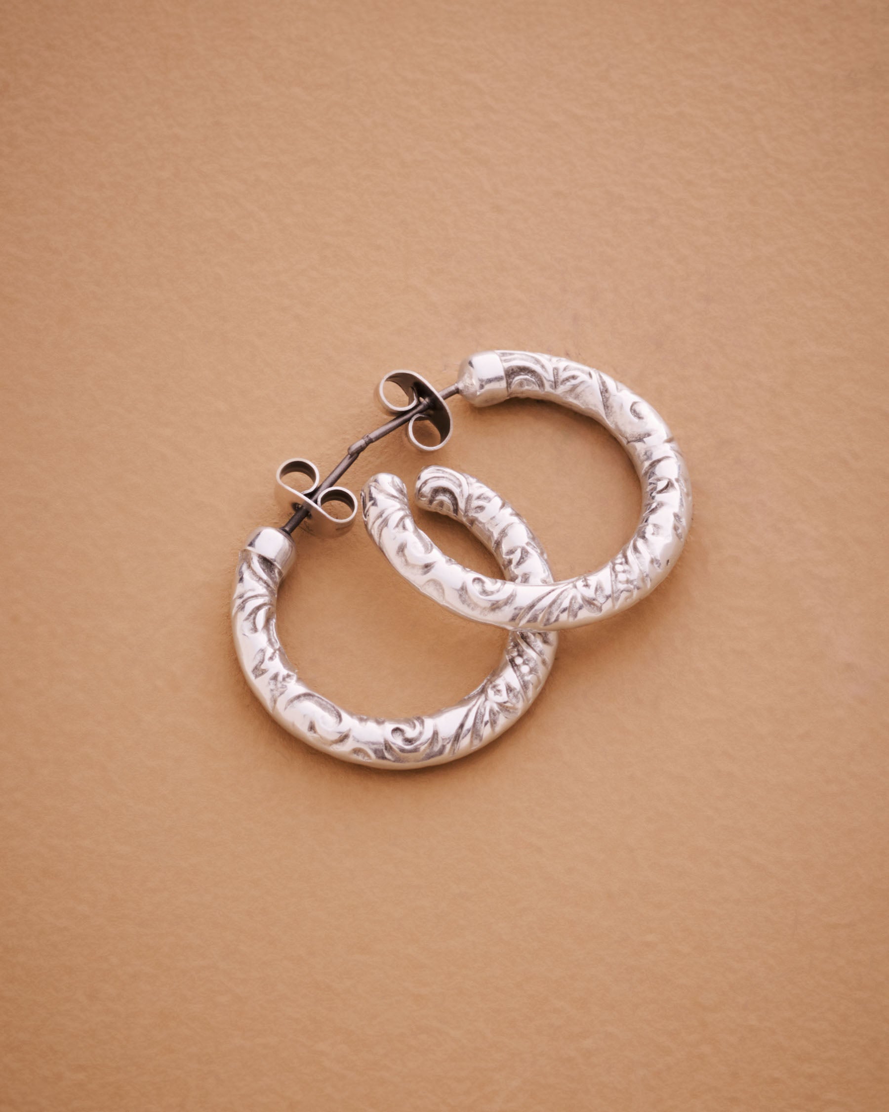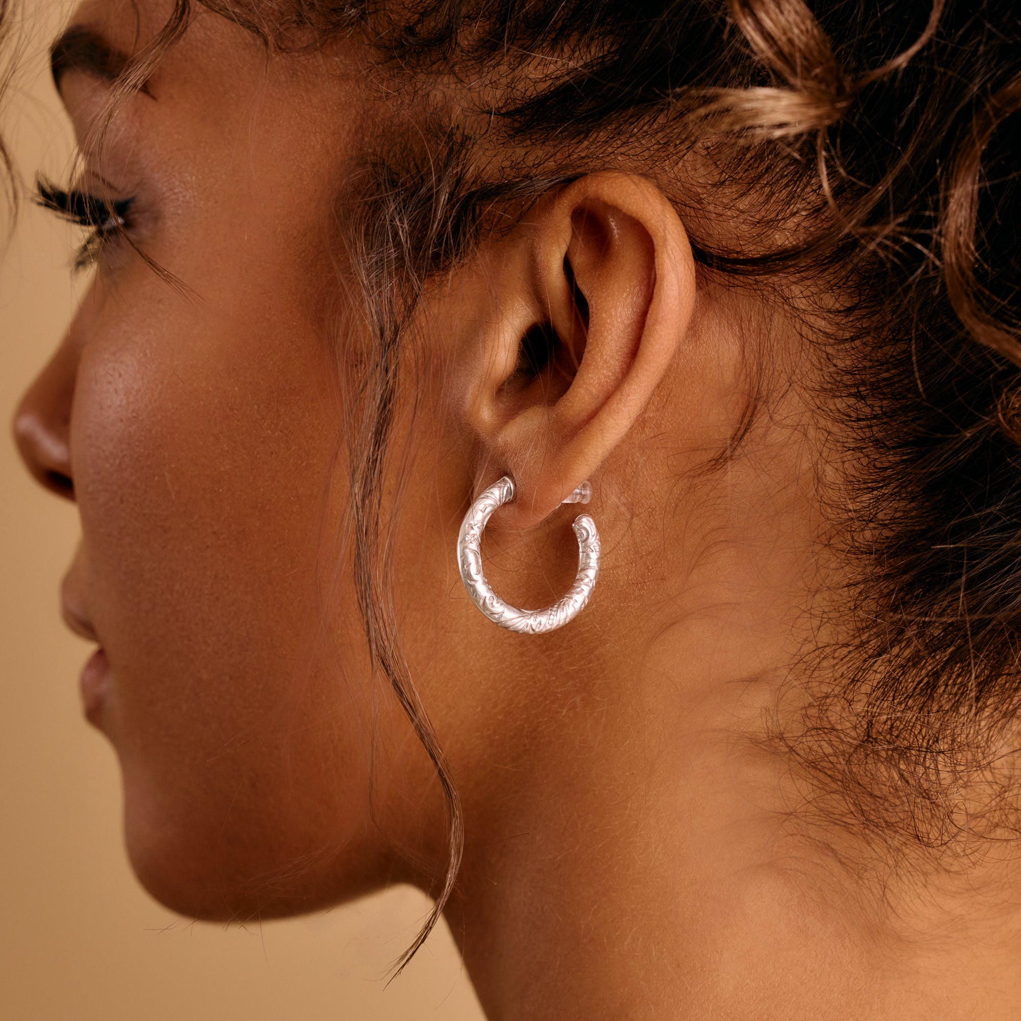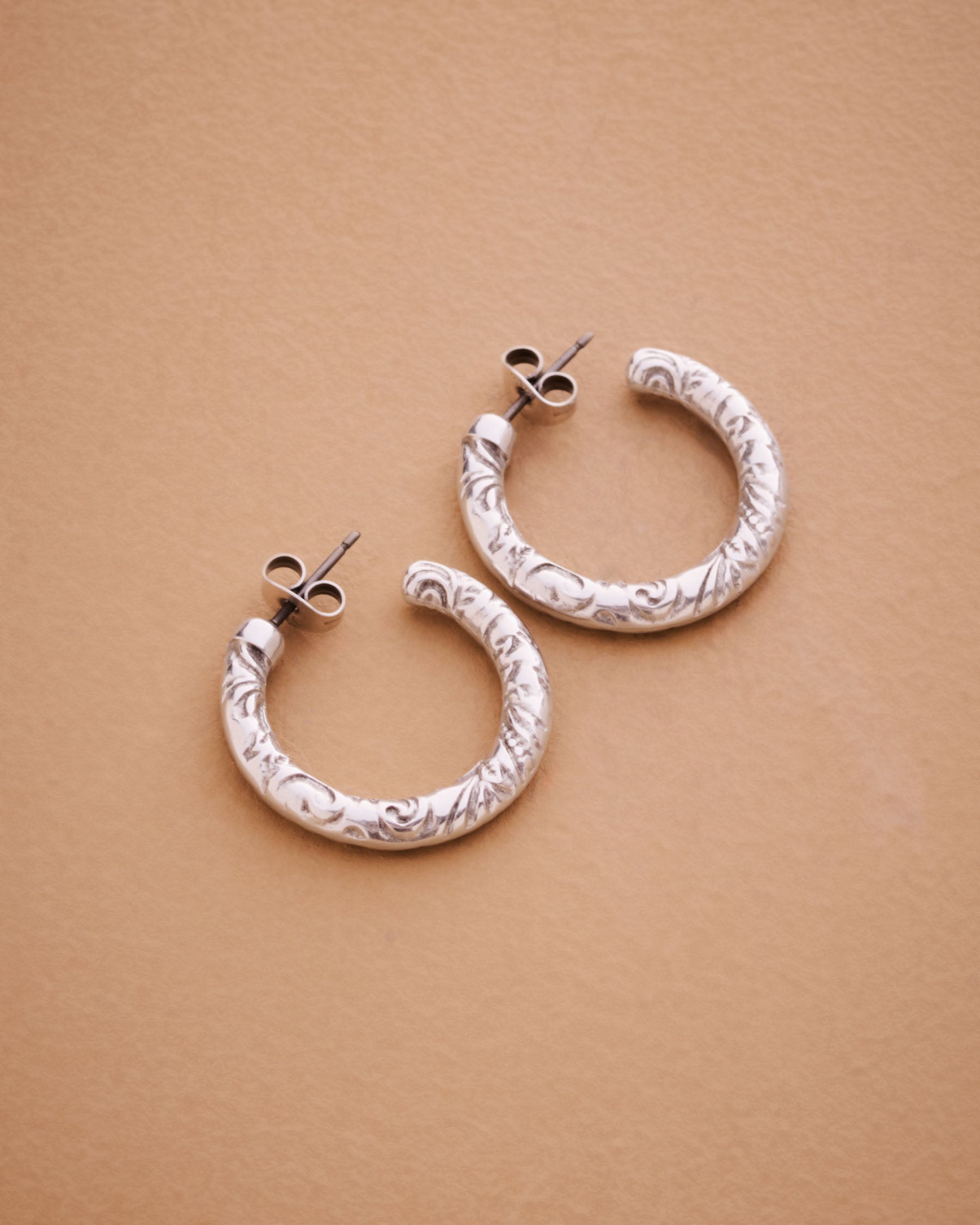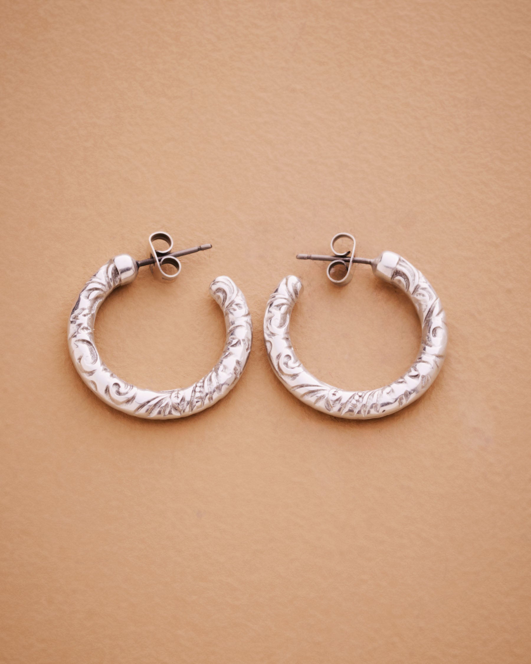 These medium silver plated hoop earrings feature a charming floral design, making them perfect for both a refined, standalone look or for stacking with other earrings if you have multiple piercings. Their elegant aesthetic allows you to transition seamlessly from day to night, complementing a variety of outfits and enhancing your overall style. Lightweight and easy to wear, these earrings won’t pull on your earlobes, providing comfort throughout the day. Each pair is unique yet versatile, adding a touch of sophistication to any ensemble.