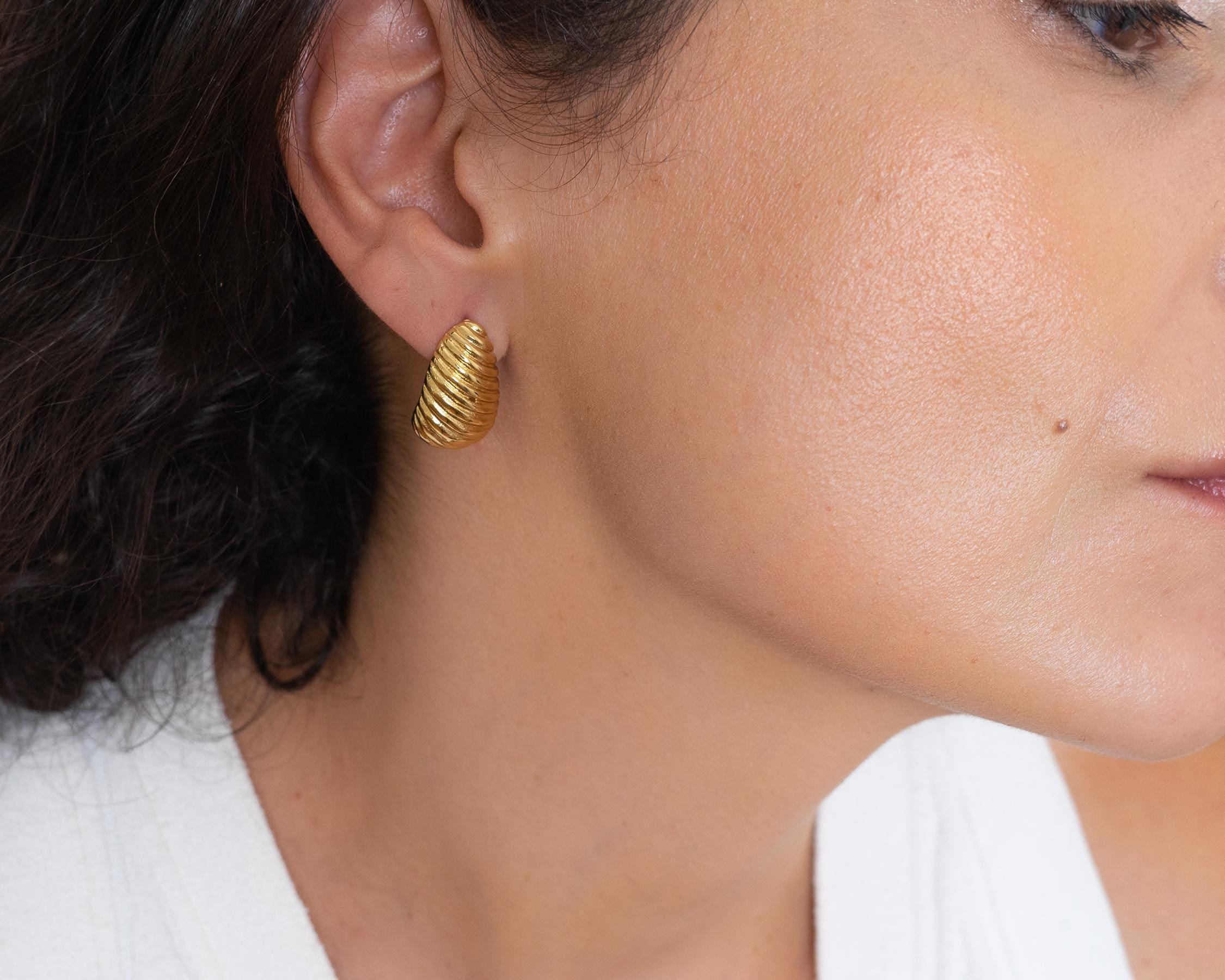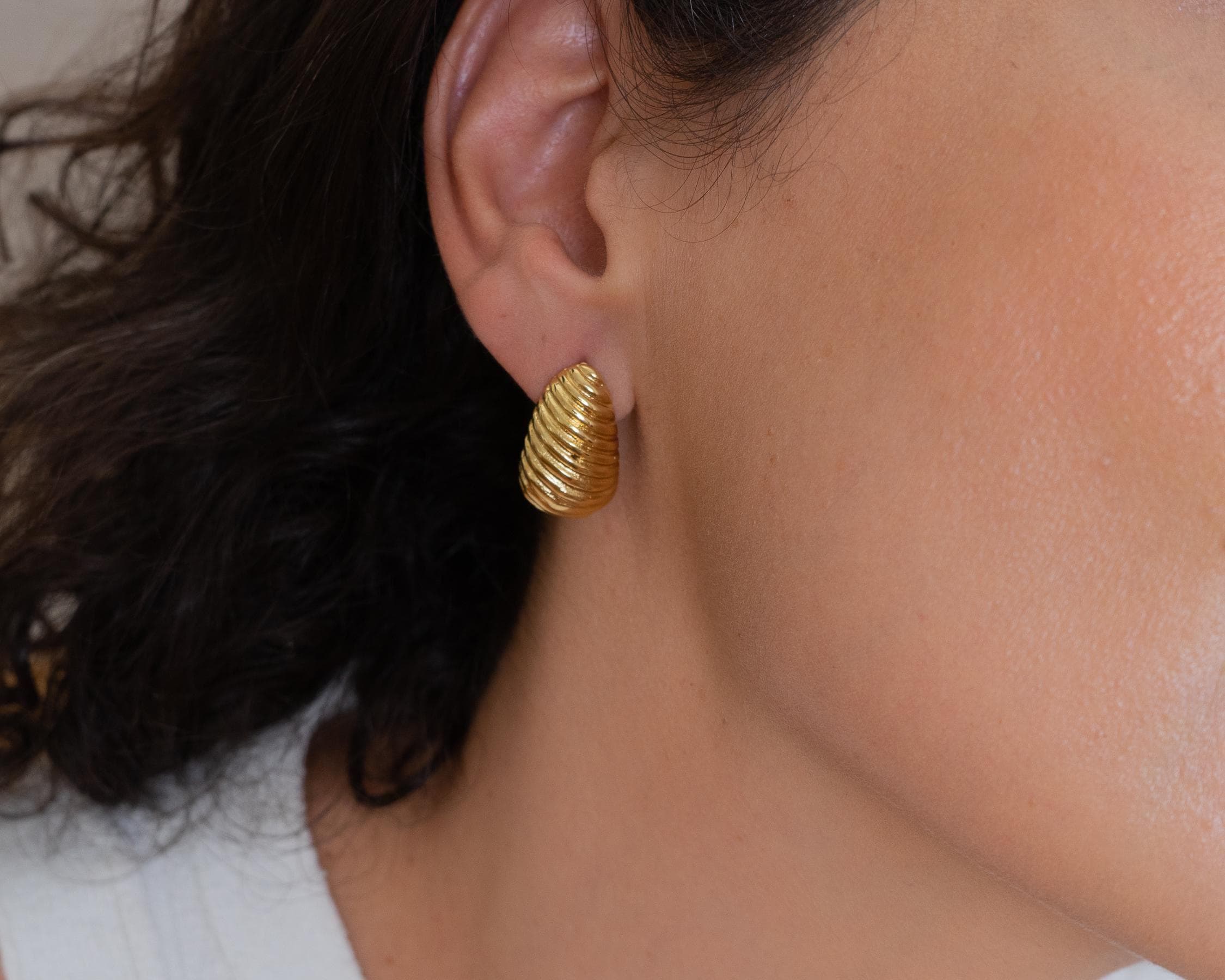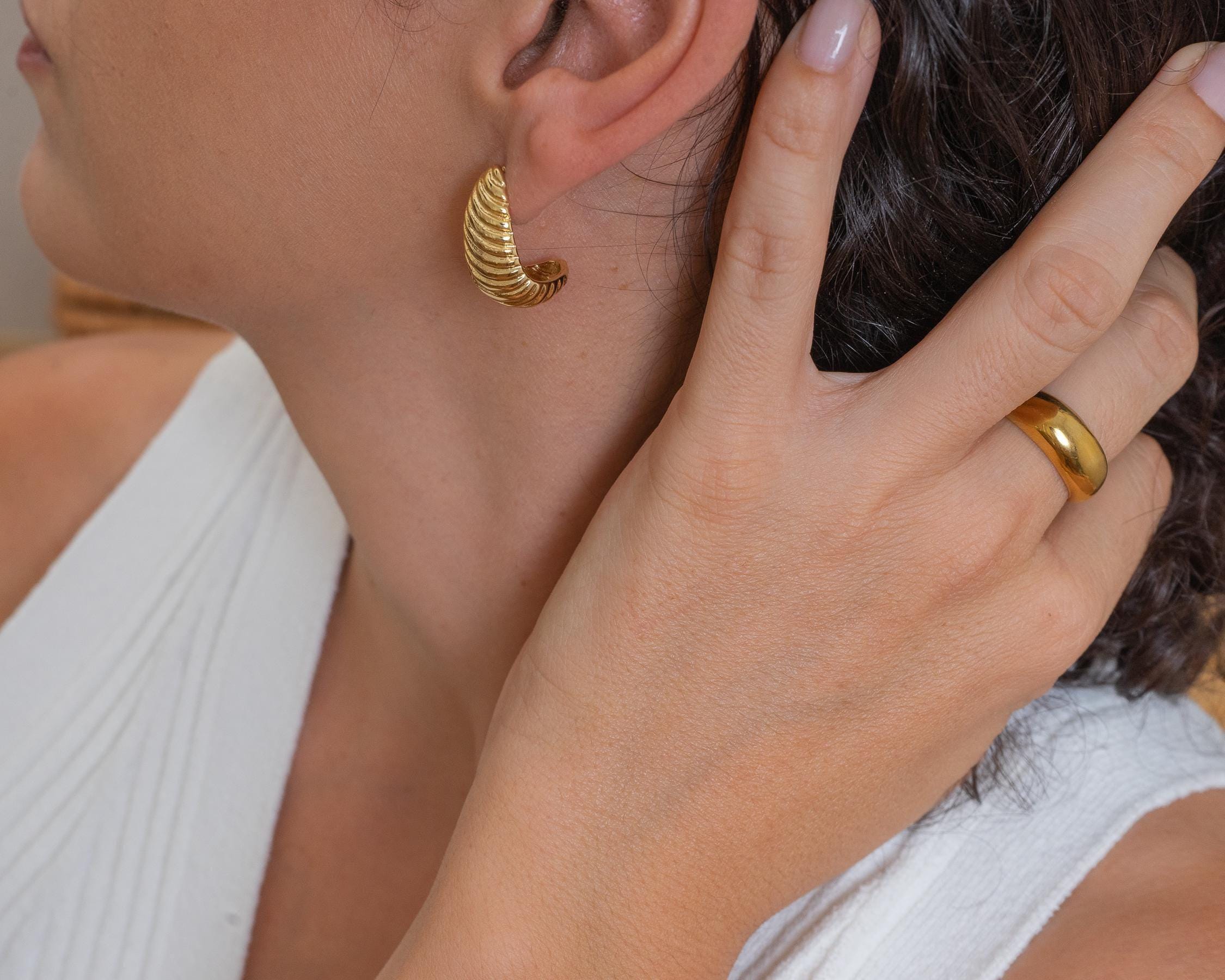 Elevate your accessory game with these striking striped gold dome earrings, a must-have for this season. Designed with a bold twist, these earring hoops bring a touch of luxury to your everyday style. Their unique striped pattern adds an eye-catching detail that makes them a standout piece in any jewelry collection.