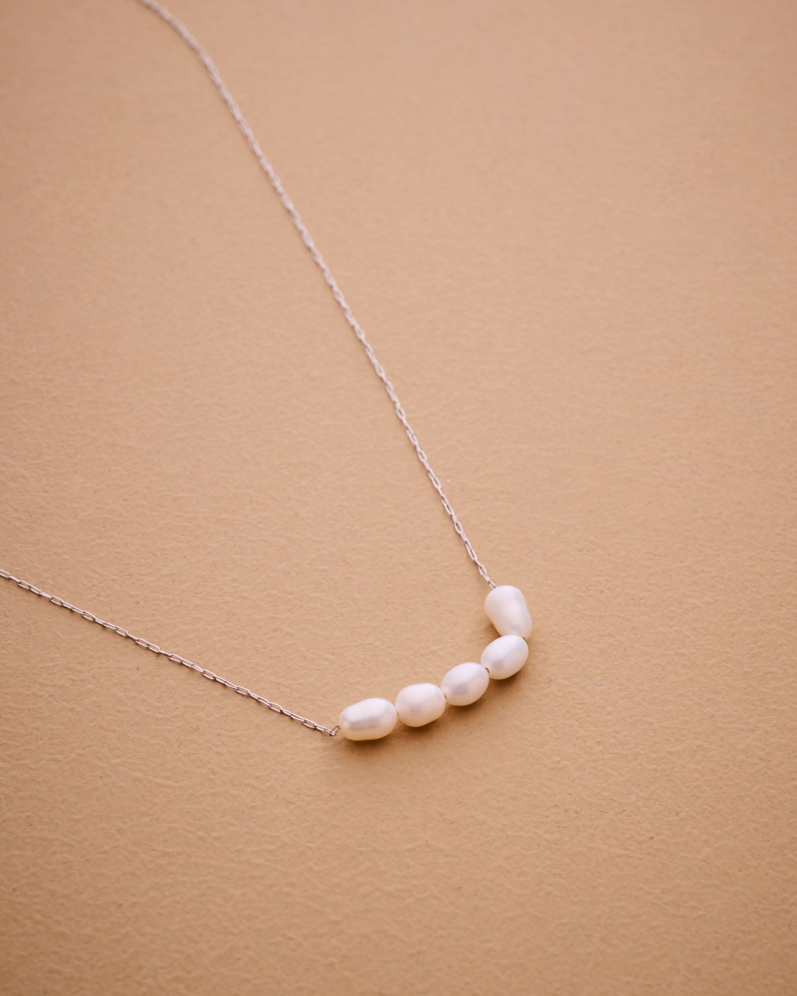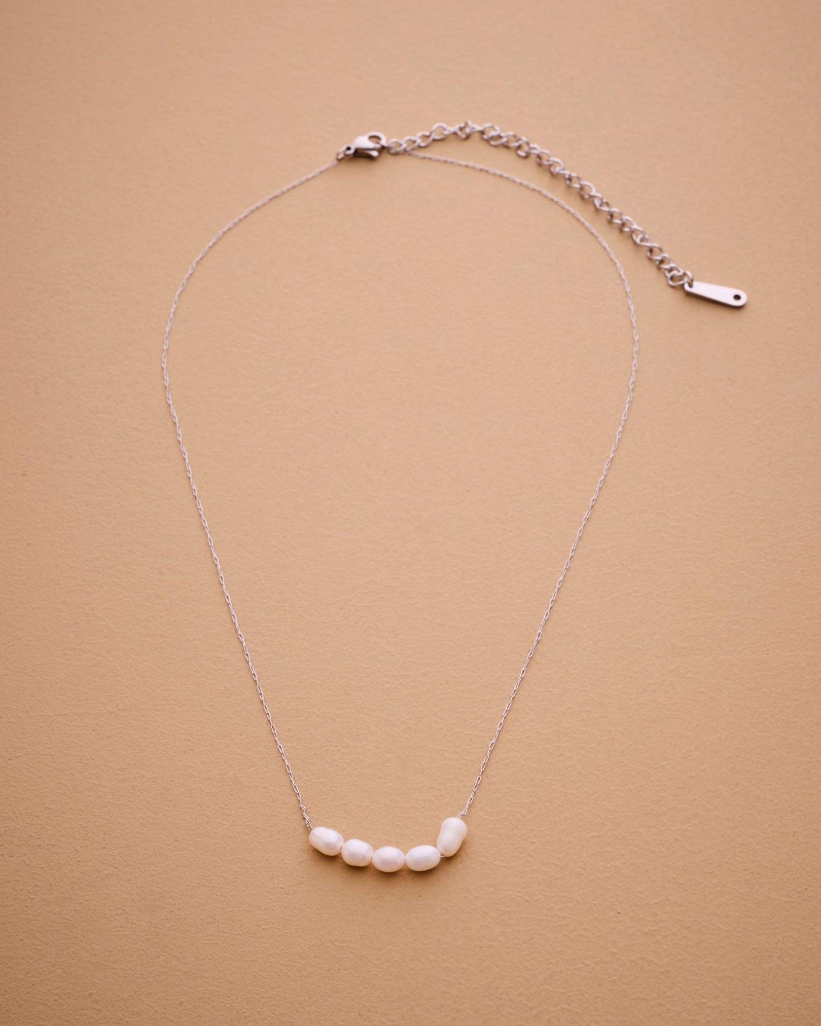 This freshwater pearl necklace combines the beauty of natural pearls with the clean lines of a silver-tone stainless steel chain. Designed for simplicity and elegance, it features five genuine freshwater pearls with an organic silhouette, strung on a lightweight, hypoallergenic chain.