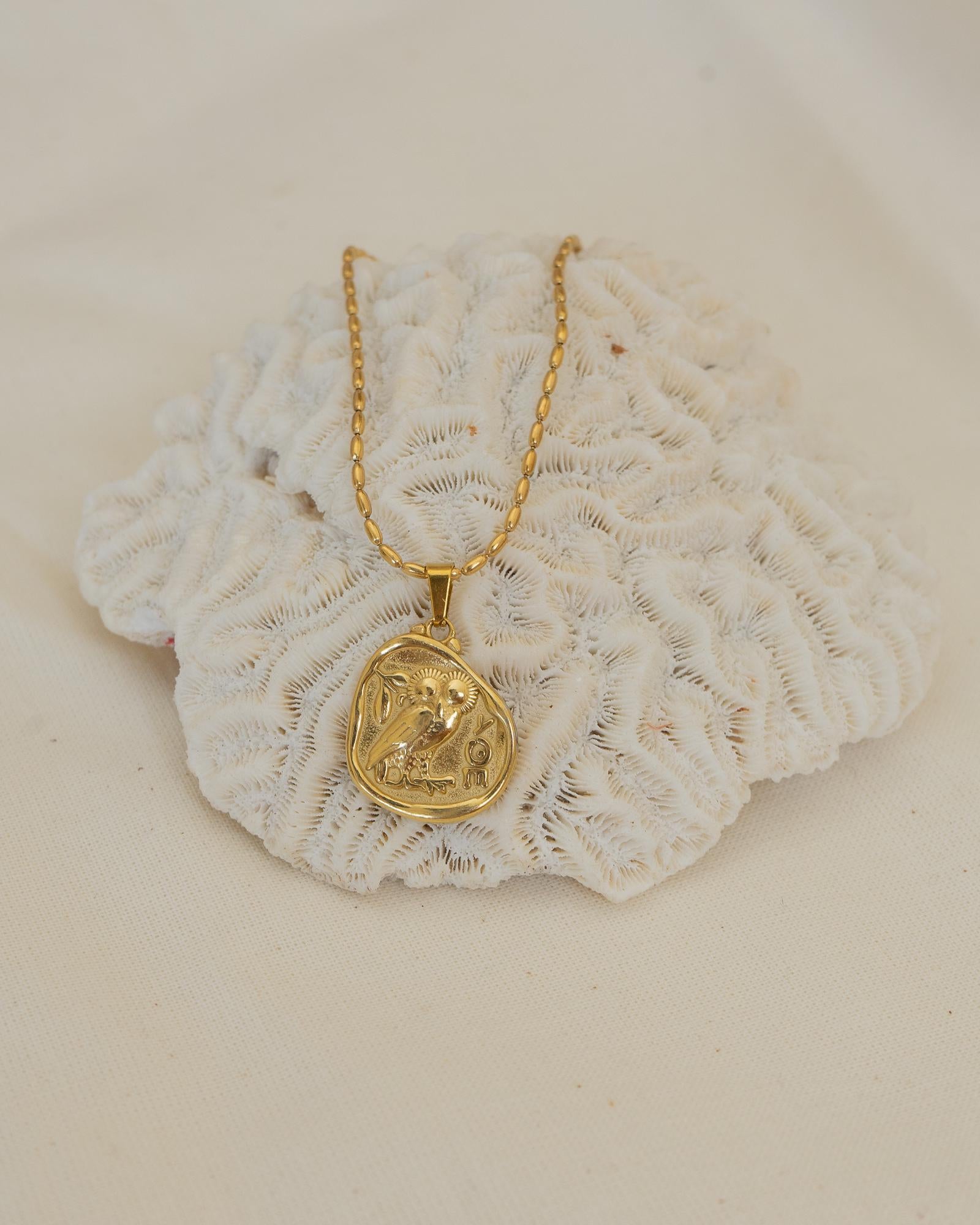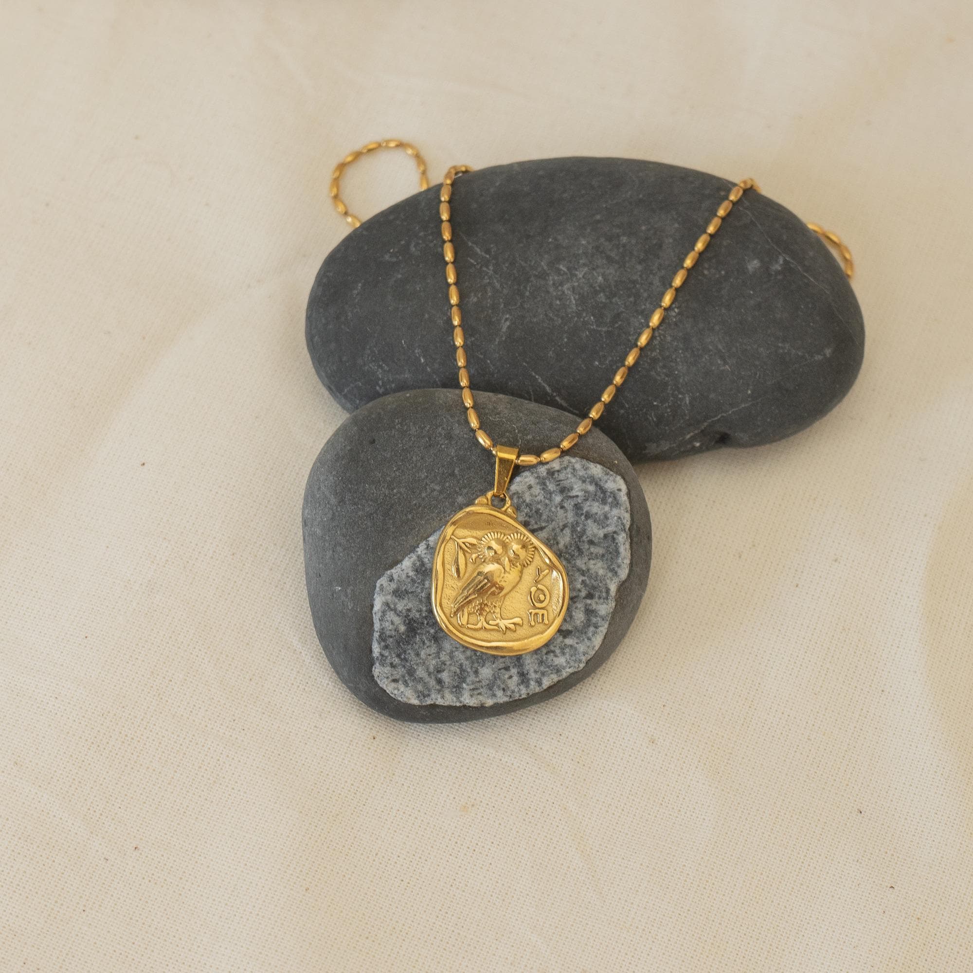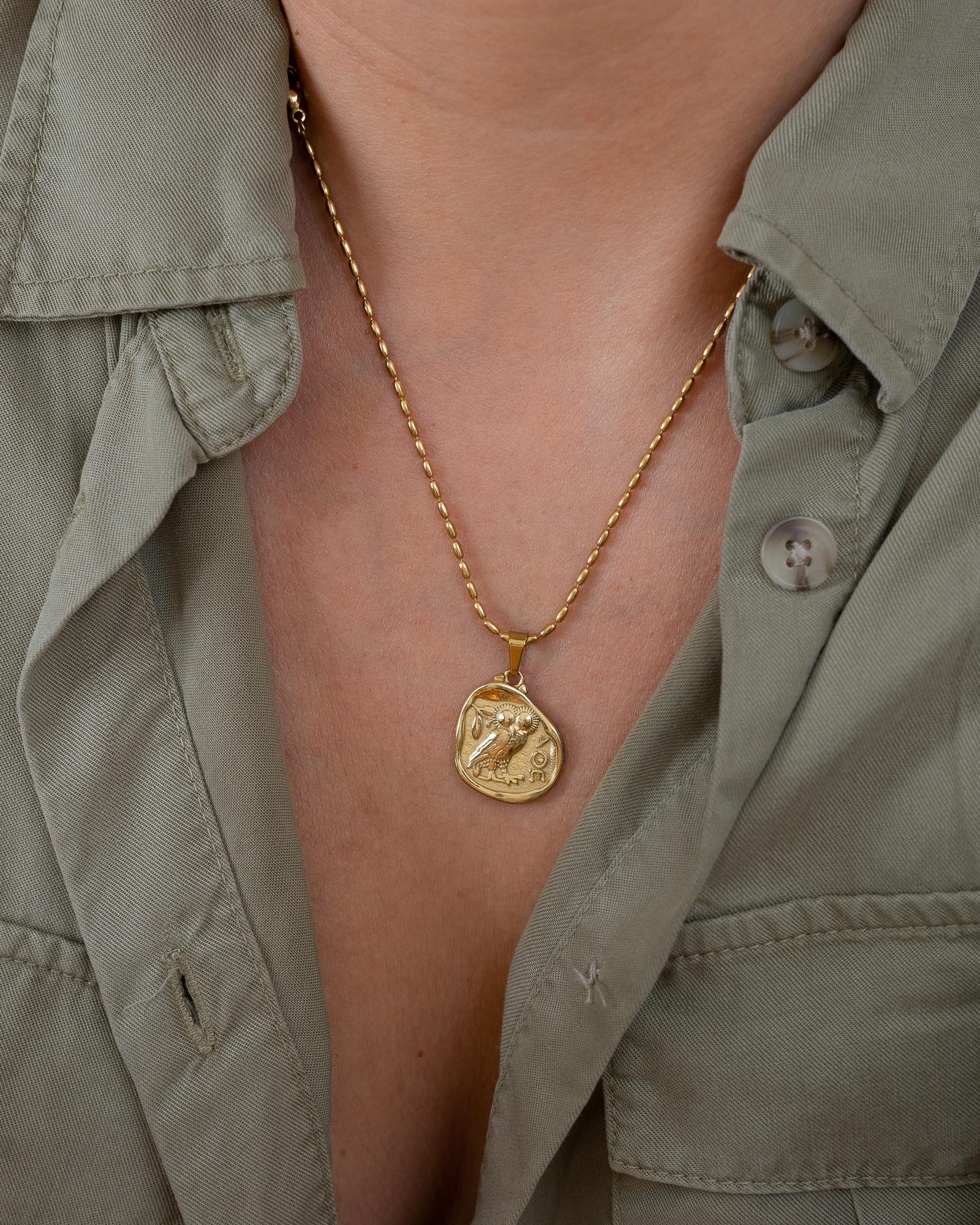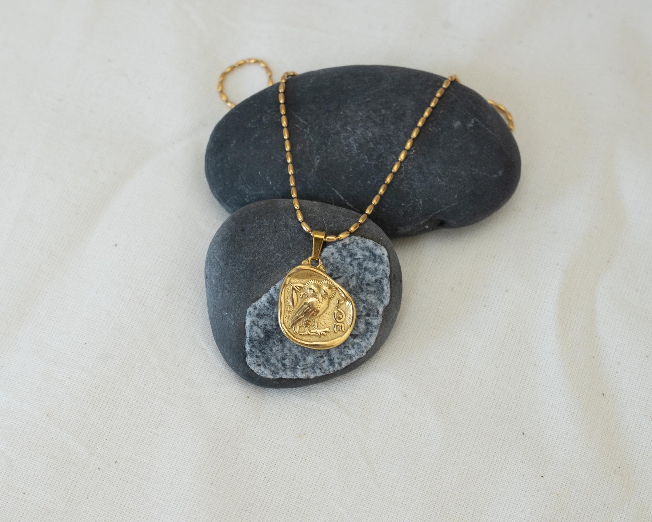 Indulge in the exquisite elegance of our one-of-a-kind gold steel necklace, featuring a breathtaking pendant adorned with Athena's wise owl. Elevate your style with a touch of sophistication and a nod to history. Crafted with durable materials that maintain their stunning appearance over time.