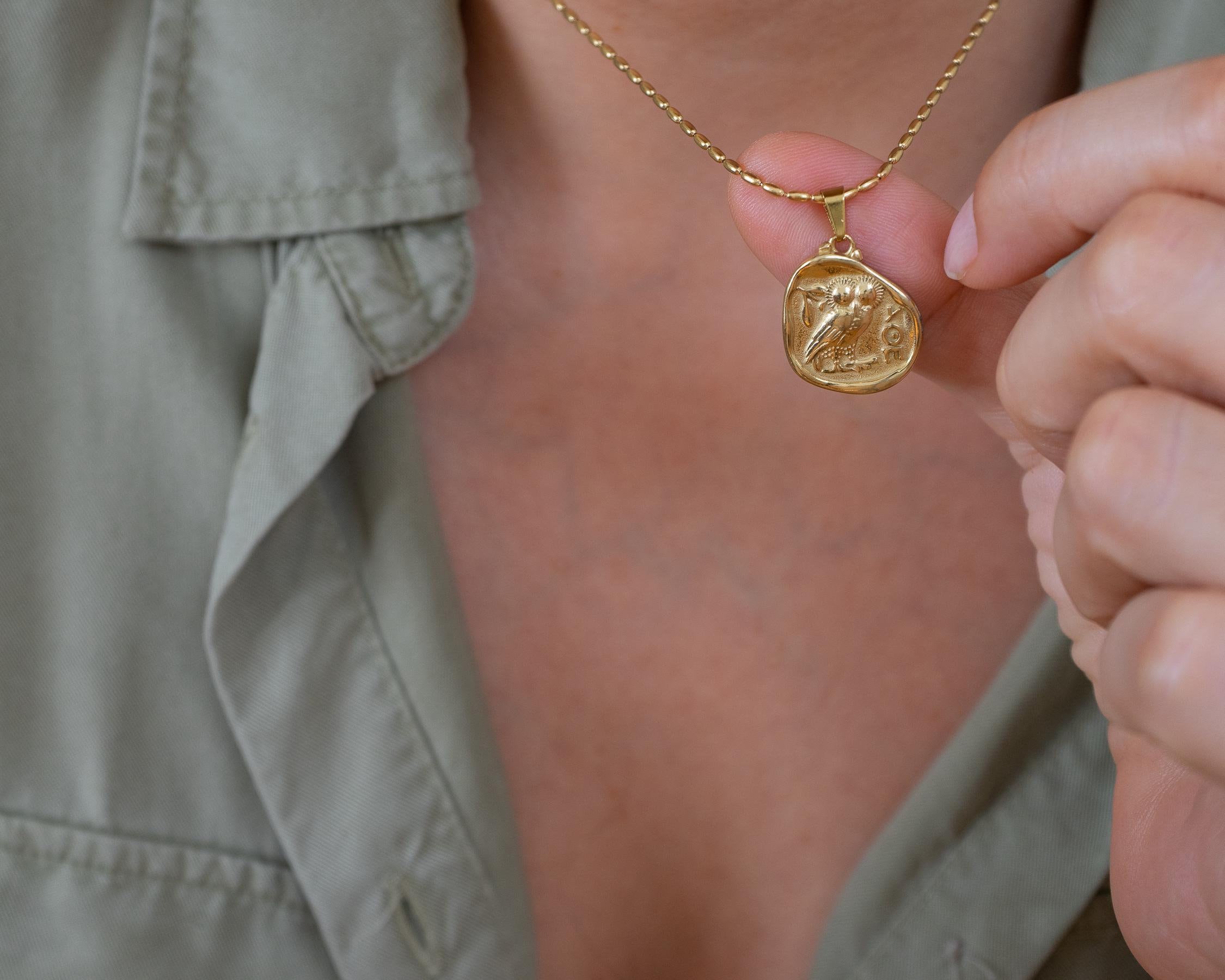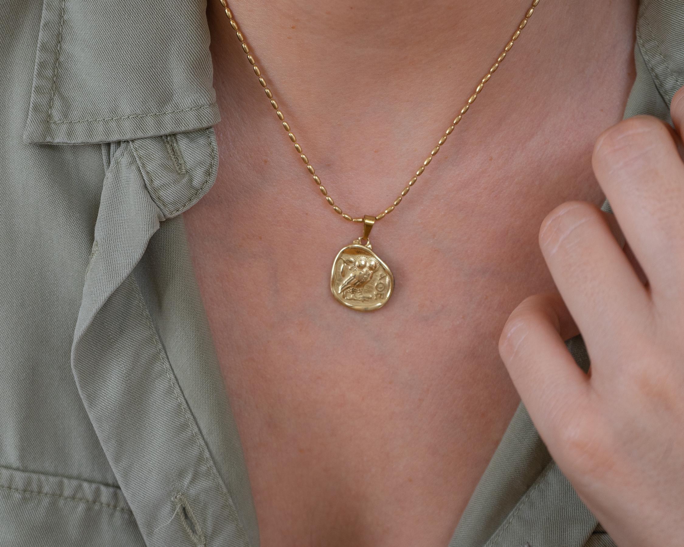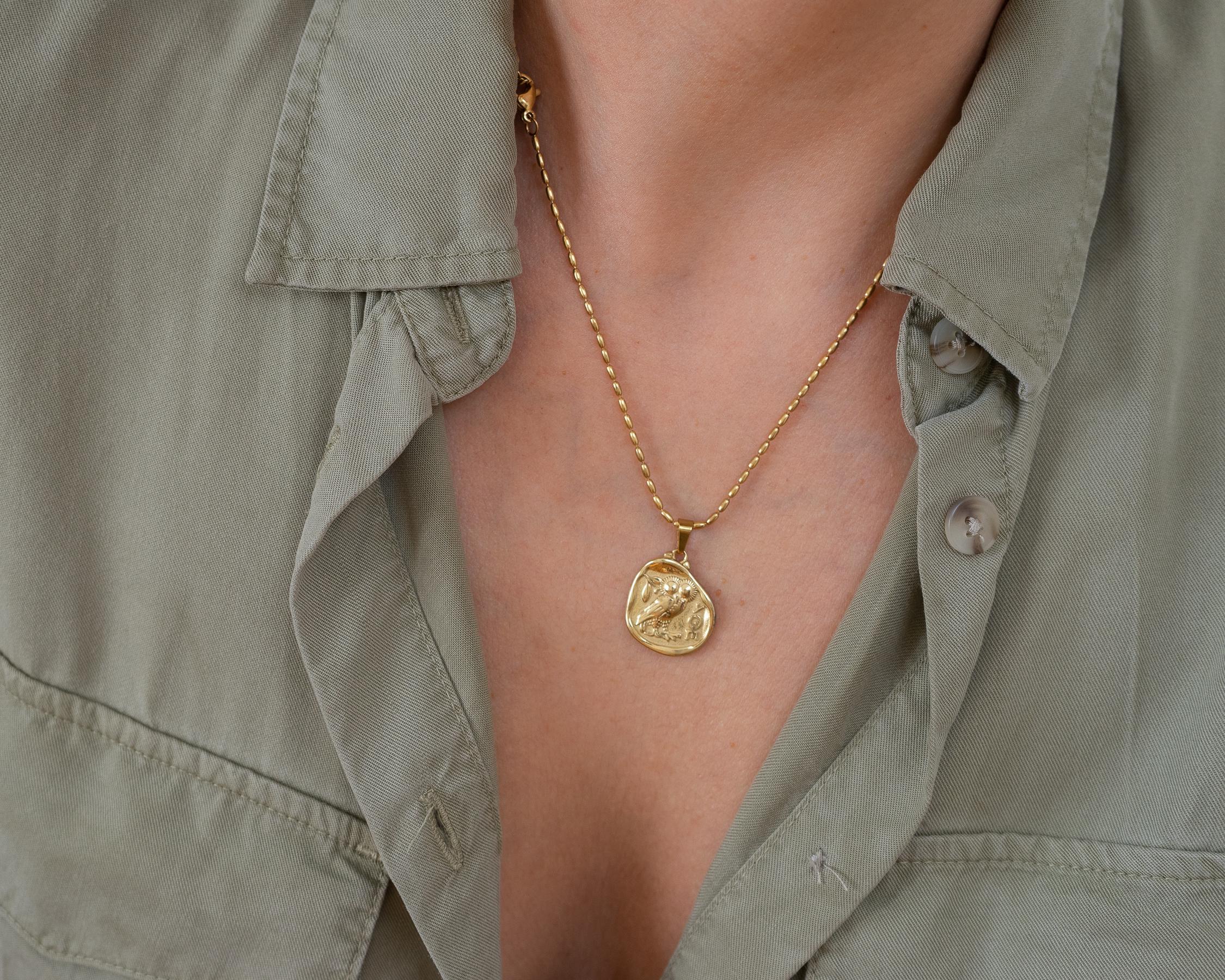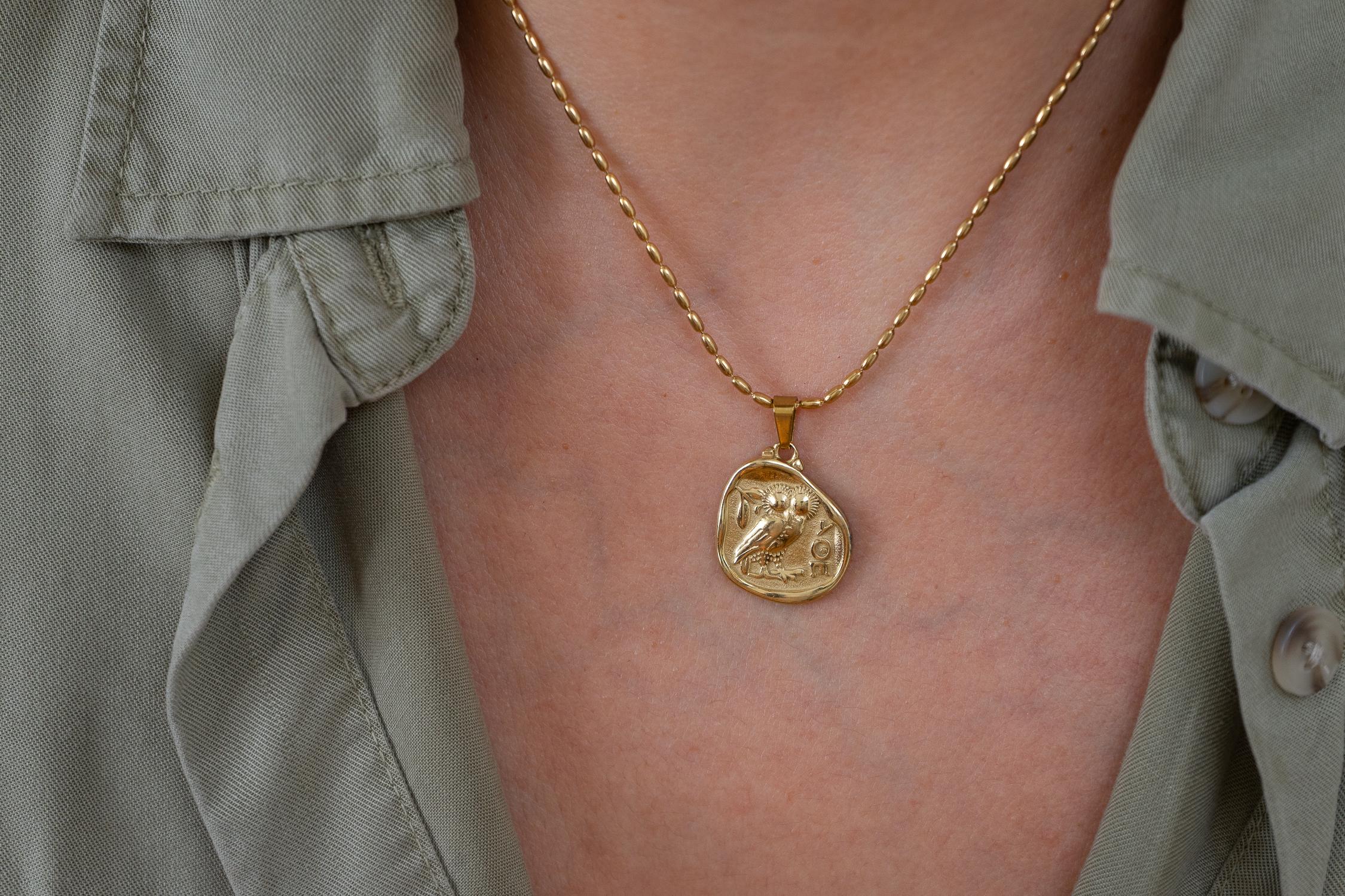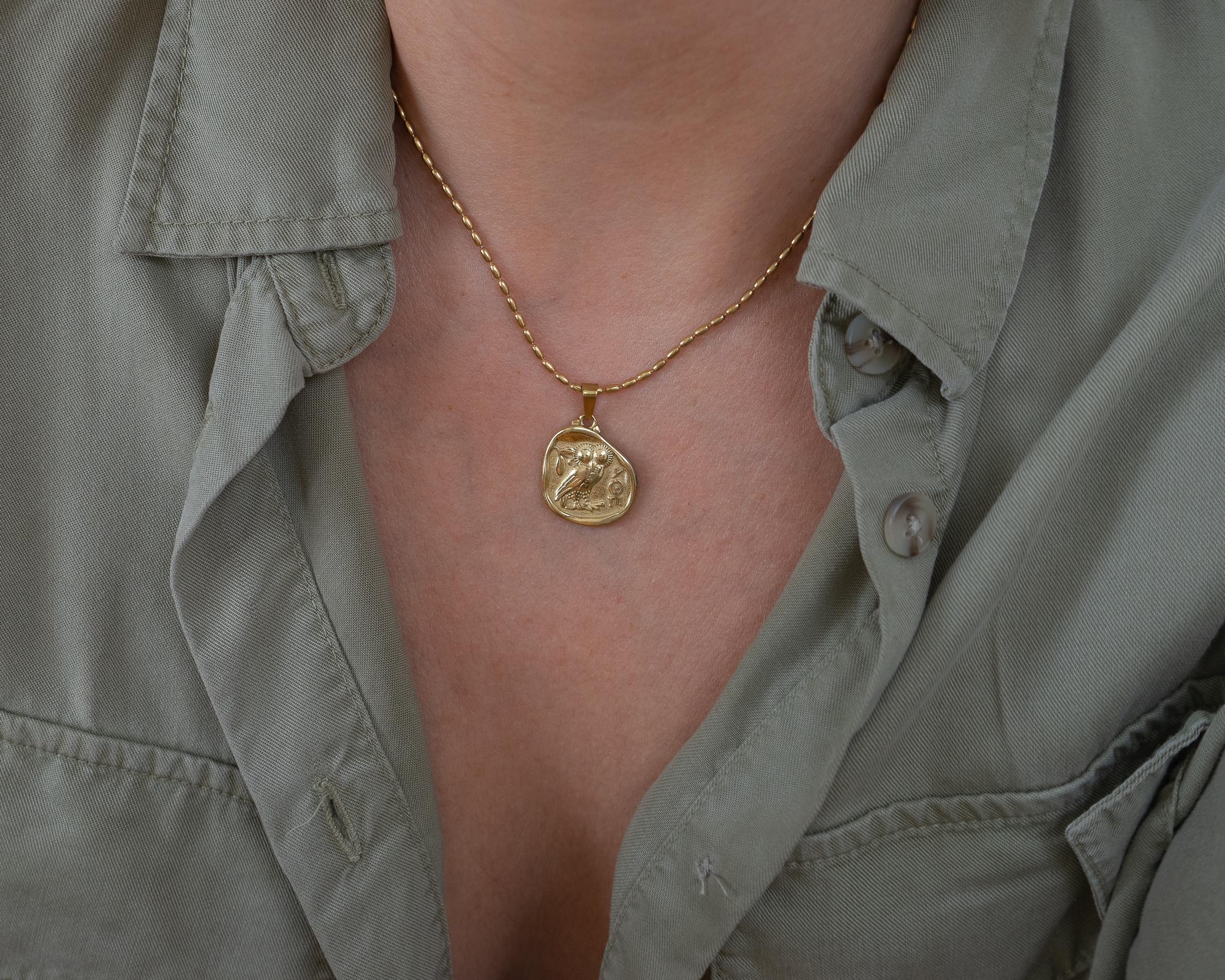 Indulge in the exquisite elegance of our one-of-a-kind gold steel necklace, featuring a breathtaking pendant adorned with Athena's wise owl. Elevate your style with a touch of sophistication and a nod to history. Crafted with durable materials that maintain their stunning appearance over time.