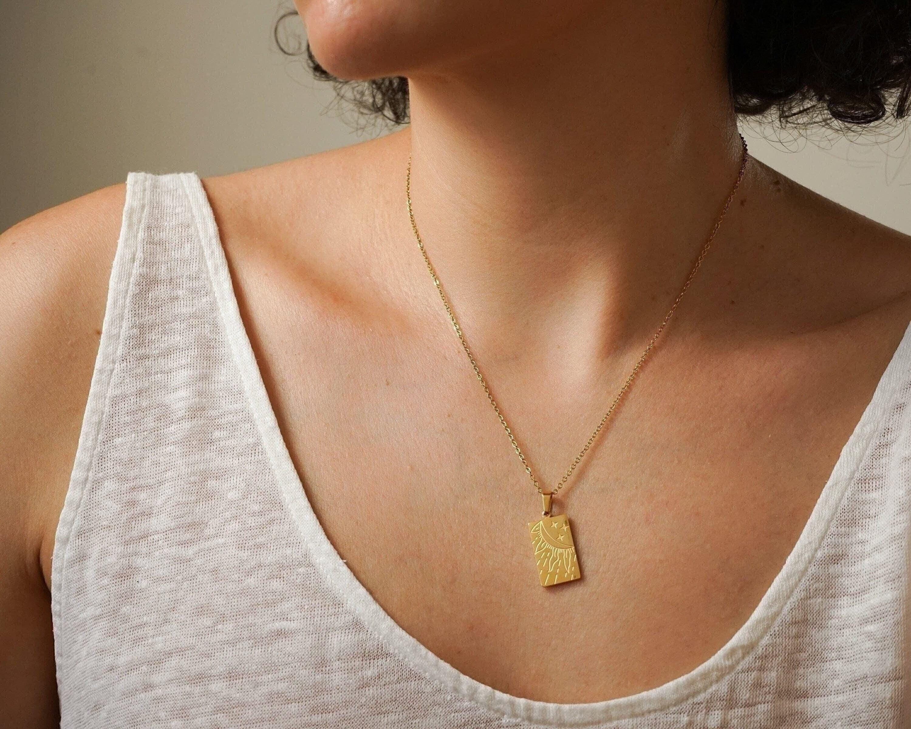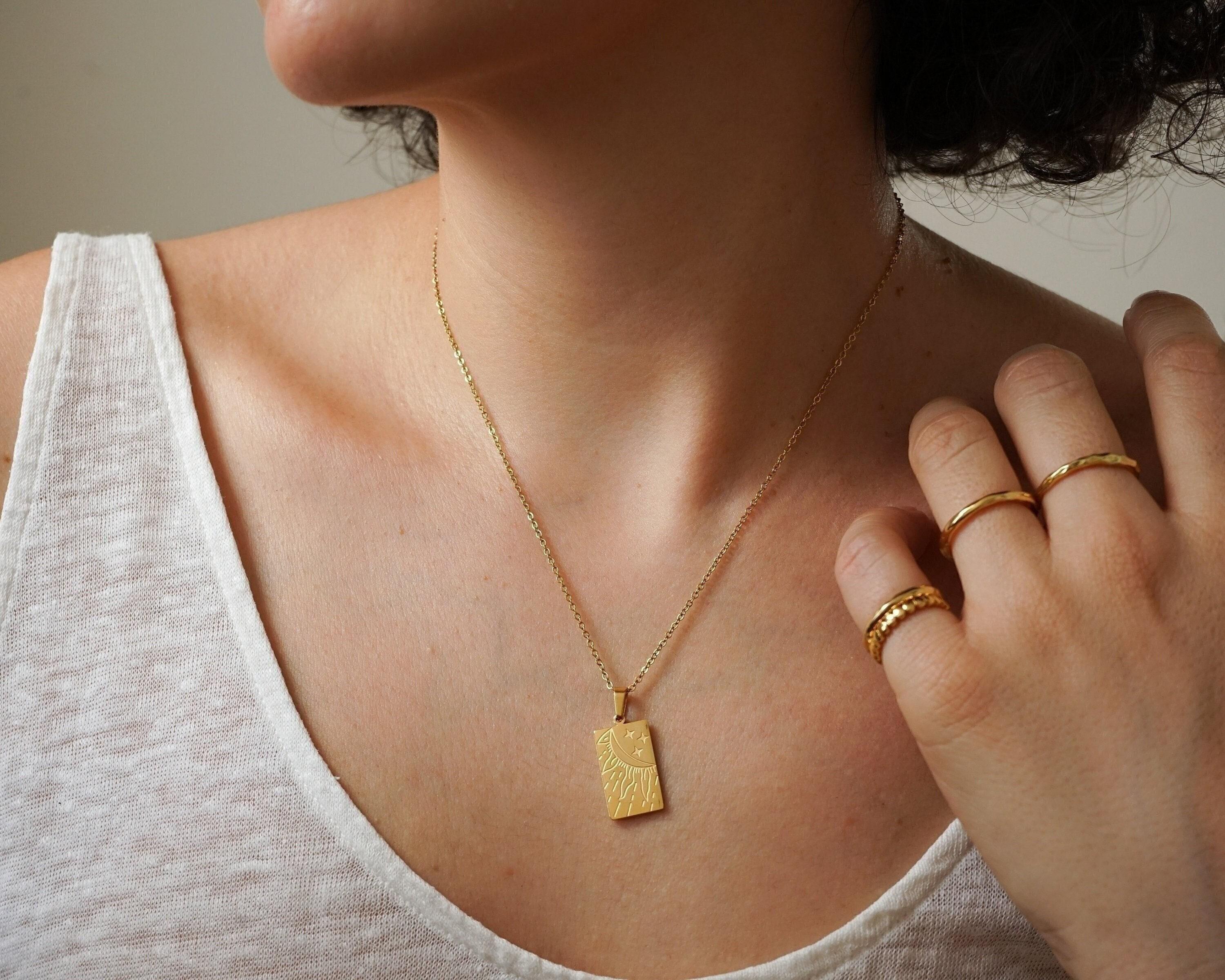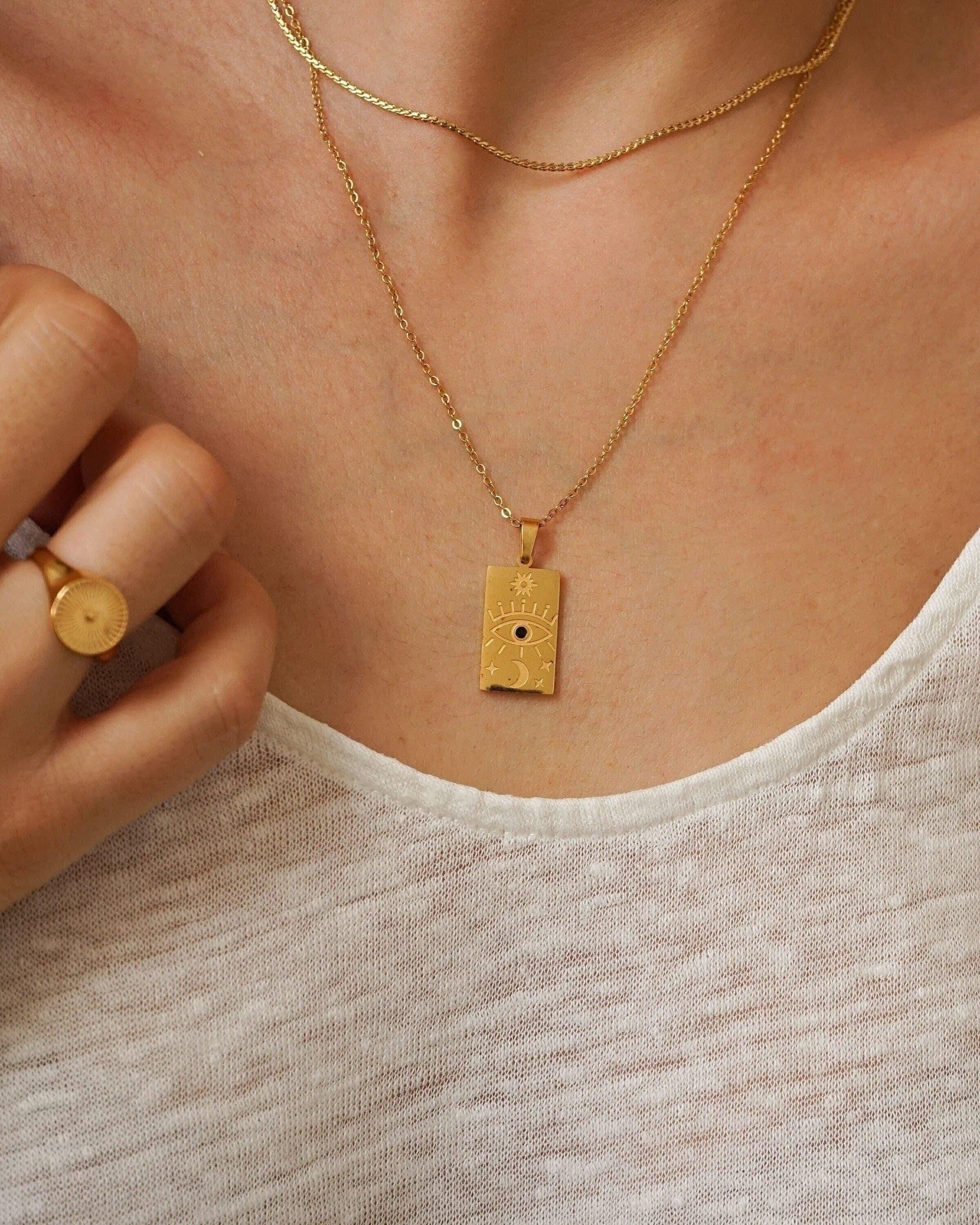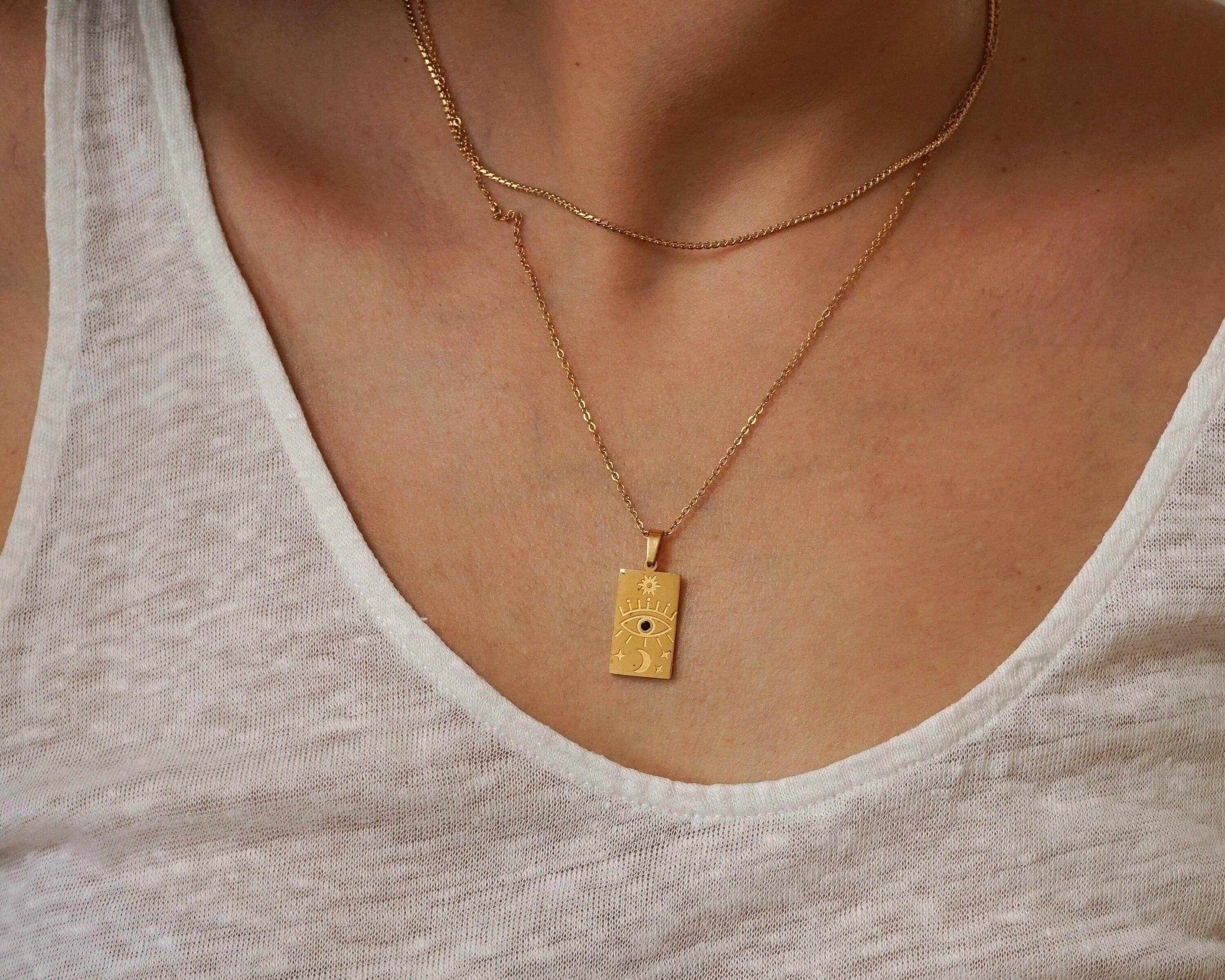 Discover the transformative power of our Gold Celestial Pendant Necklace, a radiant expression of your unique spirit. Adorned with a beautifully engraved sun or the symbols of the eye and love, this pendant captures the essence of positivity and enlightenment, reminding you to shine your light brightly. Whether you choose to wear it solo for a touch of elegance or layer it with other pieces for a bold, bohemian look, the combination of delicate and sturdy chains will elevate your ensemble, inspiring confidence with every wear.