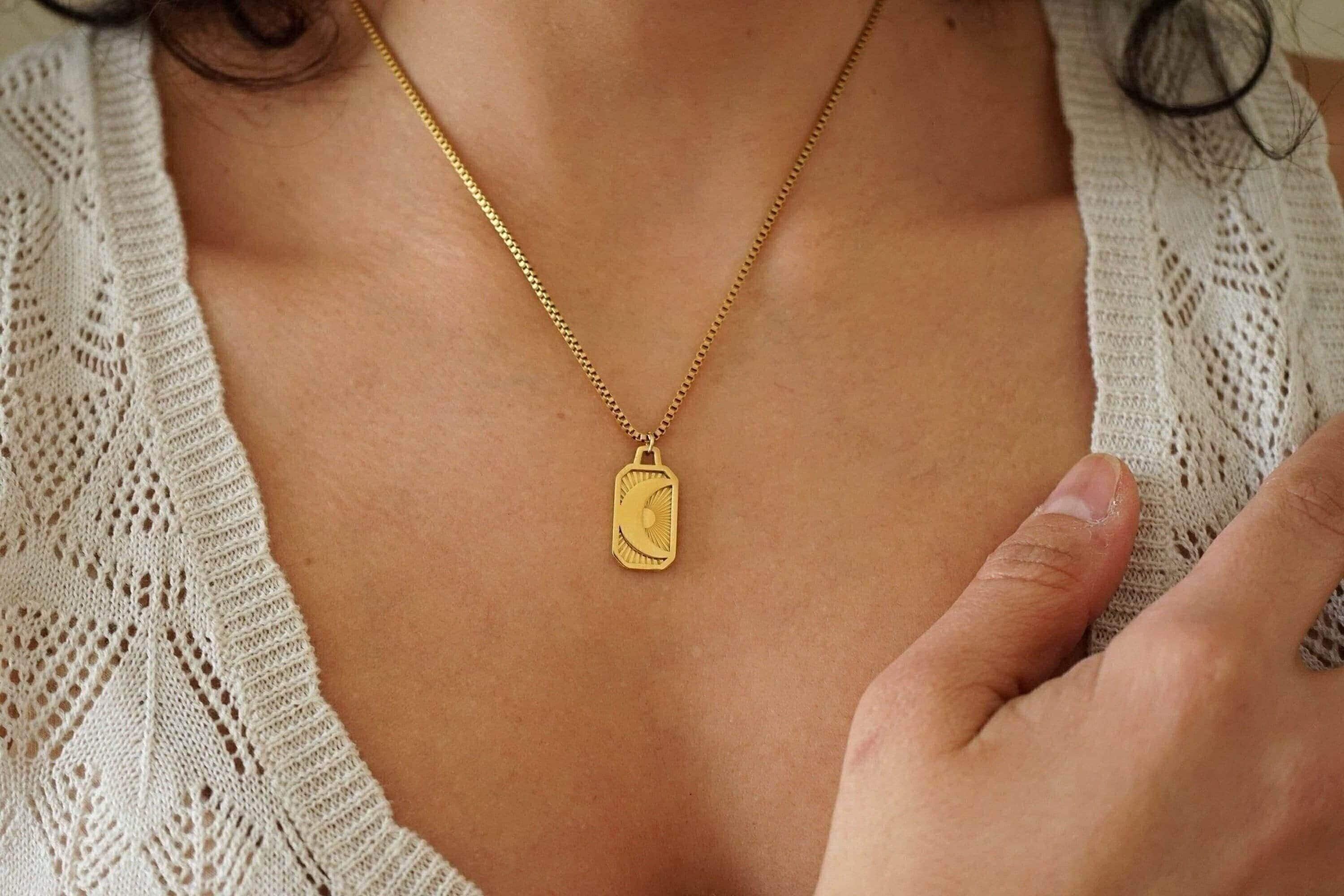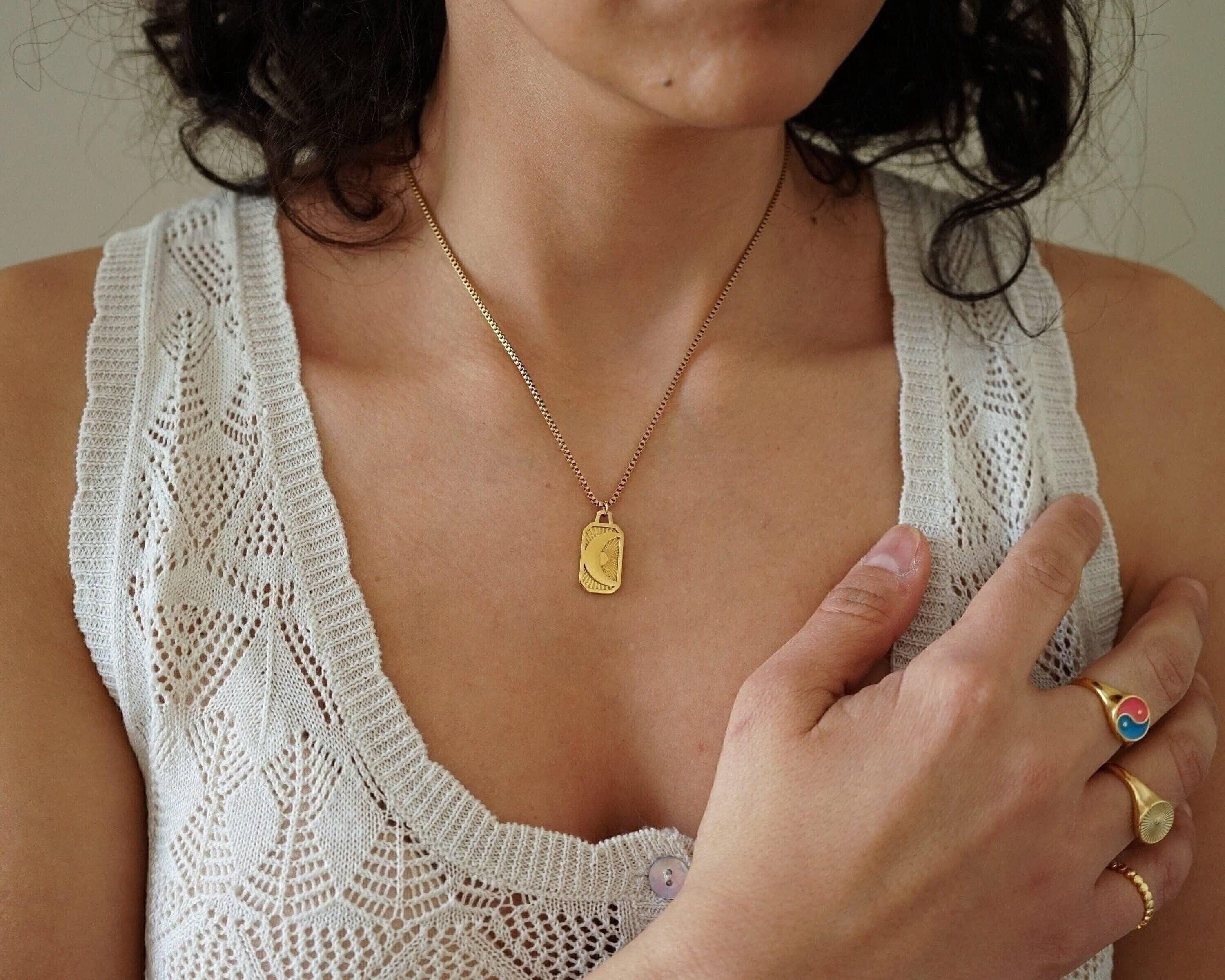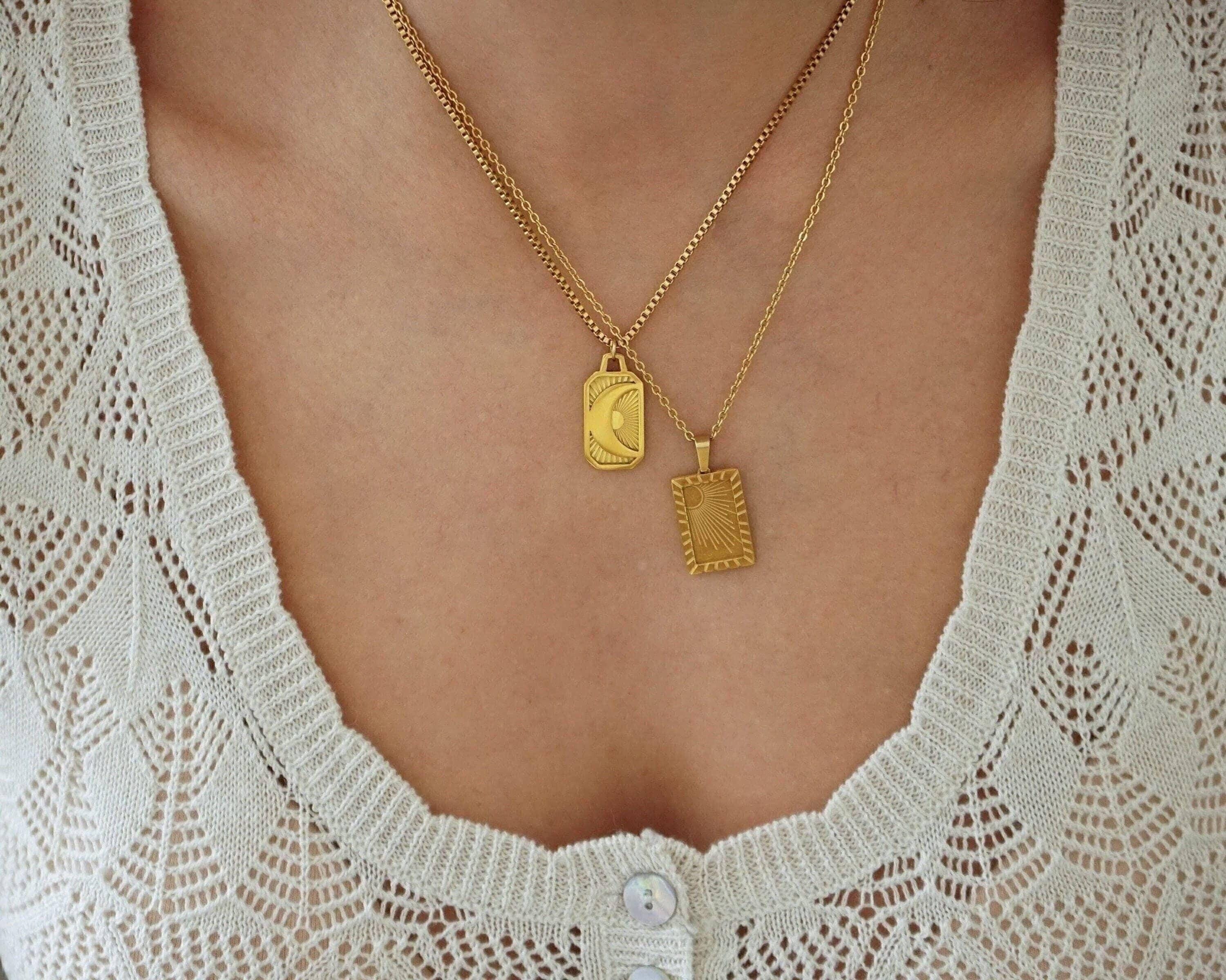 It's a unique gold pendant with an engraved SUN or MOON on a stainless steel chain. You can wear them alone or even together. These materials remain beautiful and do not wear off. They are tarnish-free and waterproof. The biggest trend in the fashion world right now dictates multi-layer necklaces. Chains and links of all sizes are a big trend on the runway and on the street this season. Styling that mingles thick and thin chains and beads creates a refined modern look. Invest in a statement piece that can take you through the seasons and complement every outfit.