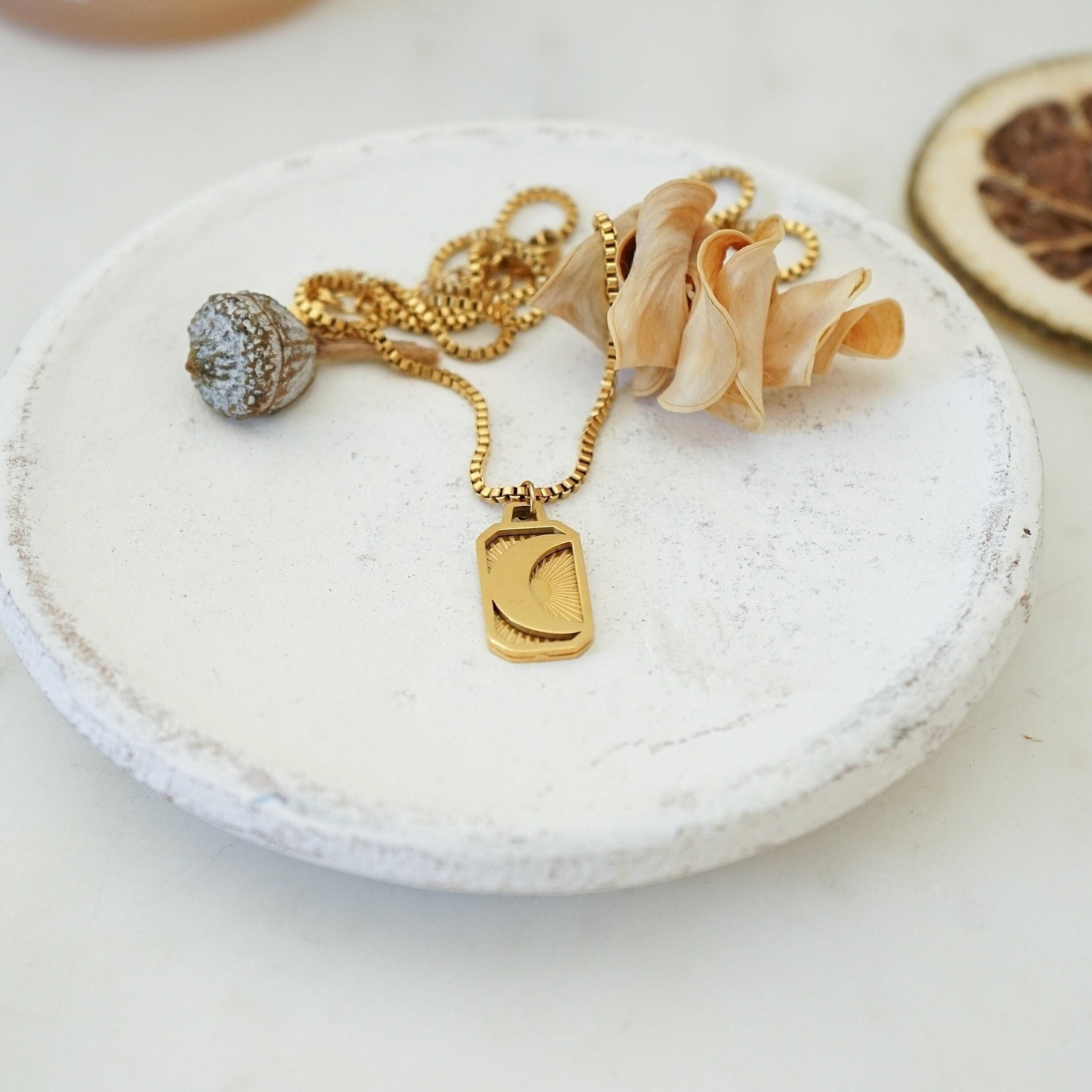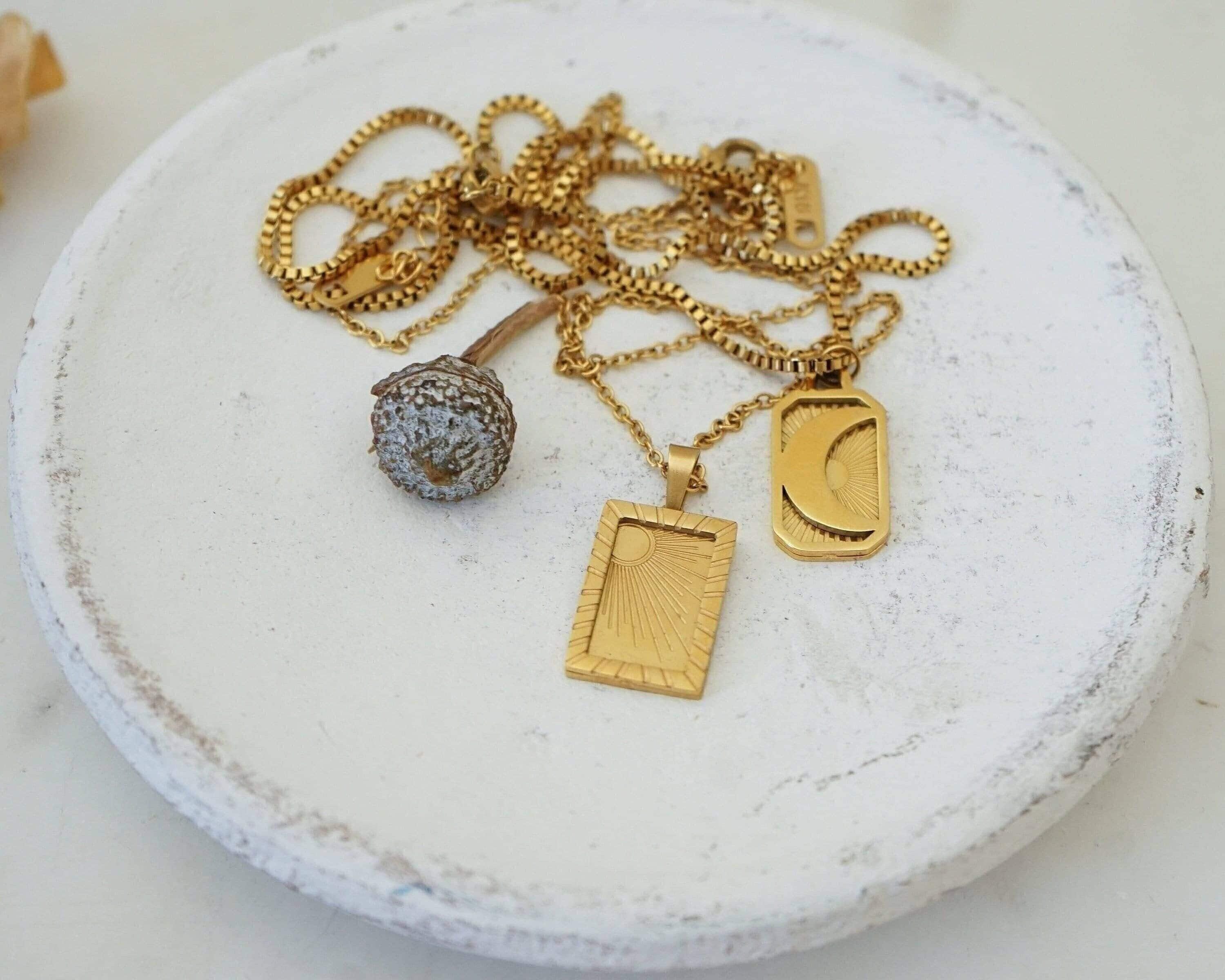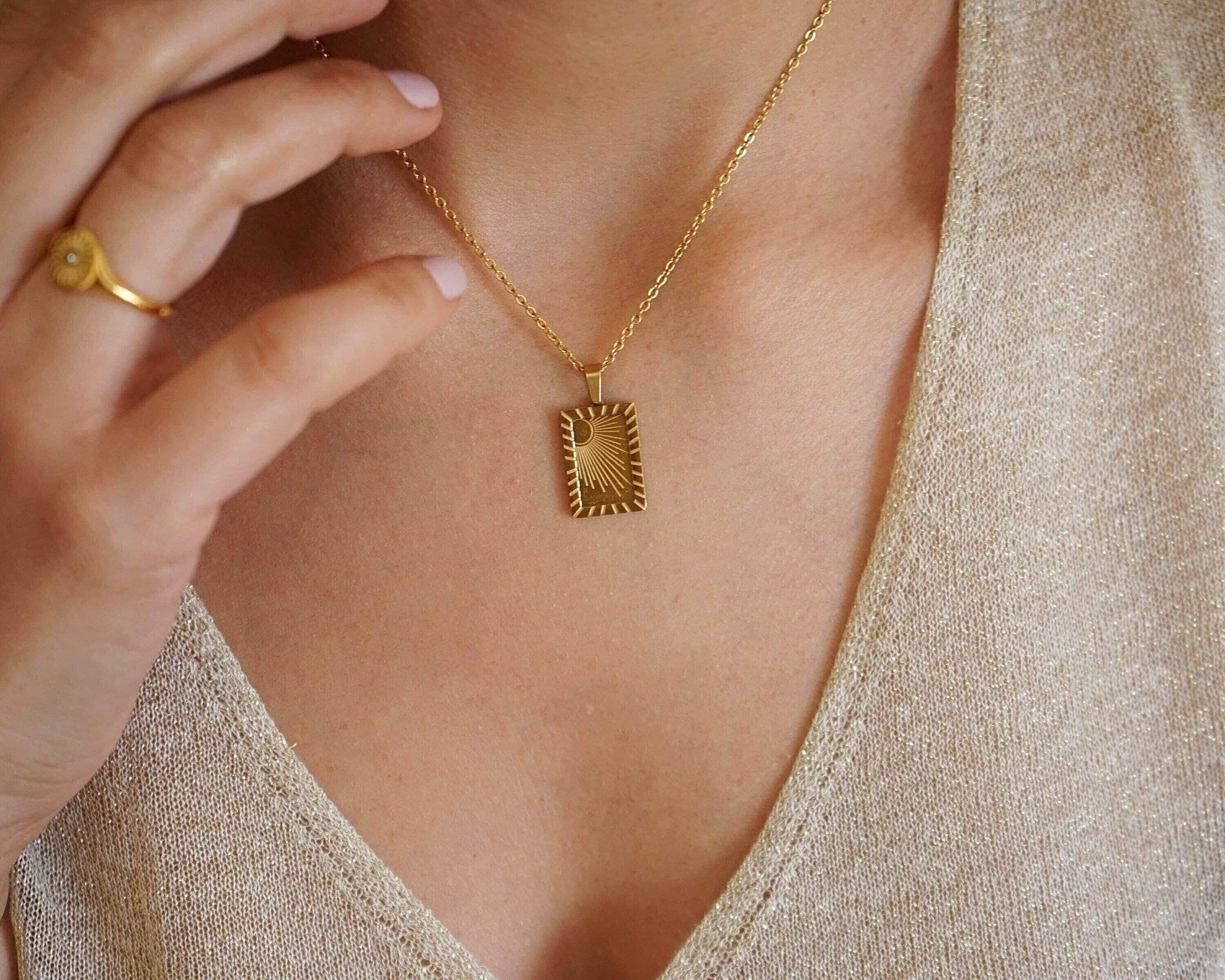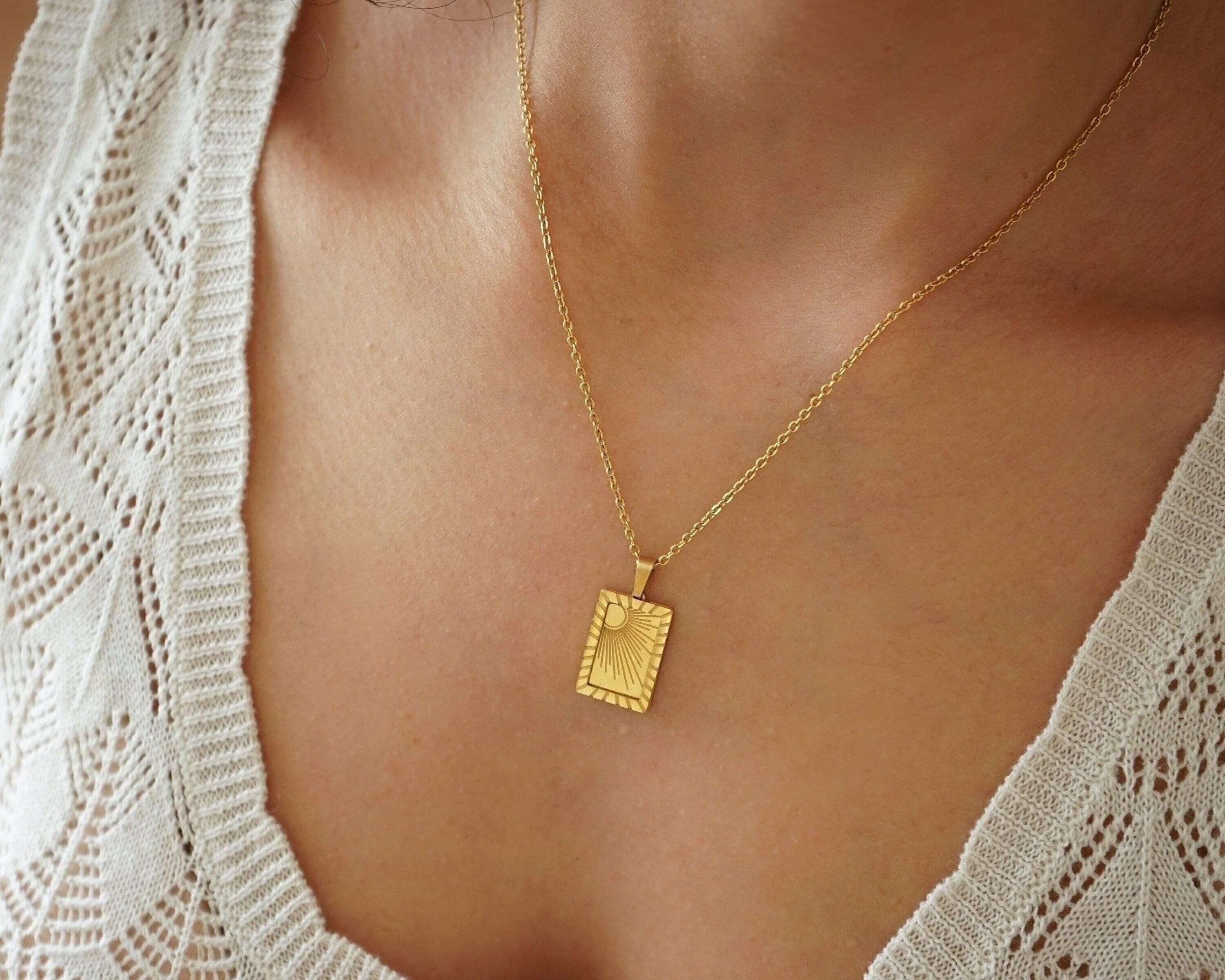 It's a unique gold pendant with an engraved SUN or MOON on a stainless steel chain. You can wear them alone or even together. These materials remain beautiful and do not wear off. They are tarnish-free and waterproof. The biggest trend in the fashion world right now dictates multi-layer necklaces. Chains and links of all sizes are a big trend on the runway and on the street this season. Styling that mingles thick and thin chains and beads creates a refined modern look. Invest in a statement piece that can take you through the seasons and complement every outfit.