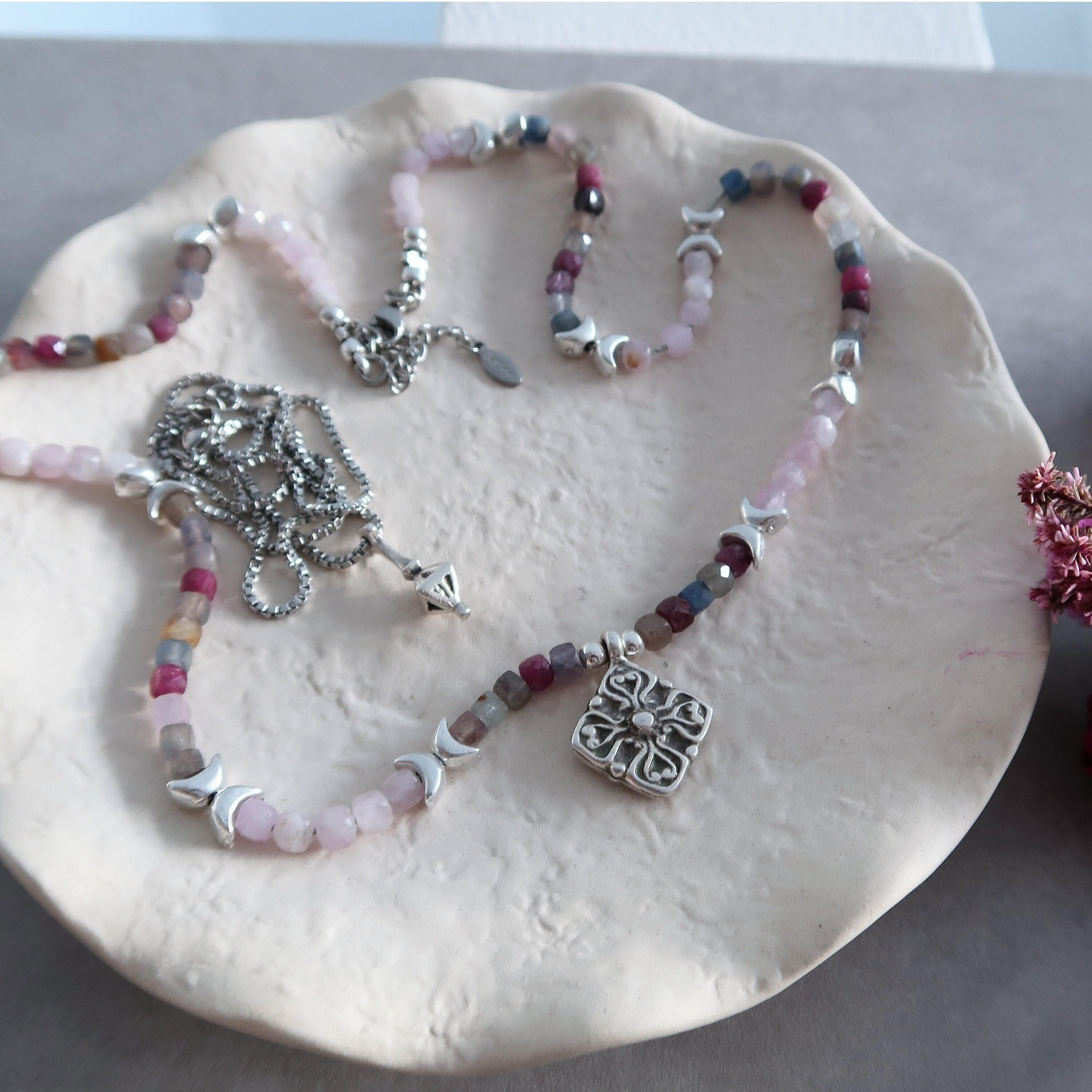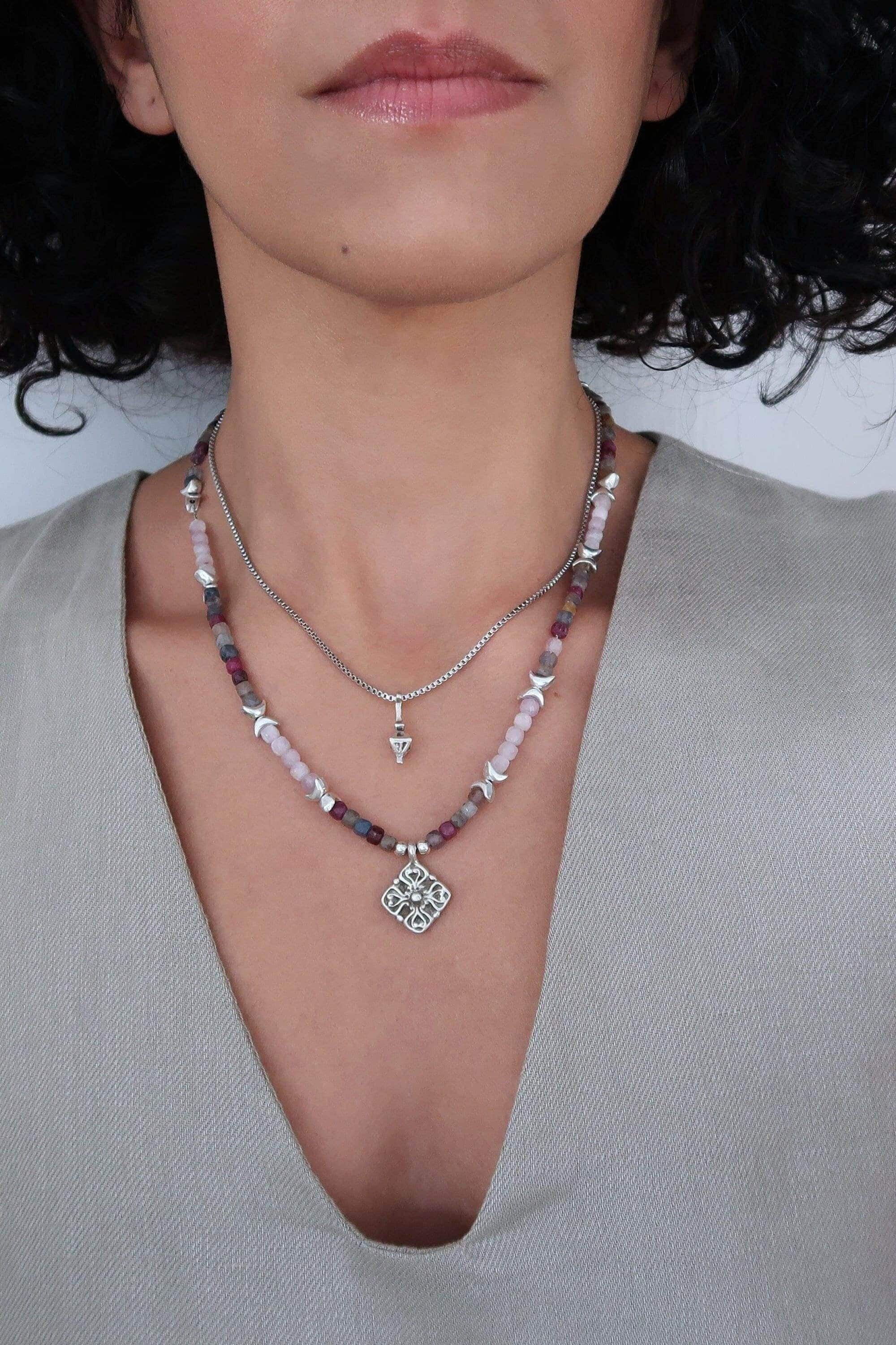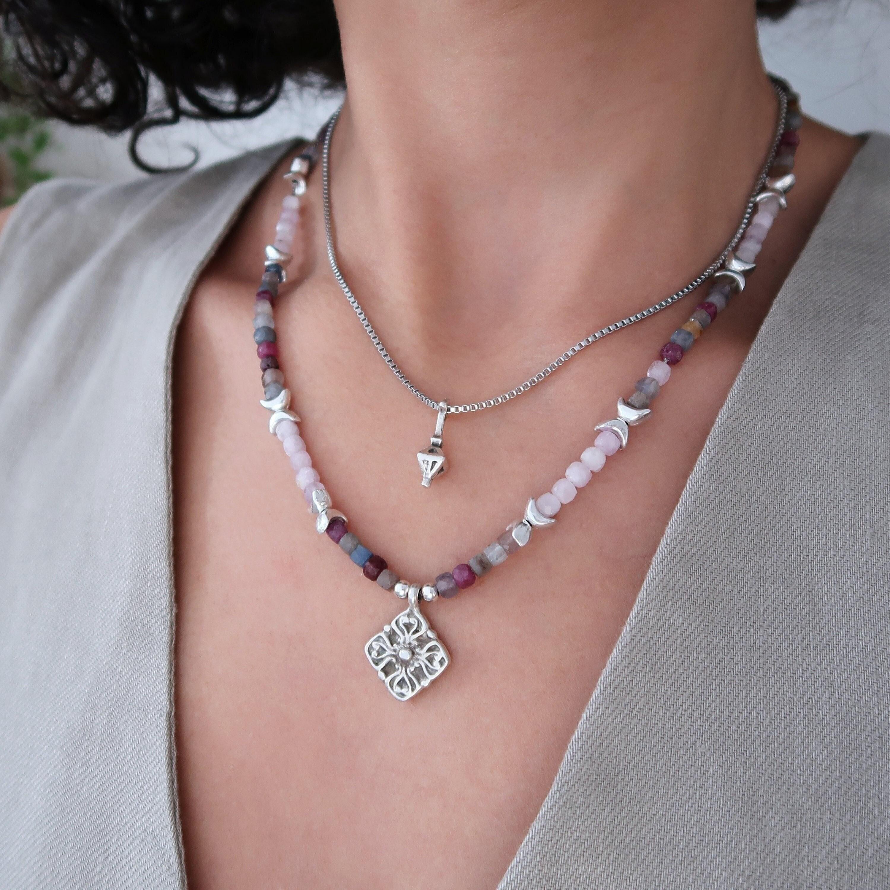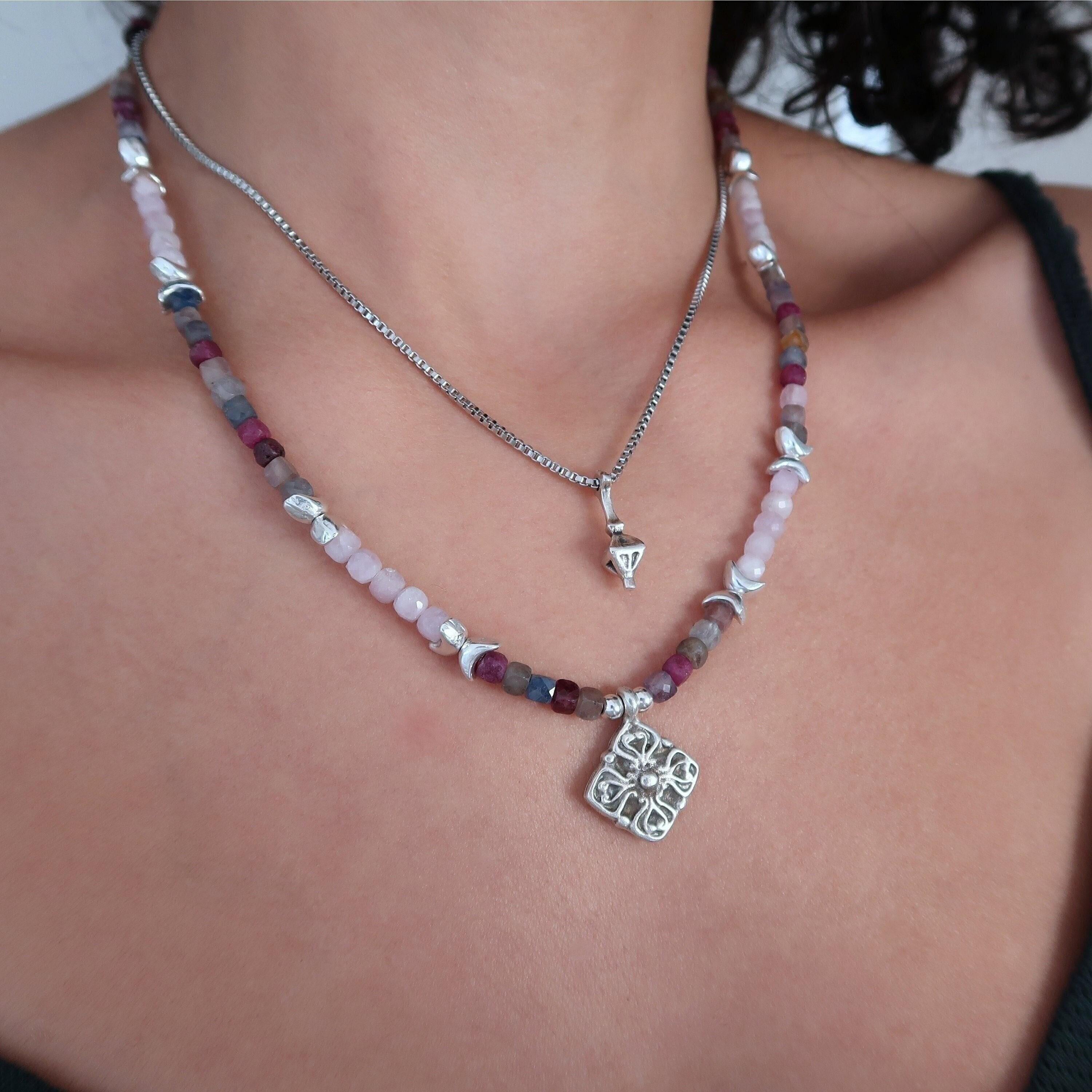 This quirky layered necklace set features two unique pieces. The first is a stainless steel box chain with a tiny, offbeat rhombus charm. The second necklace is a playful mix of gemstones, including square ruby, sapphire, and light purple kunzite cubes, along with a cross and moon-shaped beads. With its one-of-a-kind design, this necklace set is perfect for adding a fresh and modern touch to any outfit. And with a lobster clasp closure on each necklace, you can easily mix and match it with other pieces in your collection.