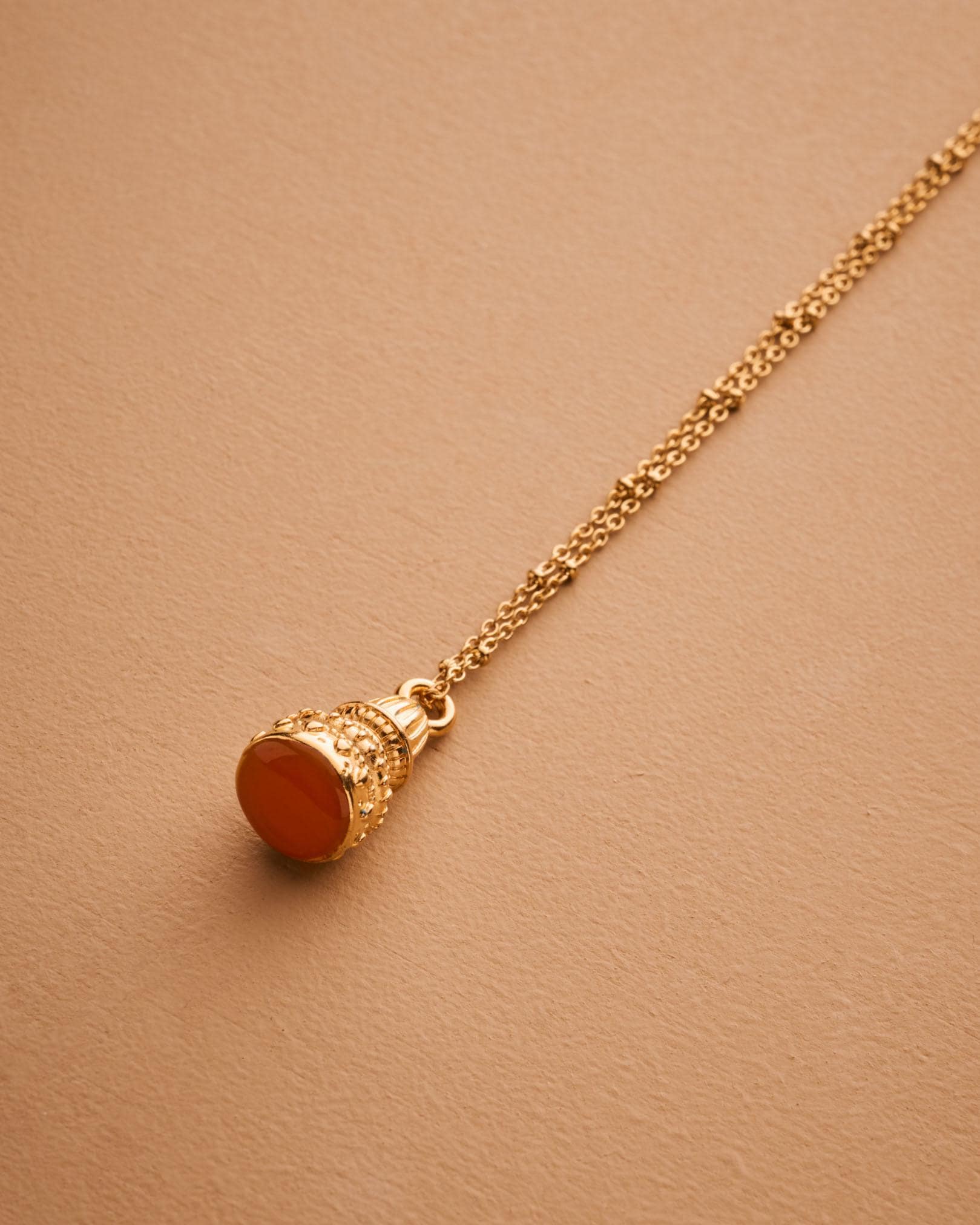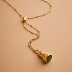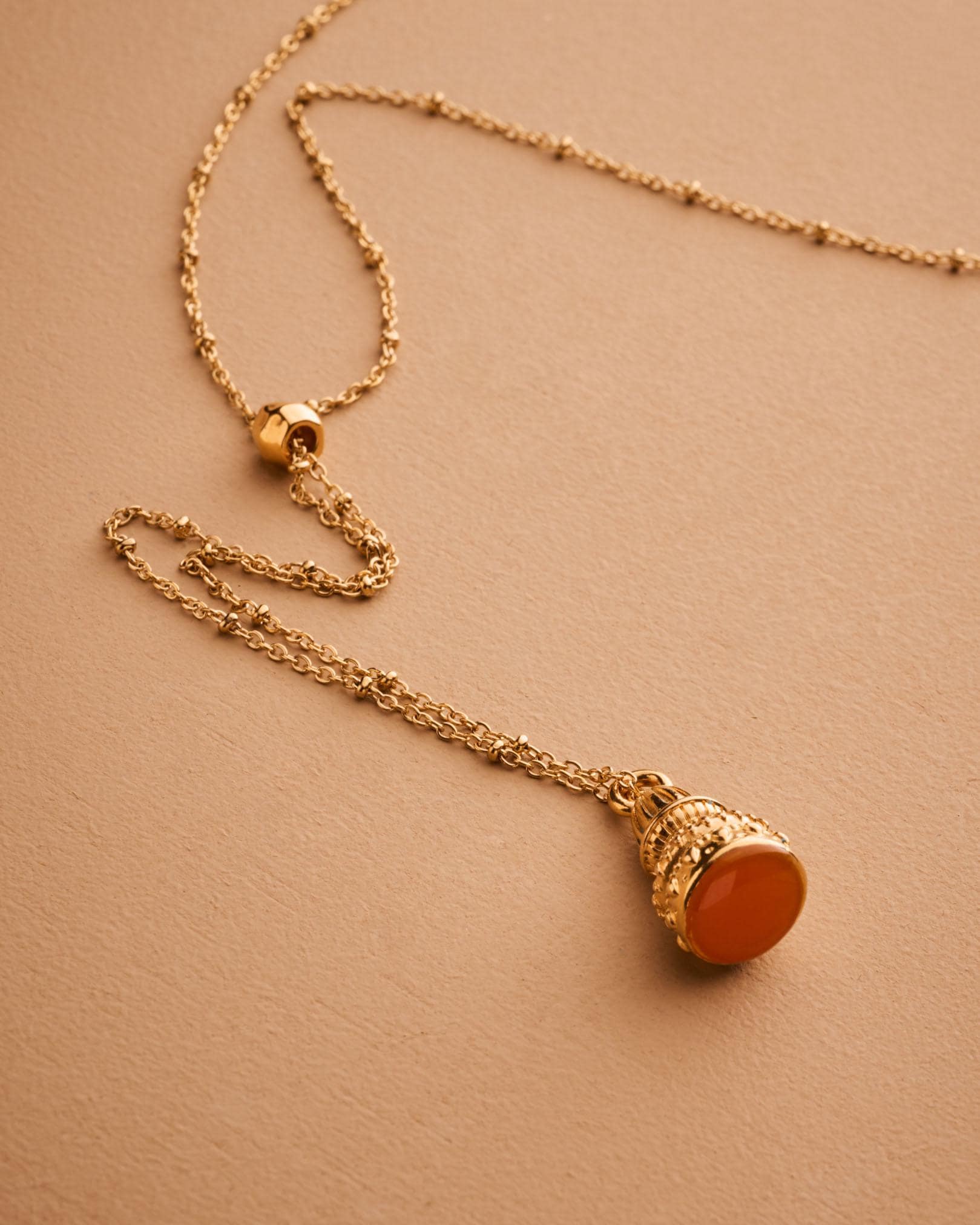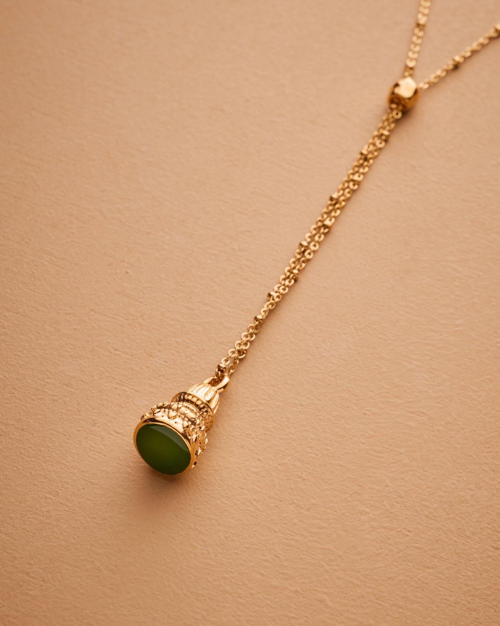 Add a touch of boho-chic to your jewelry collection with this gold-plated enamel pendulum necklace. Inspired by the timeless symbolism of pendulums, this statement piece features a detailed gold pendant and a vibrant enamel stone in your choice of green, brown, or orange. Its long silhouette and adjustable chain make it perfect for layering or wearing solo. The bold enamel, spiritual charm, and quality gold-plated materials make this necklace a must-have for anyone who loves meaningful and artistic accessories.