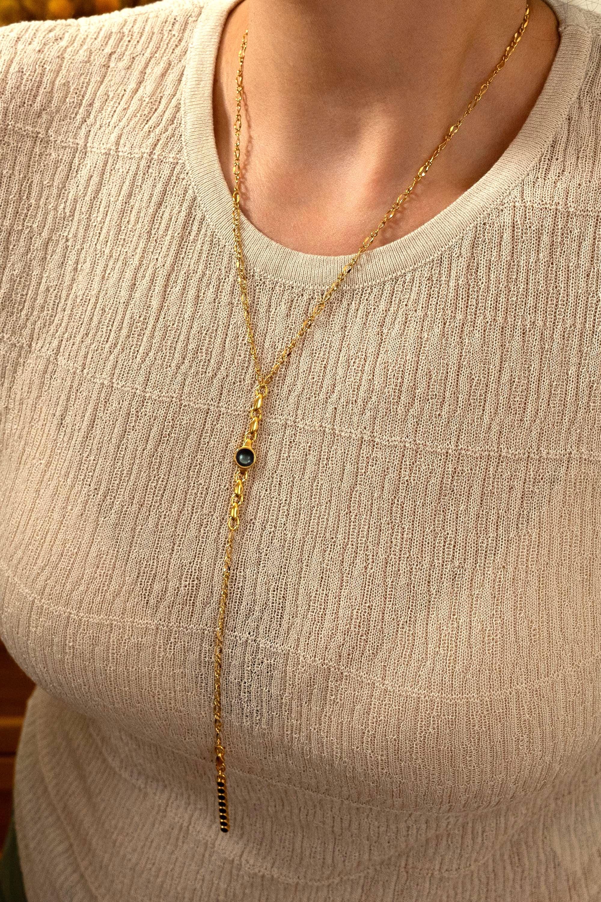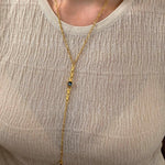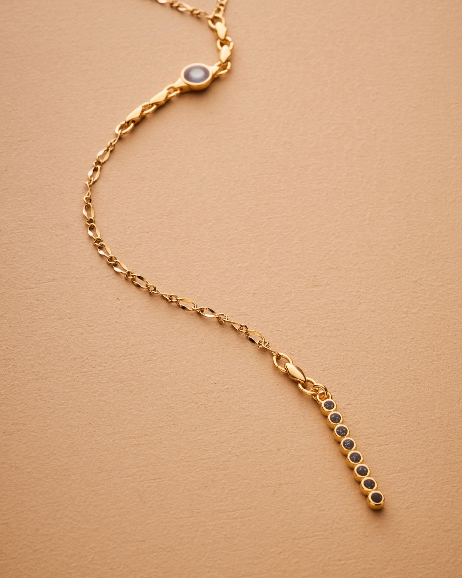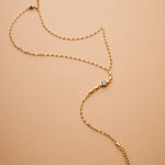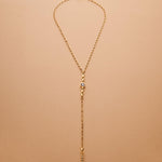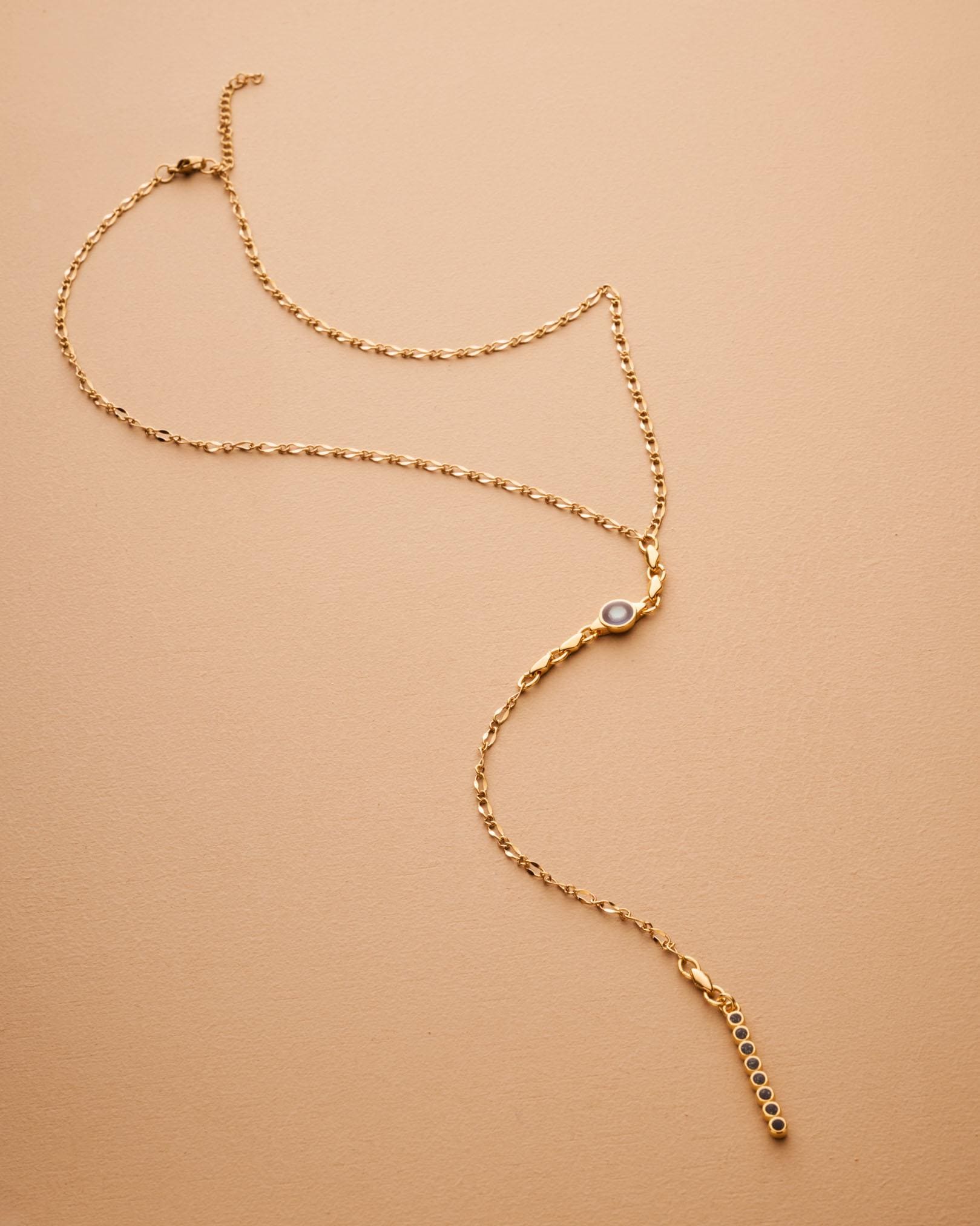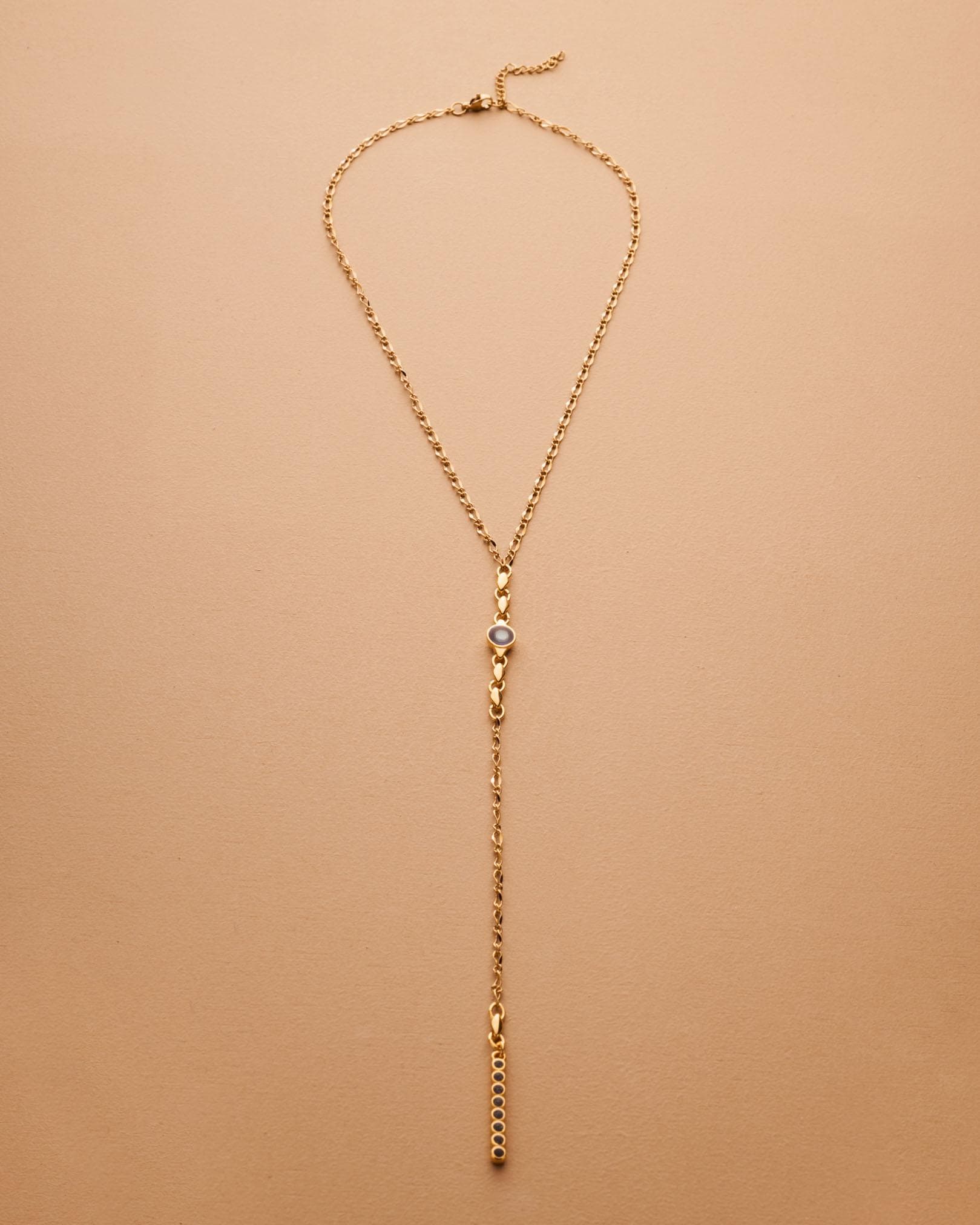 A sleek and sculptural lariat necklace that blends structure with effortless movement. Crafted with a slim gold stainless steel chain, this elegant Y-shaped piece features a unique geometric zamak pendant: a linear stick motif adorned with round settings, paired with a flat open circle connector. The necklace closes with a lobster clasp and is finished with a long tassel drop for added visual flow.