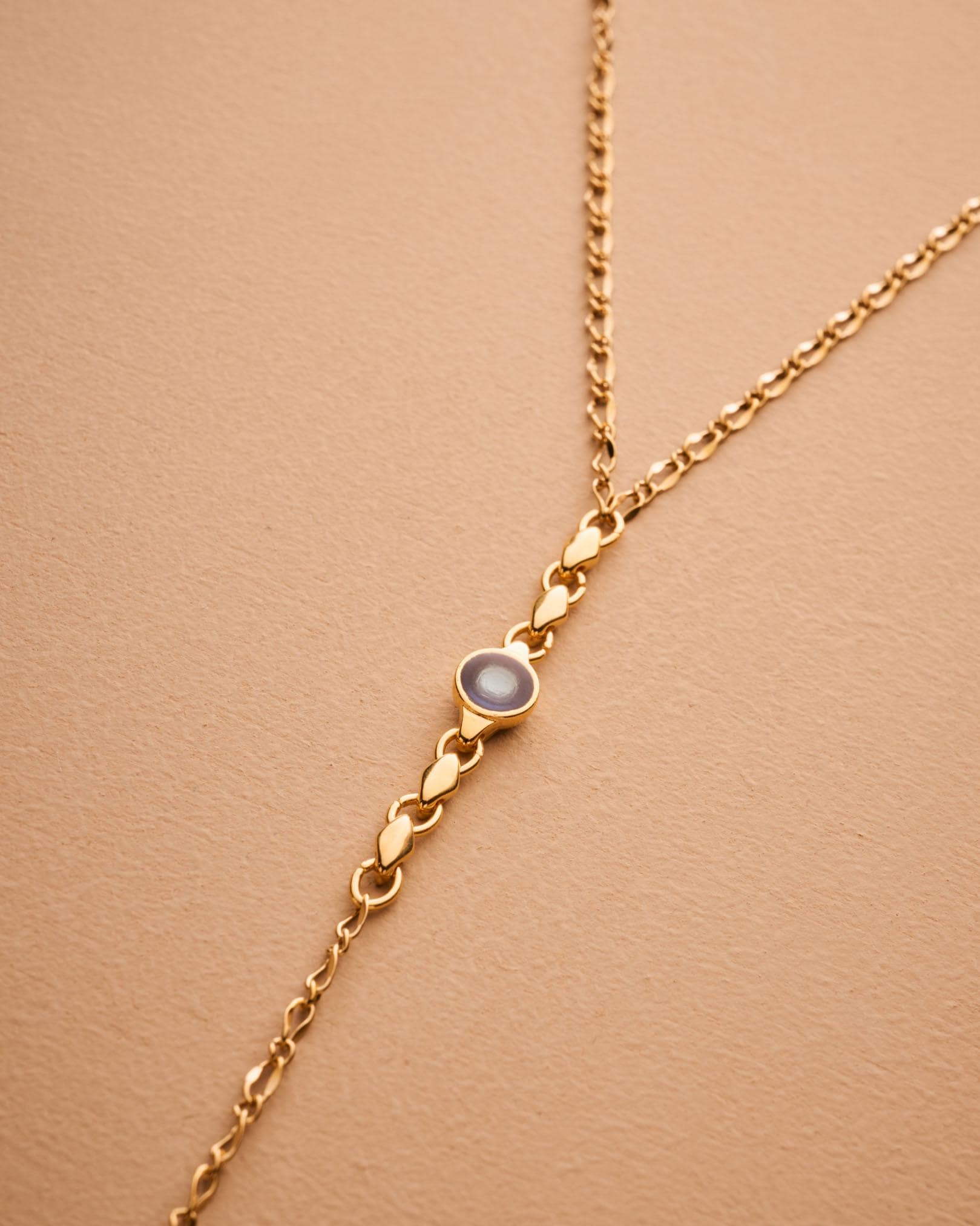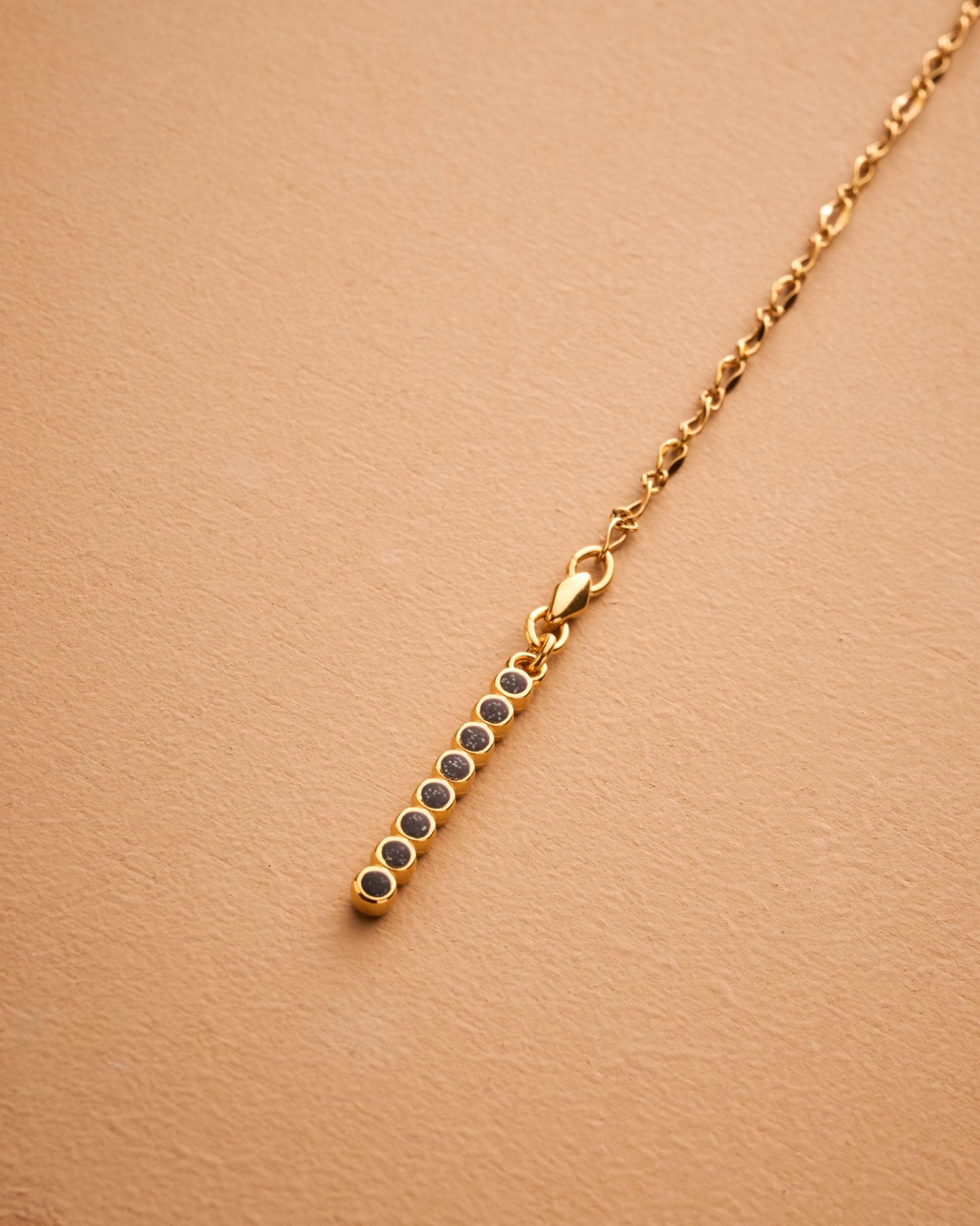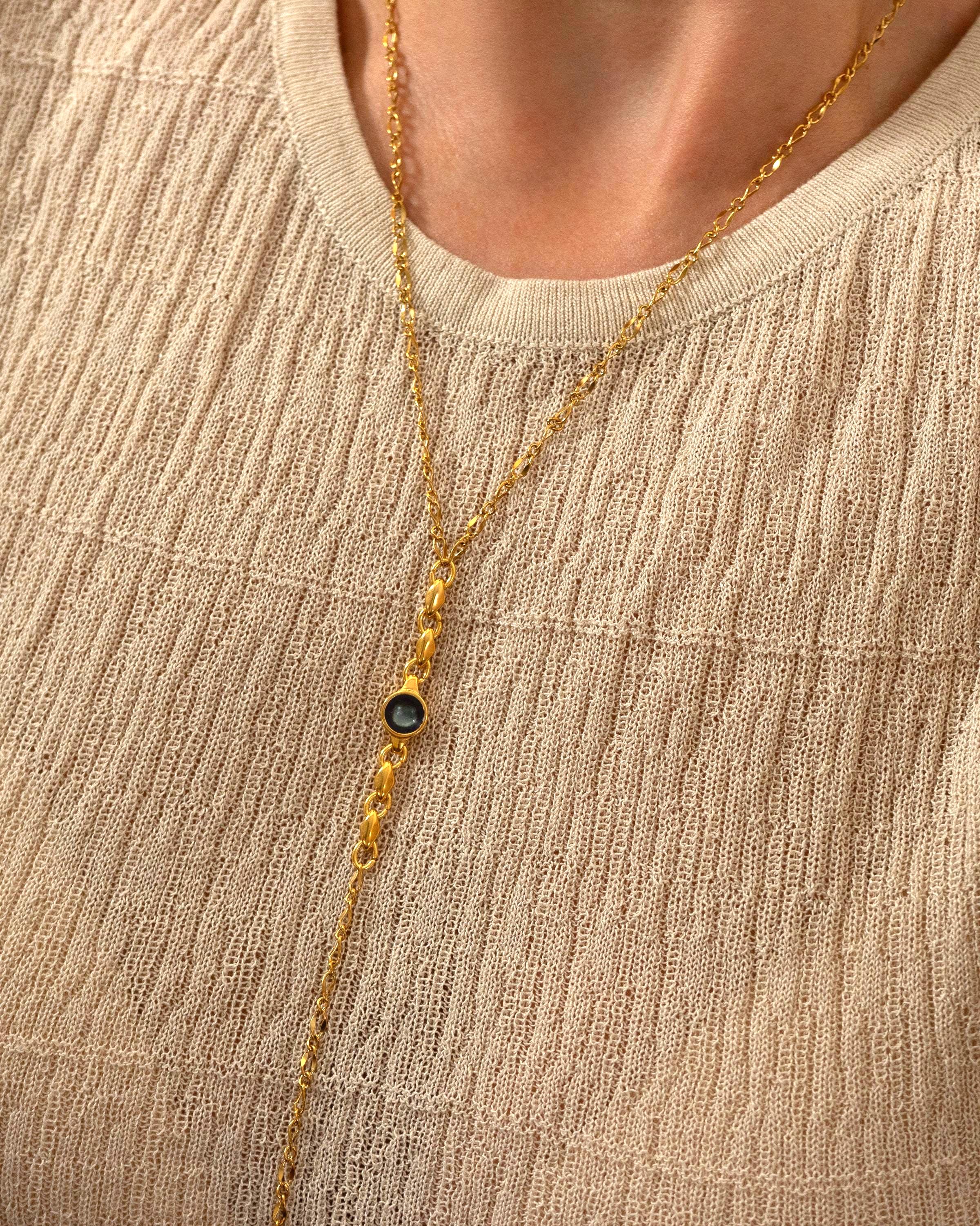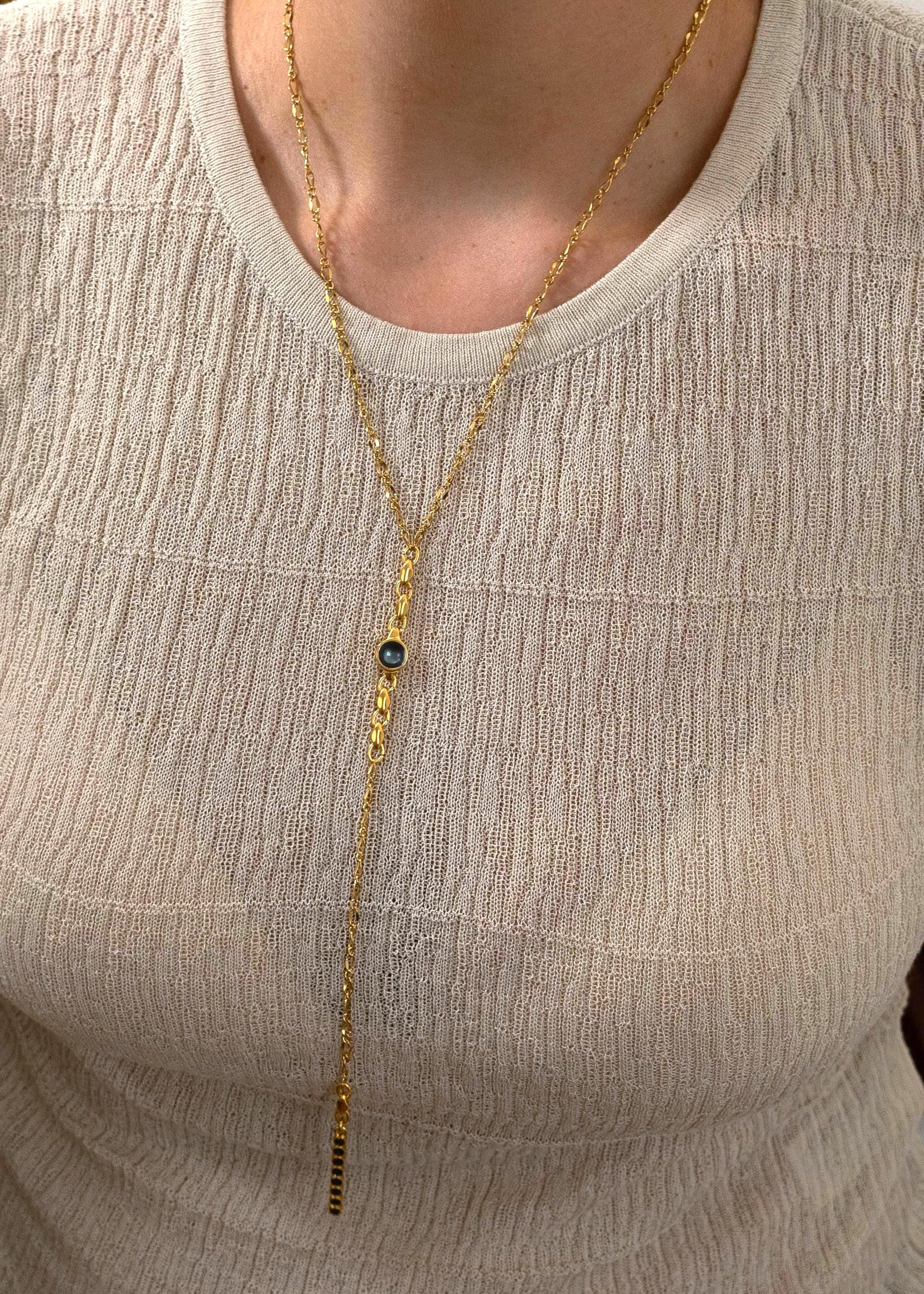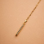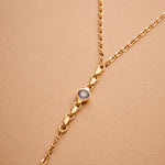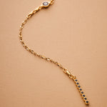 A sleek and sculptural lariat necklace that blends structure with effortless movement. Crafted with a slim gold stainless steel chain, this elegant Y-shaped piece features a unique geometric zamak pendant: a linear stick motif adorned with round settings, paired with a flat open circle connector. The necklace closes with a lobster clasp and is finished with a long tassel drop for added visual flow.