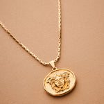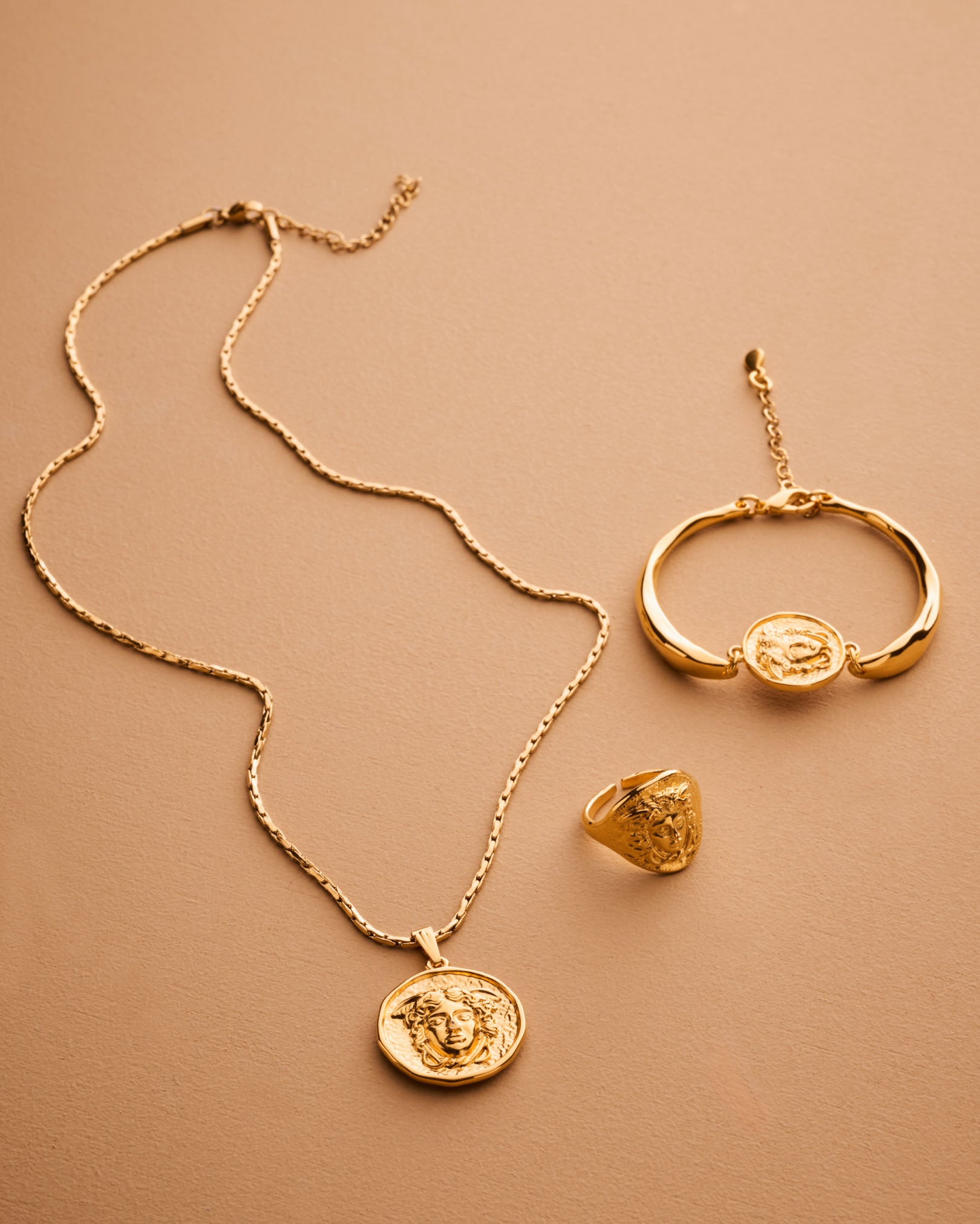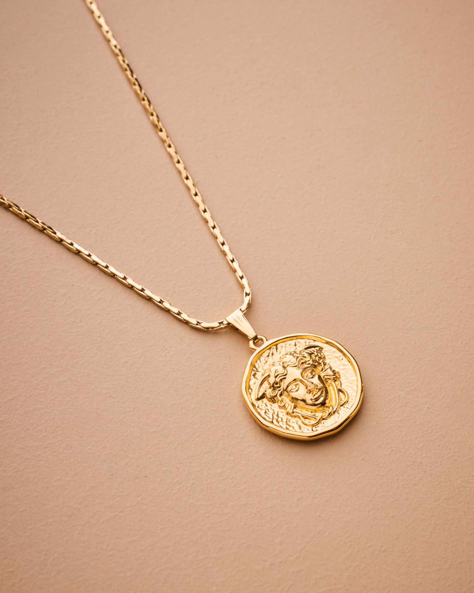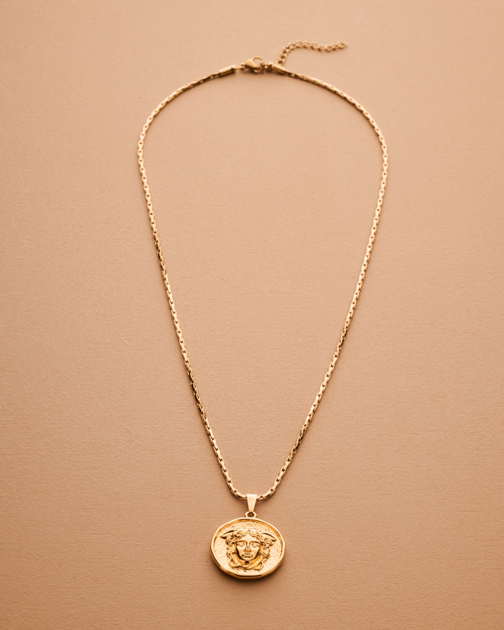 Inspired by the captivating legend of Medusa, this gold-plated necklace blends ancient symbolism with contemporary design. The pendant features the Gorgon’s mythological face in detailed relief, paired with a durable stainless steel cobra chain.