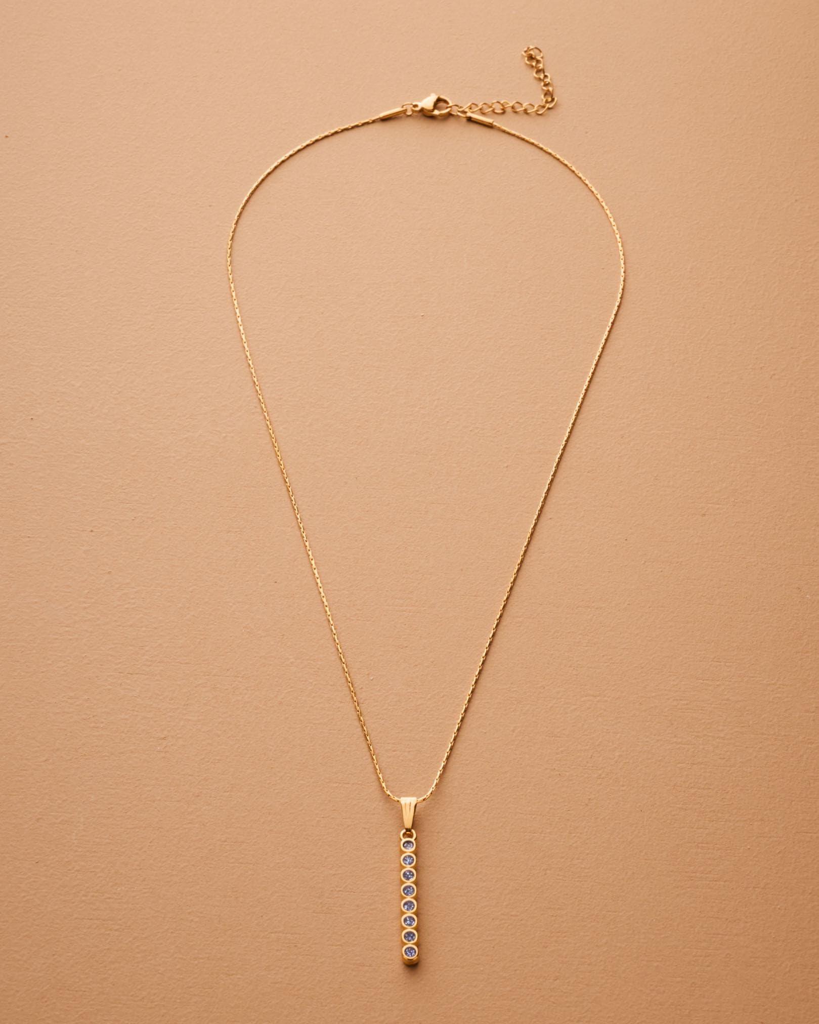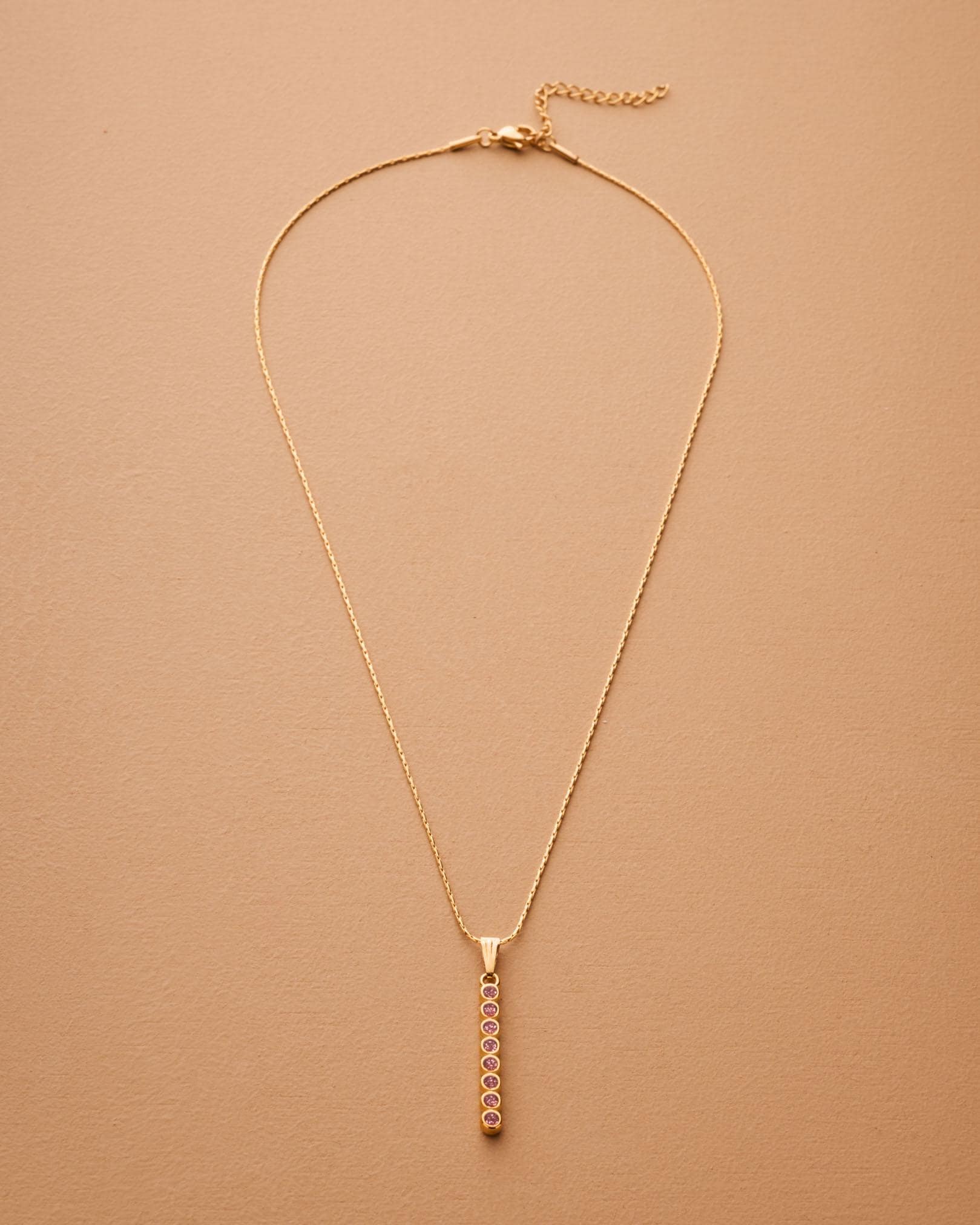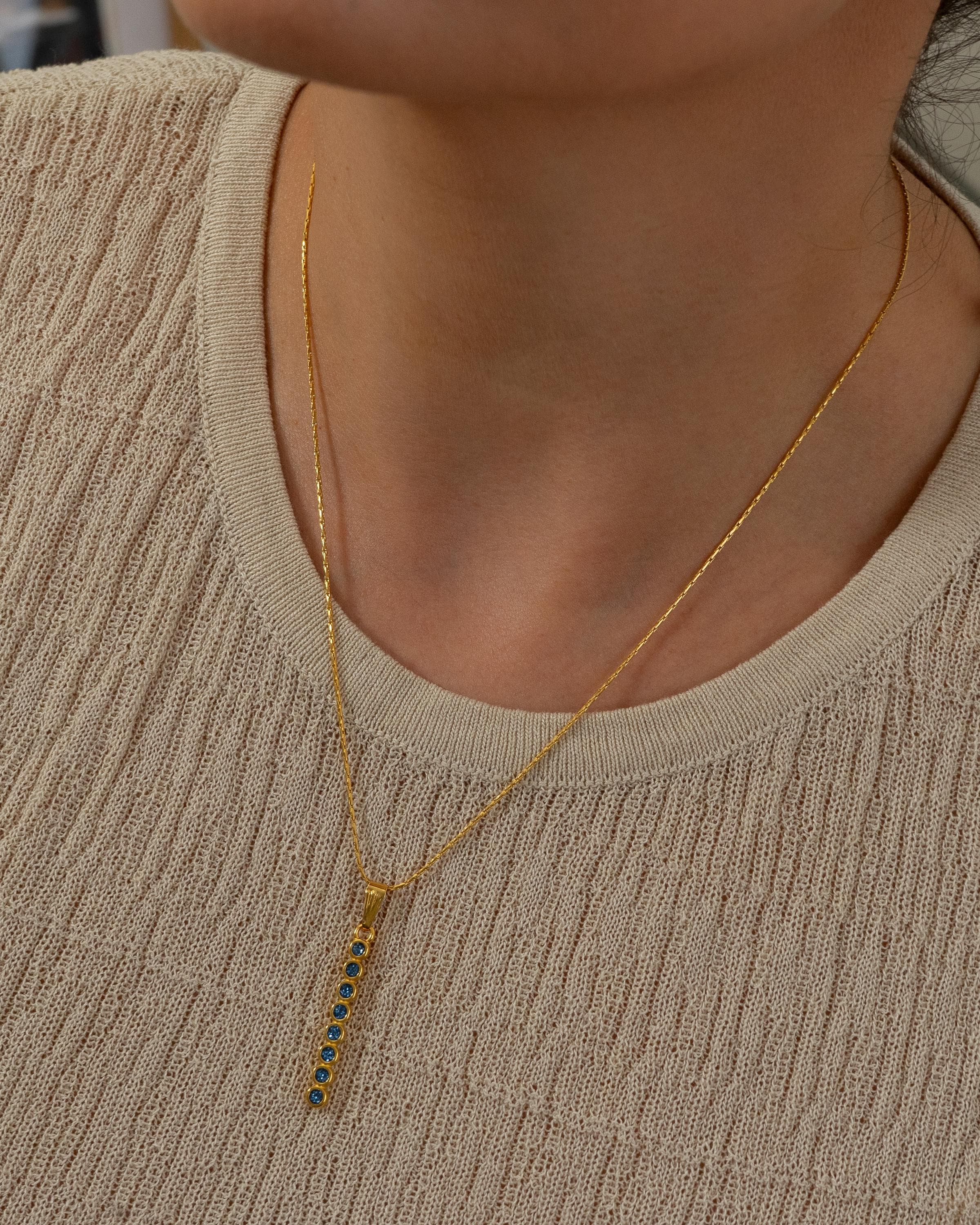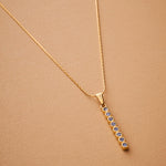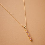 This gold stick pendant necklace features a vertical charm adorned with sparkling round glitter settings, available in Navy Blue or Pink. Designed with a durable stainless steel chain and gold-plated finish, this piece is perfect for layering or wearing alone. Lightweight and easy to style, it adds a subtle pop of color and shimmer to your everyday look.