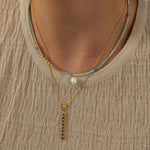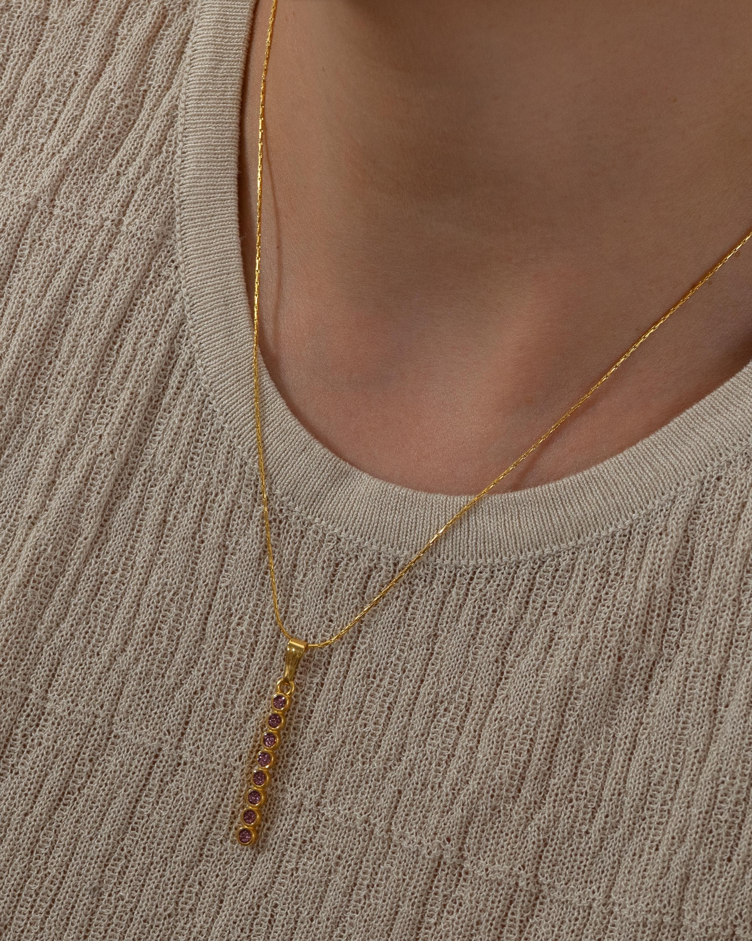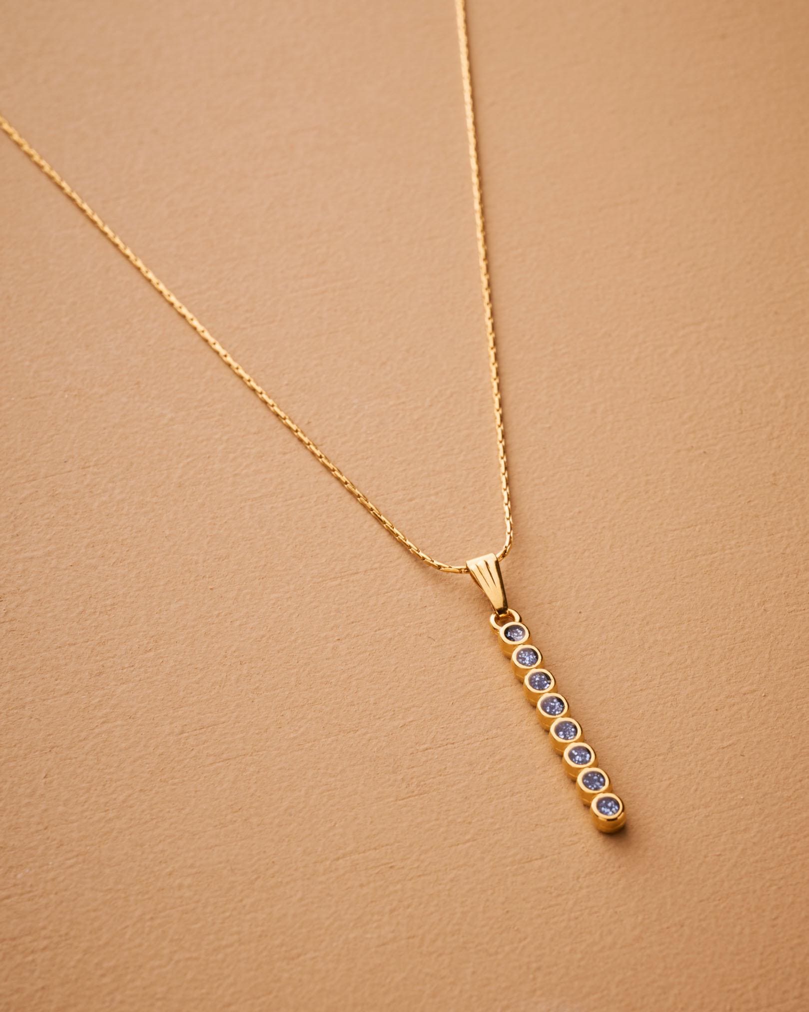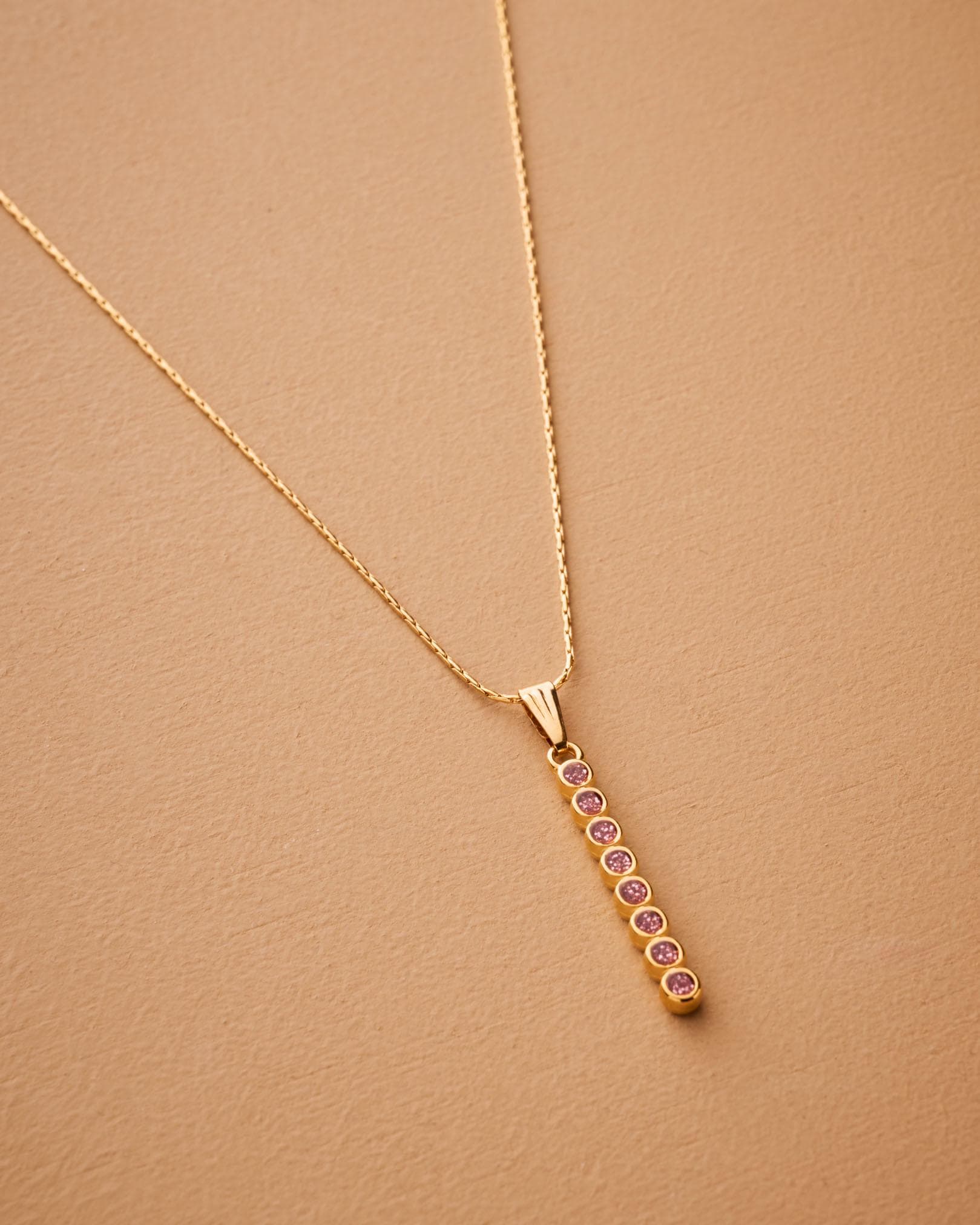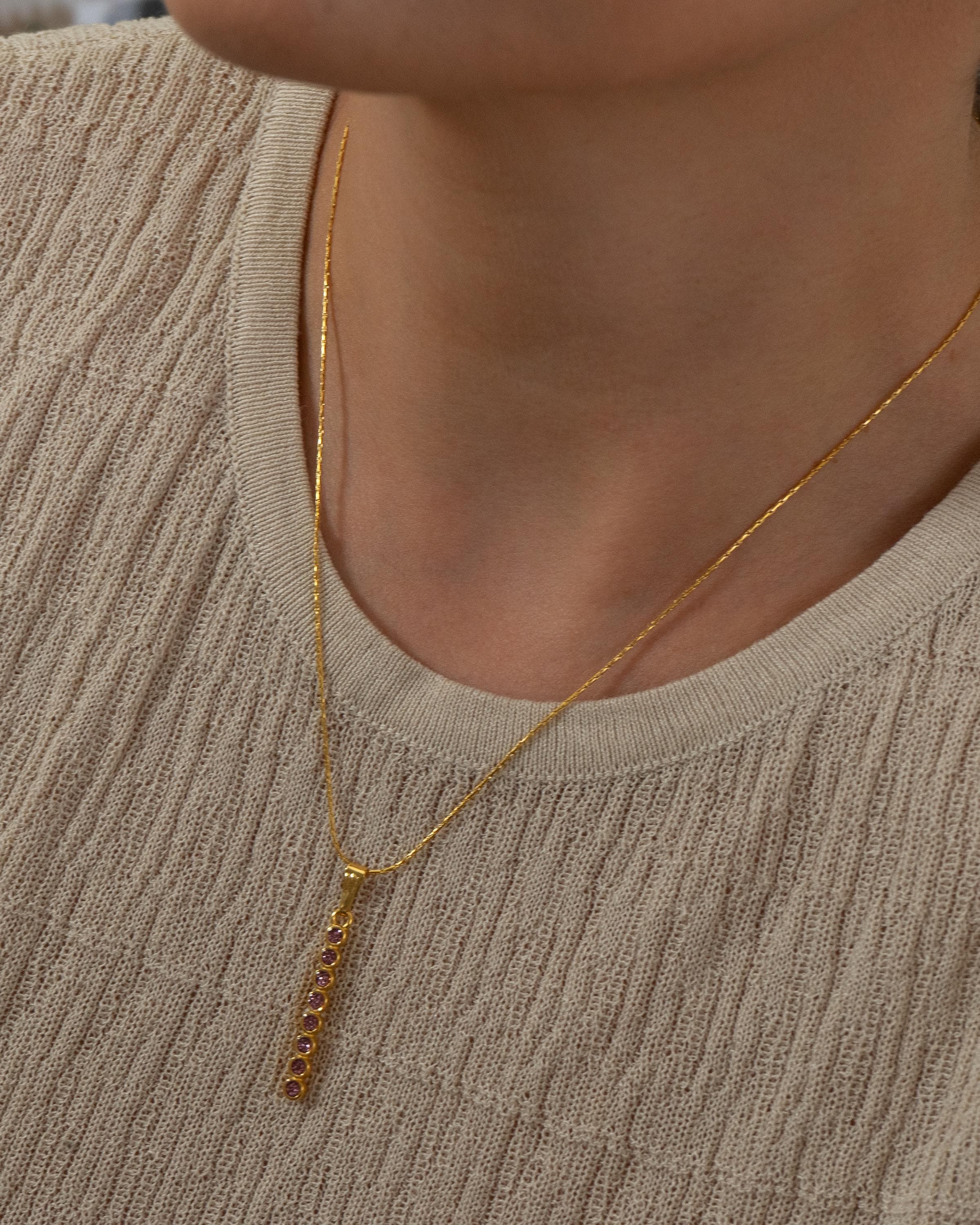 This gold stick pendant necklace features a vertical charm adorned with sparkling round glitter settings, available in Navy Blue or Pink. Designed with a durable stainless steel chain and gold-plated finish, this piece is perfect for layering or wearing alone. Lightweight and easy to style, it adds a subtle pop of color and shimmer to your everyday look.