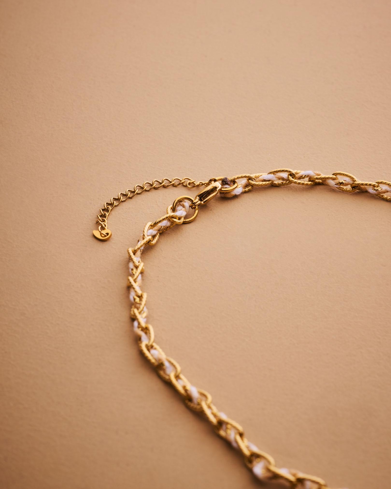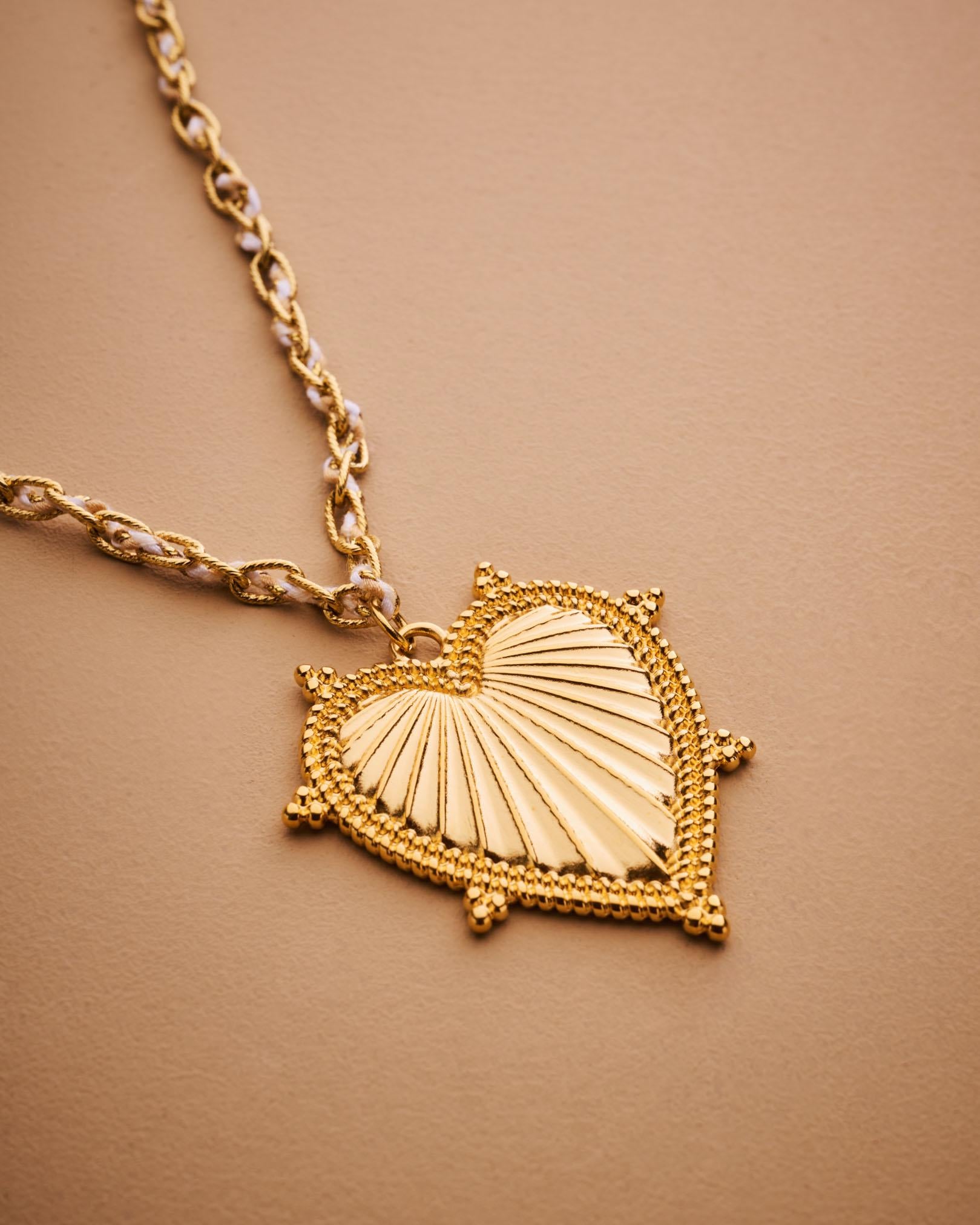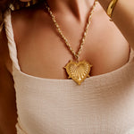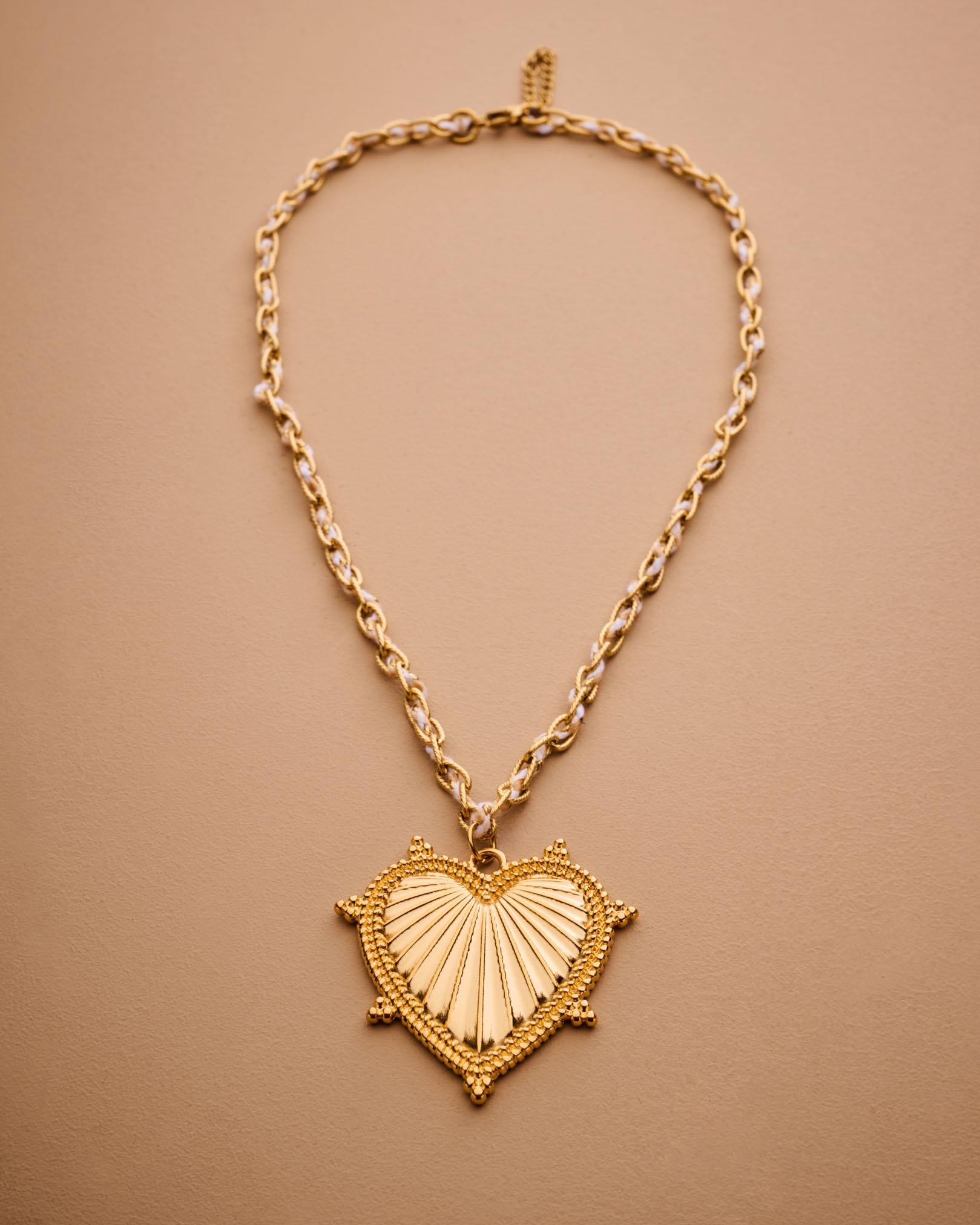 Command attention with this Gold Textured Heart Necklace, a bold and beautiful statement piece that radiates strength, love, and timeless glamour. Featuring an intricately detailed heart pendant with a ribbed, sacred-heart-inspired design, this necklace is both symbolic and fashion-forward. The standout chunky chain is interwoven with jade green cord and gold thread, adding a soft contrast and elevated texture that makes this necklace a true conversation starter.