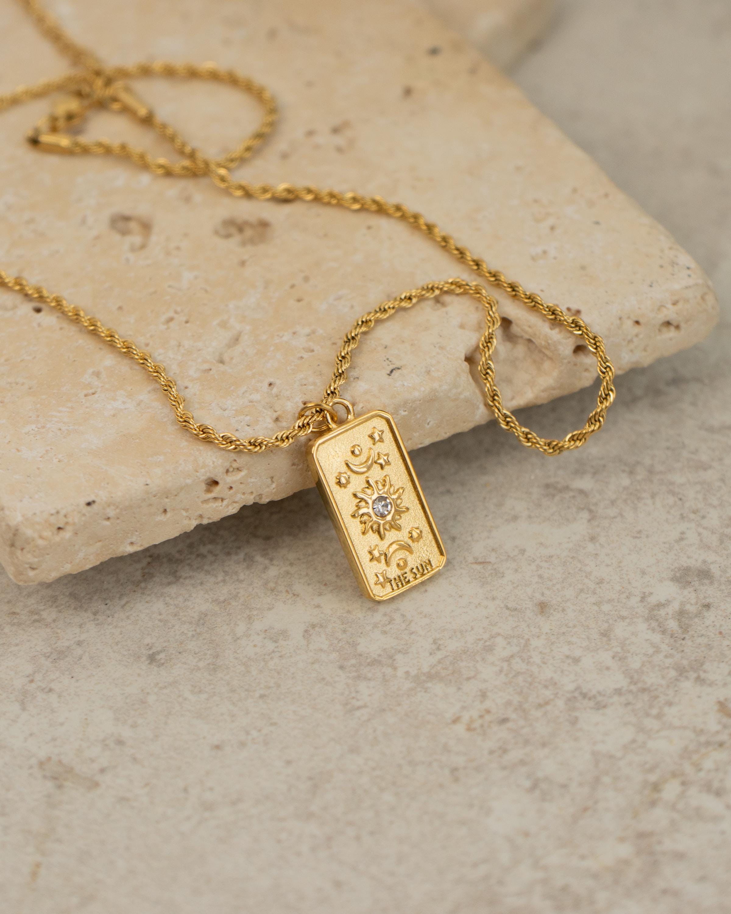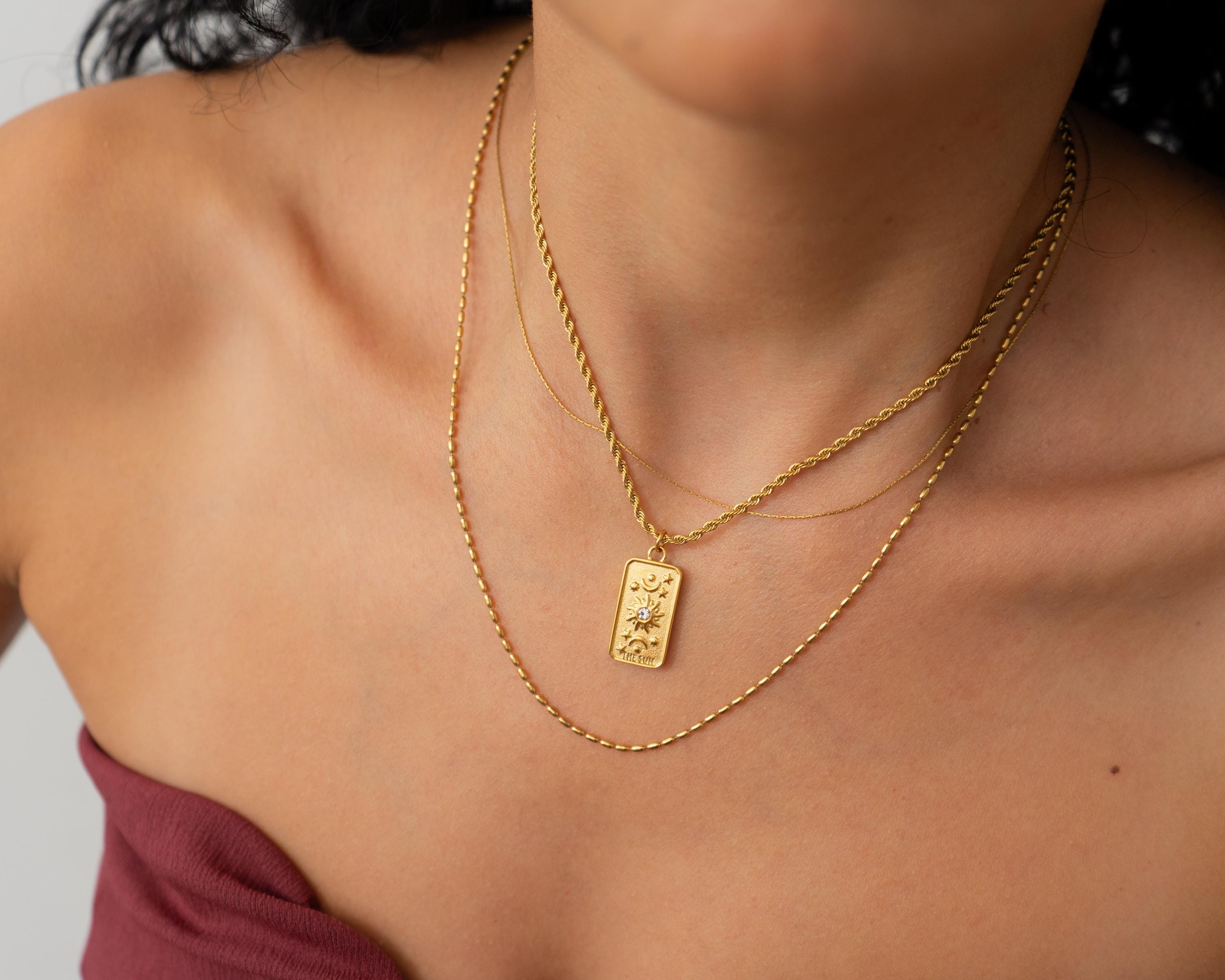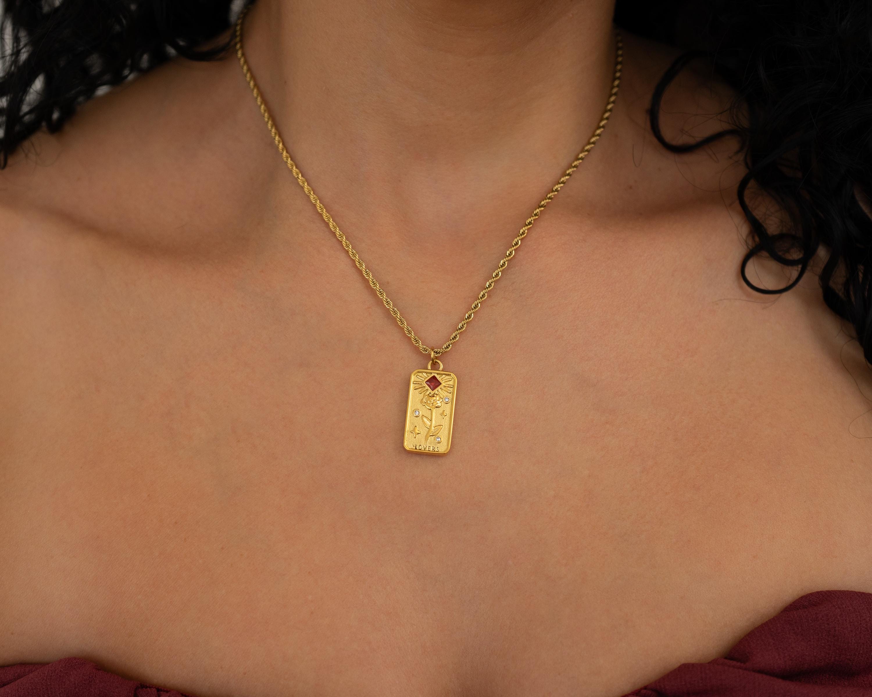 A modern tribute to timeless symbolism. This rectangular tarot card necklace is a bold and meaningful piece that speaks to your personal journey. Crafted in gold-toned stainless steel and set with sparkling zircon stones, it features intricate engravings inspired by the Major Arcana:
