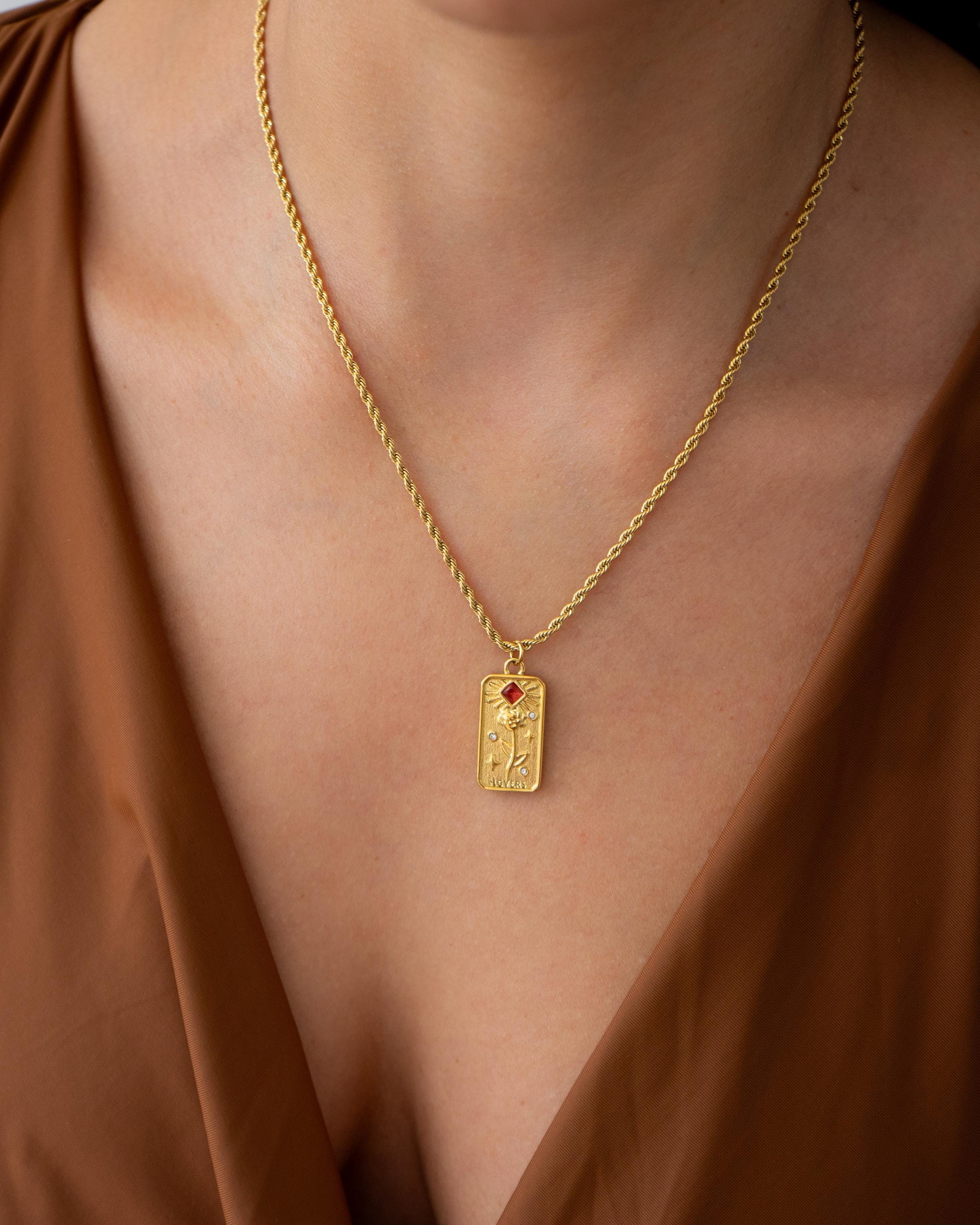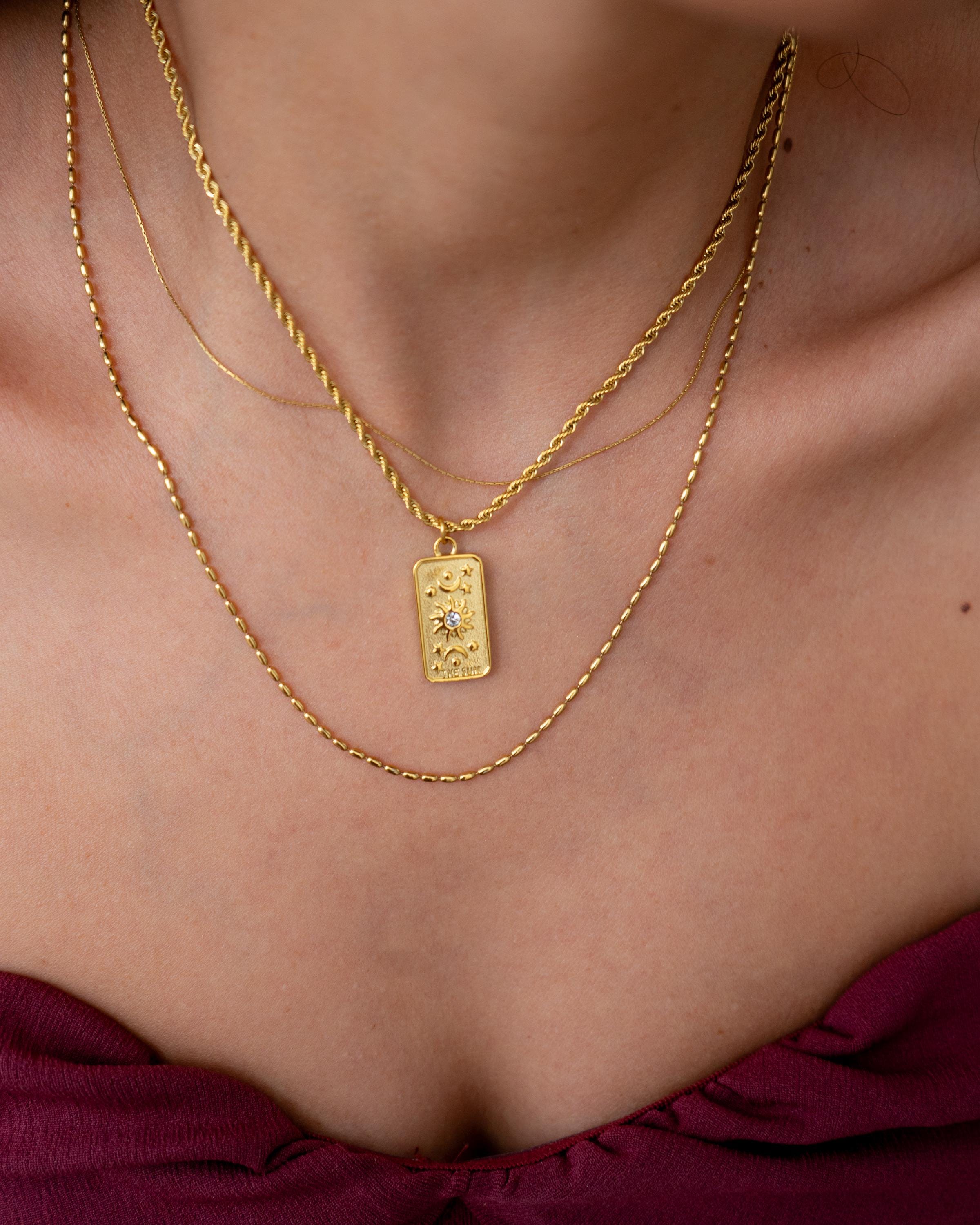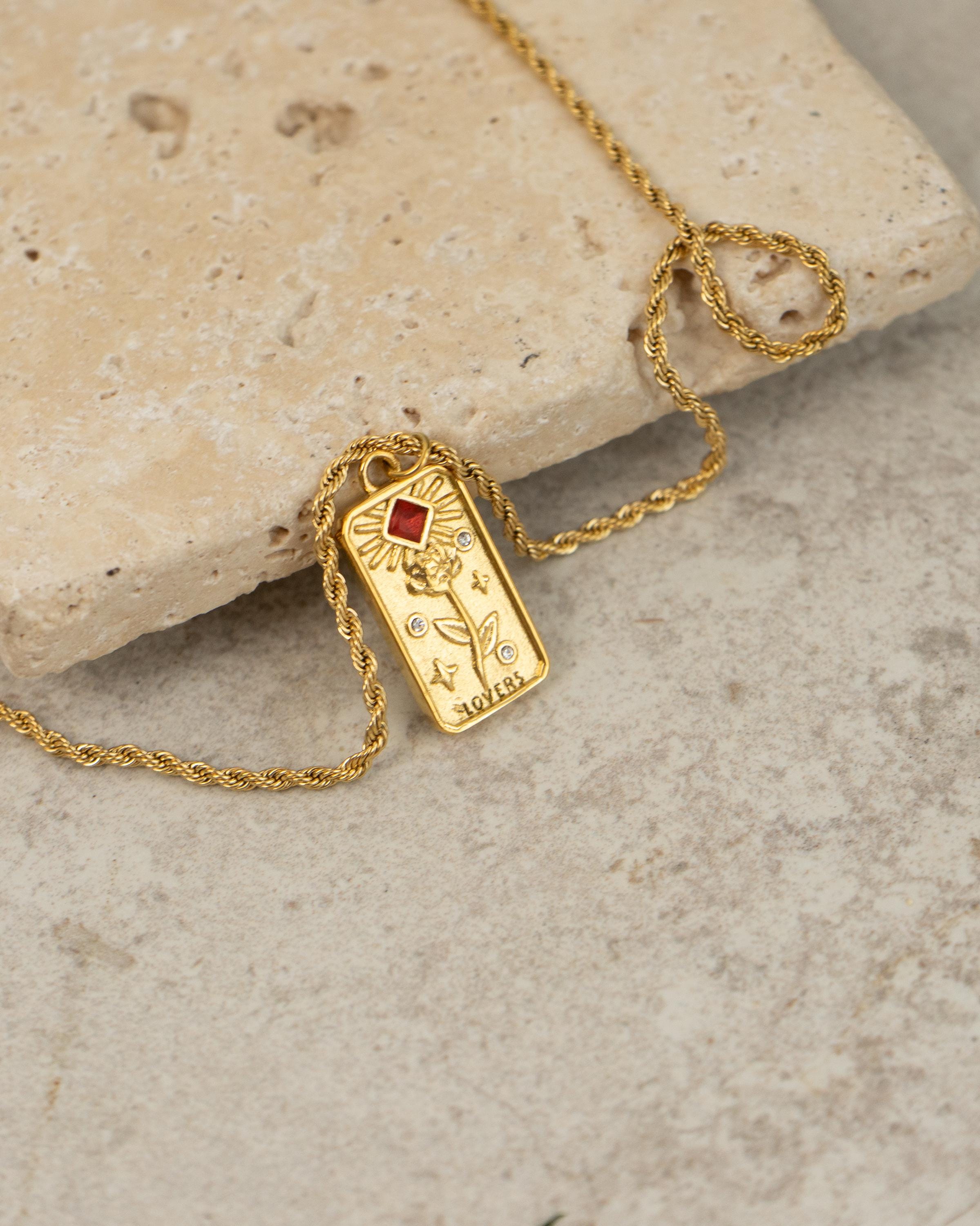 A modern tribute to timeless symbolism. This rectangular tarot card necklace is a bold and meaningful piece that speaks to your personal journey. Crafted in gold-toned stainless steel and set with sparkling zircon stones, it features intricate engravings inspired by the Major Arcana: