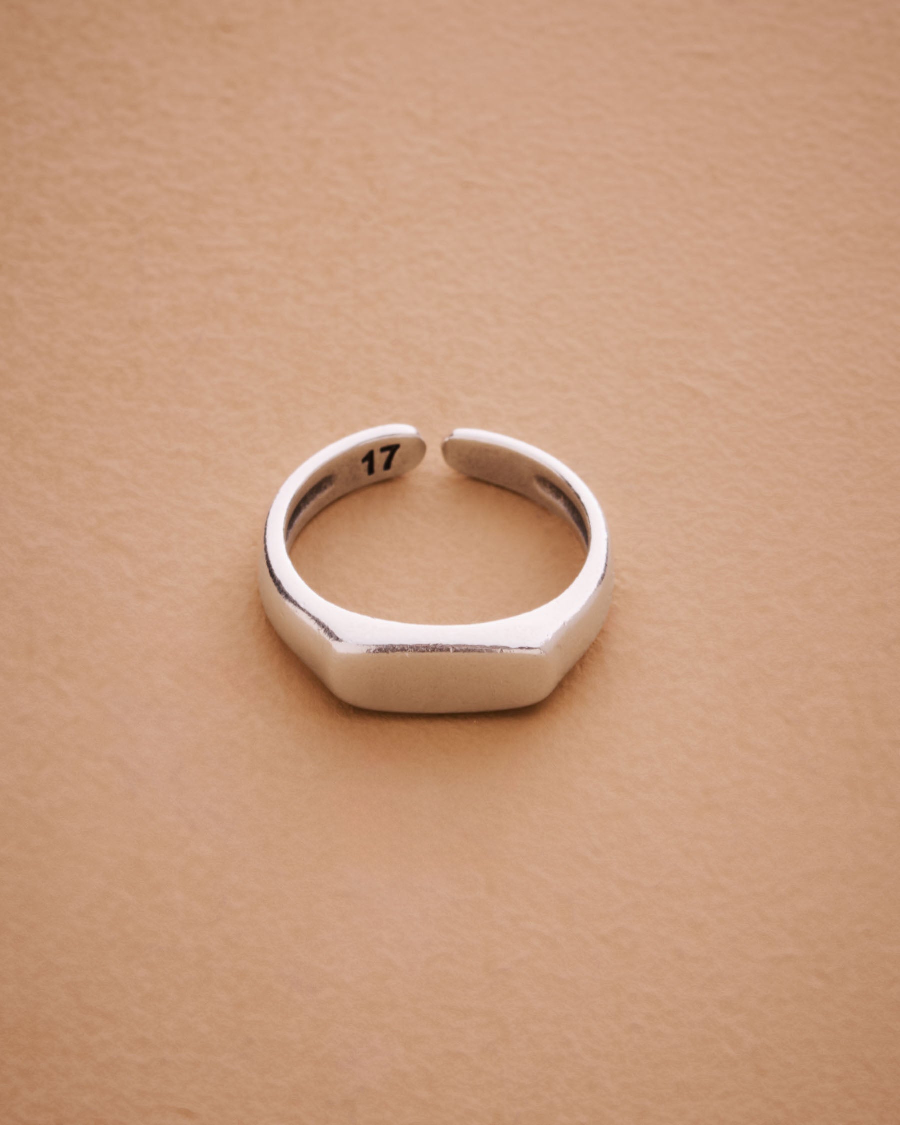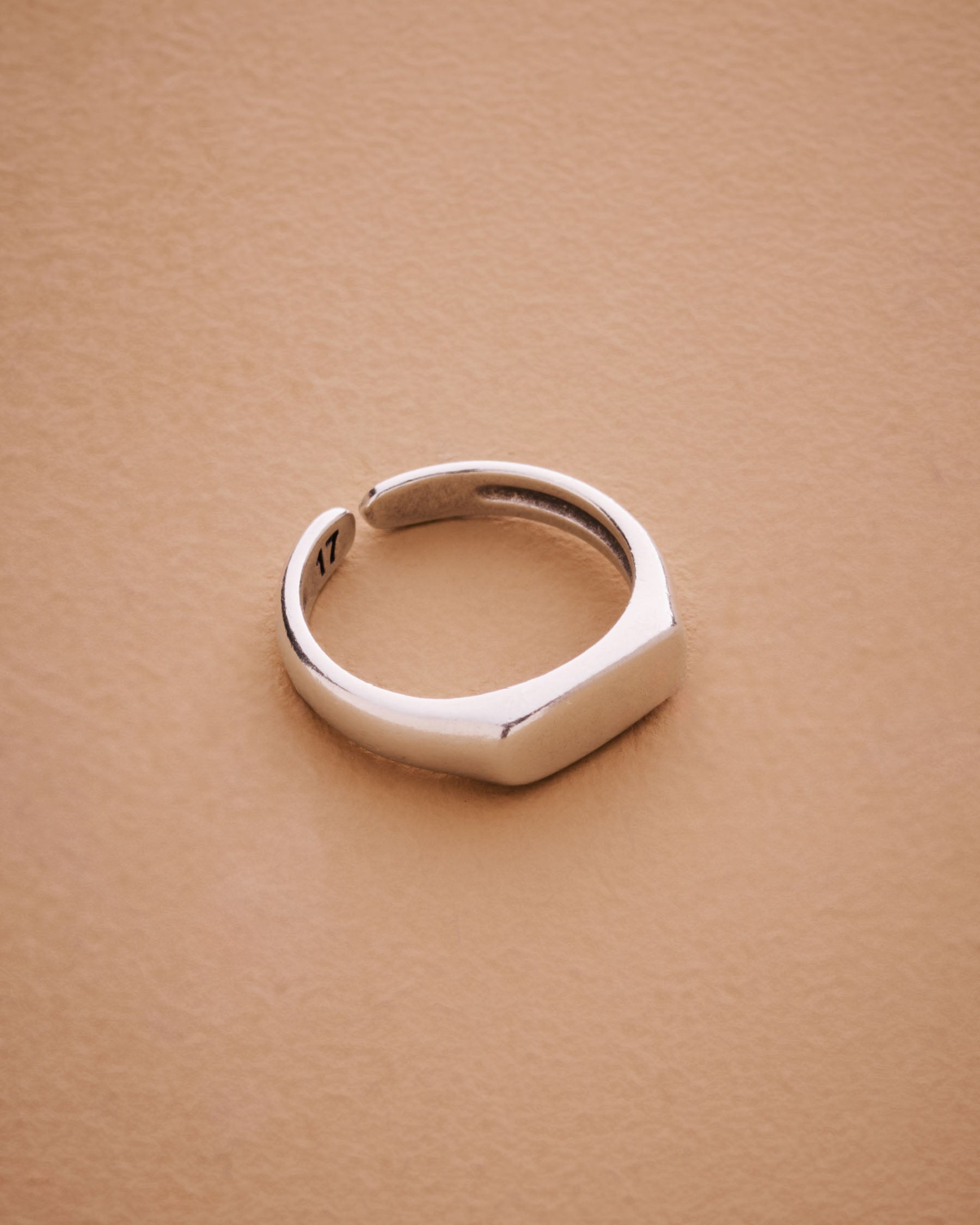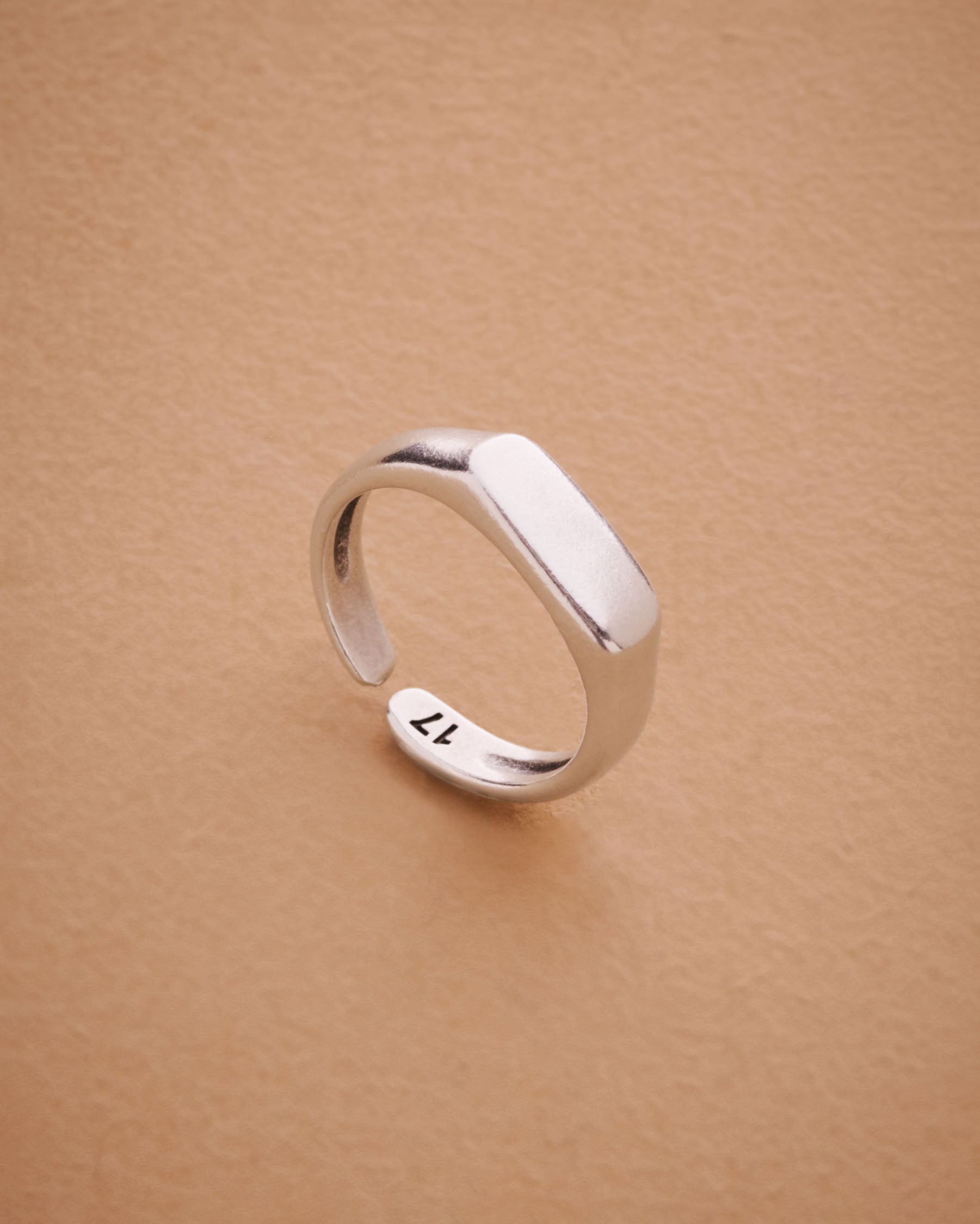 Introducing an antique silver rectangular signet band ring, a versatile statement piece that complements any jewelry collection. This exquisite ring can be styled for a sophisticated look by stacking it with other rings, including our round signet ring. Its design allows it to be worn comfortably on the index, middle, thumb, or ring finger, making it a wonderful addition to your existing accessories.