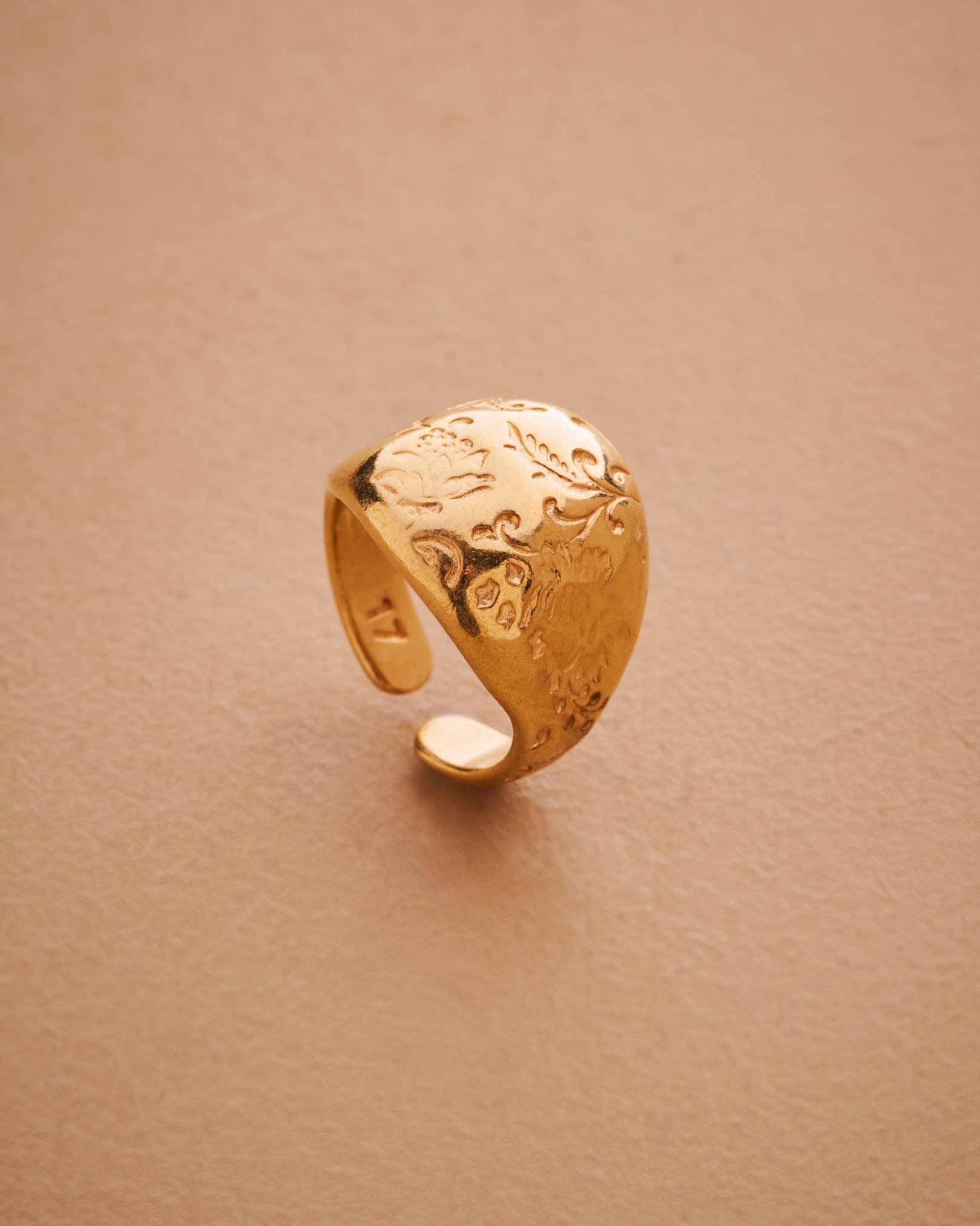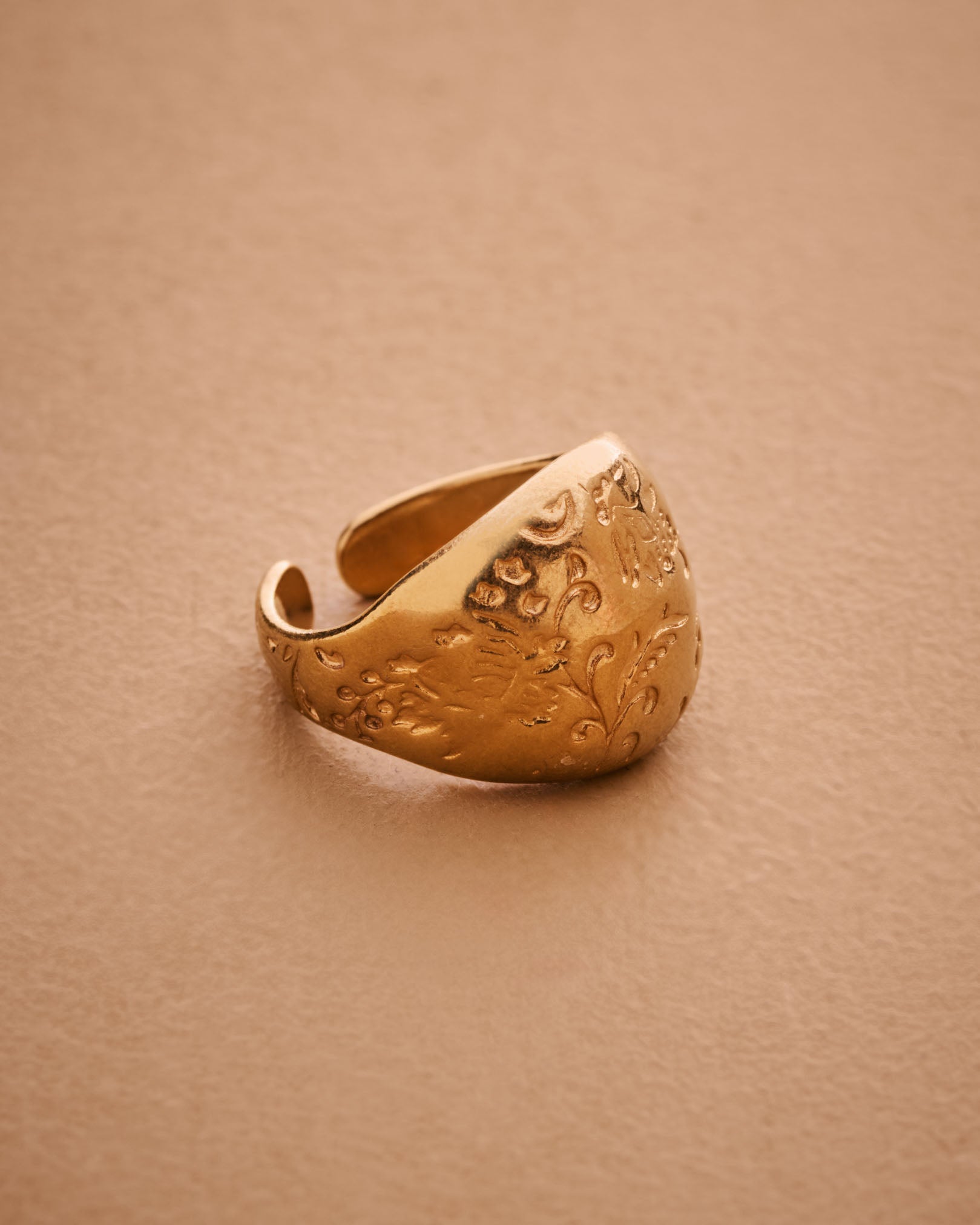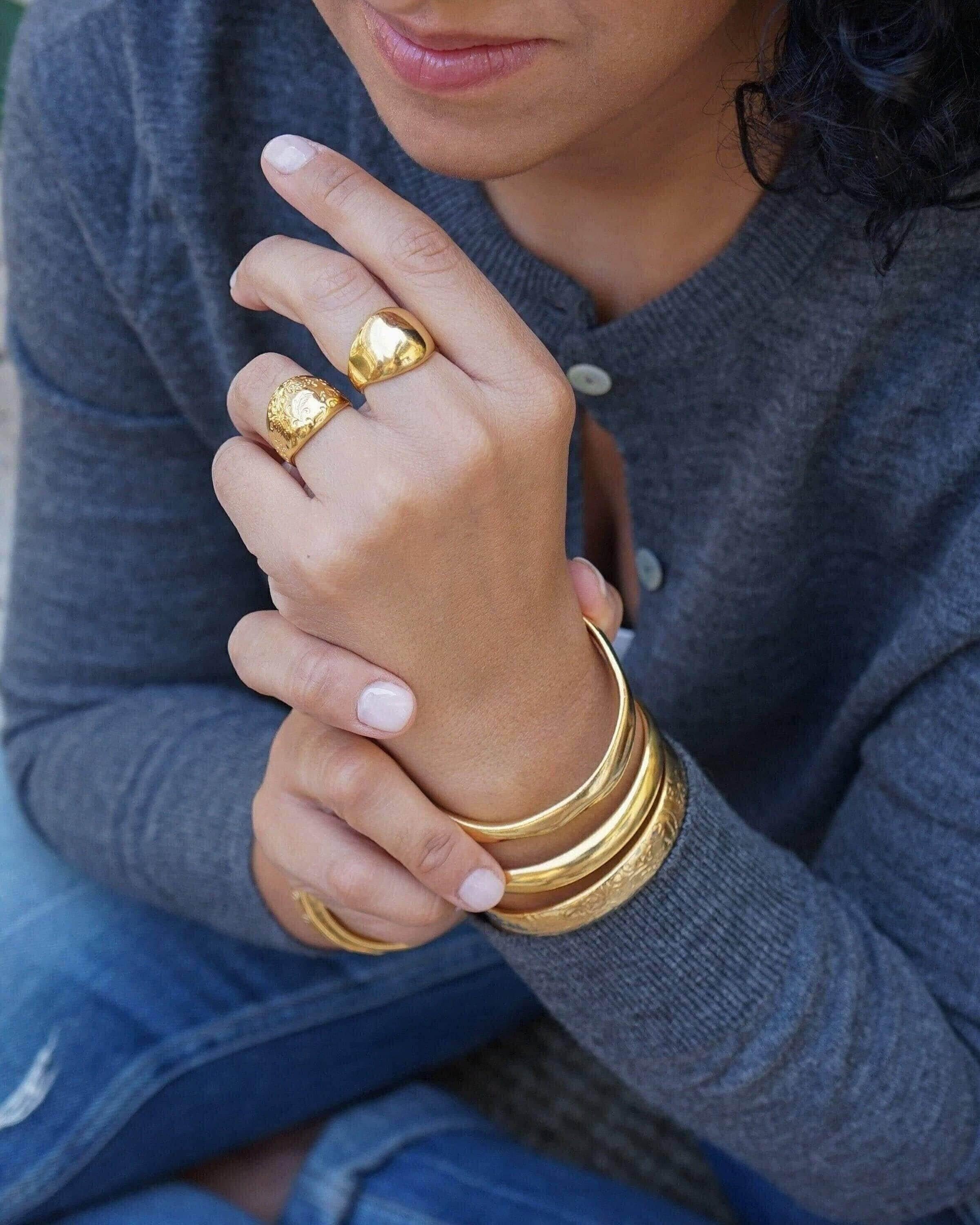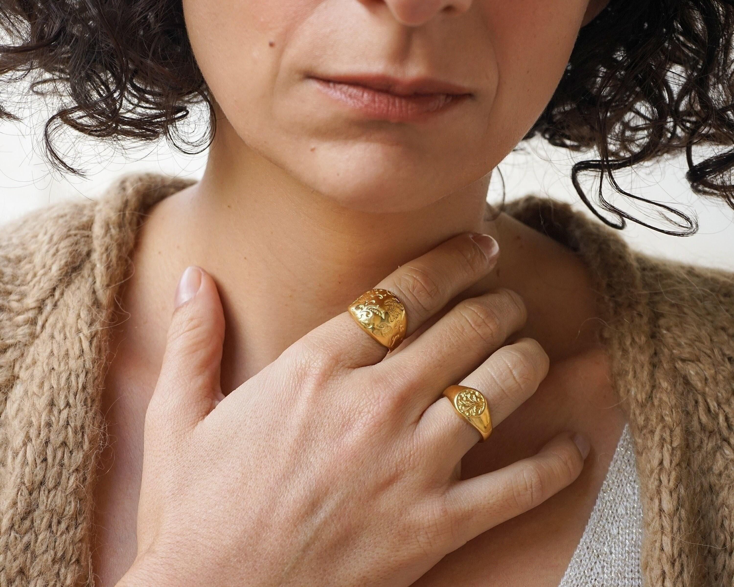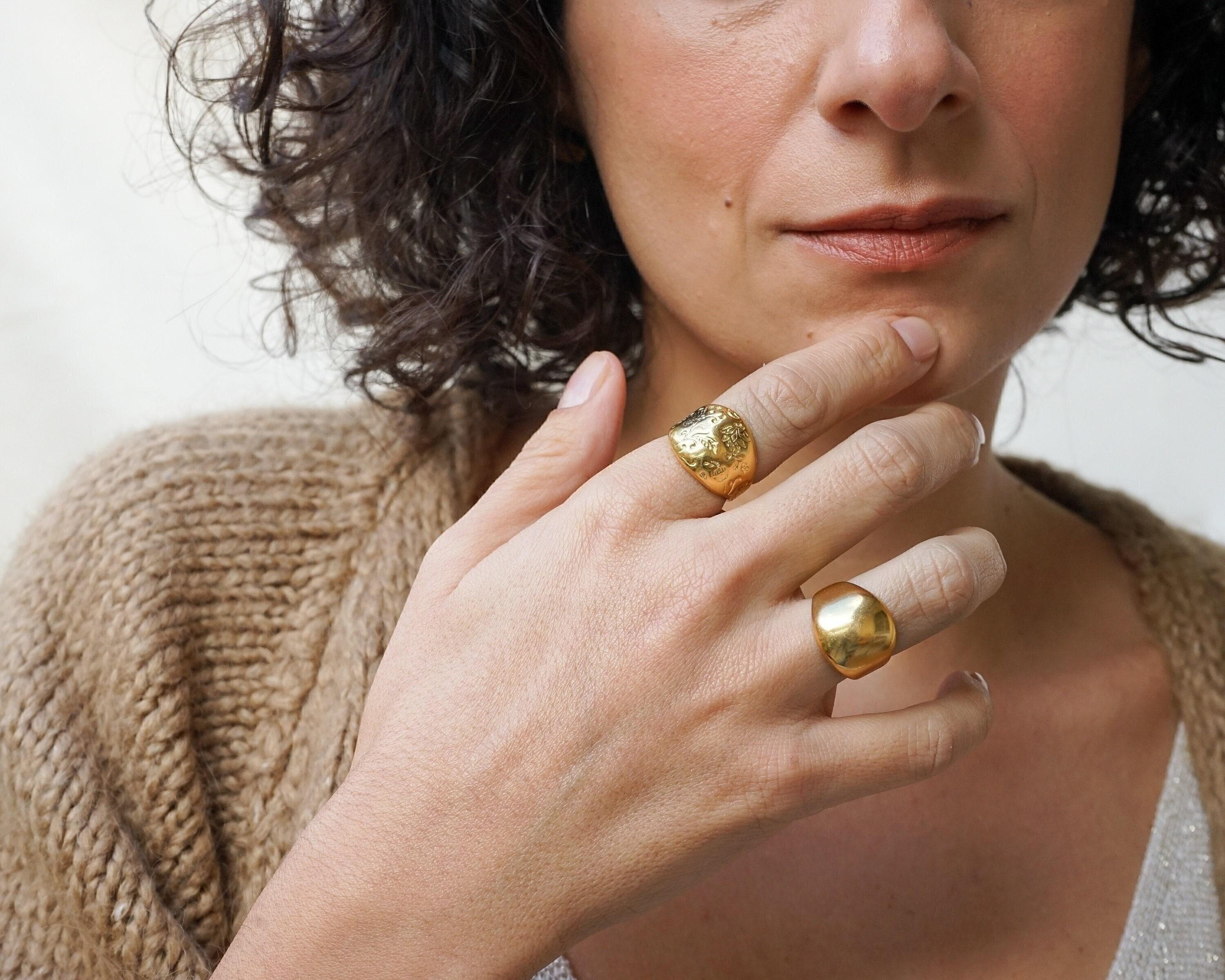 Discover our exquisite 24k gold plated dome ring, featuring two distinct designs: bold and floral. This unique and dainty piece can be elegantly worn on its own or stacked with other rings, making it perfect for those who enjoy layering their jewelry. Its unconventional, irregular shape serves as a striking statement piece that you’ll cherish for years to come. When paired with our other floral rings, it creates a fashionable ensemble that is ideal for the new season.