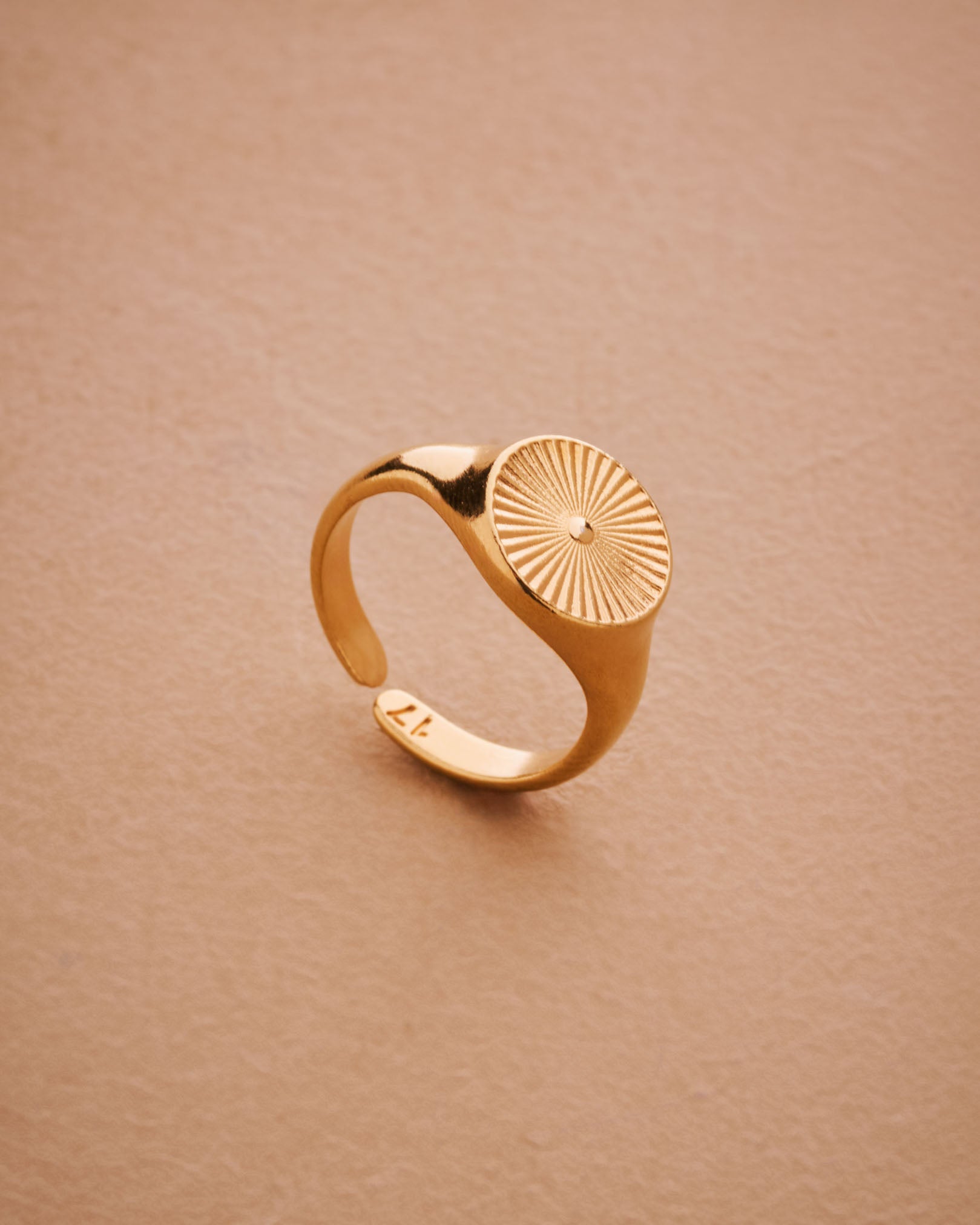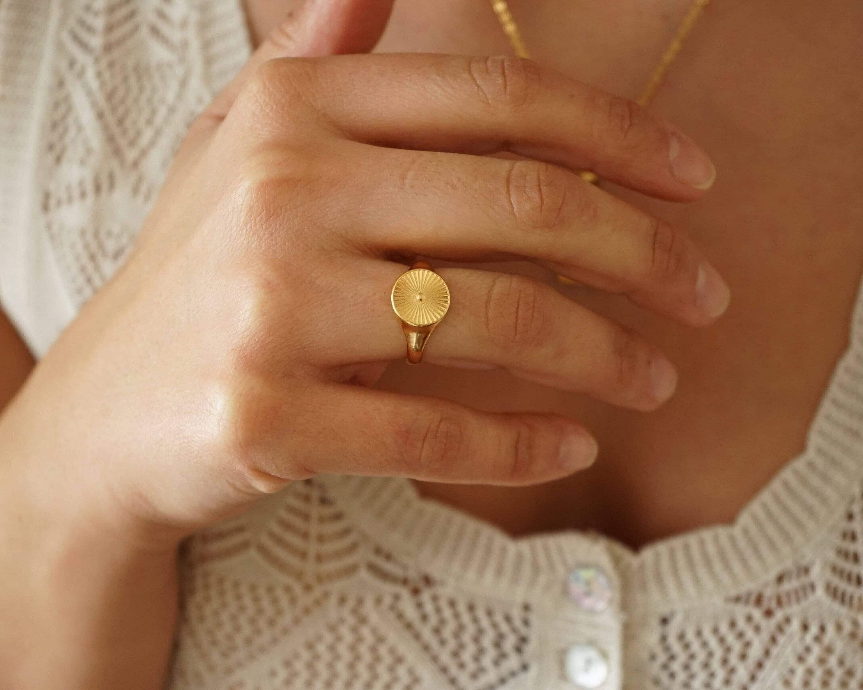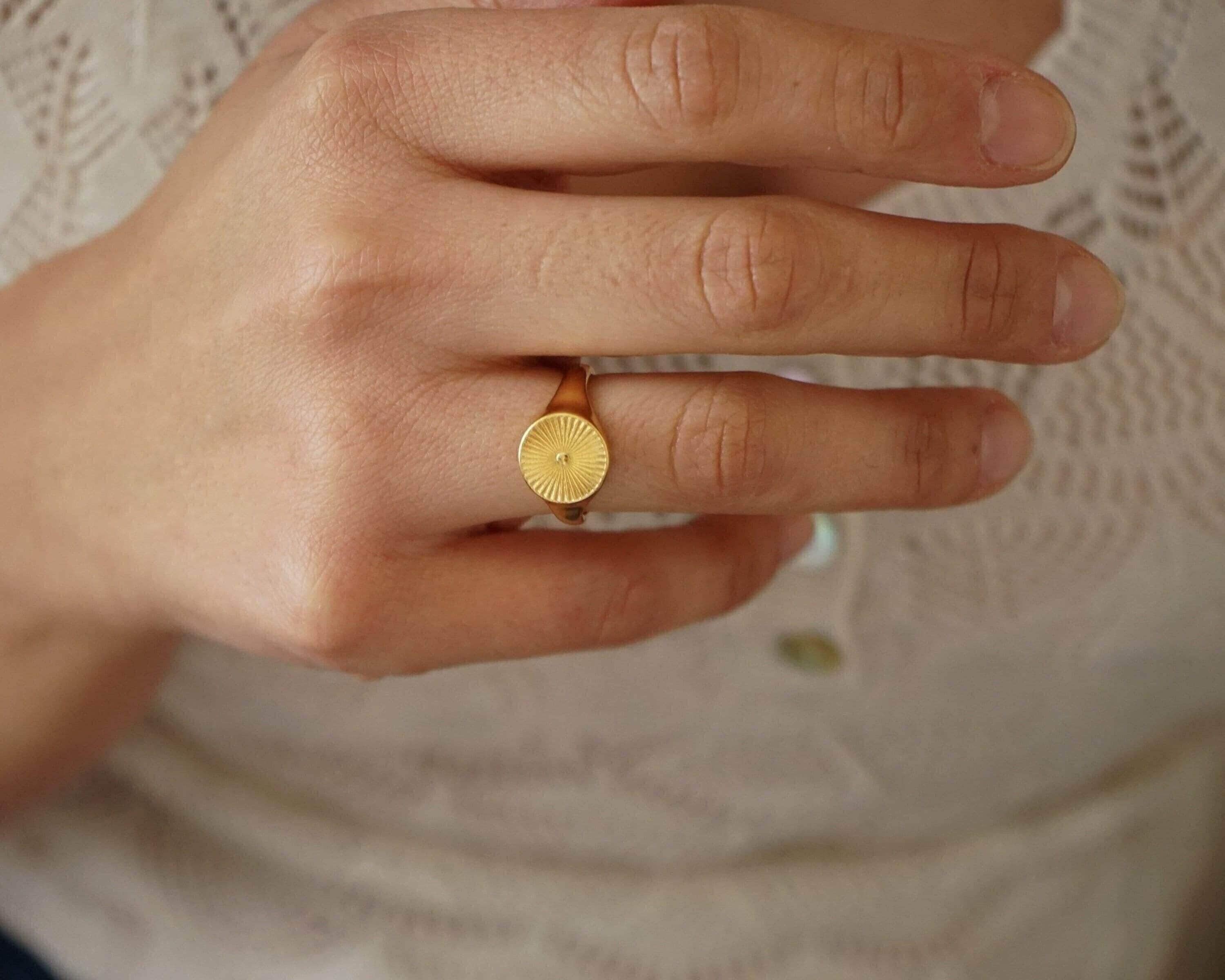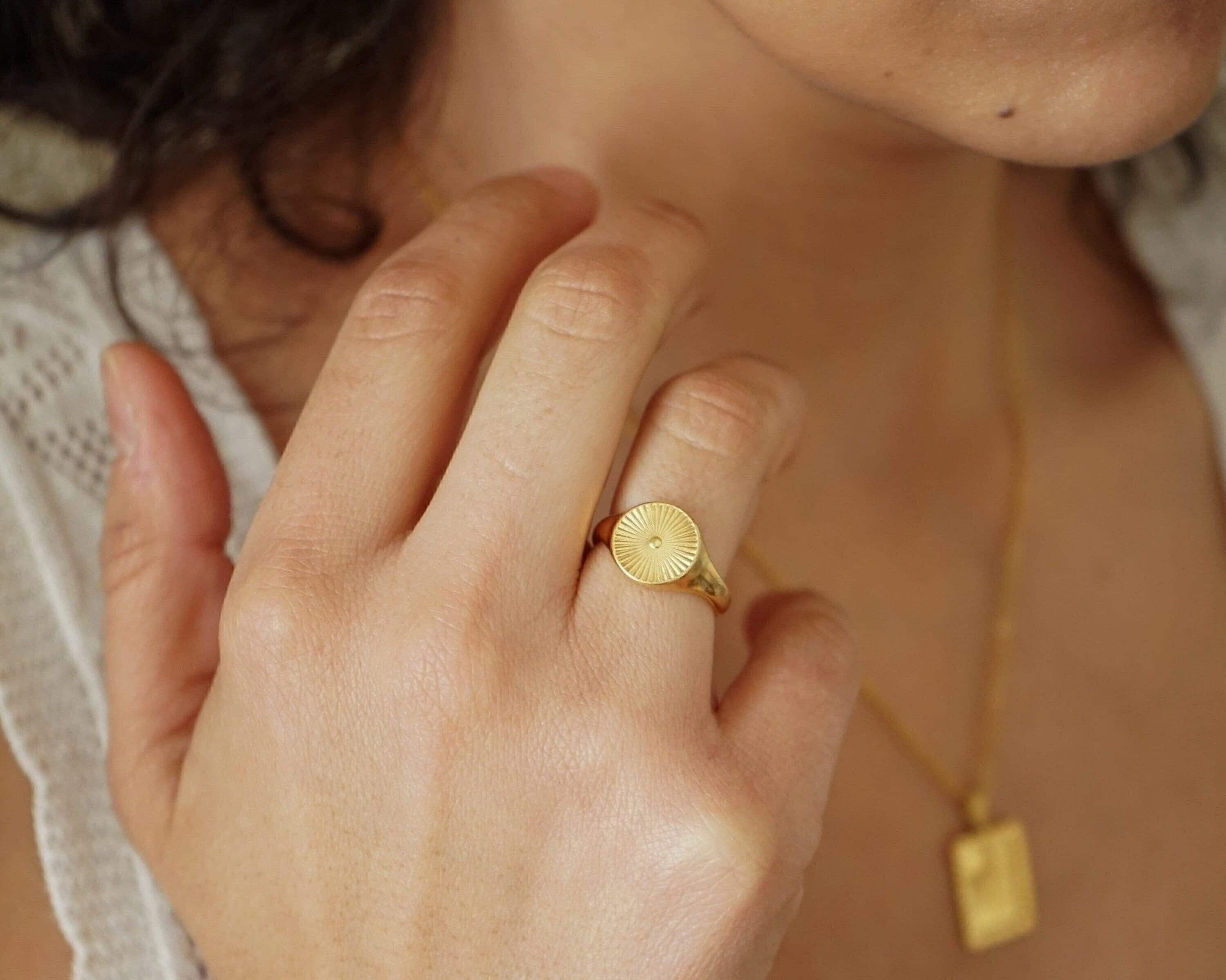 This striking gold plated signet ring features a rounded band adorned with beautifully engraved sun rays, making it a versatile addition to any jewelry collection. Its unique design allows it to be worn comfortably on the index, middle, thumb, or ring finger, seamlessly complementing your existing rings.