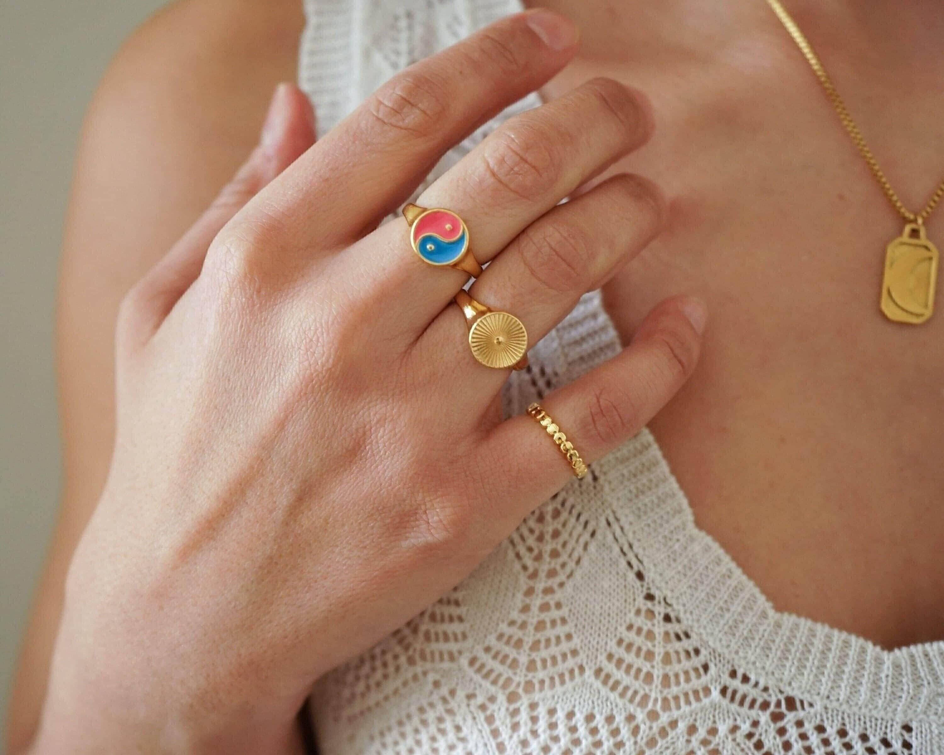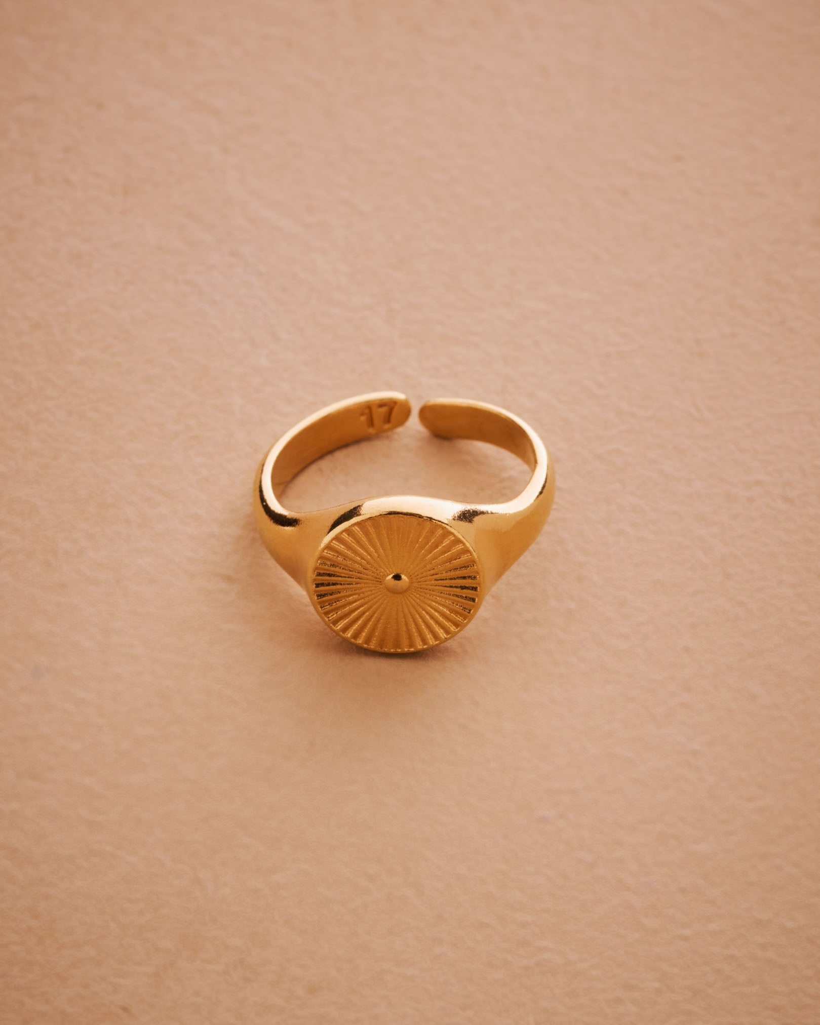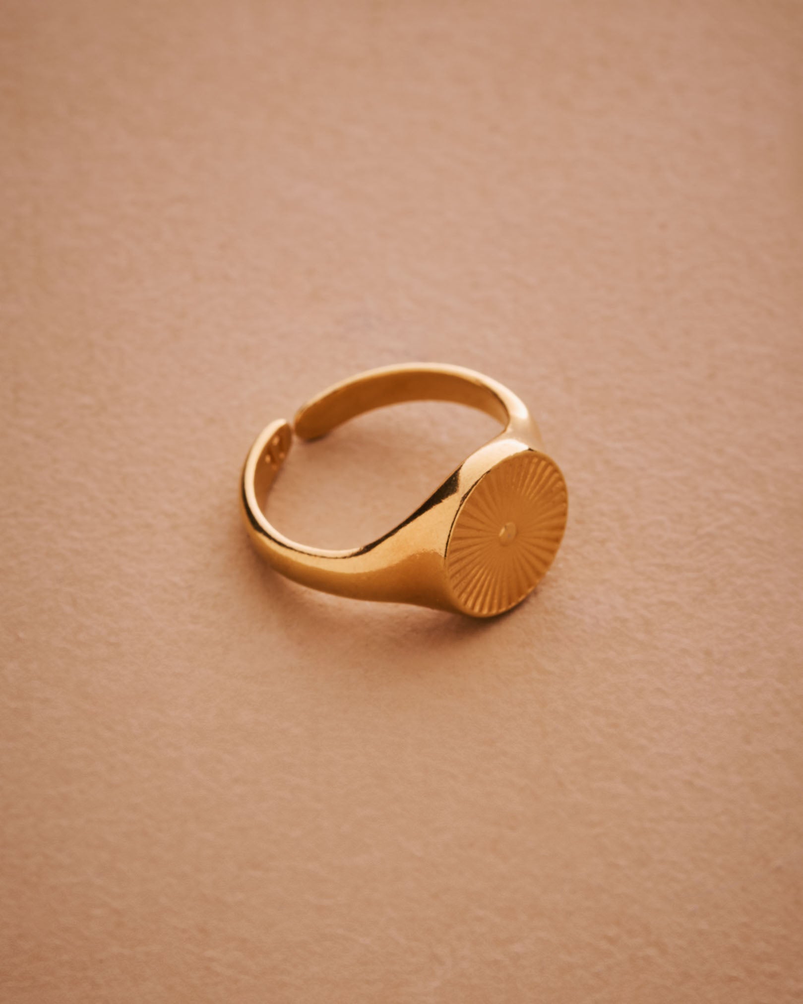This striking gold plated signet ring features a rounded band adorned with beautifully engraved sun rays, making it a versatile addition to any jewelry collection. Its unique design allows it to be worn comfortably on the index, middle, thumb, or ring finger, seamlessly complementing your existing rings.