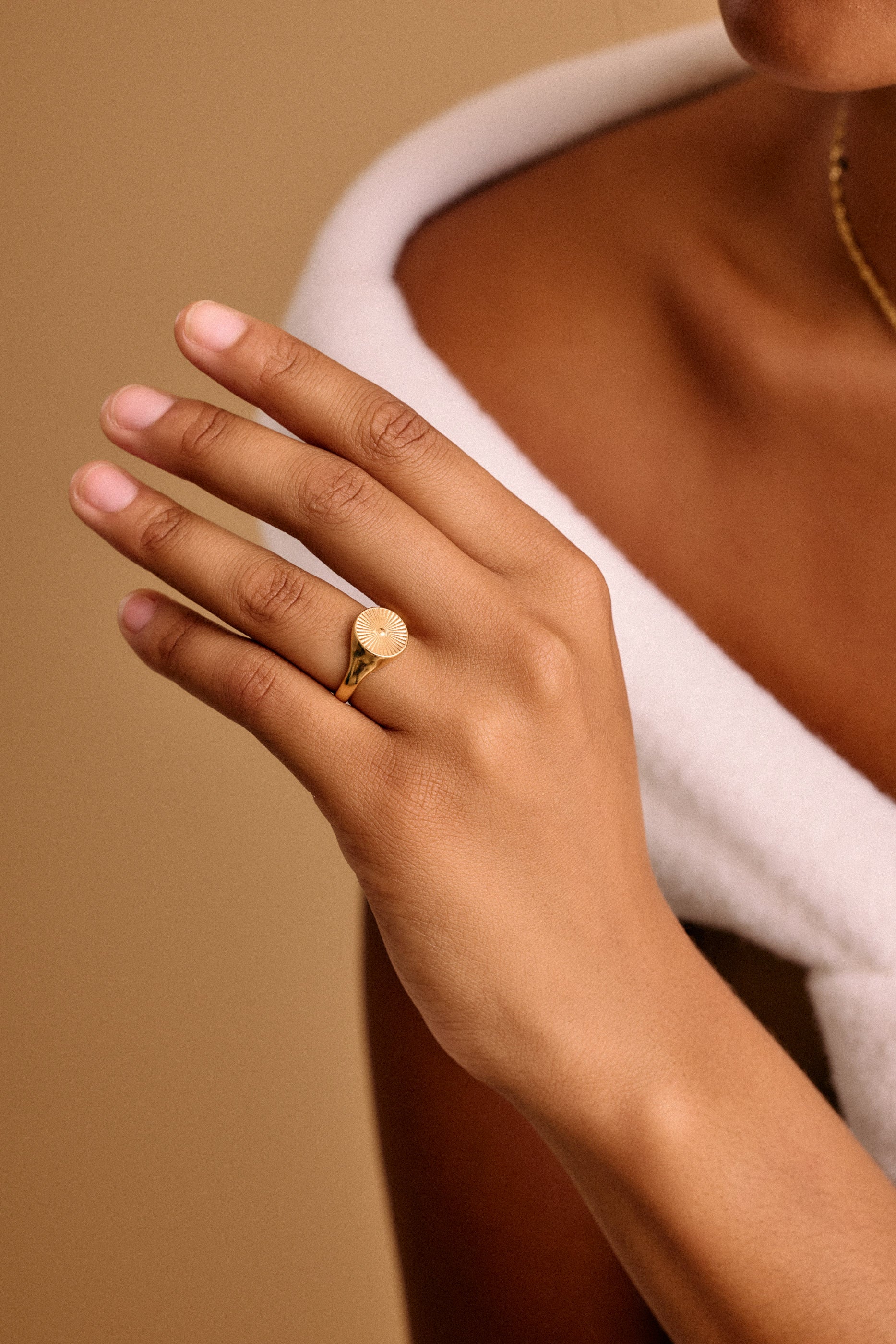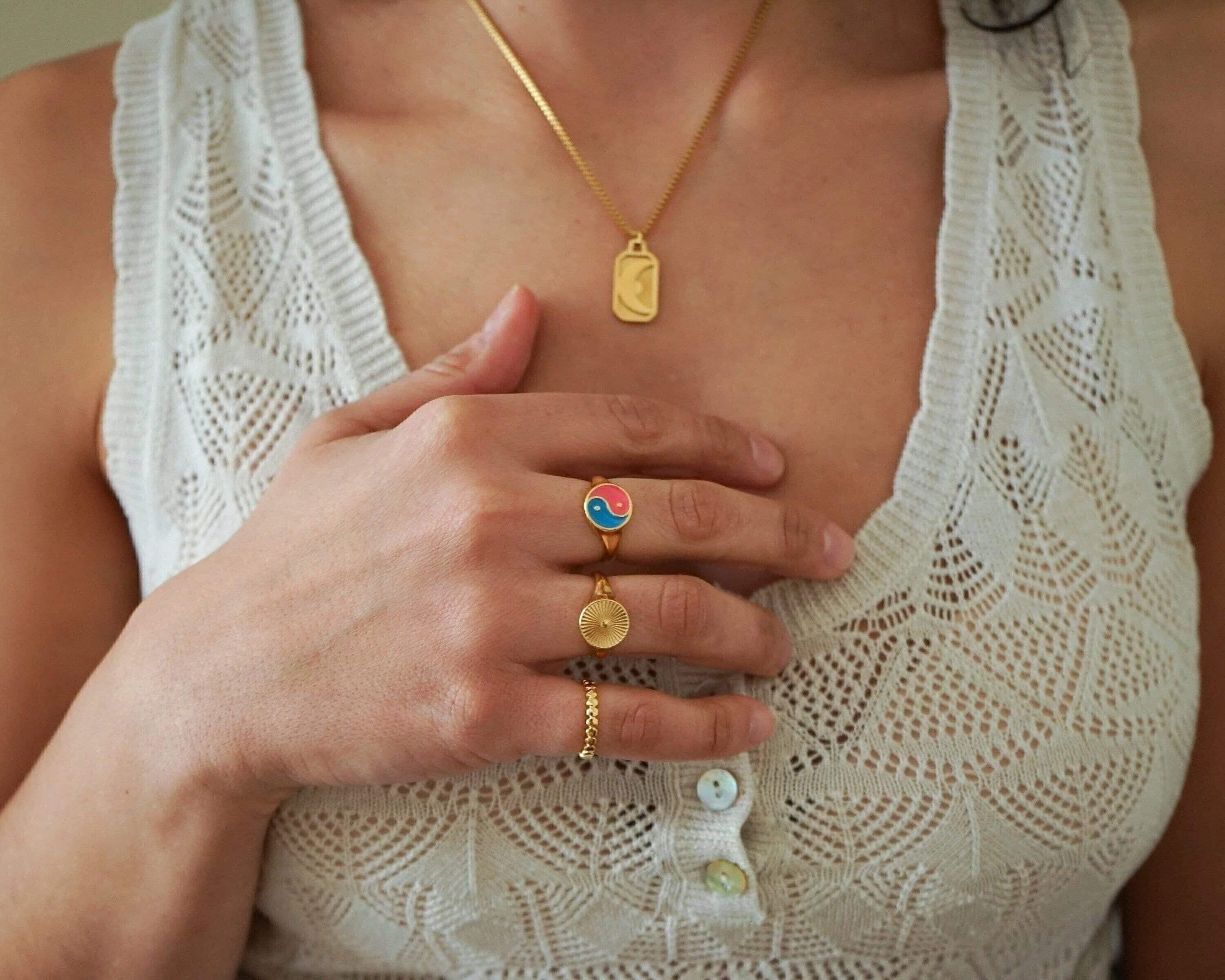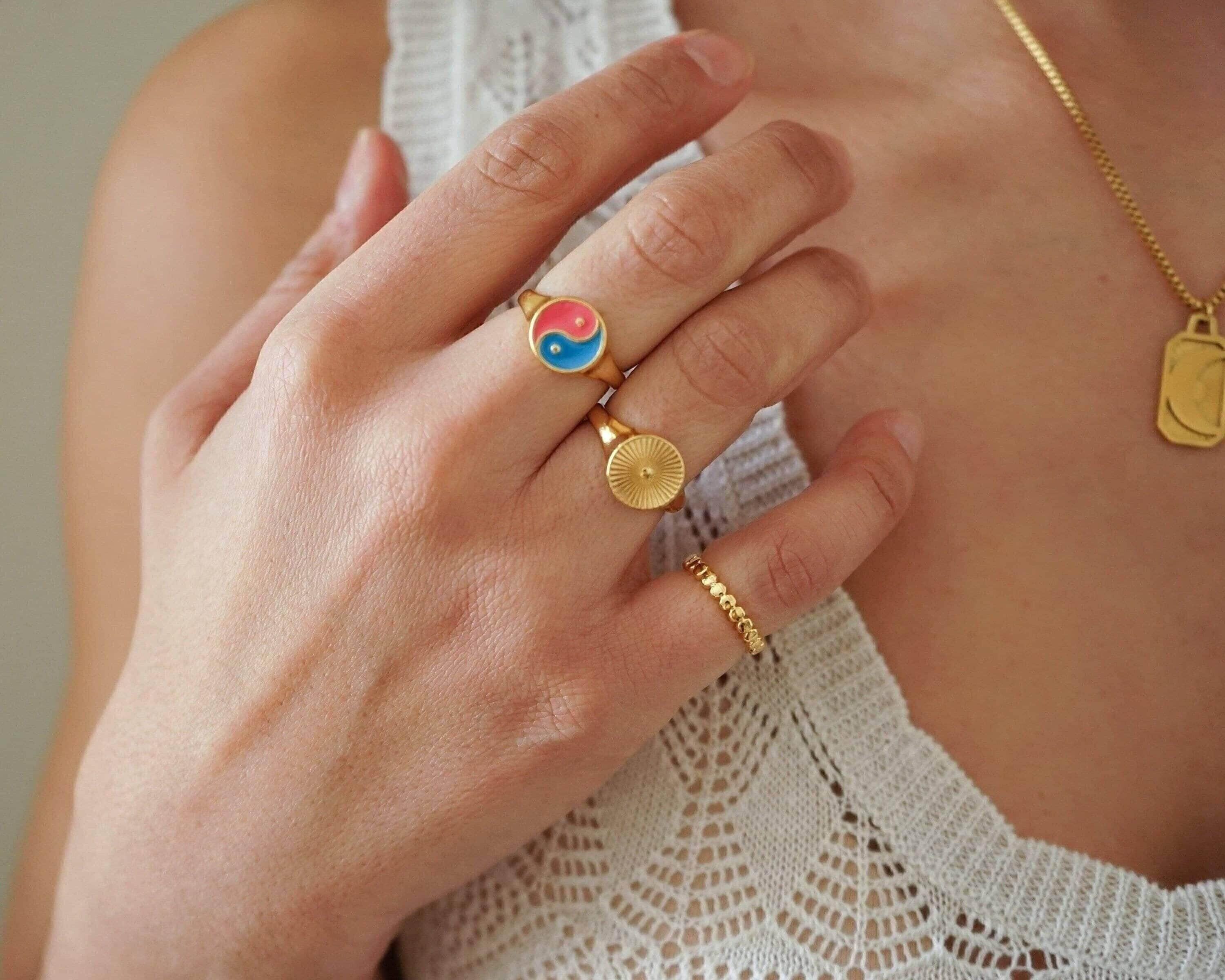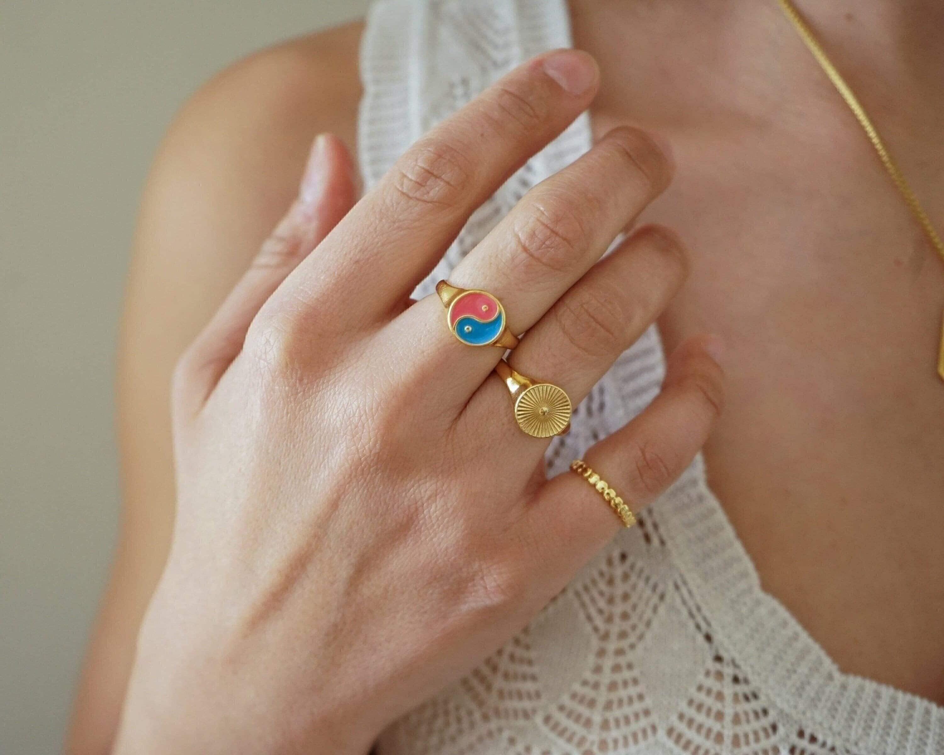 This striking gold plated signet ring features a rounded band adorned with beautifully engraved sun rays, making it a versatile addition to any jewelry collection. Its unique design allows it to be worn comfortably on the index, middle, thumb, or ring finger, seamlessly complementing your existing rings.