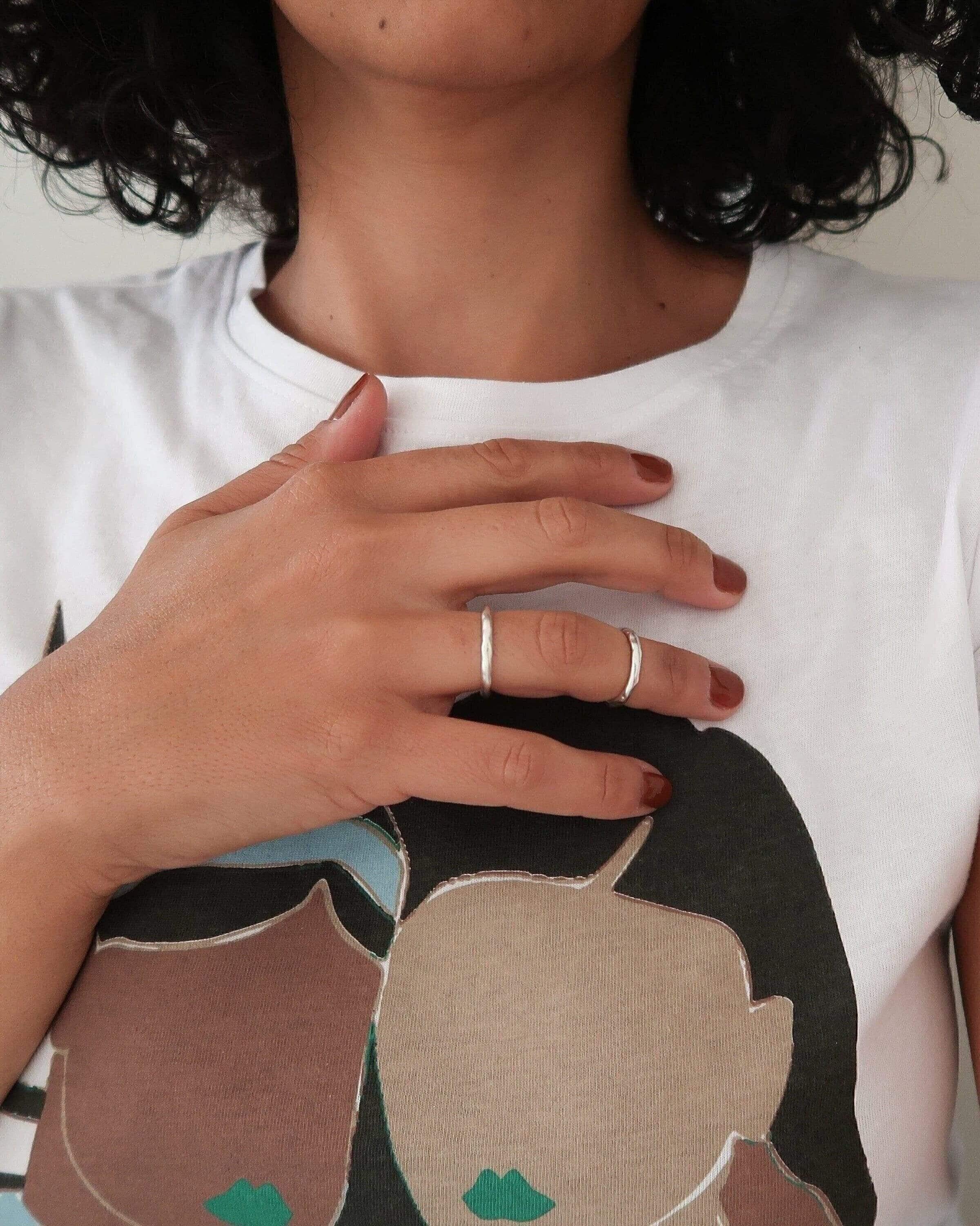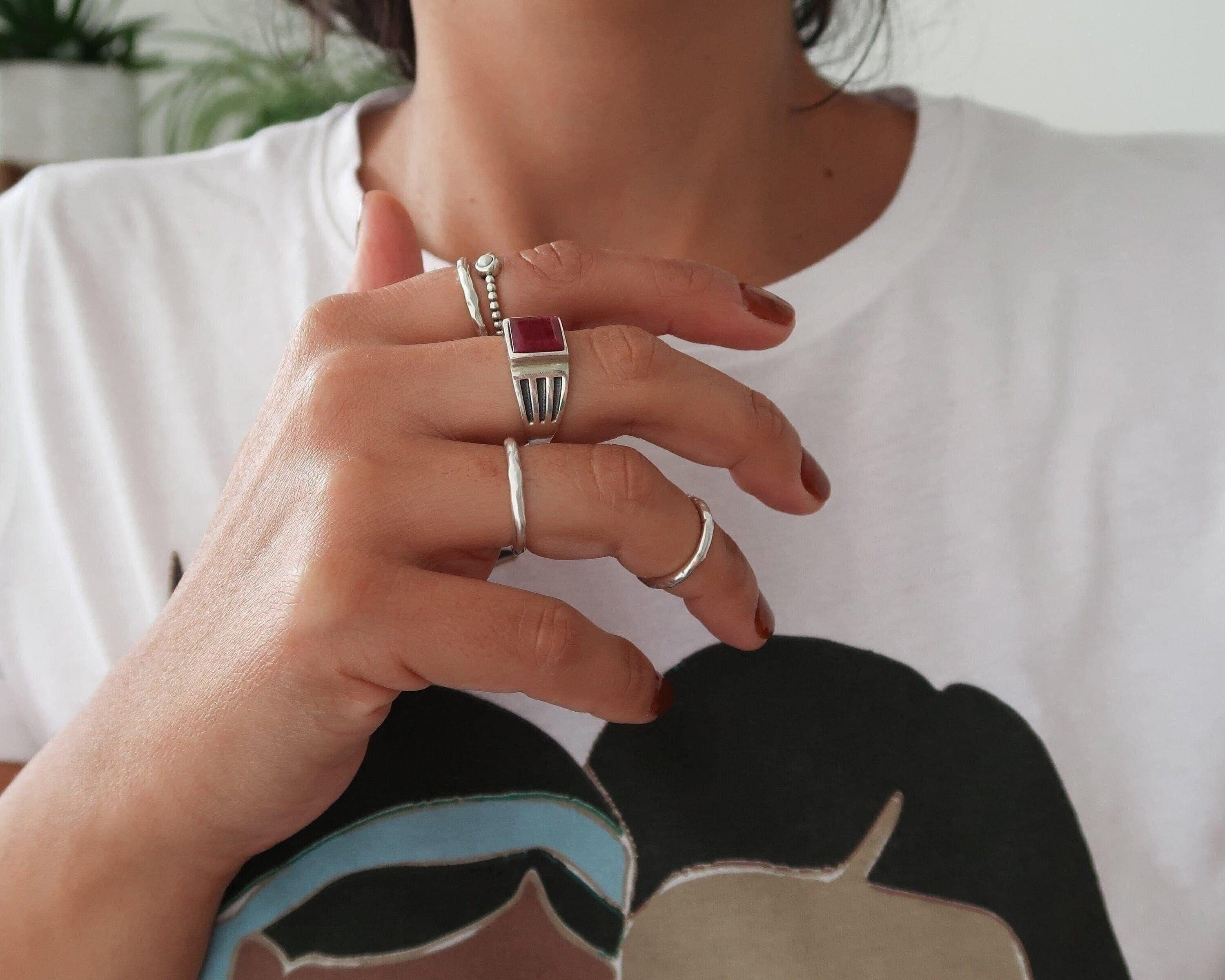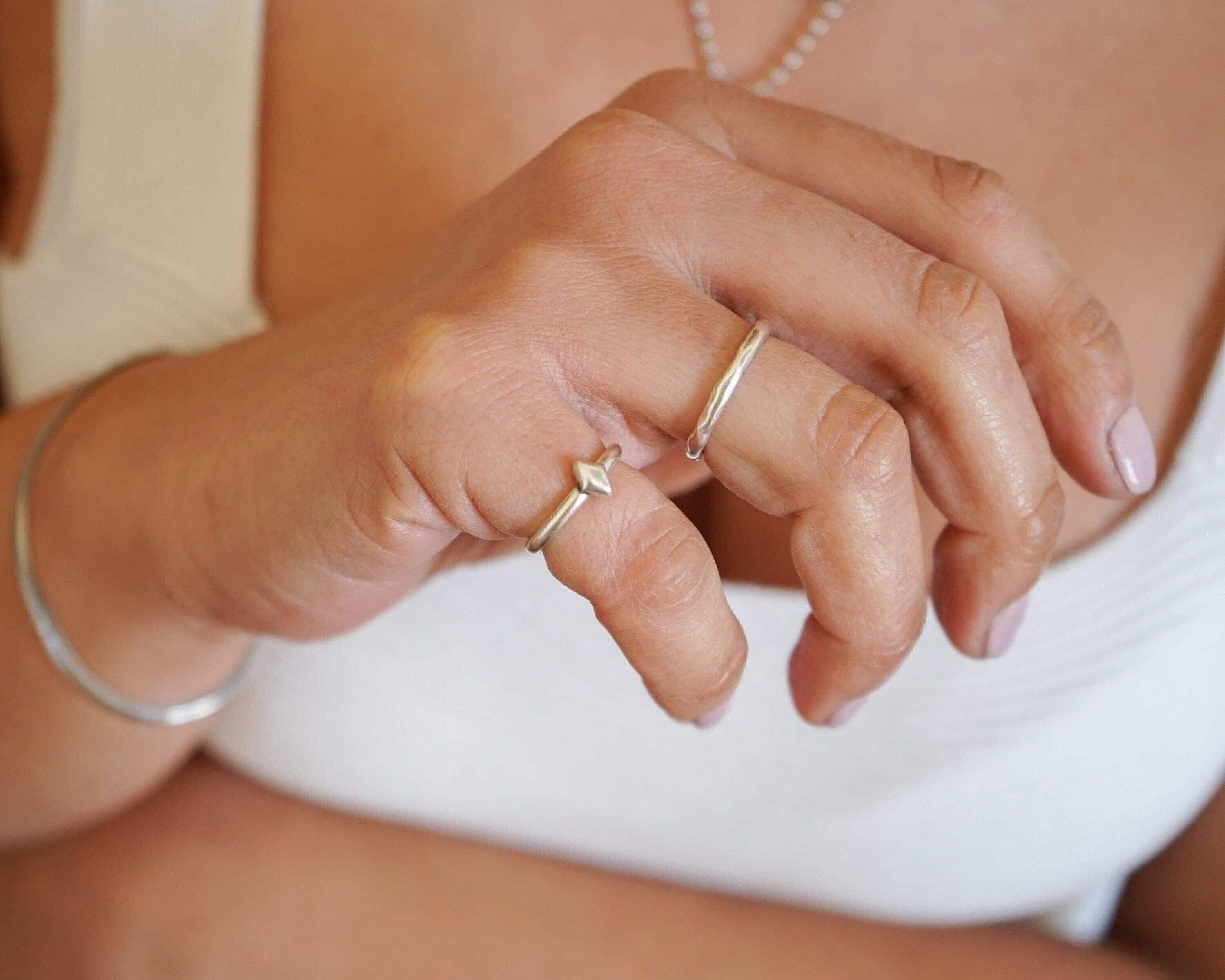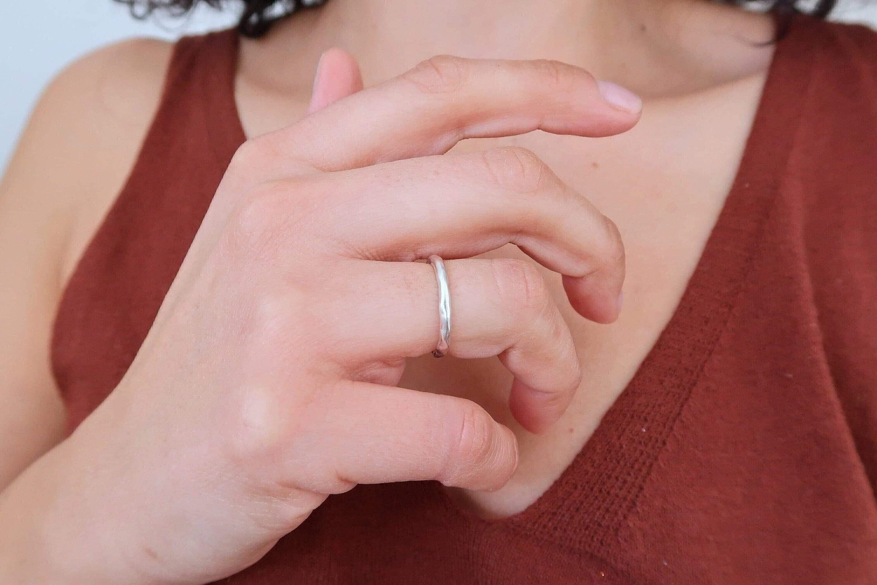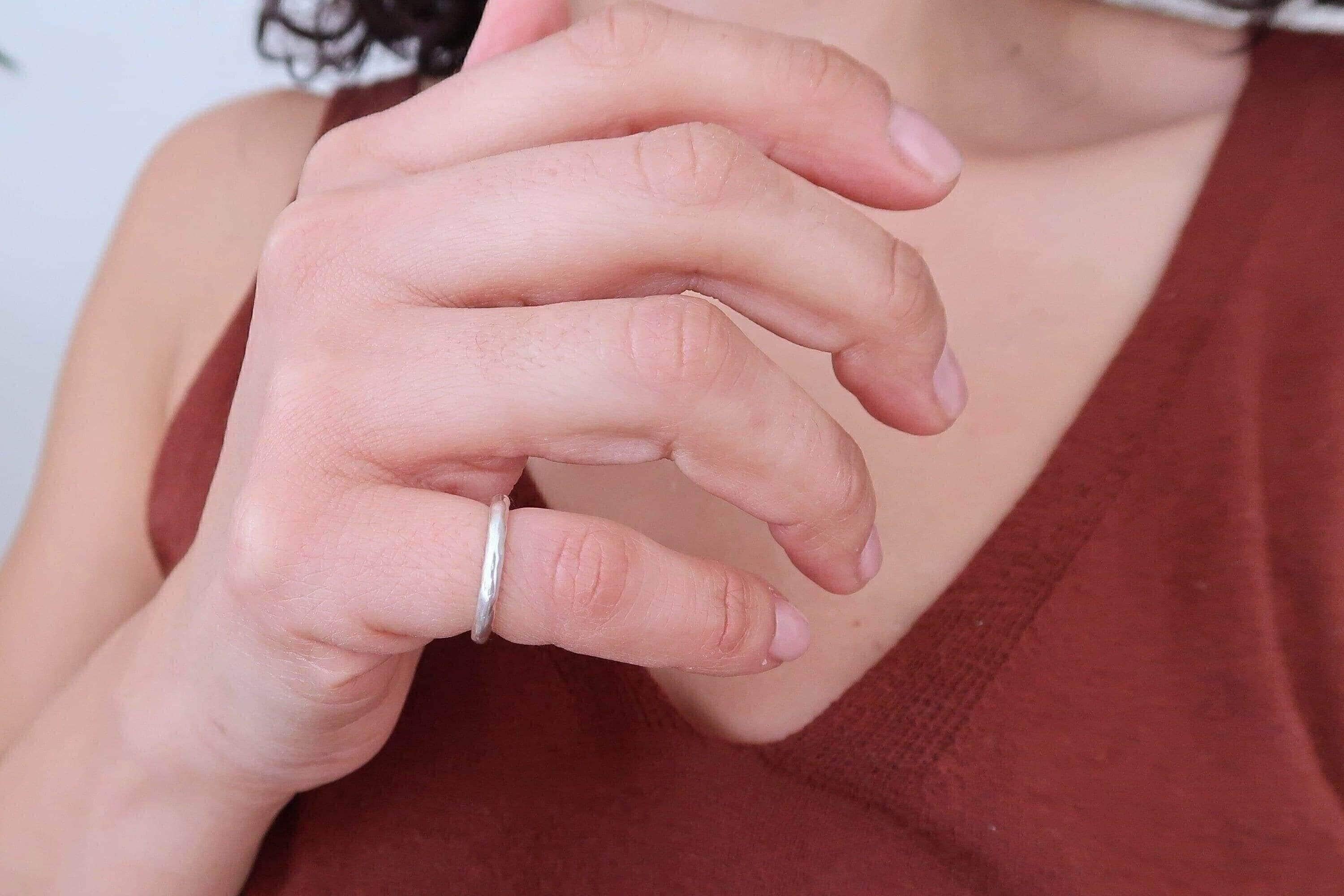 This silver thin hammered band ring is a versatile accessory available in two fixed sizes, making it suitable for various styles and occasions. The ring can be worn as a pinky ring or a standard finger ring, offering flexibility in your jewelry collection.