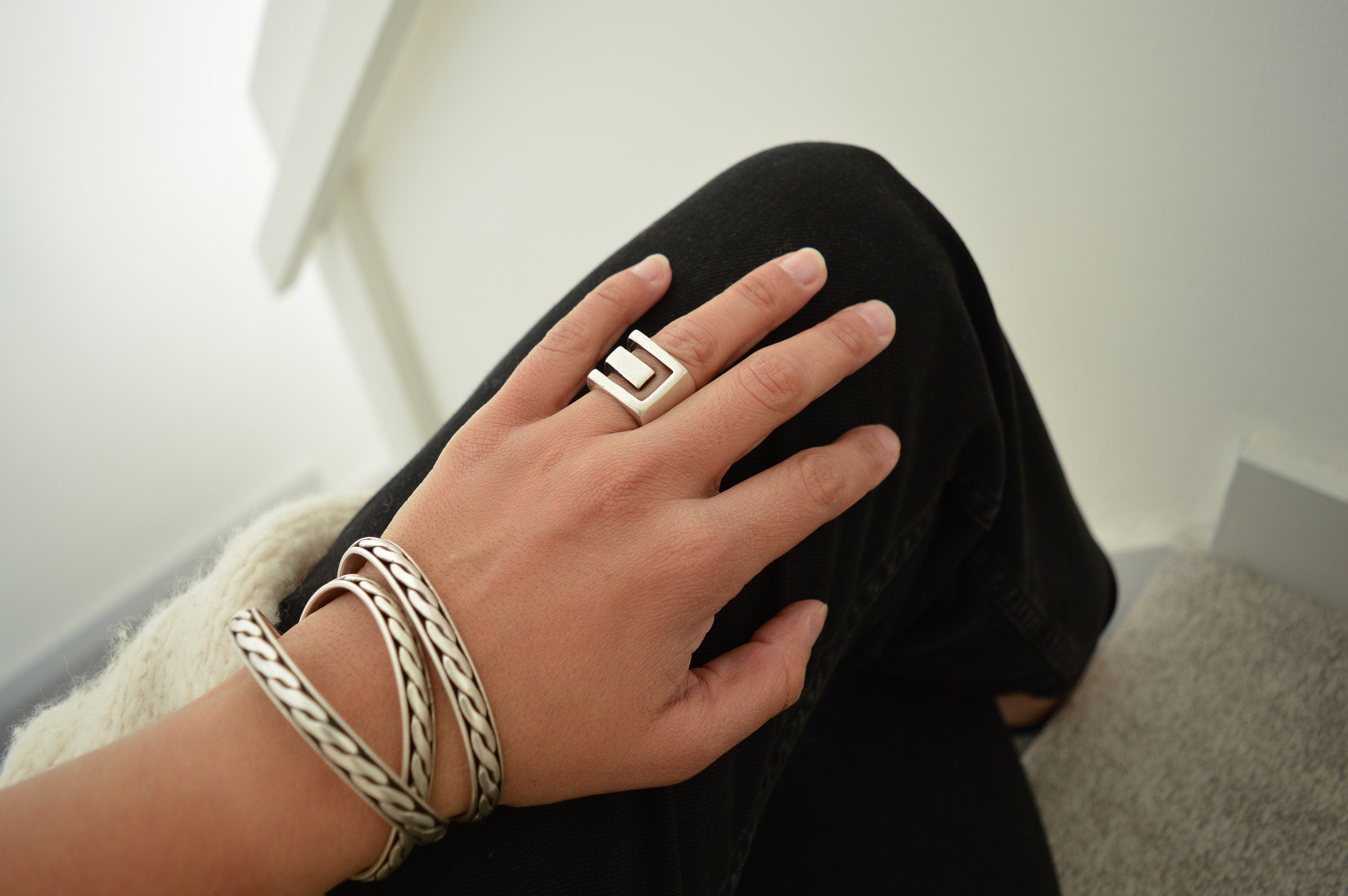 The geometric pattern of this handmade ring adds a sophisticated touch that enhances any outfit, allowing you to express your personality and sense of style effortlessly. Its unique design is perfect for wearing alone for a minimalist look or stacking with other rings for a more dynamic statement.