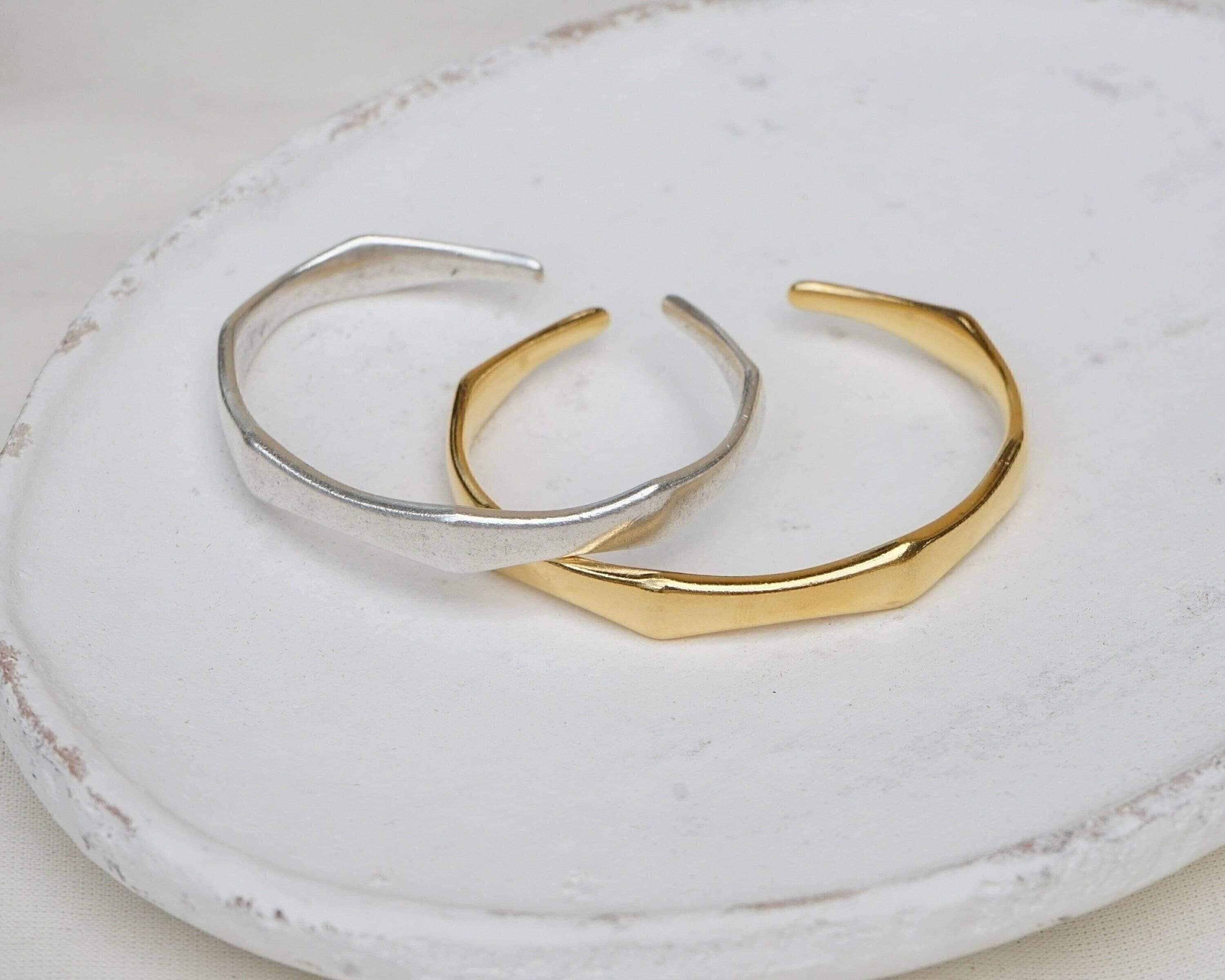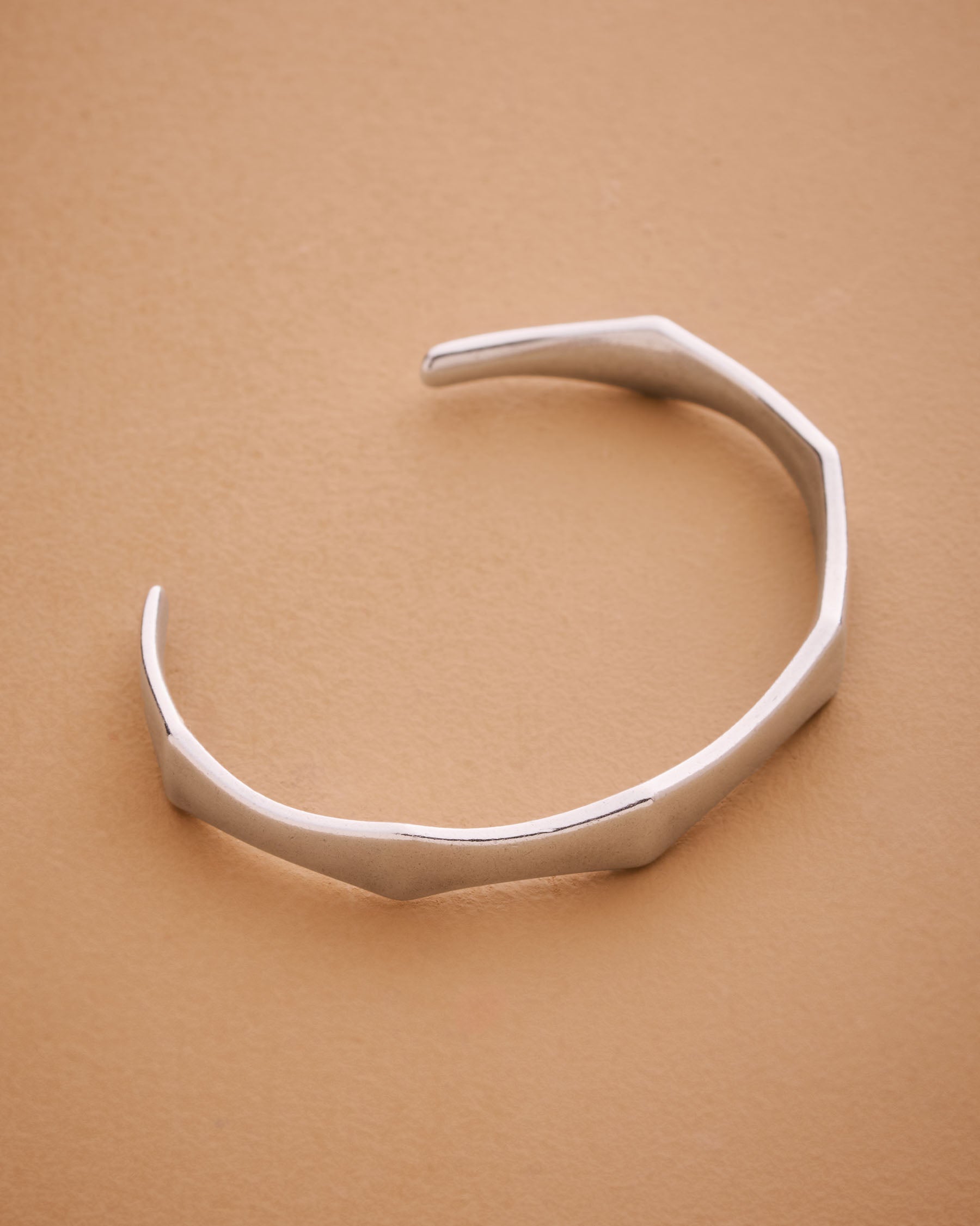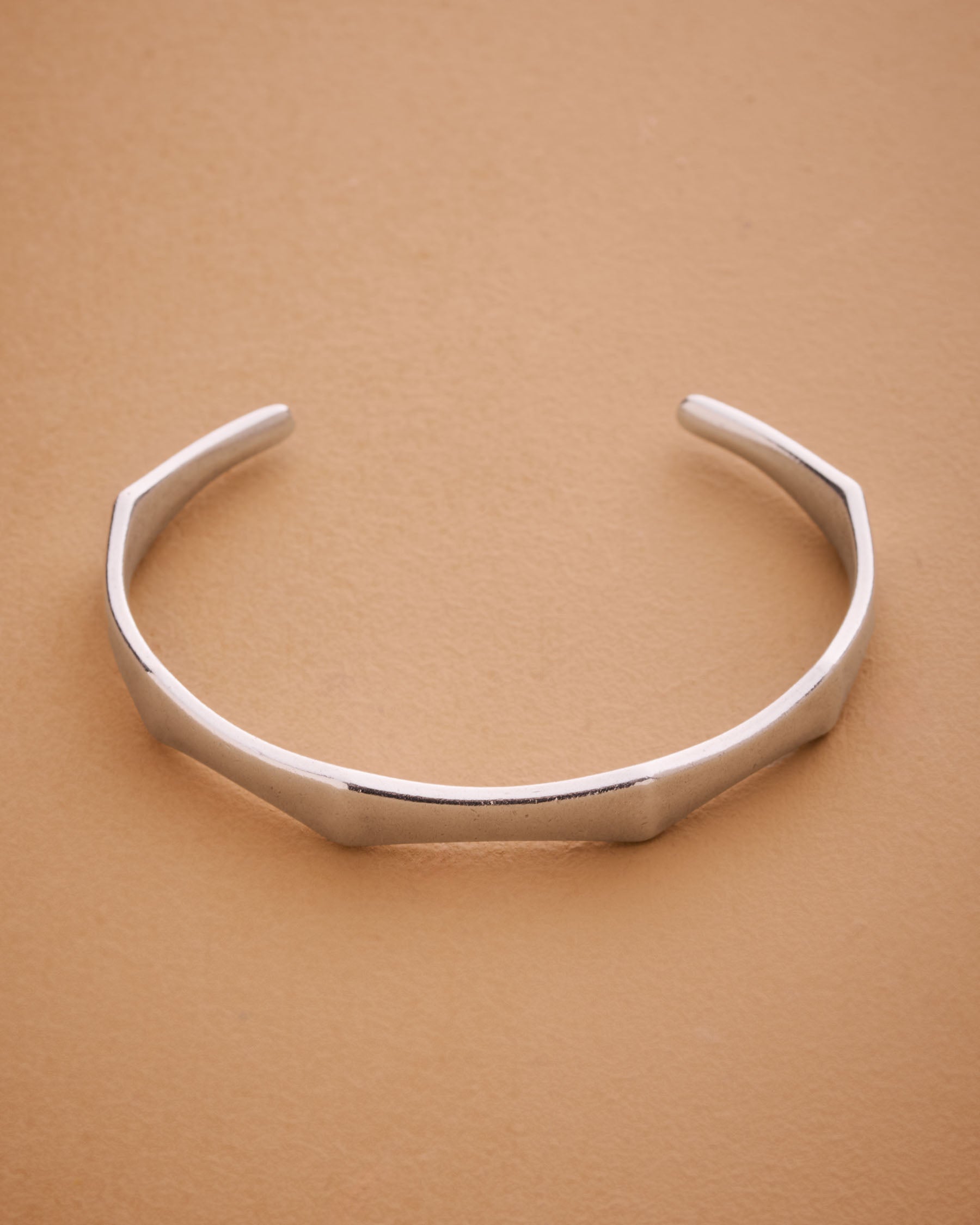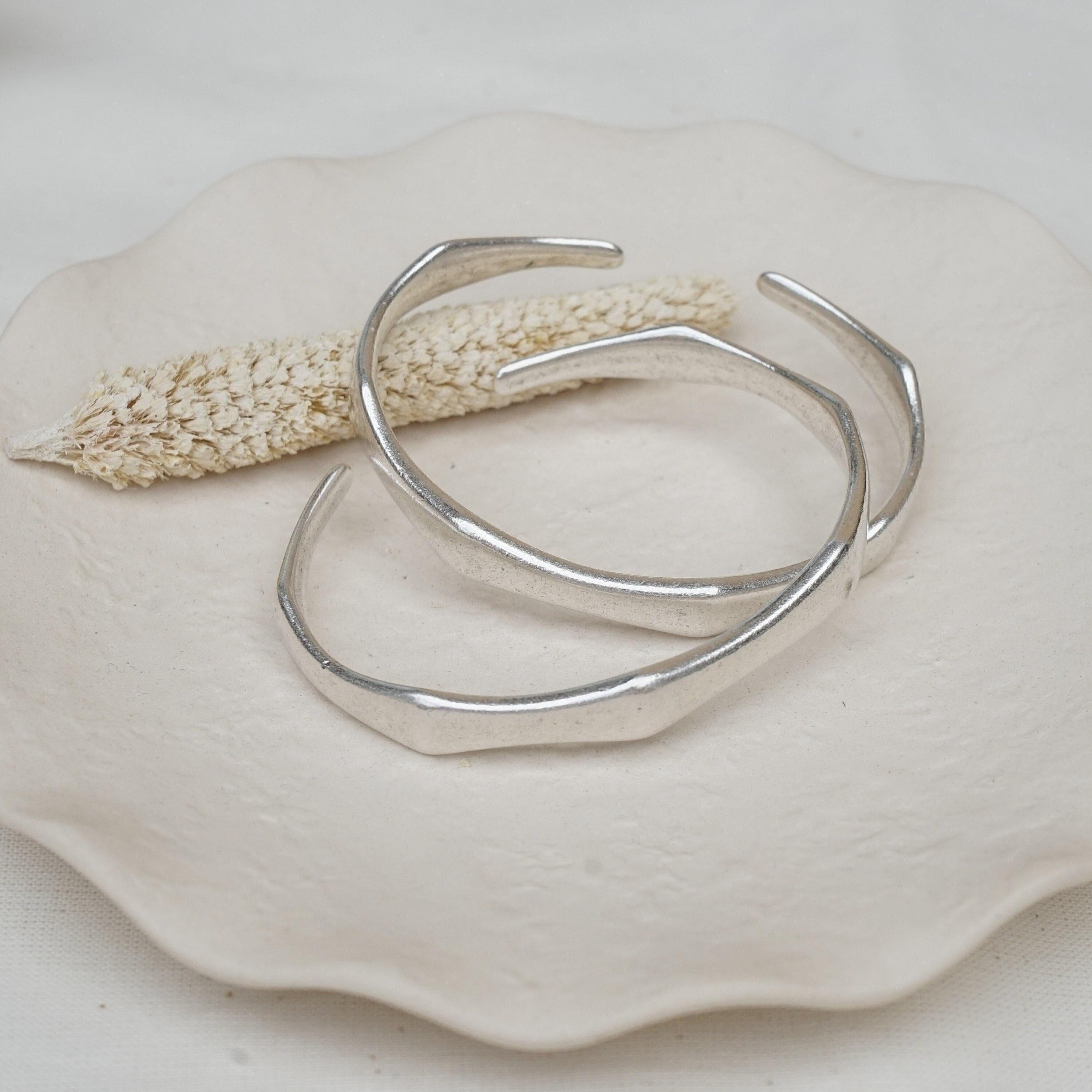 This silver-plated cuff bracelet, crafted with an antique vintage look, features a striking bold angular shape. Its timeless design makes it a versatile piece, perfect for mixing and matching with other cuffs and bangles. It pairs beautifully with our best-selling hammered bracelet, creating a stunning and cohesive accessory set.